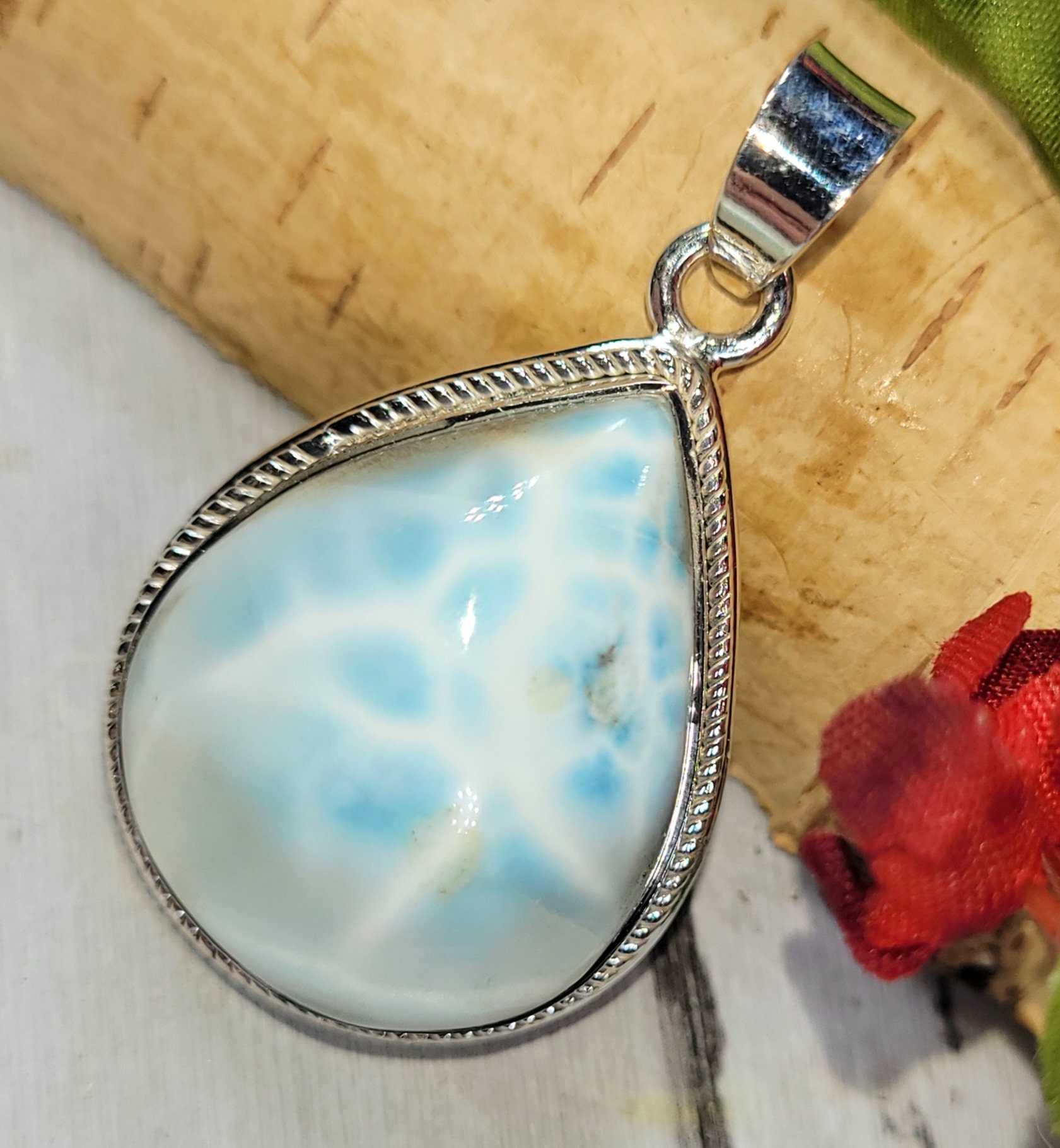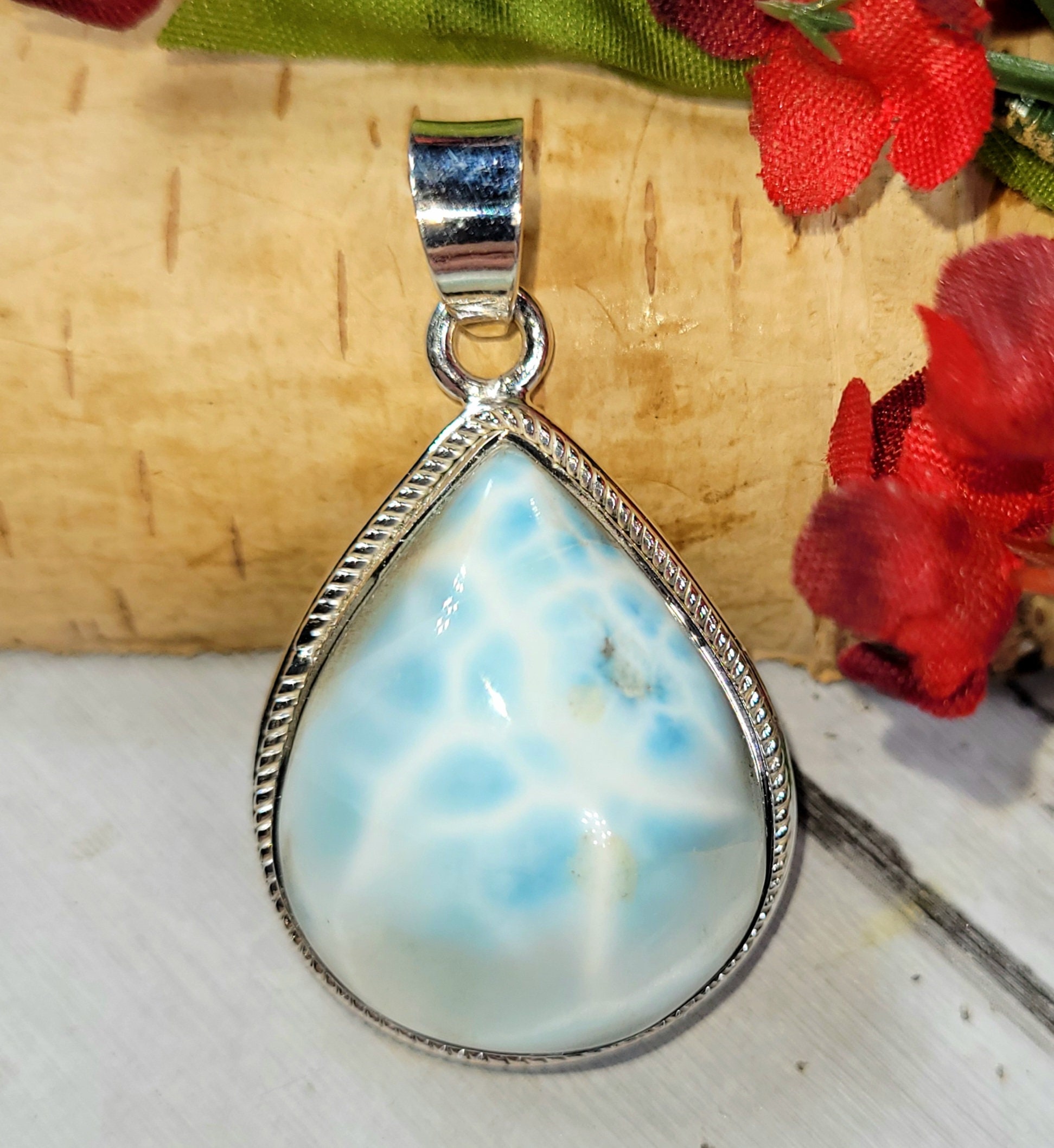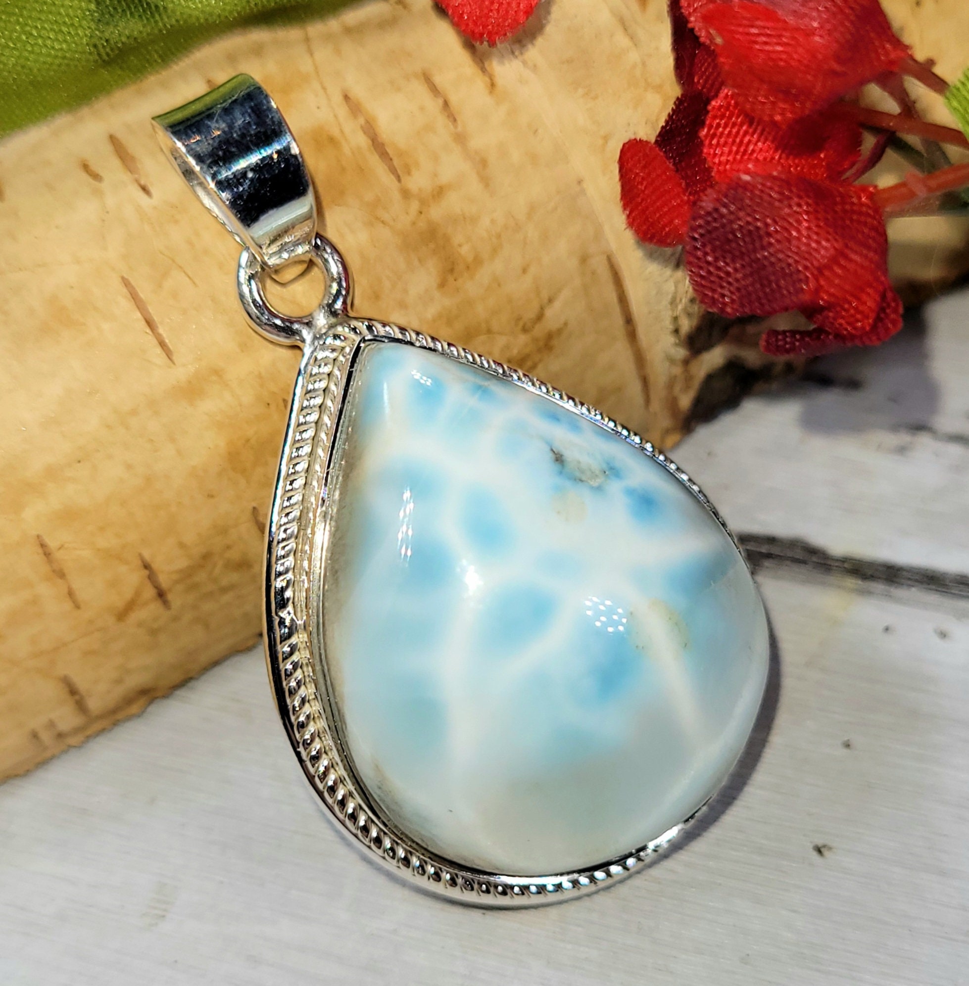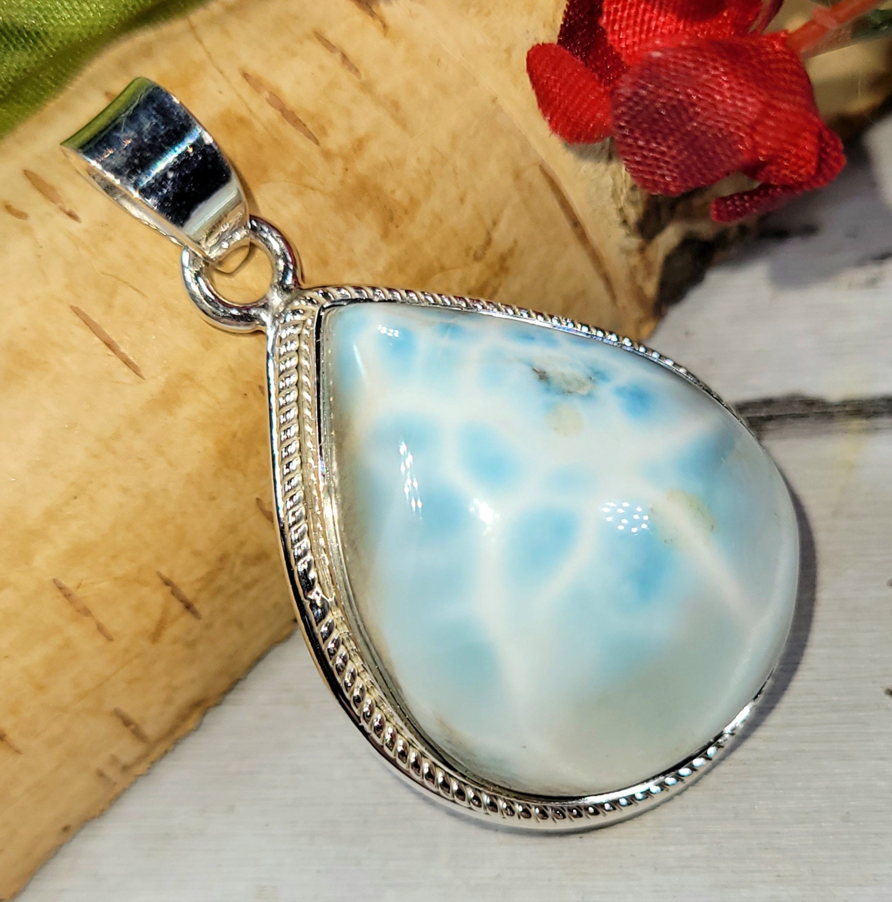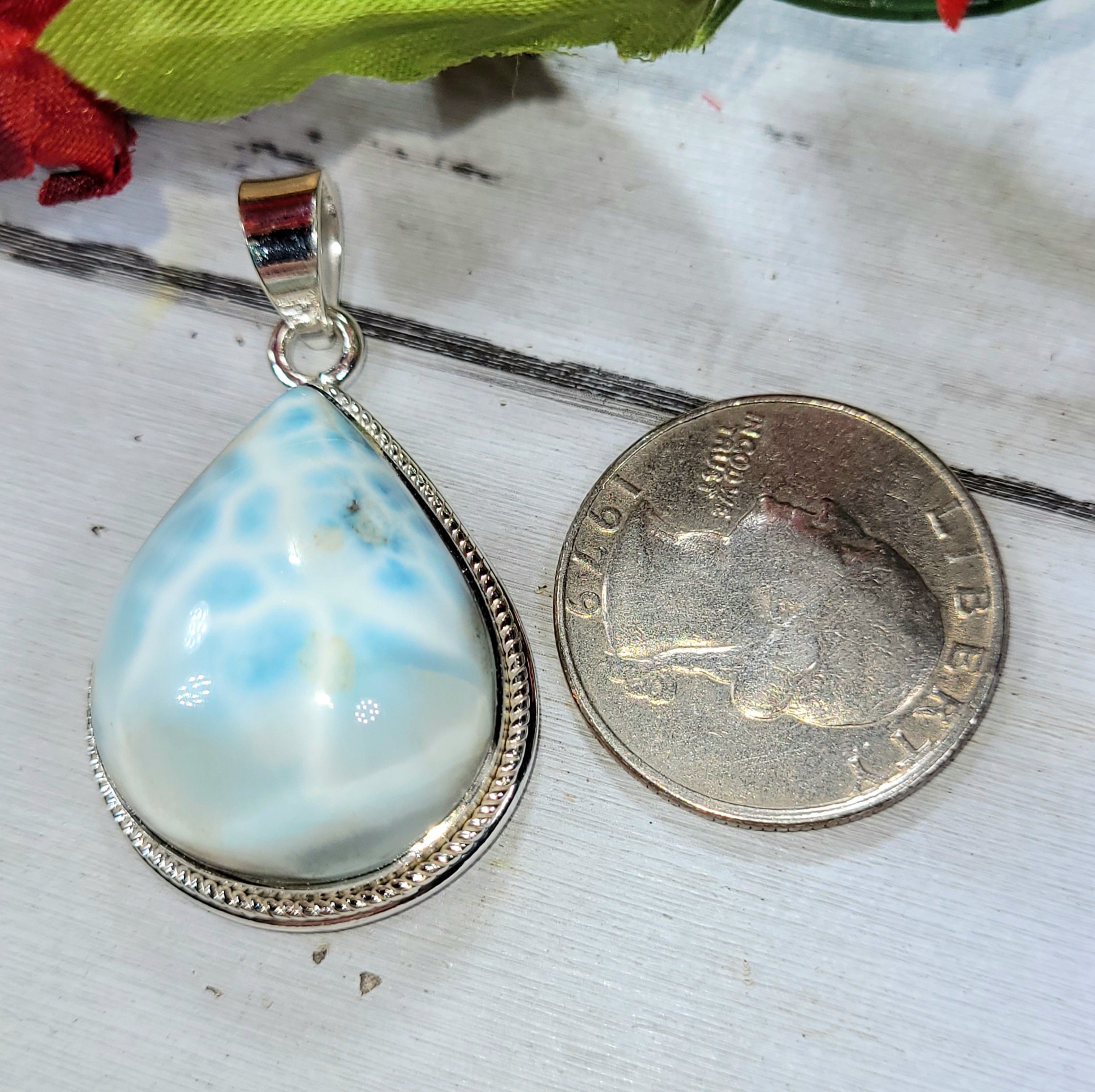 Natural Top Grade Dominican Larimar Handmade Pear .925 Sterling Silver Pendant 1 3/4" x 7/8" 16 Grams DJ23 Gift for Her. This is a handpicked natural stone, the exact one shown in picture. The sterling silver is .925 and stamped. Each piece is handmade by artisans in my shop. The quality of the stones and the silver workmanship is impressive. Please look at other items in my store. I sell ready made jewelry with hand crafted silver work, pendants with a sterling silver bails and beautiful unique stones for jewelry wire wrapping and weaving. You will pay exact amount on shipping plus $1 for supplies and labor. All items are shipped within a couple of days after payment and are shipped USPS first class or international first class. Items are available for combined shipping, if invoice does not combine please email me and I will combine for you. Shipping charges are free when you spend $35 or more. We also accept returns for refund or exchange. Thanks for viewing my store