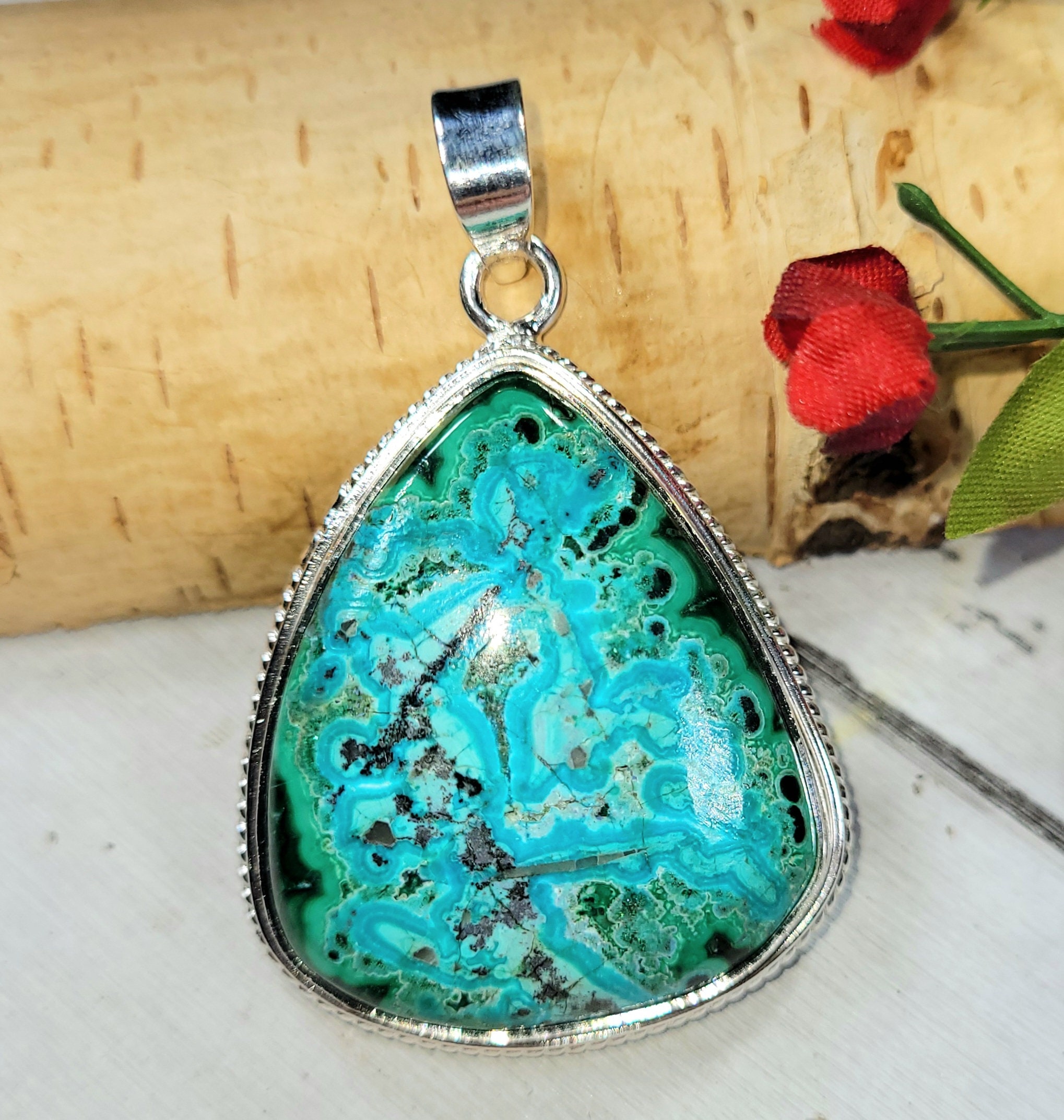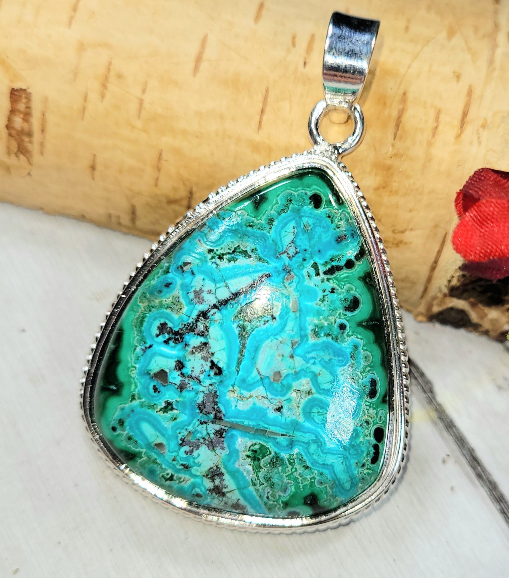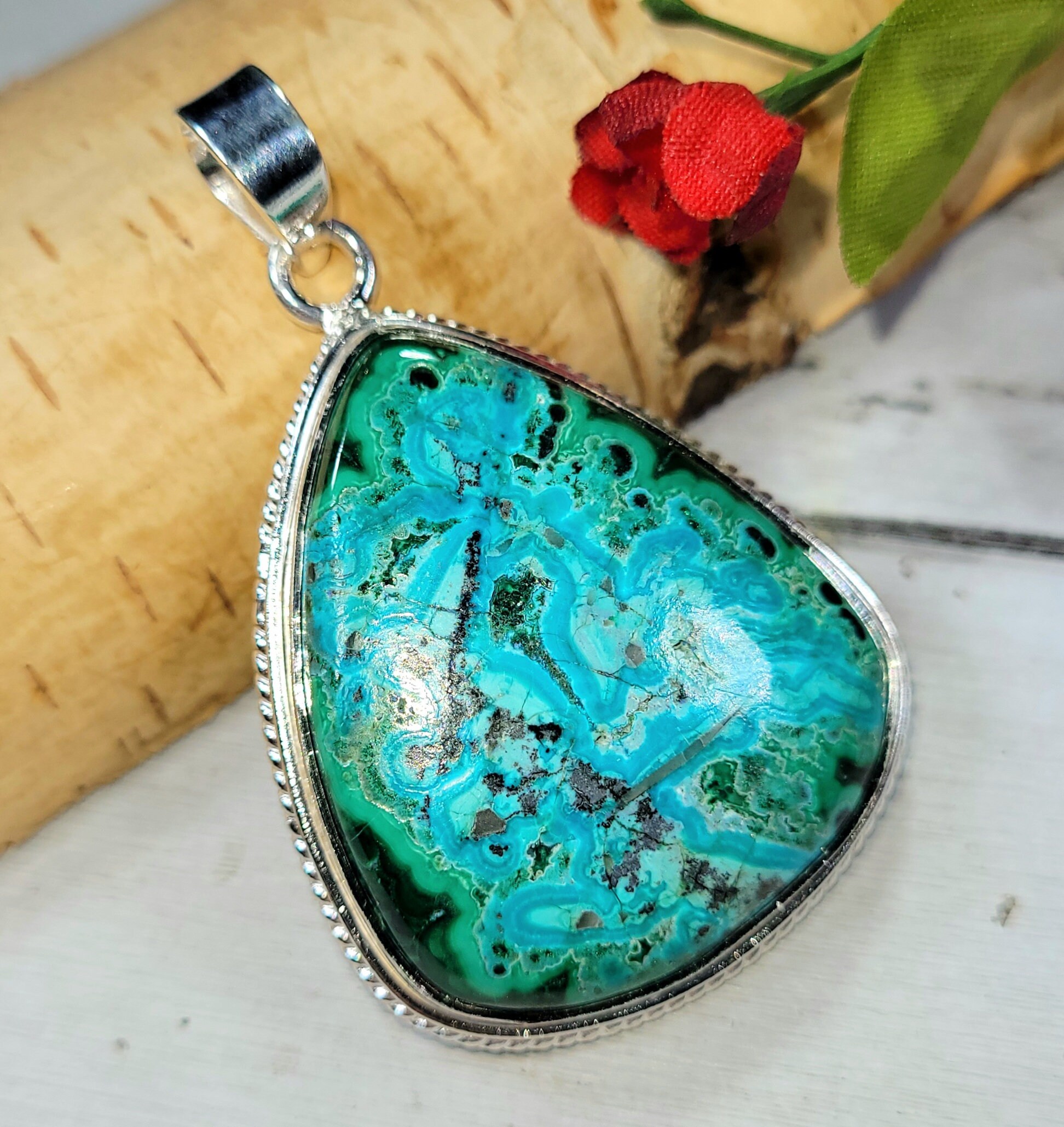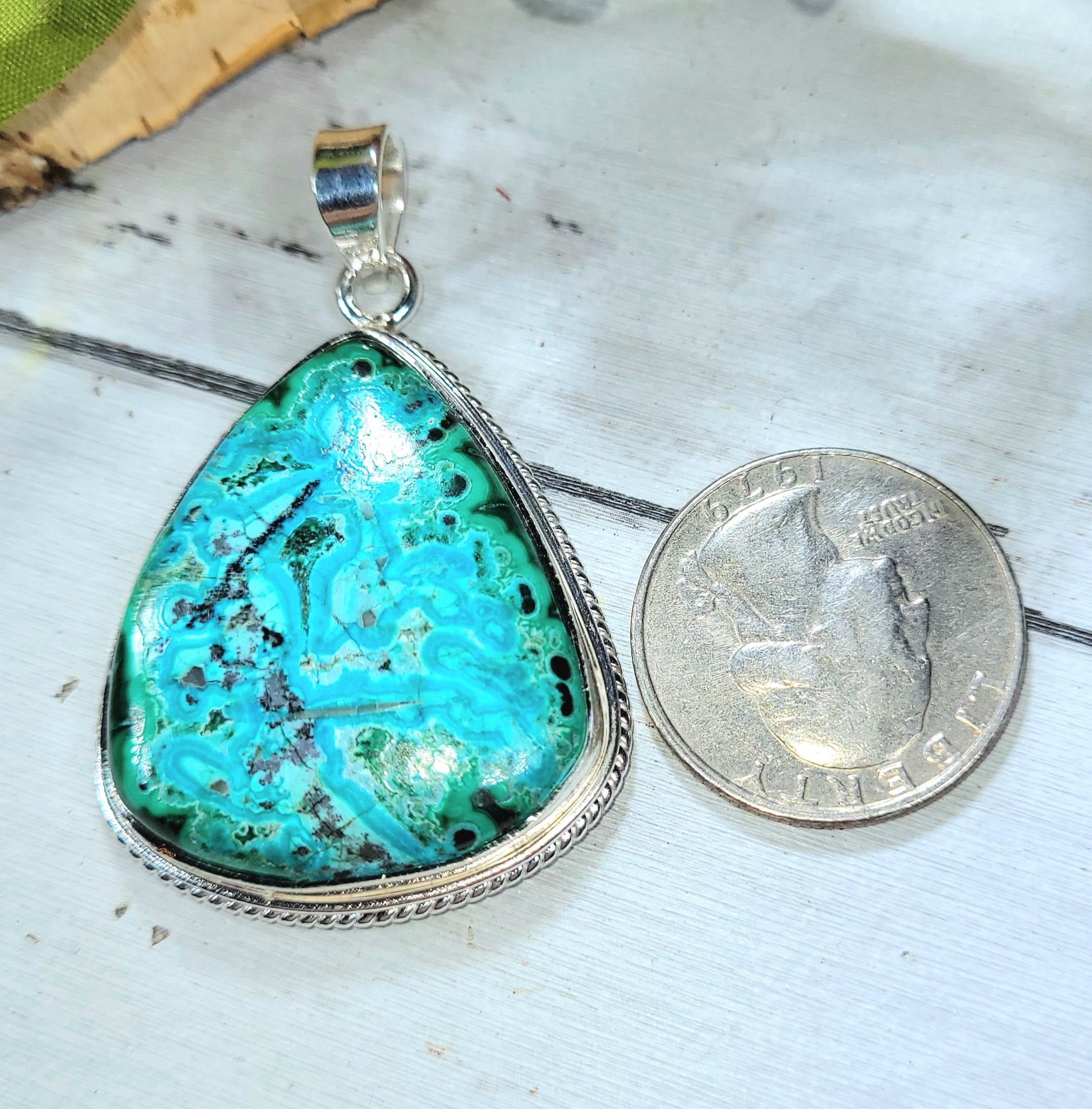 Natural High Grade Malachite Chrysocolla Handmade .925 Sterling Silver Pendant 2 1/8" x 1 3/8" 24 grams DJ17. This is a handpicked natural stone, the exact one shown in picture. The sterling silver is .925 and stamped. Each piece is handmade by artisans in my shop. The quality of the stones and the silver workmanship is impressive. Please look at other items in my store. I sell ready made jewelry with hand crafted silver work, pendants with a sterling silver bails and beautiful unique stones for jewelry wire wrapping and weaving. You will pay exact amount on shipping plus $1 for supplies and labor. All items are shipped within a couple of days after payment and are shipped USPS first class or international first class. Items are available for combined shipping, if invoice does not combine please email me and I will combine for you. Average shipping will be $4 to 4.50 for USPS first class. International shipping is available for exact amount of shipping plus $1 for labor and supplies also. We also accept returns for refund or exchange. Thanks for viewing my store