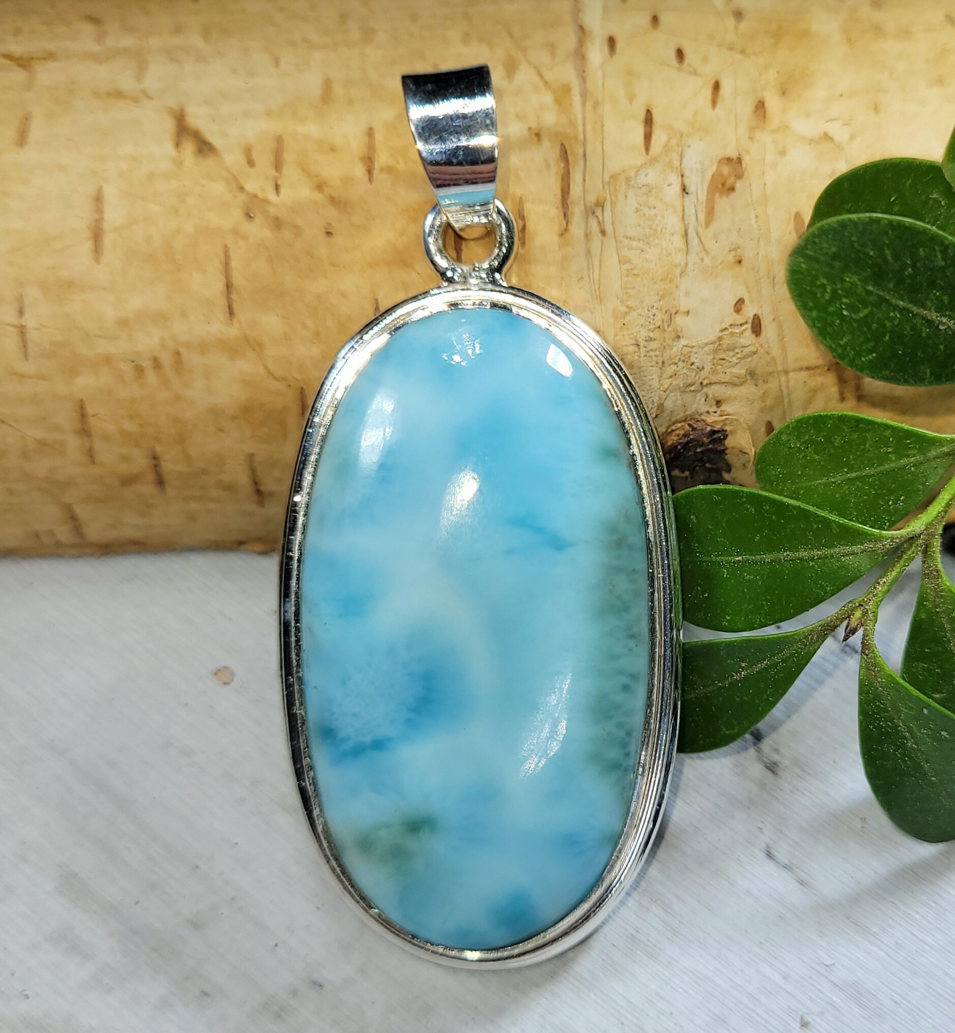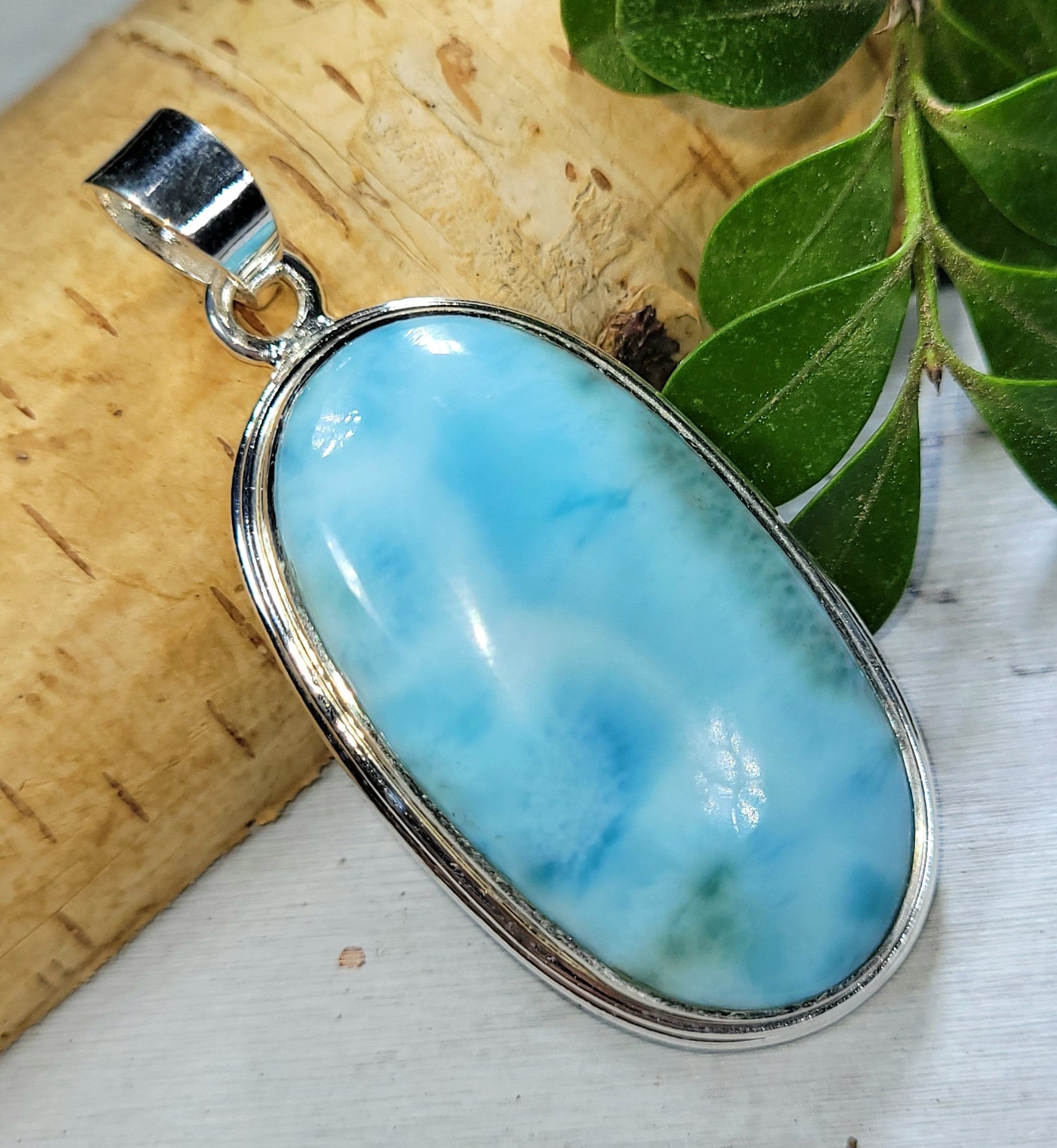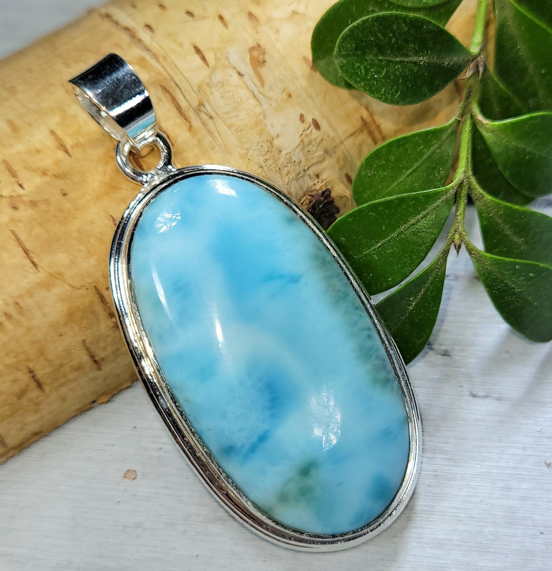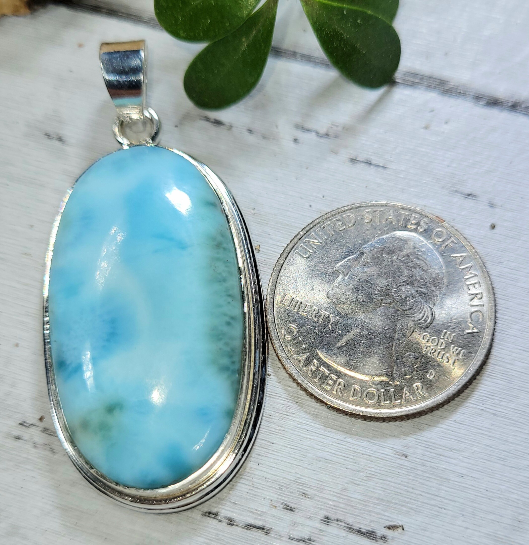 Natural High Grade Dominican Larimar Handmade Oval .925 Sterling Silver Pendant 2 3/16" x 1" 16.1 Grams FC20 Gift for Her. This is a handpicked natural stone, the exact one shown in picture. The sterling silver is .925 and stamped. Each piece is handmade by artisans in my shop. The quality of the stones and the silver workmanship is impressive. Please look at other items in my store. I sell ready made jewelry with hand crafted silver work, pendants with a sterling silver bails and beautiful unique stones for jewelry wire wrapping and weaving. You will pay exact amount on shipping plus $1 for supplies and labor. All items are shipped within a couple of days after payment and are shipped USPS first class or international first class. Items are available for combined shipping, if invoice does not combine please email me and I will combine for you. Shipping charges are free when you spend $35 or more. We also accept returns for refund or exchange. Thanks for viewing my store