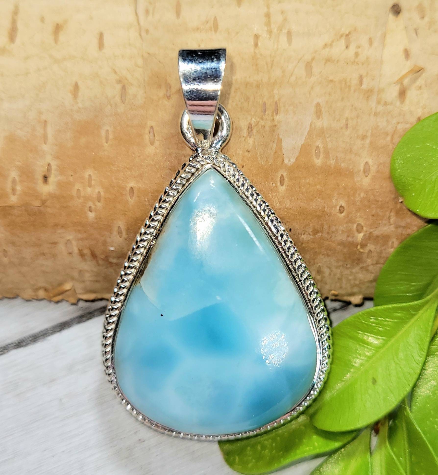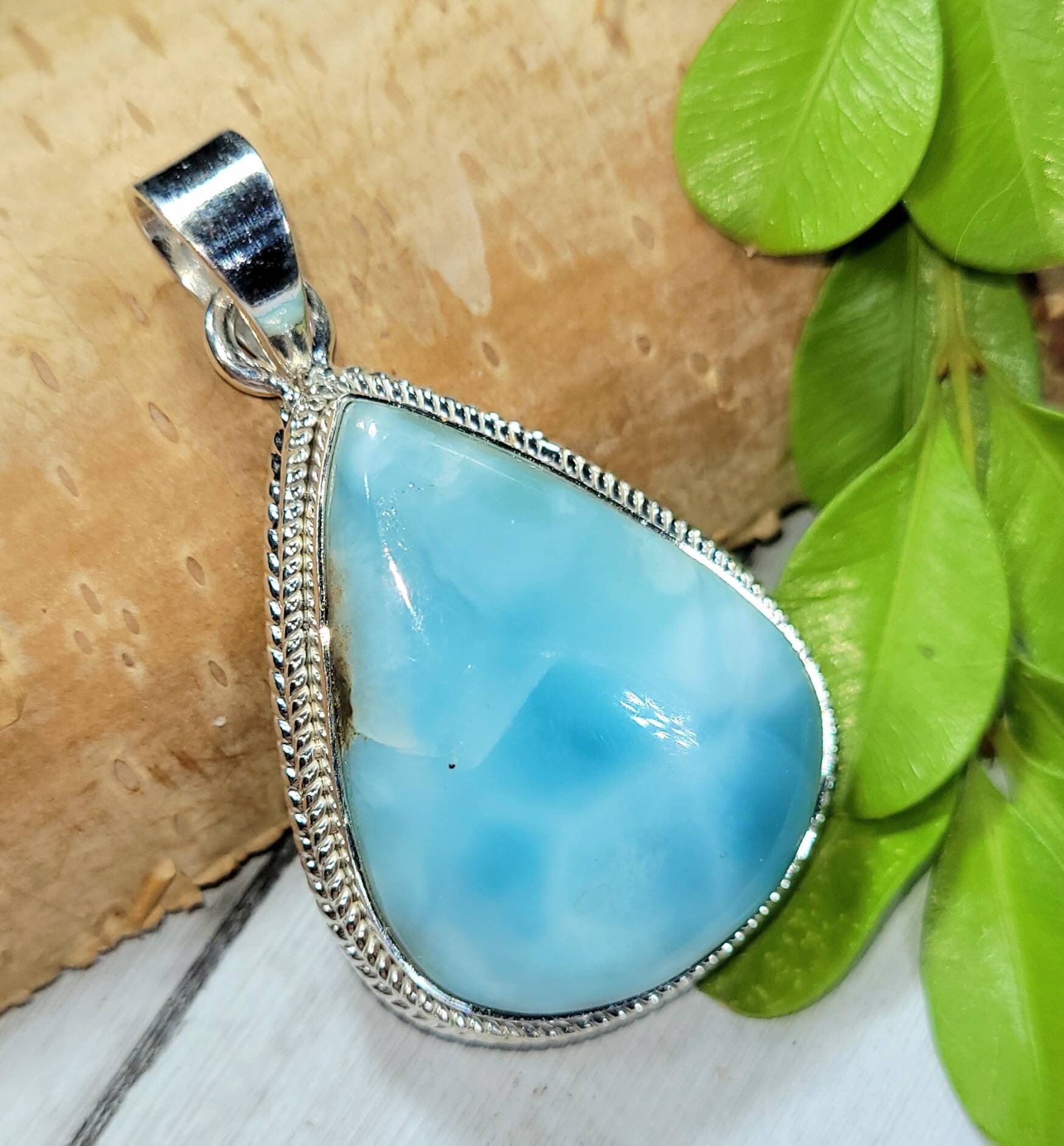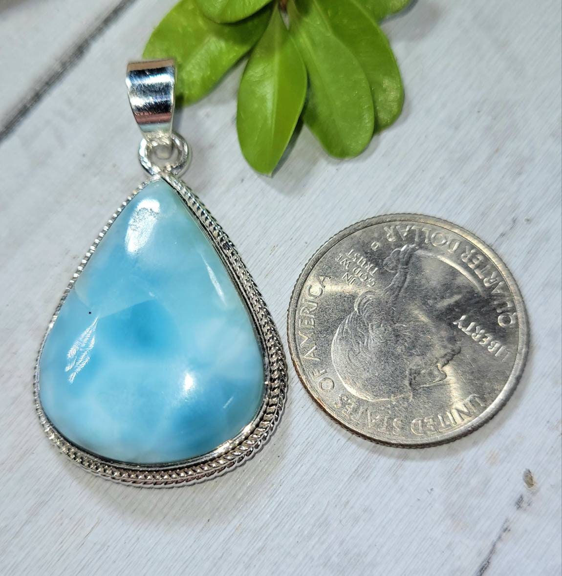 Natural High Grade Dominican Larimar Handmade Pear .925 Sterling Silver Pendant 1 7/8" x 1" weighs 13.1 Grams FE41. Gift for Her. This is a handpicked natural stone, the exact one shown in picture. The sterling silver is .925 and stamped. Each piece is handmade by artisans in my shop. The quality of the stones and the silver workmanship is impressive. Please look at other items in my store. I sell ready made jewelry with hand crafted silver work, pendants with a sterling silver bails and beautiful unique stones for jewelry wire wrapping and weaving. You will pay exact amount on shipping plus $1 for supplies and labor. All items are shipped within a couple of days after payment and are shipped USPS first class or international first class. Items are available for combined shipping, if invoice does not combine please email me and I will combine for you. Shipping charges are free when you spend $35 or more. We also accept returns for refund or exchange. Thanks for viewing my store