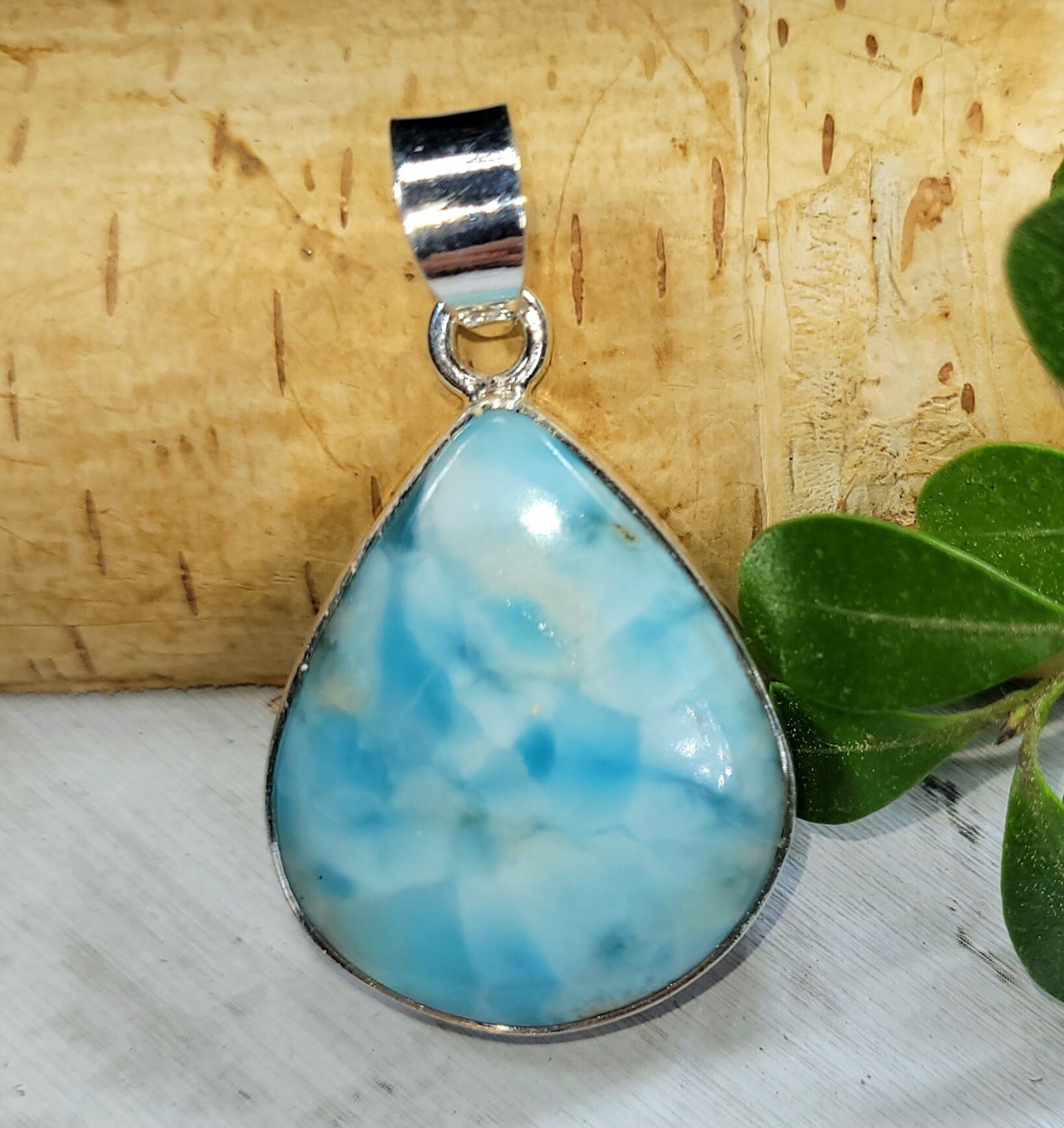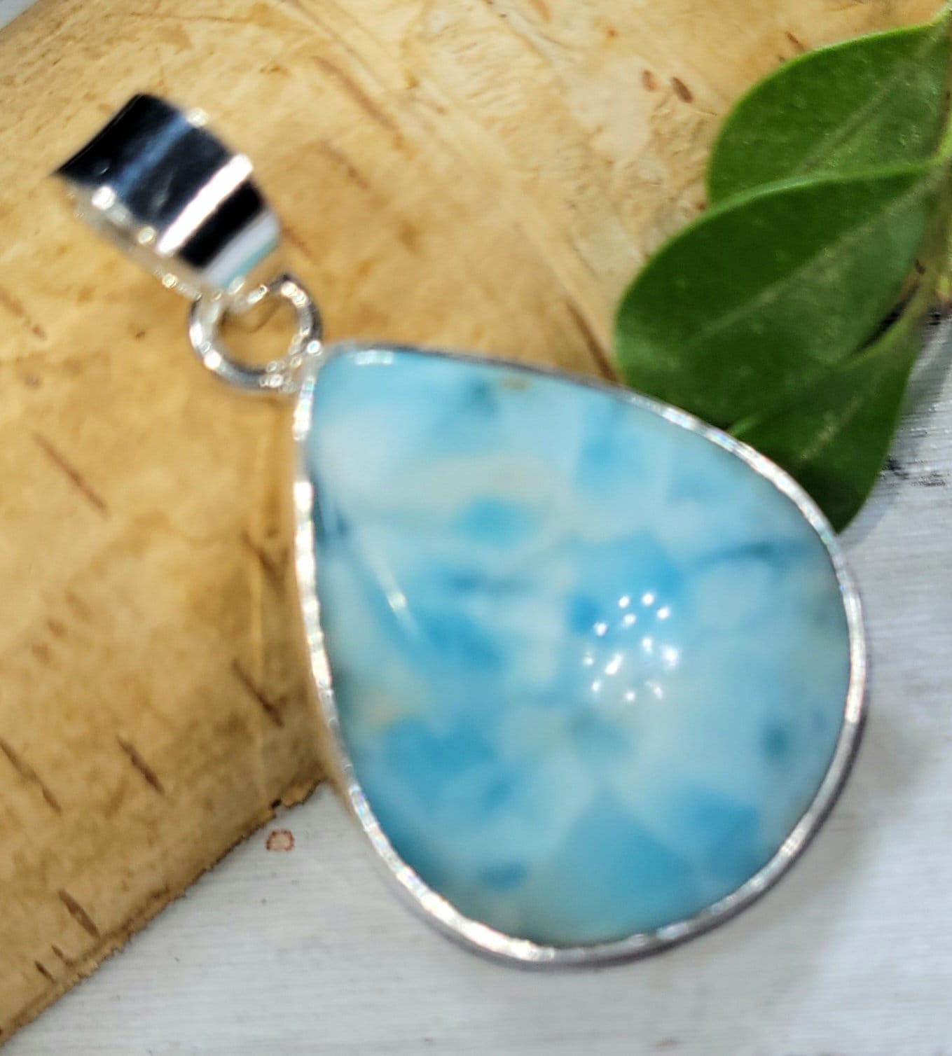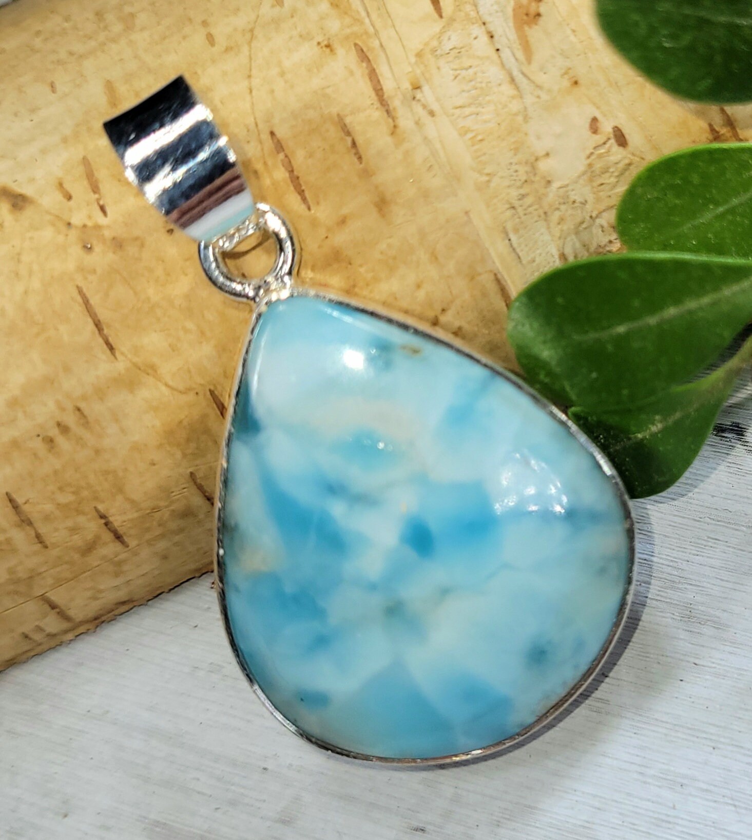 Natural Premium Grade Dominican Larimar Handmade Pear .925 Sterling Silver Pendant 1 3/4" x 1" 8.8 Grams FC22 Gift for Her. This is a handpicked natural stone, the exact one shown in picture. The sterling silver is .925 and stamped. Each piece is handmade by artisans in my shop. The quality of the stones and the silver workmanship is impressive. Please look at other items in my store. I sell ready made jewelry with hand crafted silver work, pendants with a sterling silver bails and beautiful unique stones for jewelry wire wrapping and weaving. You will pay exact amount on shipping plus $1 for supplies and labor. All items are shipped within a couple of days after payment and are shipped USPS first class or international first class. Items are available for combined shipping, if invoice does not combine please email me and I will combine for you. Shipping charges are free when you spend $35 or more. We also accept returns for refund or exchange. Thanks for viewing my store