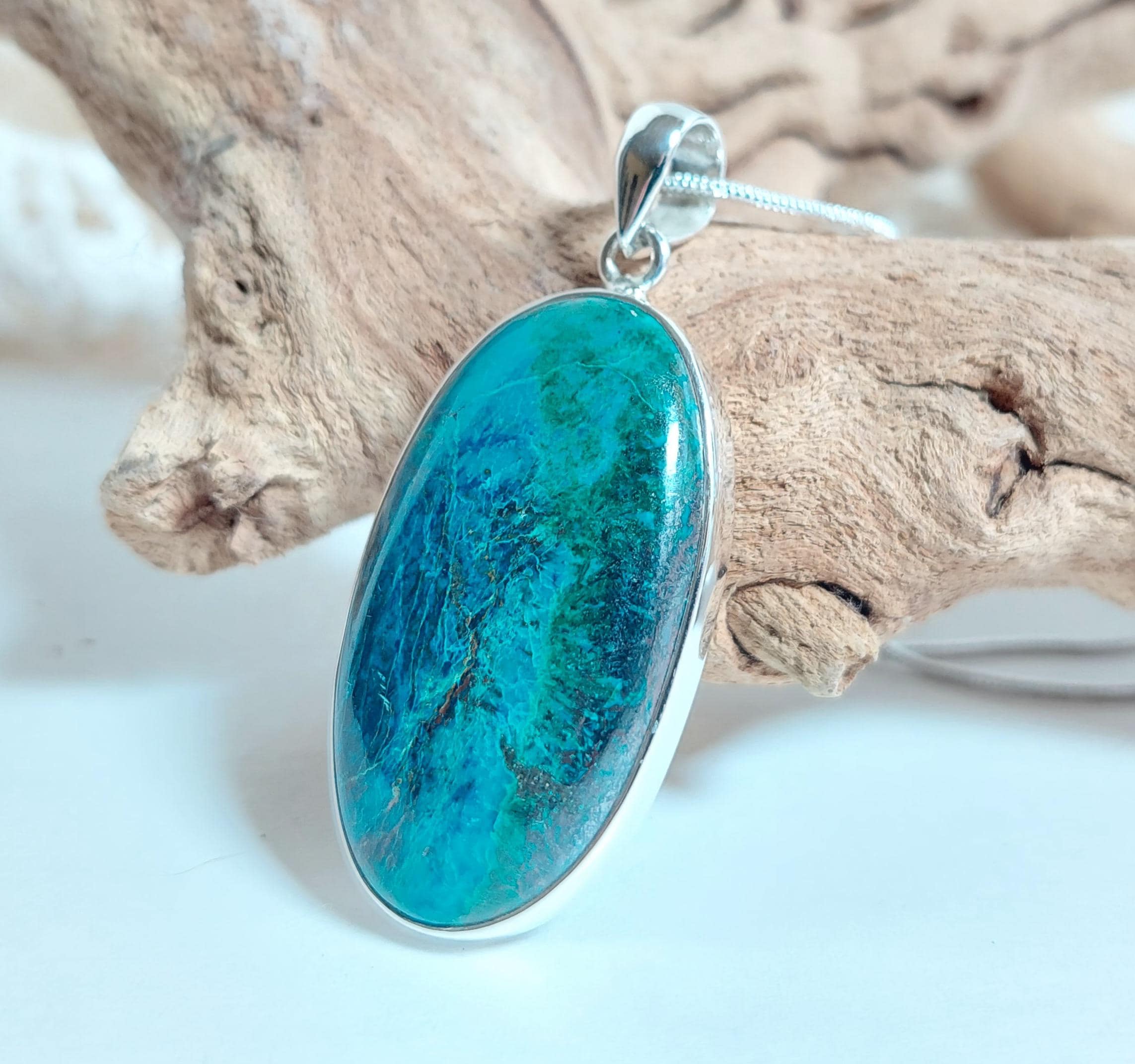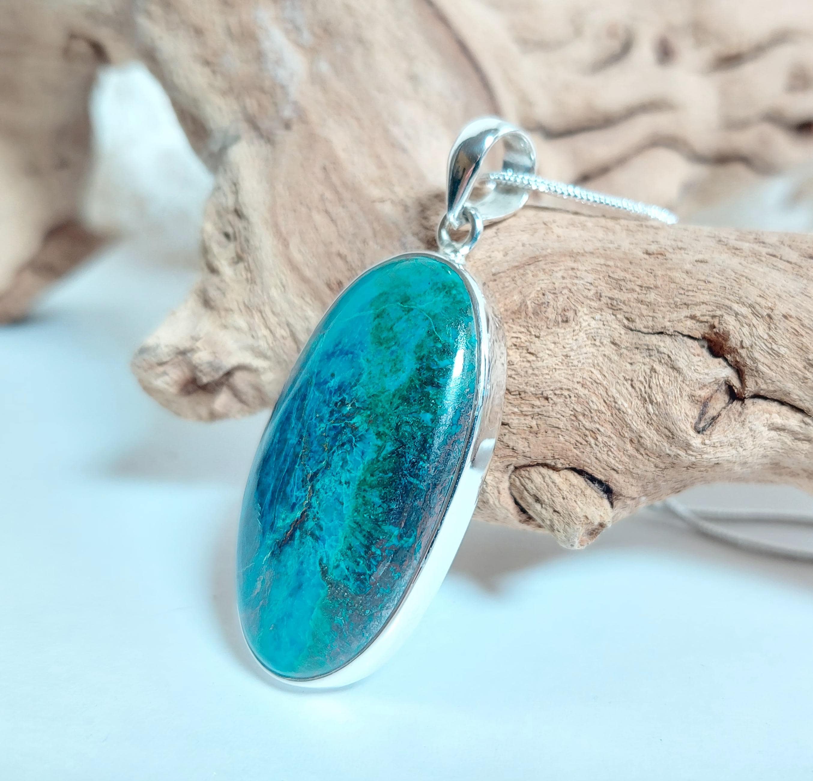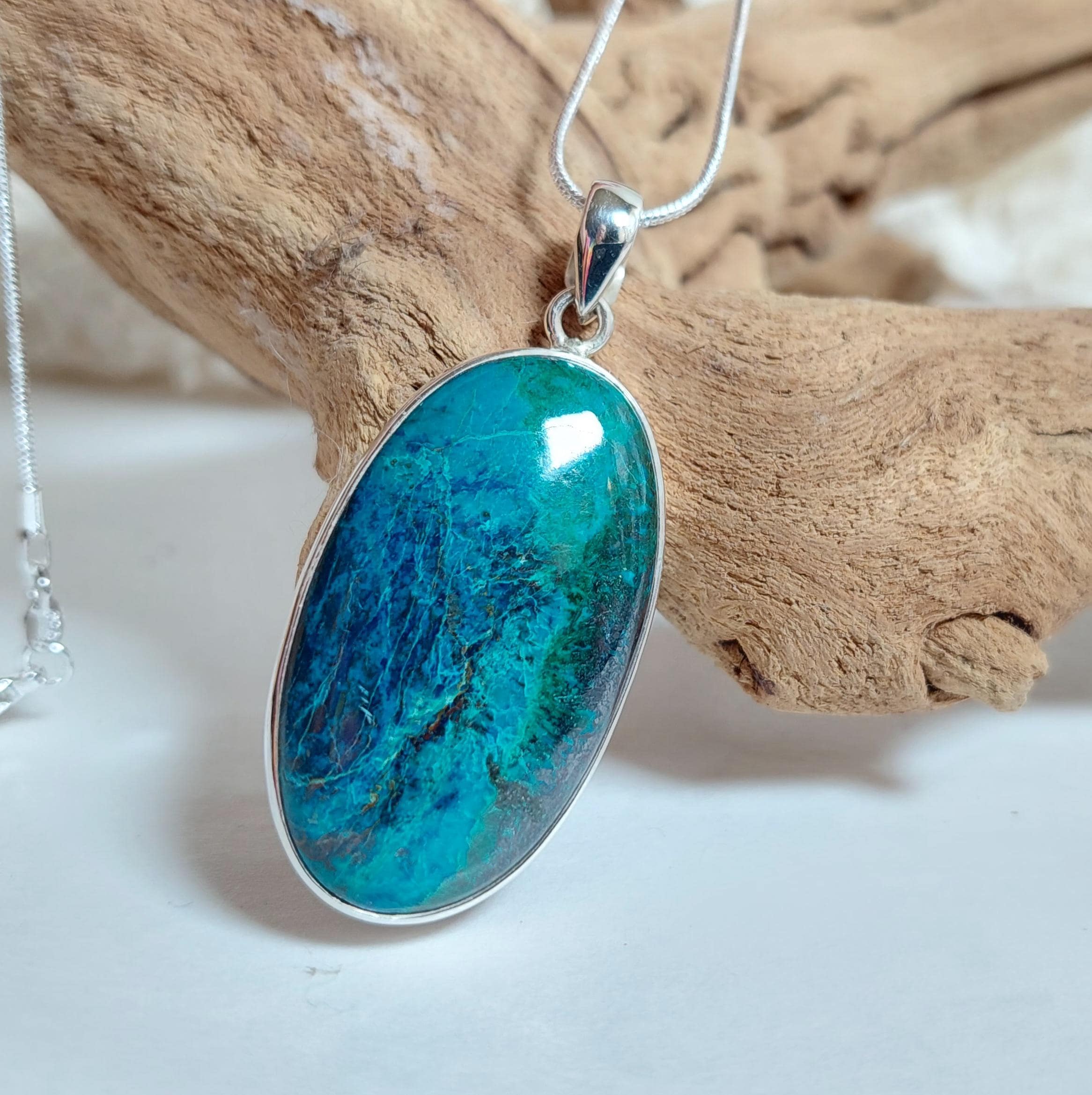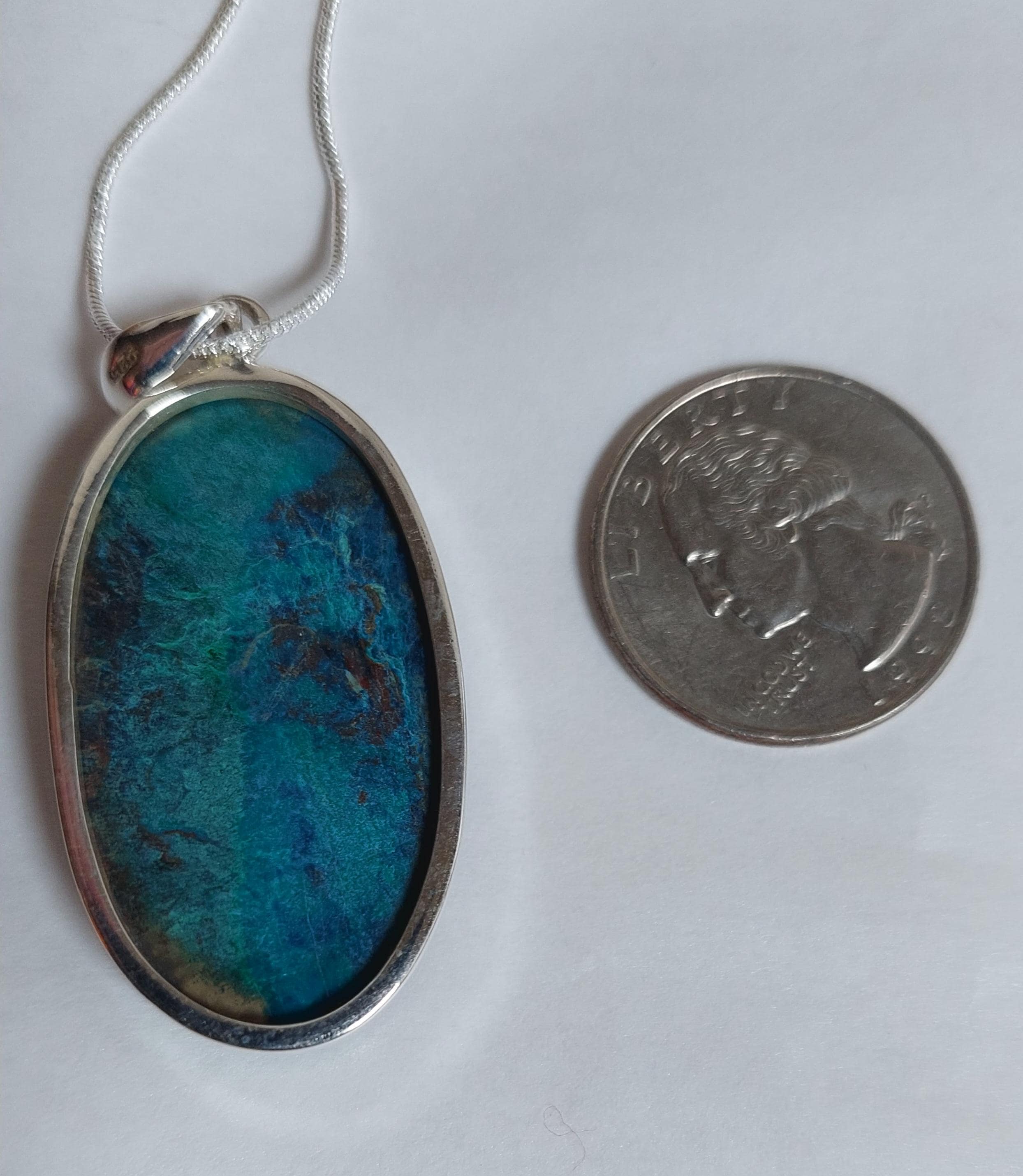 Natural AAA Grade Chrysocolla w/Azurite Handmade Oval .925 Sterling Silver Pendant Weighs 15 Grams Measures 2 1/8" x 1" JV45. Gift For Her. This is a handpicked natural stone, the exact one shown in the picture. The sterling silver is .925 and stamped. Each piece is hand made by artisans in my shop. The quality of the stones and the silver workmanship is hard to beat. All items are shipped within a couple of days after payment and are shipped USPS first class or international first class. Please look at other items in my store. I sell ready made jewelry with hand crafted silver work, pendants with a sterling silver bails and beautiful unique stones for jewelry wire wrapping and weaving. You will pay exact amount on shipping plus $1 for supplies and labor. Items are available for combined shipping. Average shipping will be $4 to 4.50 for USPS first class. International shipping is available for the exact amount of shipping plus $1 for labor and supplies also. Thanks for viewing my store.