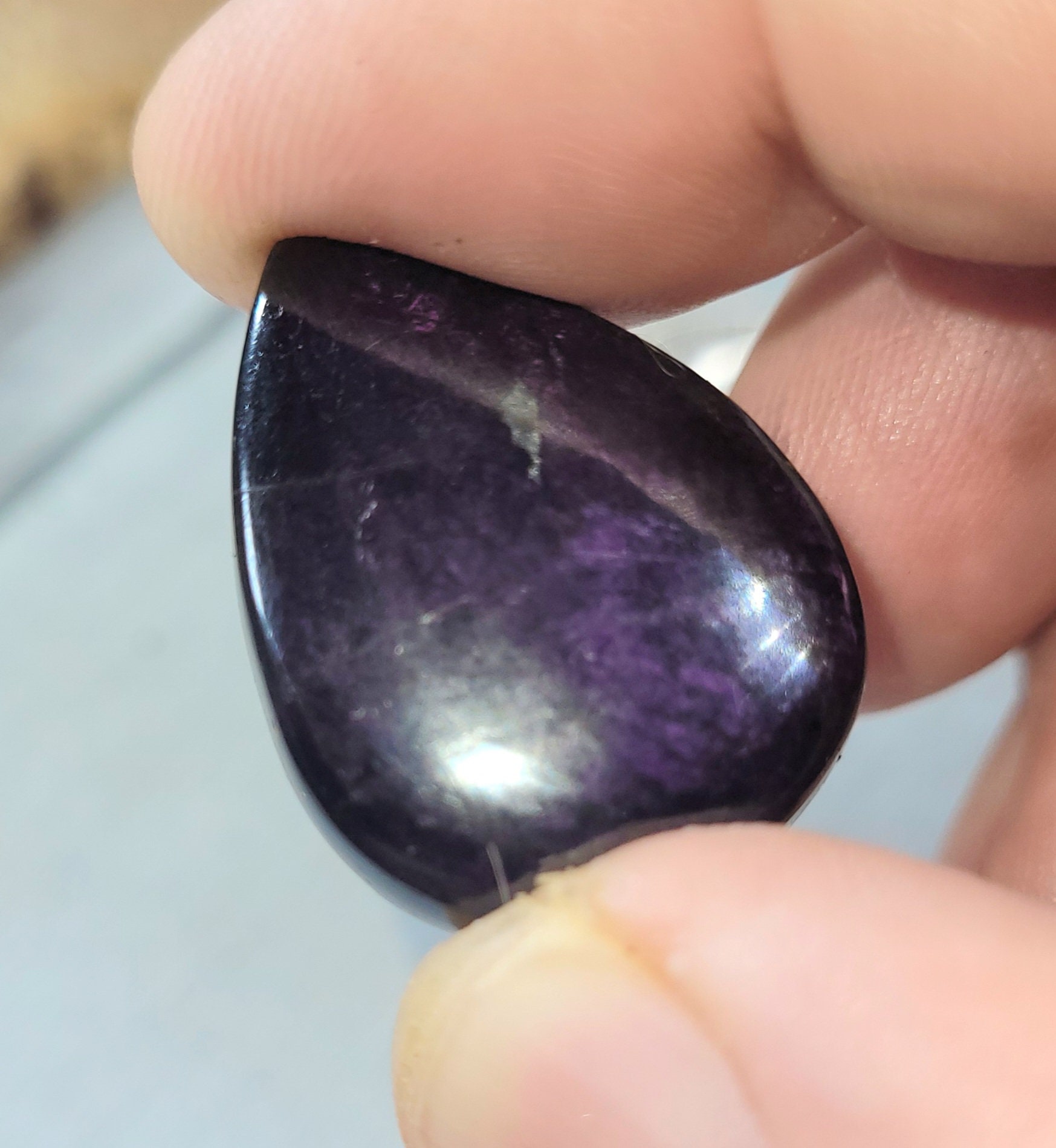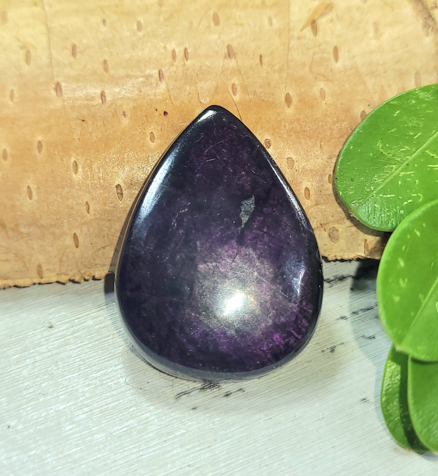 Premium Grade Purpurite Pear Cabochon measures 27mm x 20mm 33.50ct or 6.7 grams FN26. Drilling services and Sterling Silver bails available upon request. Please email for a price and picture of bails first. This is a handpicked natural stone, the exact one shown in picture. The sterling silver is .925 and stamped. Each piece is handmade by artisans in my shop. The quality of the stones and the silver craftmanship is impressive. Please look at other items in my store. I sell ready made jewelry with handcrafted silver work, pendants with a sterling silver bails and beautiful unique stones for jewelry wire wrapping and weaving. You will pay exact amount on shipping plus $1 for supplies and labor. All items are shipped within a couple of days after payment and are shipped USPS first class or international first class. Items are available for combined shipping, if invoice does not combine please email me and I will combine for you. Average shipping will be $4 to 4.50 for USPS first class. International shipping is available for exact amount of shipping plus $1 for labor and supplies also. We also accept returns for refund or exchange. Thanks for viewing my store.