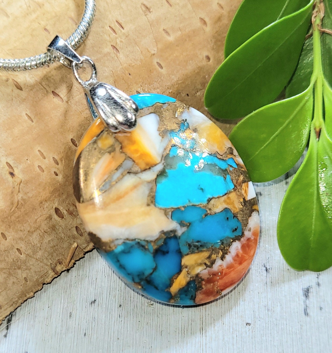 Premium Grade Spiny Copper Oyster Arizona Kingman Turquoise Oval Cabochon .925 Sterling Silver Pendant 1 3/4" x 1" weighs 6.3 grams FP32. Rhodium Dipped Solid Sterling Silver Bail Gift for Her. Sterling Silver Rhodium Dipped bail will accommodate up to a 3mm chain and resist tarnishing. This is a handpicked natural stone, the exact one shown in picture. The sterling silver is .925 and stamped. Each piece is hand made by artisans in my shop. The quality of the stones and the silver workmanship is impressive. Please look at other items in my store. I sell ready made jewelry with handcrafted silver work, pendants with a sterling silver bails and beautiful unique stones for jewelry wire wrapping and weaving. You will pay exact amount on shipping plus $1 for supplies and labor. All items are shipped within a couple of days after payment and are shipped USPS first class or international first class. Items are available for combined shipping, if invoice does not combine please email me and I will combine for you. Average shipping will be $4 to 4.50 for USPS first class. International shipping is available for exact amount of shipping plus $1 for labor and supplies also. We also accept returns for refund or exchange. Thanks for viewing my store.
