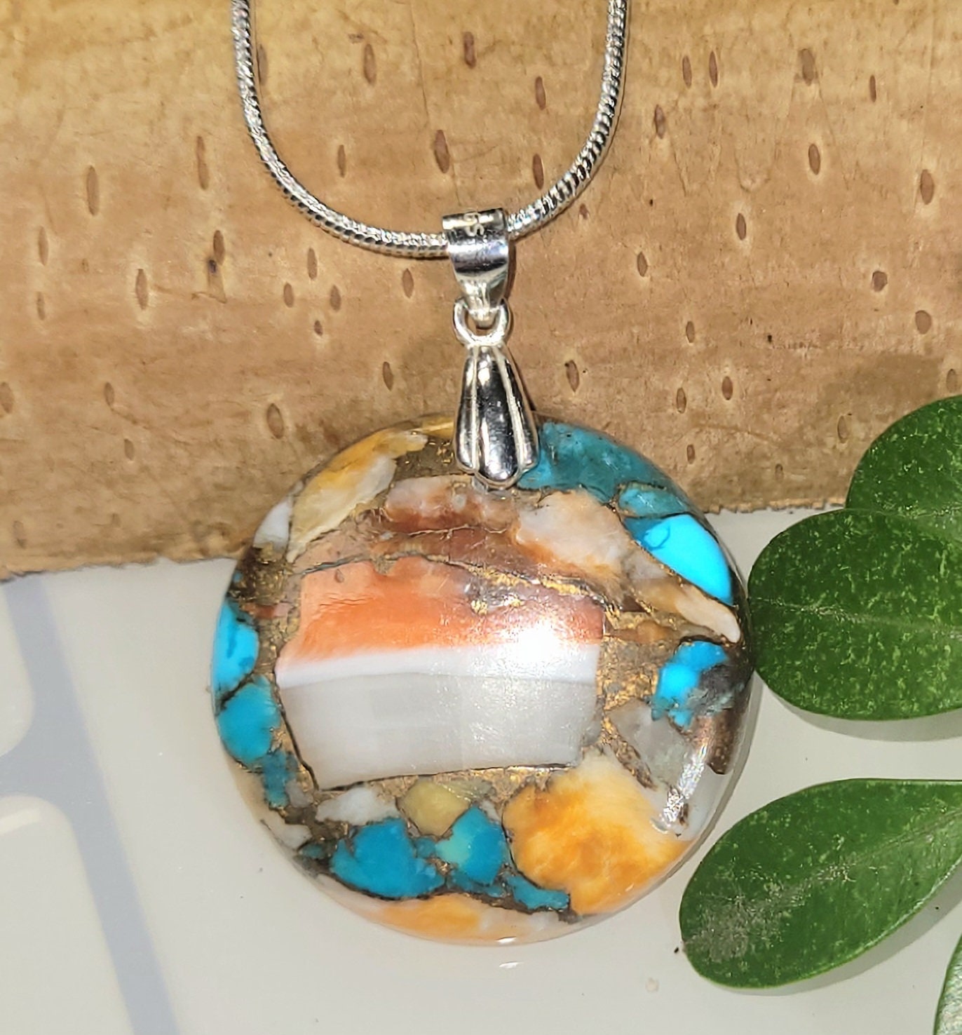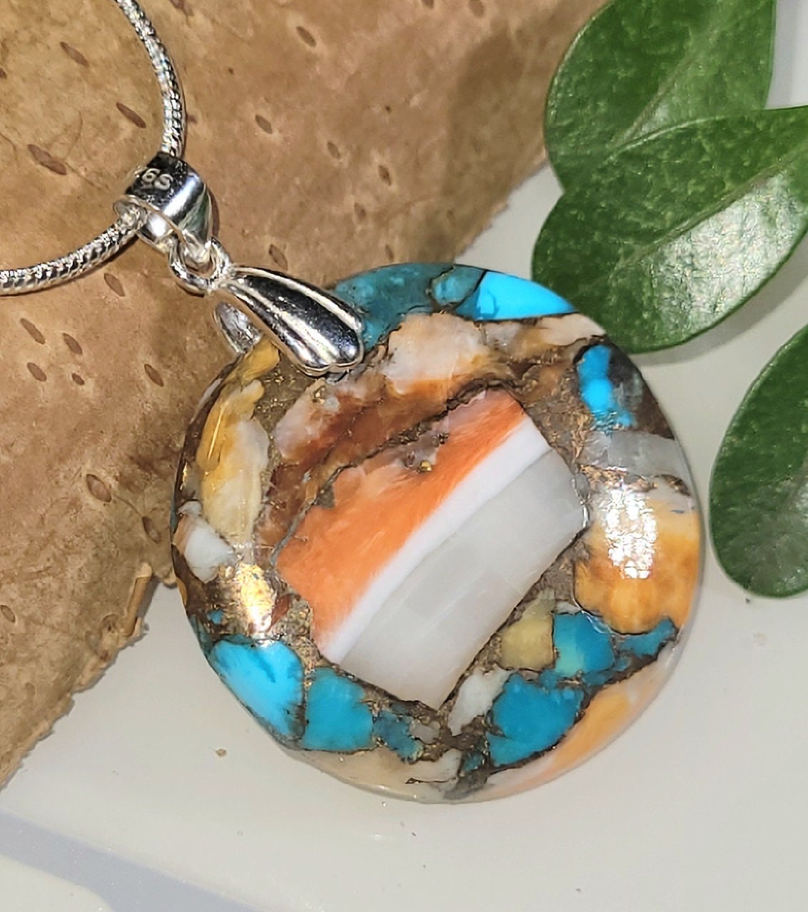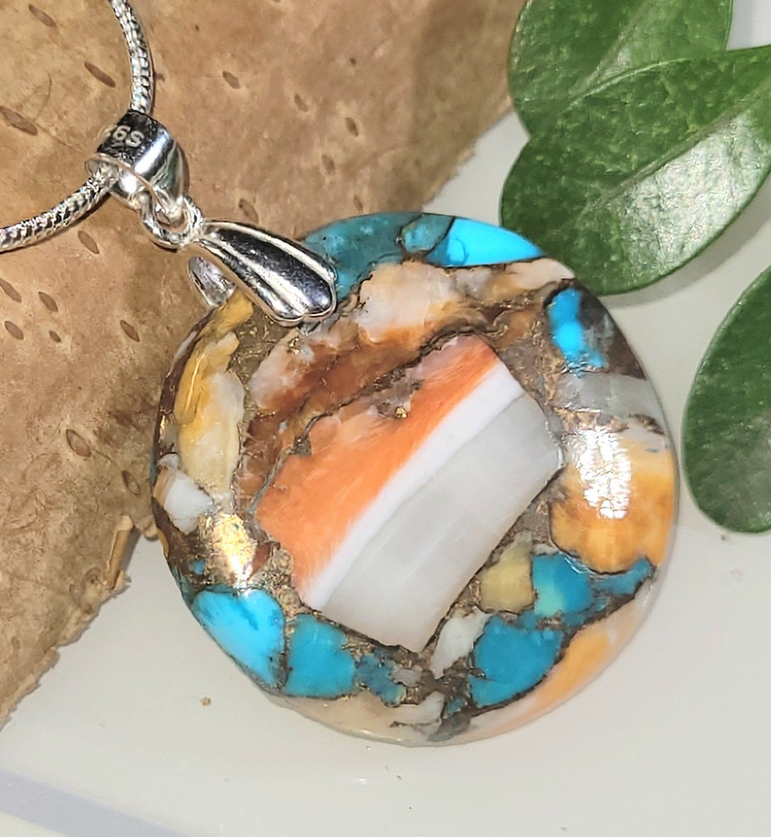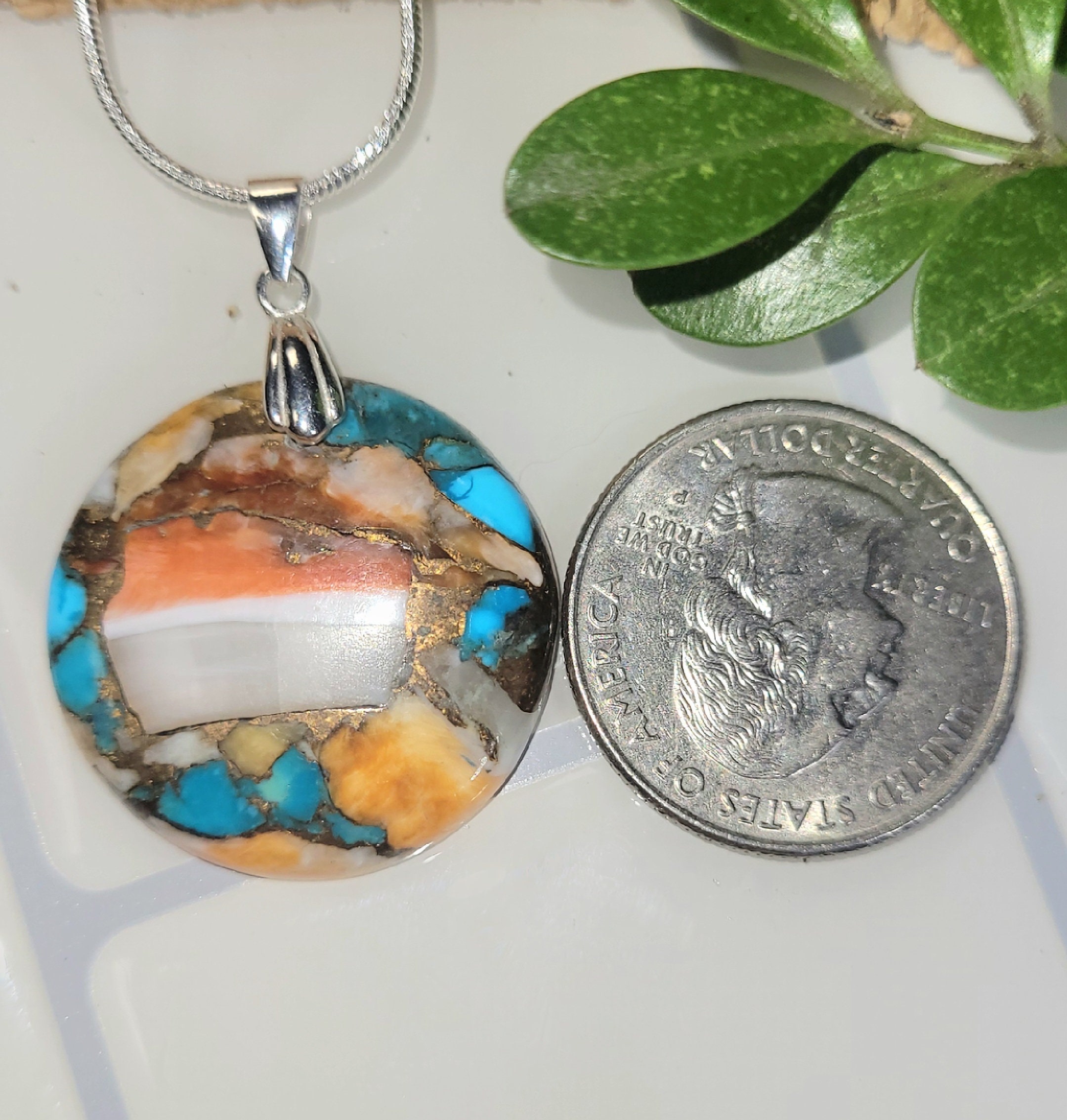 Premium Grade Spiny Copper Oyster Arizona Kingman Turquoise Oval Cabochon .925 Sterling Silver Pendant 1 1/2" x 1" weighs 7.3 grams GD09. Rhodium Dipped Solid Sterling Silver Bail Gift for Her. Sterling Silver Rhodium Dipped bail will accommodate up to a 3mm chain and resist tarnishing. Matching Earrings listed as well! This is a handpicked natural stone, the exact one shown in picture. The sterling silver is .925 and stamped. Each piece is hand made by artisans in my shop. The quality of the stones and the silver workmanship is impressive. Please look at other items in my store. I sell ready made jewelry with handcrafted silver work, pendants with a sterling silver bails and beautiful unique stones for jewelry wire wrapping and weaving. You will pay exact amount on shipping plus $1 for supplies and labor. All items are shipped within a couple of days after payment and are shipped USPS first class or international first class. Items are available for combined shipping, if invoice does not combine please email me and I will combine for you. Average shipping will be $4 to 4.50 for USPS first class. International shipping is available for exact amount of shipping plus $1 for labor and supplies also. We also accept returns for refund or exchange. Thanks for viewing my store.