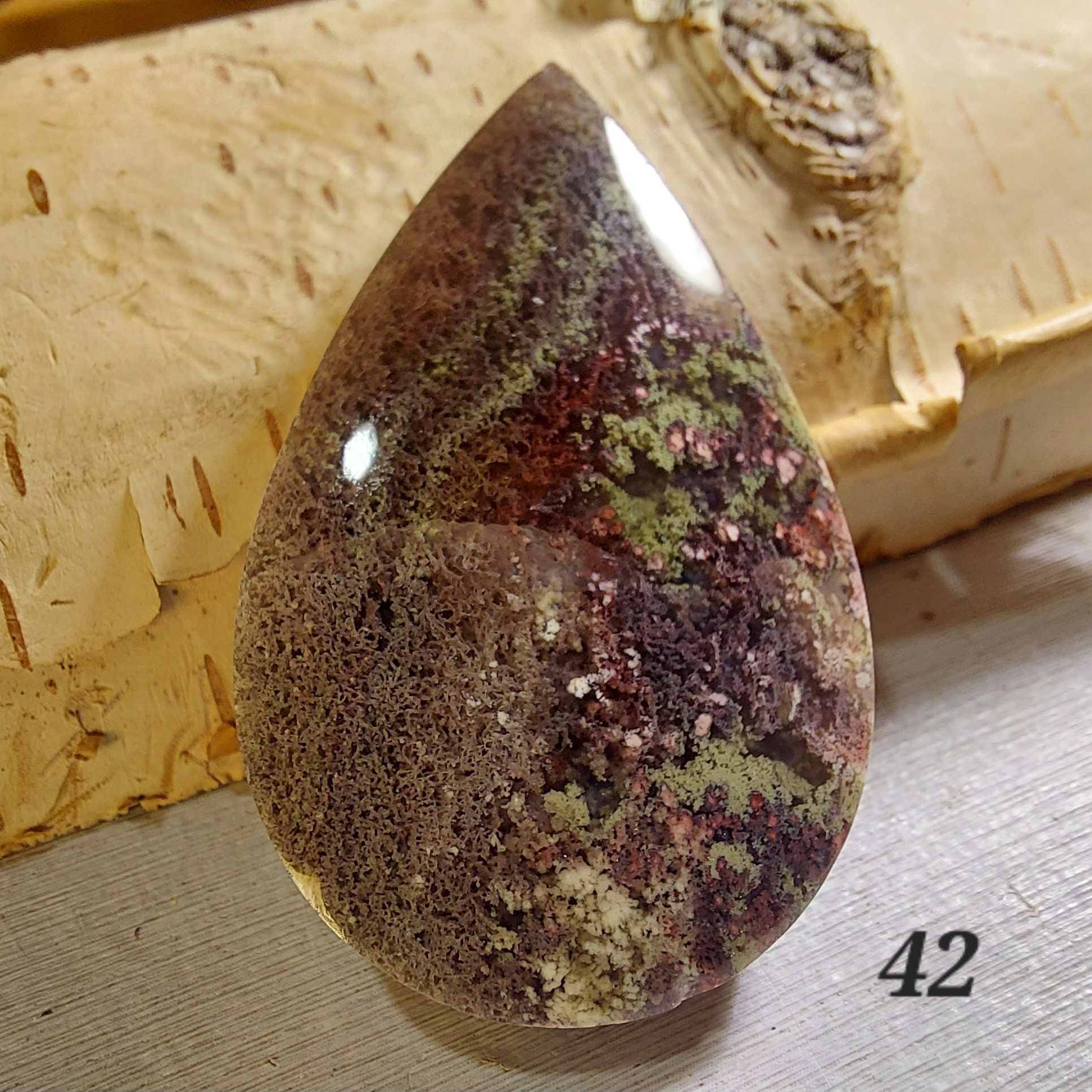 Moss Agate Cabochon, Scenic Moss Agate cabochon, Moss Agate Cabs, Moss Agate Scenic Cabochons, Green and Brown Moss Agate Cabochons. This is a pear shaped cabochon, is 55 carats and measures 42mm x 26mm GA42. If you are unhappy with any of our item please email us before you leave review. We stand behind our jewelry 100% with full refund if not completely satisfied!! This is a handpicked natural stone, the exact one shown in picture. Please look at other items in my store. I sell ready made jewelry with handcrafted silver work, pendants with a sterling silver bails and beautiful unique stones for jewelry wire wrapping and weaving. Any order to the US over $35 will ship for free. You will pay exact amount on shipping plus $1 for supplies and labor. All items are shipped within a couple of days after payment and are shipped USPS first class or international first class. Items are available for combined shipping, if invoice does not combine please email me and I will combine for you. Average shipping will be $4 to 5.50 for USPS first class. International shipping is available for exact amount of shipping plus $1 for labor and supplies also. We also accept returns for refund or exchange. Thanks for viewing my store and supporting a small business..