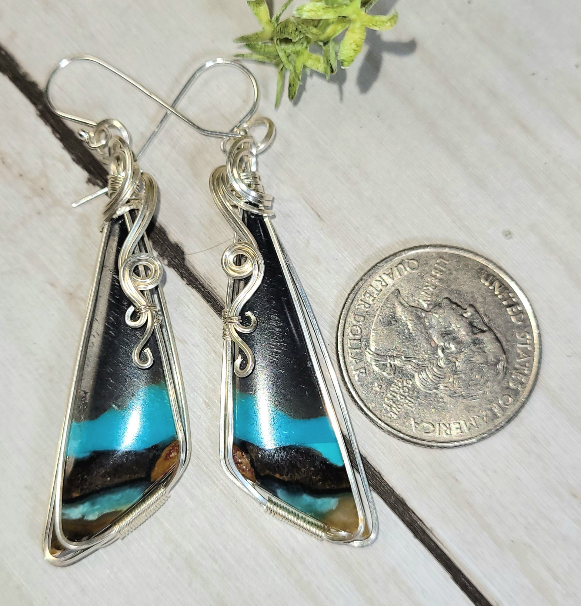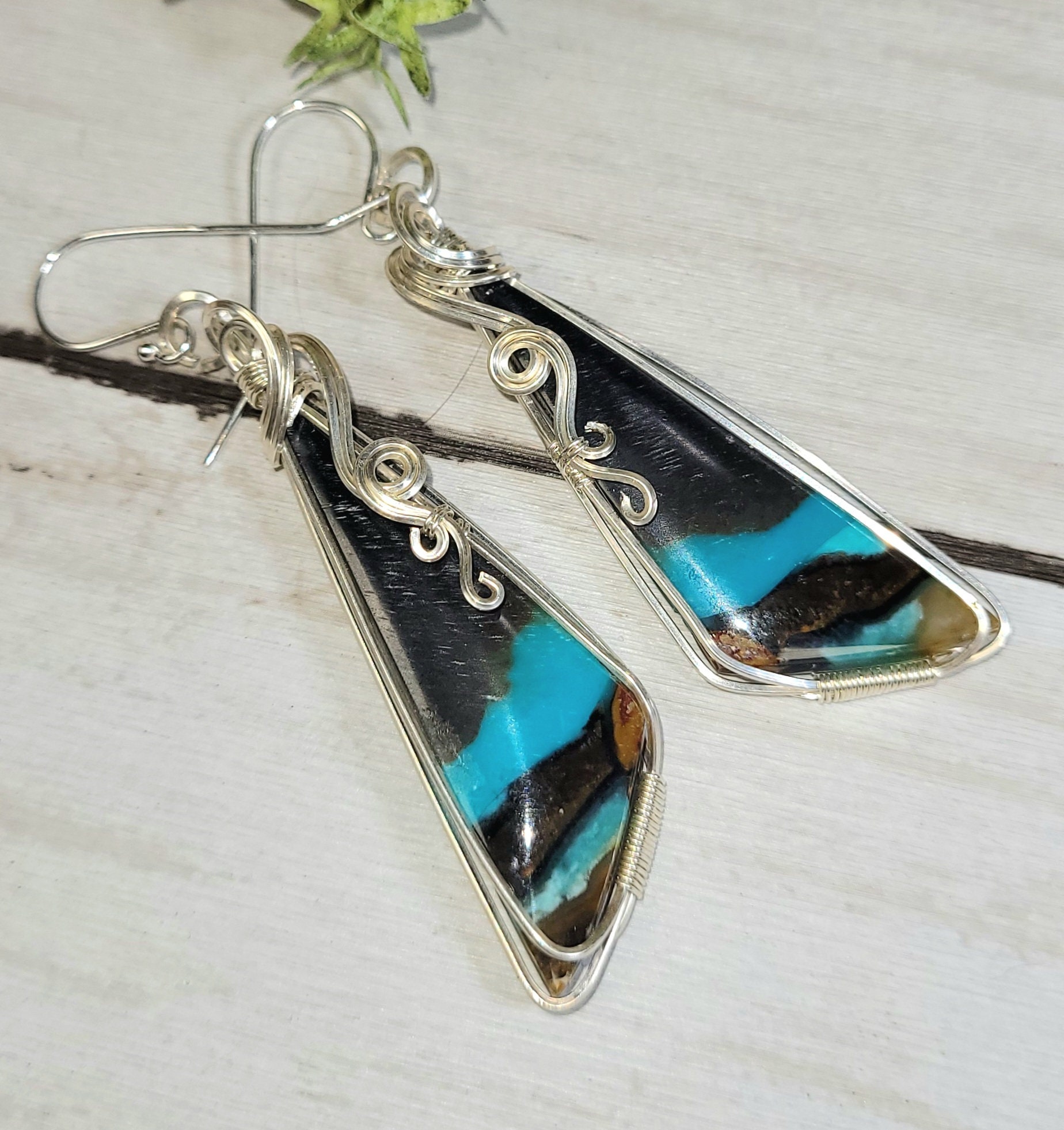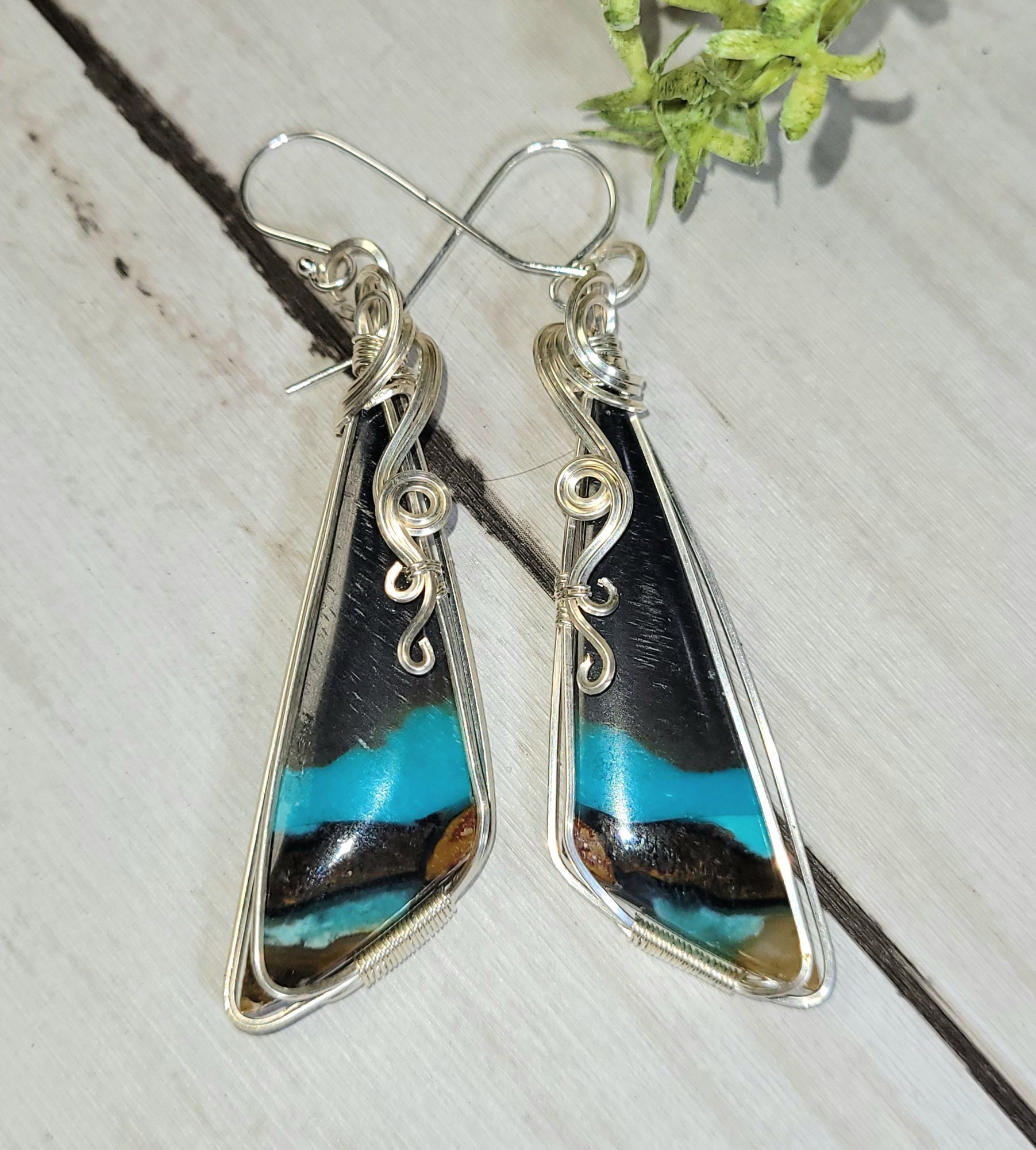 Natural Rare AAA Grade Blue Opalized Petrified Wood Handmade .925 Sterling Silver Wire Wrapped Earrings 10.9 Grams 2 5/8" x 11/16" GF12. Gift for Her Genuine Stones Gift for Her Genuine Stones! -A rare fragment from a recently-discovered vein of opal on the slopes of an Indonesian volcano, this stone formed when opaline silica flows formed in place of an ancient petrified forest. It’s said to enhance imagination, creativity, and spontaneity. All of our items are one of a kind and hand crafted. These stones are beautiful and are thousands of years old but only discovered a few years ago. We hand pick our stones from all over the world. Each item is handcrafted and one of a kind item. The silver is very study and not flimsy like some sellers. We guarantee all item to be sterling silver. We ship all of our items next day and offer expedited shipping. First class mail is free for purchases over $35. We accept returns within 30 days, only we will make exceptions during holidays. Please email us if you have any questions or problems, as we work hard to satisfy our customers so we can turn you into a repeat buyer.. Thanks so much for business and hope to see you on our site often. .Free shipping on all orders over $35.