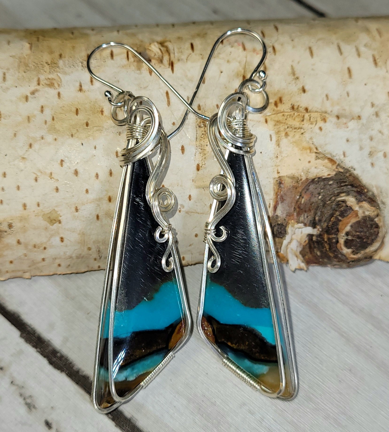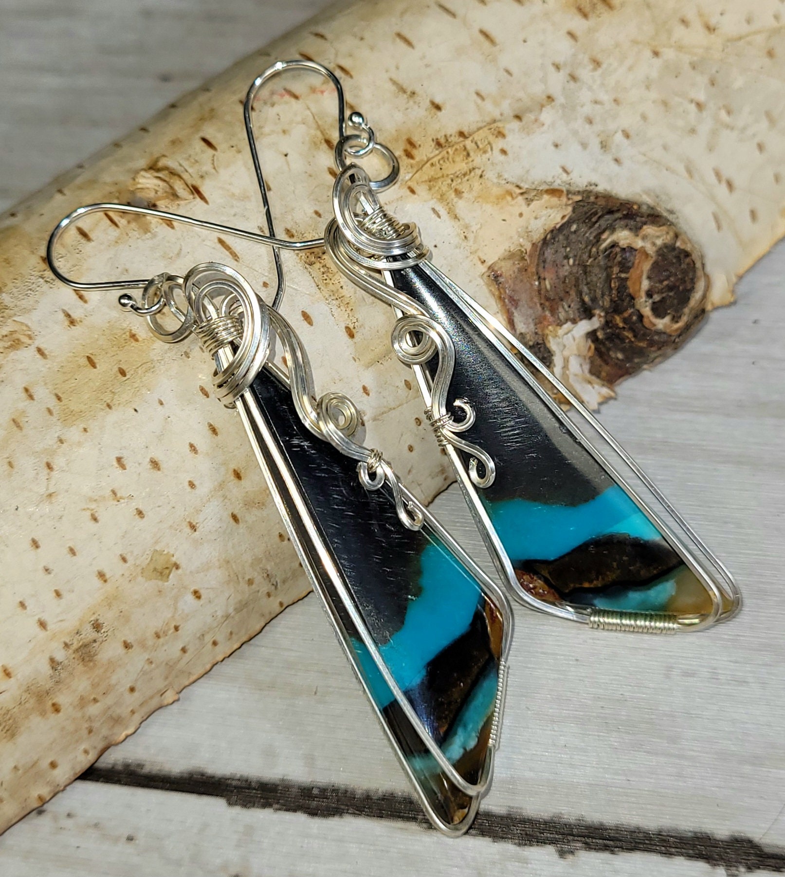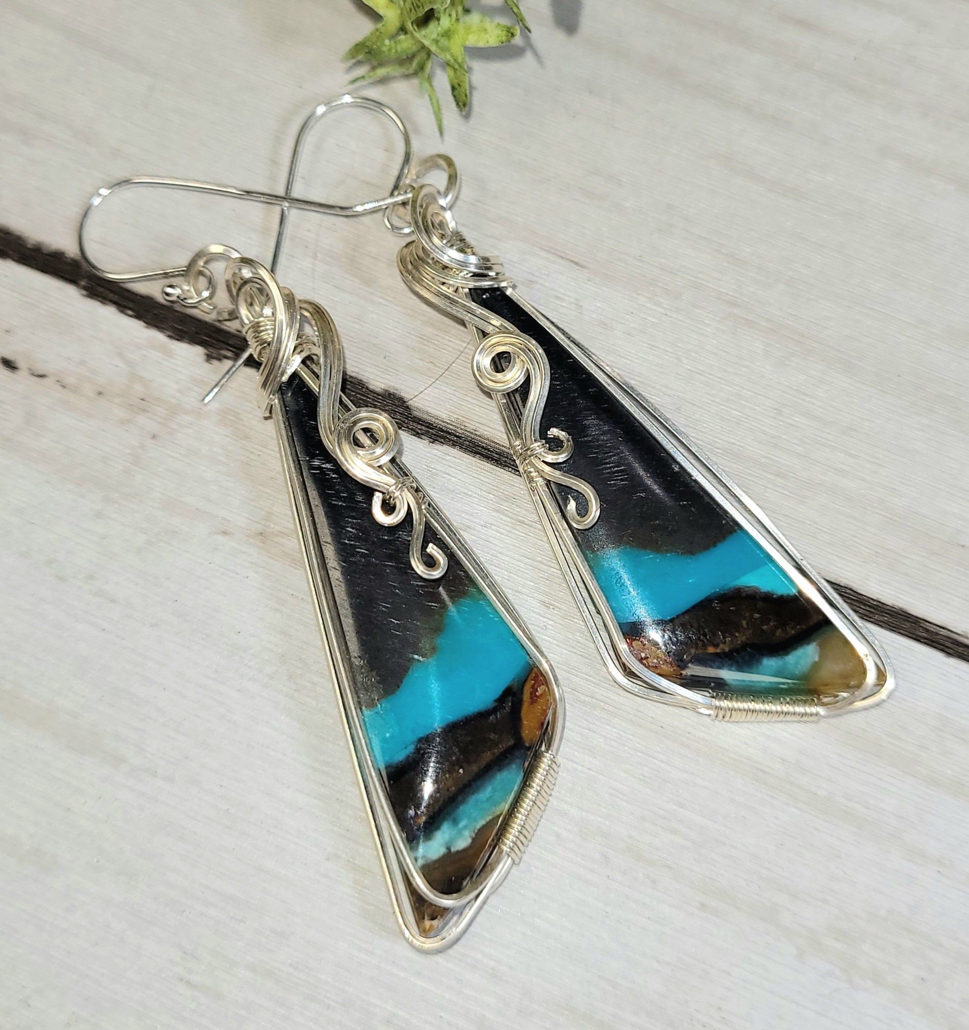 Natural Rare AAA Grade Blue Opalized Petrified Wood Handmade .925 Sterling Silver Wire Wrapped Earrings 10.9 Grams 2 5/8" x 11/16" GF12. Gift for Her Genuine Stones Gift for Her Genuine Stones! -A rare fragment from a recently-discovered vein of opal on the slopes of an Indonesian volcano, this stone formed when opaline silica flows formed in place of an ancient petrified forest. It’s said to enhance imagination, creativity, and spontaneity. All of our items are one of a kind and hand crafted. These stones are beautiful and are thousands of years old but only discovered a few years ago. We hand pick our stones from all over the world. Each item is handcrafted and one of a kind item. The silver is very study and not flimsy like some sellers. We guarantee all item to be sterling silver. We ship all of our items next day and offer expedited shipping. First class mail is free for purchases over $35. We accept returns within 30 days, only we will make exceptions during holidays. Please email us if you have any questions or problems, as we work hard to satisfy our customers so we can turn you into a repeat buyer.. Thanks so much for business and hope to see you on our site often. .Free shipping on all orders over $35.