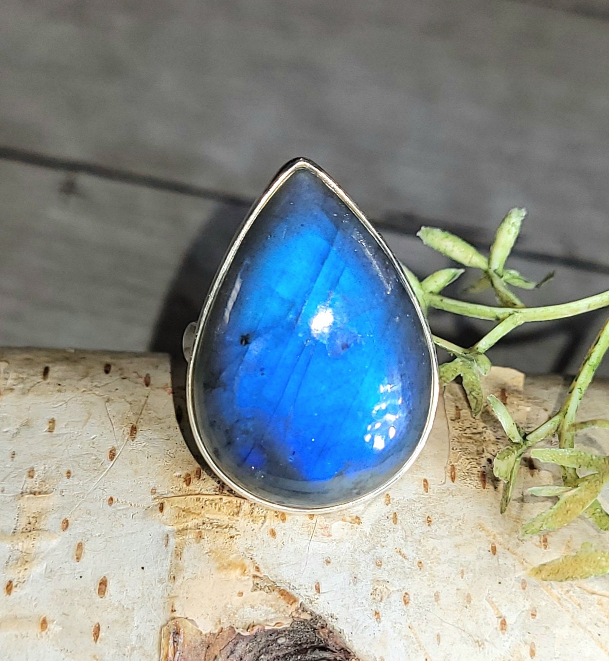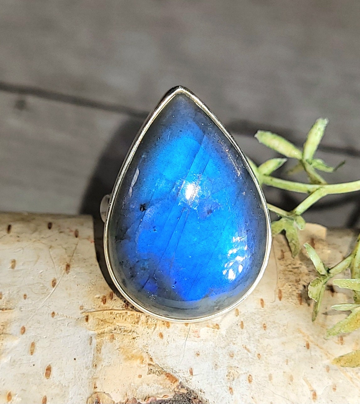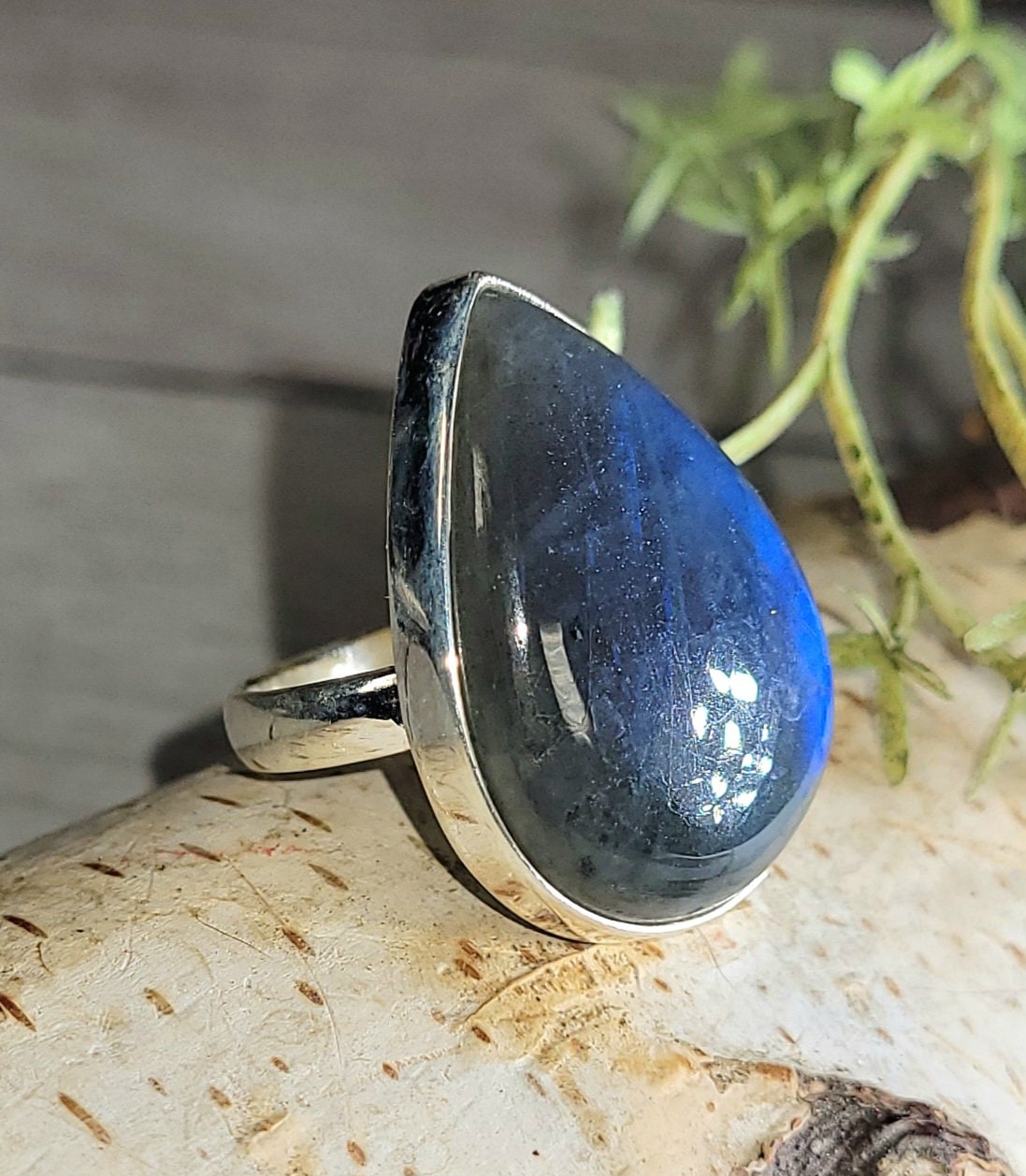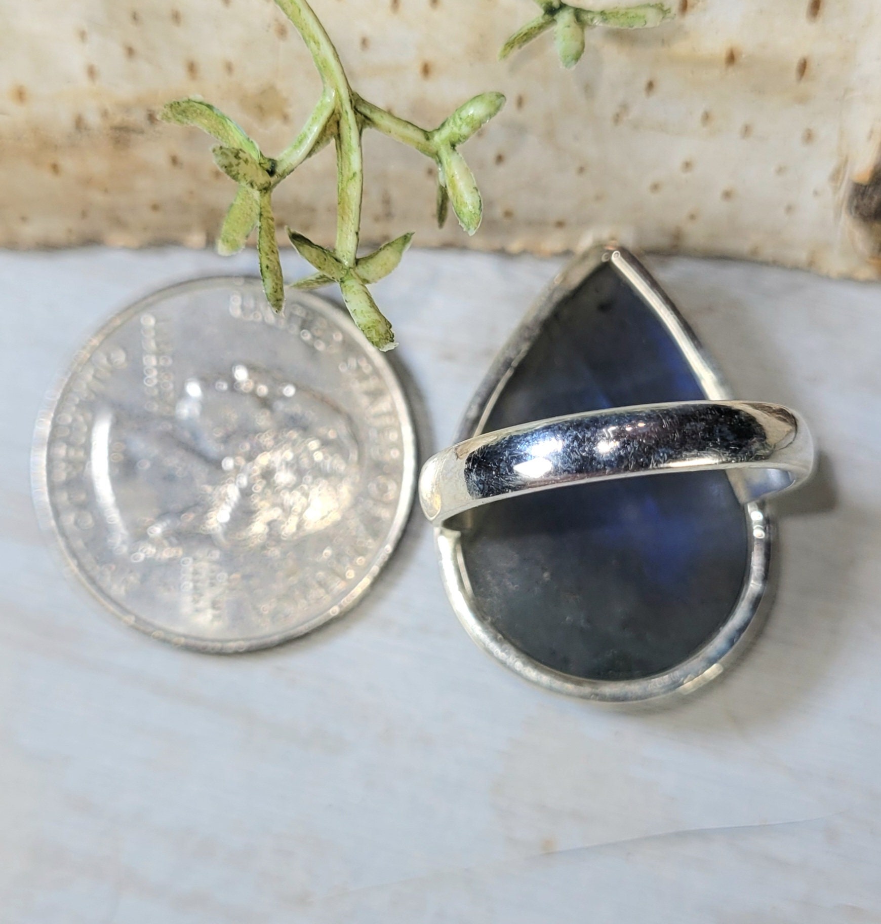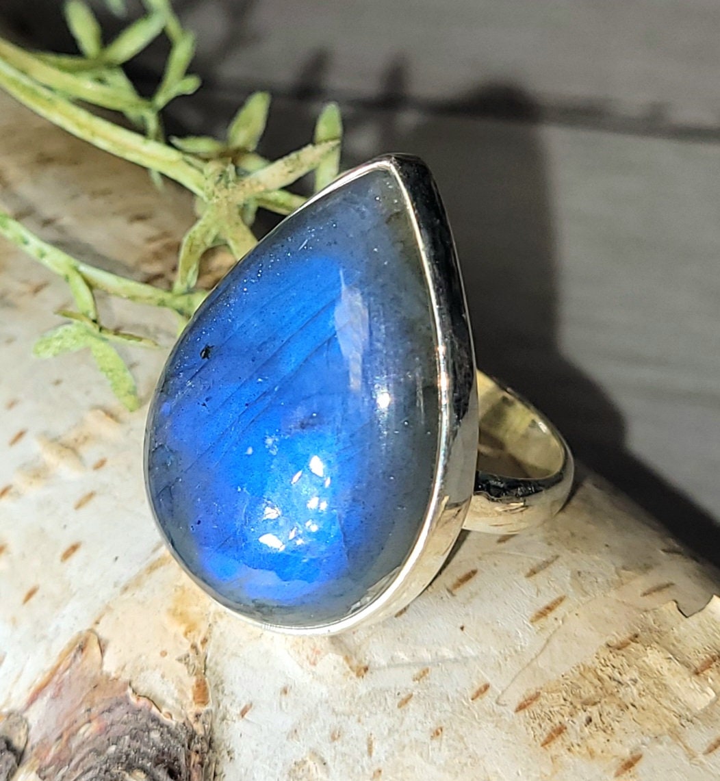 Natural AAA Grade Blue Flash Pear Labradorite Handmade .925 Sterling Silver Ring Size 7.5 8.4 Grams measures a little over an 1" x 13/16" GR16. This is a handpicked natural stone, the exact one shown in picture. The sterling silver is .925 and stamped. Each piece is hand made by artisans in my shop. The quality of the stones and the silver workmanship is impressive. Please look at other items in my store. I sell ready made jewelry with hand crafted silver work, pendants with a sterling silver bails and beautiful unique cabochons for jewelry wire wrapping and weaving. You will pay exact amount on shipping plus $1 for supplies and labor. All items are shipped within a couple of days after payment and are shipped USPS first class or international first class. Items are available for combined shipping, if invoice does not combine please email me and I will combine for you. Average shipping will be $4 to 4.50 for USPS first class. International shipping is available for exact amount of shipping plus $1 for labor and supplies also. We also accept returns for refund or exchange. Thanks for viewing my store