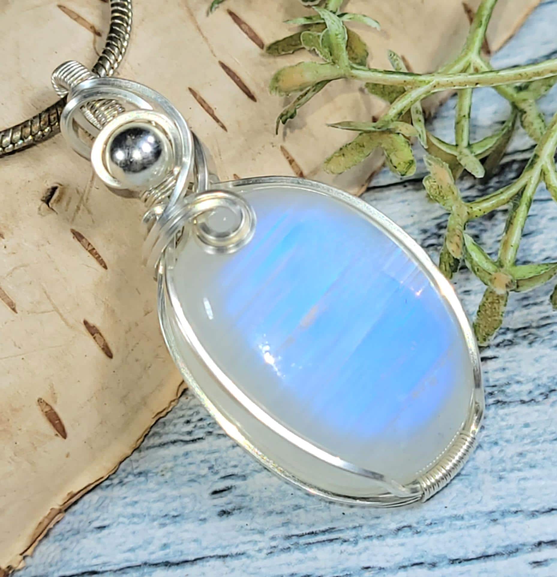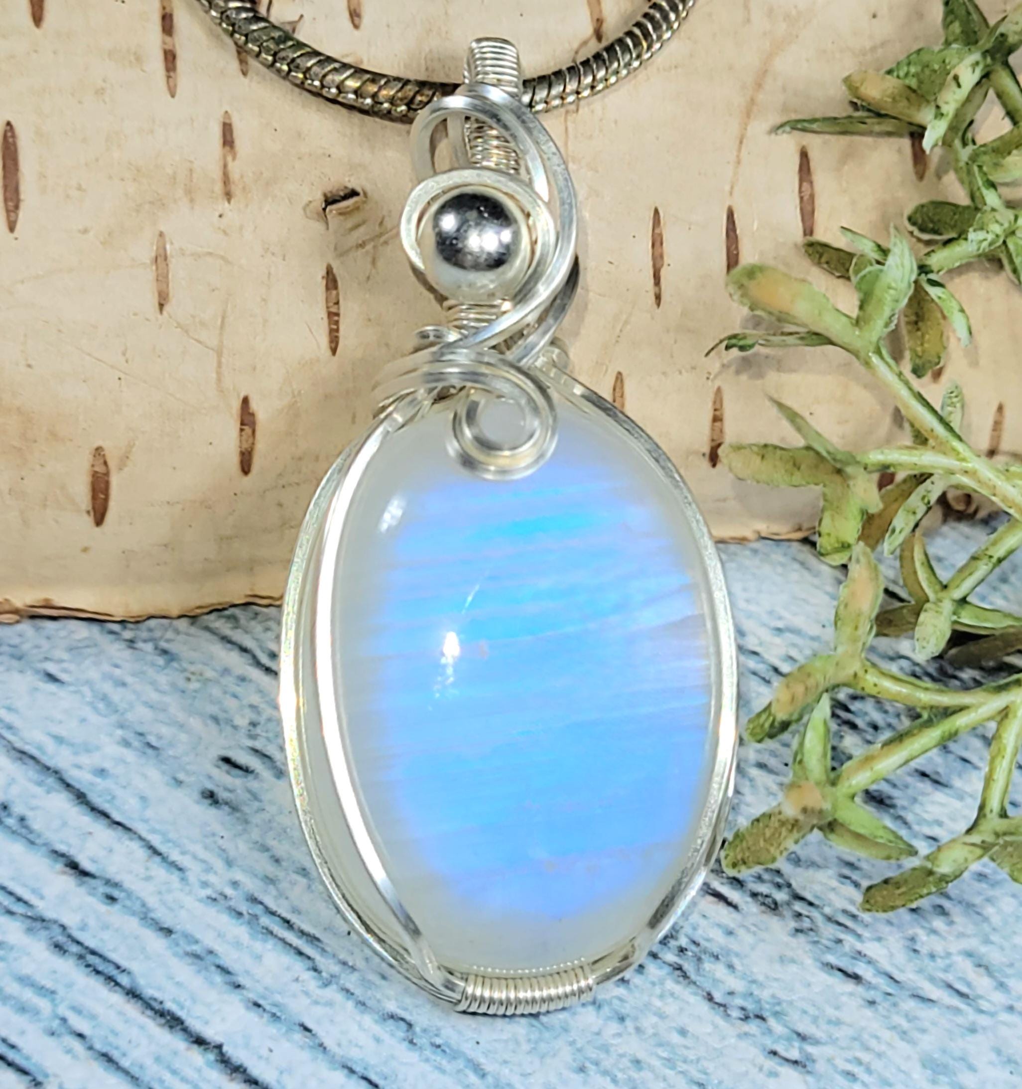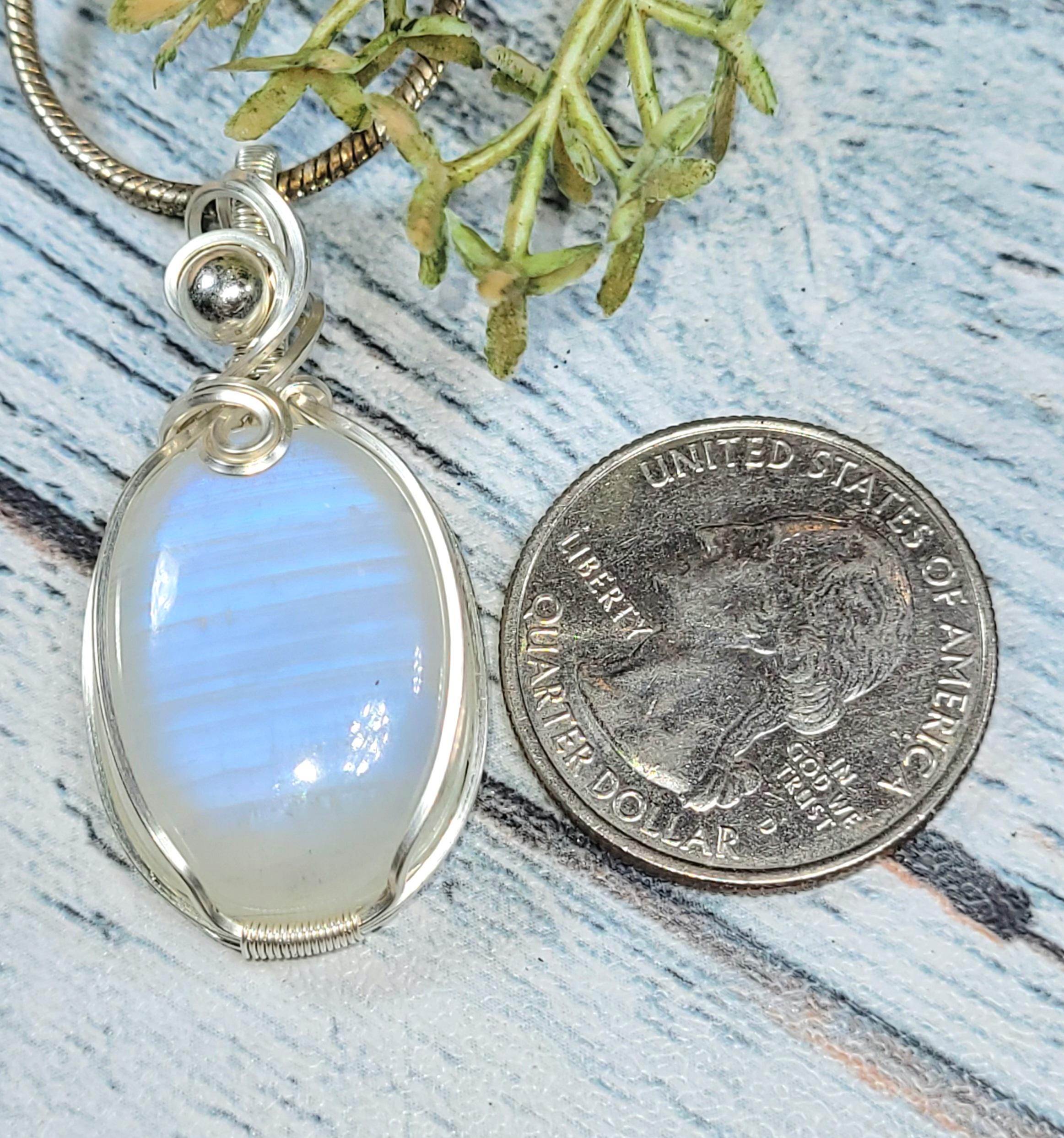 Natural Premium Grade Rainbow Moonstone Oval Hand Wire Wrapped .925 Sterling Silver Designer Pendant 1 11/16" x 7/8" 9.4 Grams JF38. Handmade Wire Wrapped Solid Sterling Silver. Absolutely gorgeous designer hand wrapped Sterling Silver with stunning detailed craftmanship. Absolutely gorgeous full multi color flash! If you are unhappy with any of our items please email us before you leave review. We stand behind our jewelry 100% with full refund if not completely satisfied!! This is a handpicked natural stone, the exact one shown in picture. The sterling silver is .925 and stamped. Each piece is handmade by artisans in my shop. The quality of the stones and the silver craftmanship is impressive in all items. Please look at other items in my store. I sell ready made jewelry with handcrafted silver work, pendants with a sterling silver bails and beautiful unique stones for jewelry wire wrapping and weaving. You will pay exact amount on shipping plus $1 for supplies and labor. All items are shipped within a couple of days after payment and are shipped USPS first class or international first class. Items are available for combined shipping, if invoice does not combine please email me and I will combine for you. Average shipping will be $4 to 4.50 for USPS first class. International shipping is available for exact amount of shipping plus $1 for labor and supplies also. We also accept returns for refund or exchange. Thanks for viewing my store.