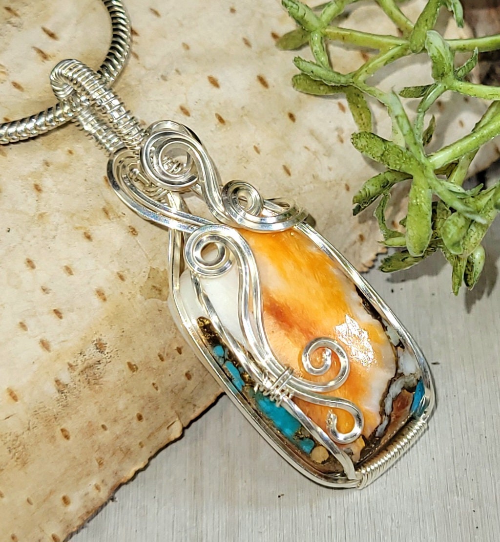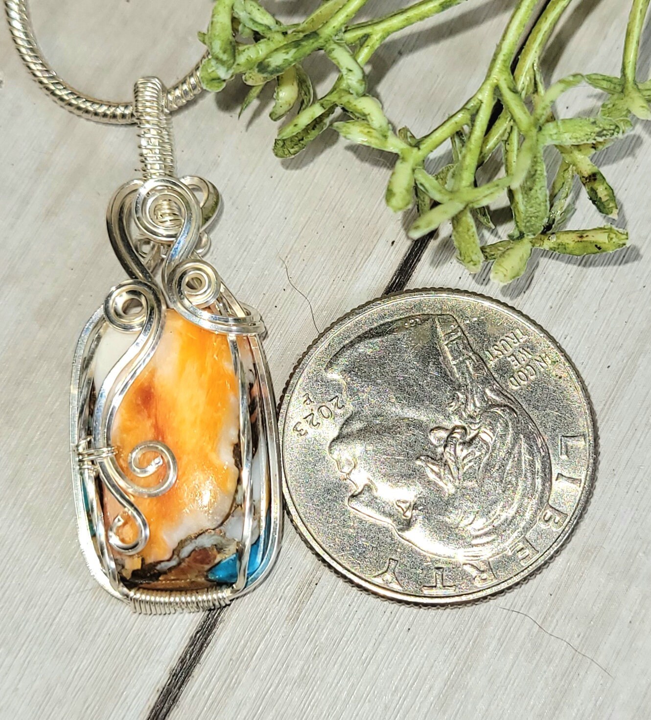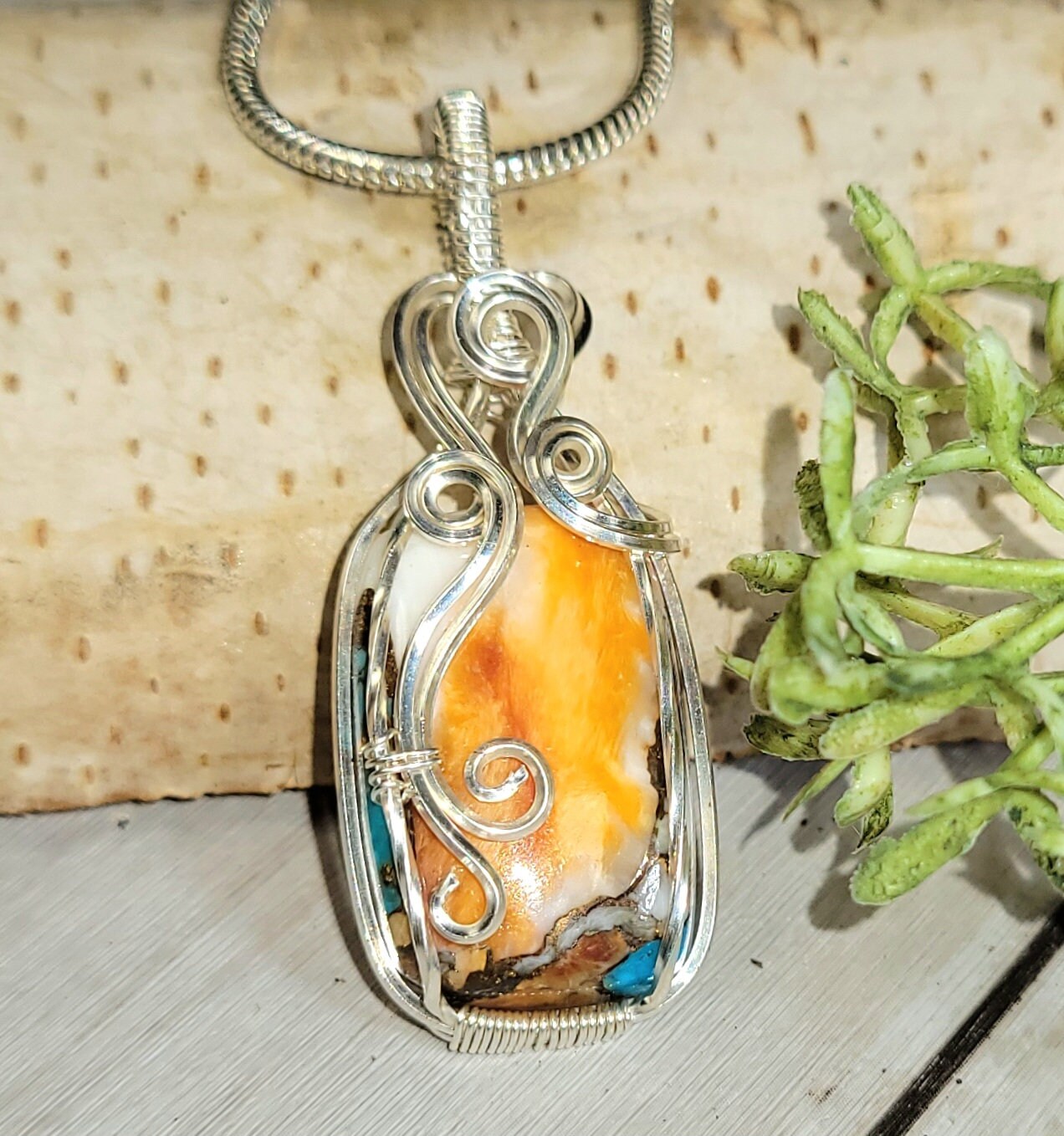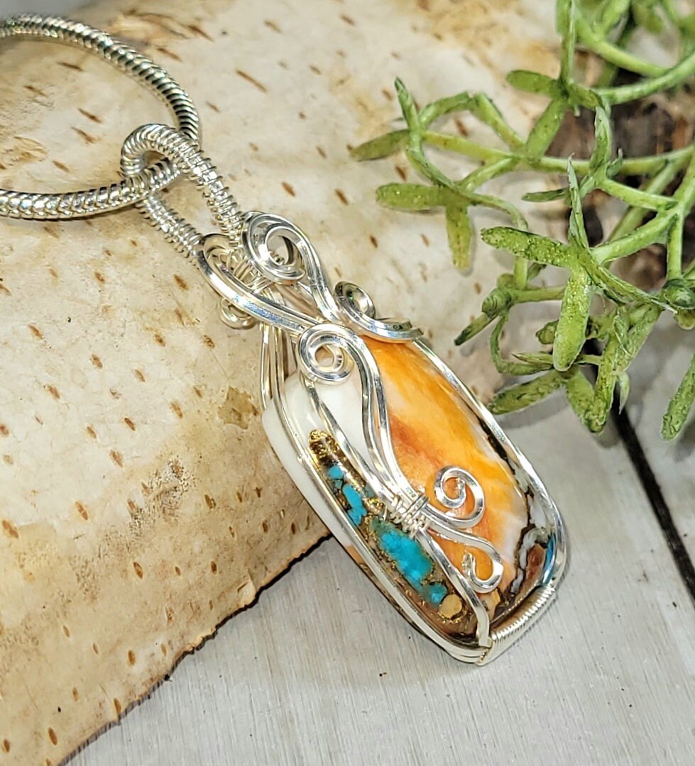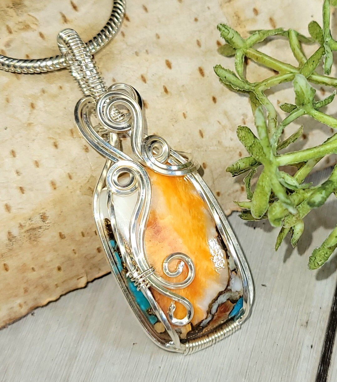 Premium Multi Color Rectangle Spiny Copper Oyster Wire Wrapped .925 Sterling Silver Pendant 1 5/8" x 5/8" 5.1 Grams HD17. Handmade Wrapped Solid Sterling Silver. Absolutely gorgeous designer hand wrapped Sterling Silver with stunning detailed craftmanship. If you are unhappy with any of our items please email us before you leave review. We stand behind our jewelry 100% with full refund if not completely satisfied!! This is a handpicked natural stone, the exact one shown in picture. The sterling silver is .925 and stamped. Each piece is handmade by artisans in my shop. The quality of the stones and the silver craftmanship is impressive in all items. Please look at other items in my store. I sell ready made jewelry with handcrafted silver work, pendants with a sterling silver bails and beautiful unique stones for jewelry wire wrapping and weaving. You will pay exact amount on shipping plus $1 for supplies and labor. All items are shipped within a couple of days after payment and are shipped USPS first class or international first class. Items are available for combined shipping, if invoice does not combine please email me and I will combine for you. Average shipping will be $4 to 4.50 for USPS first class. International shipping is available for exact amount of shipping plus $1 for labor and supplies also. We also accept returns for refund or exchange. Thanks for viewing my store.