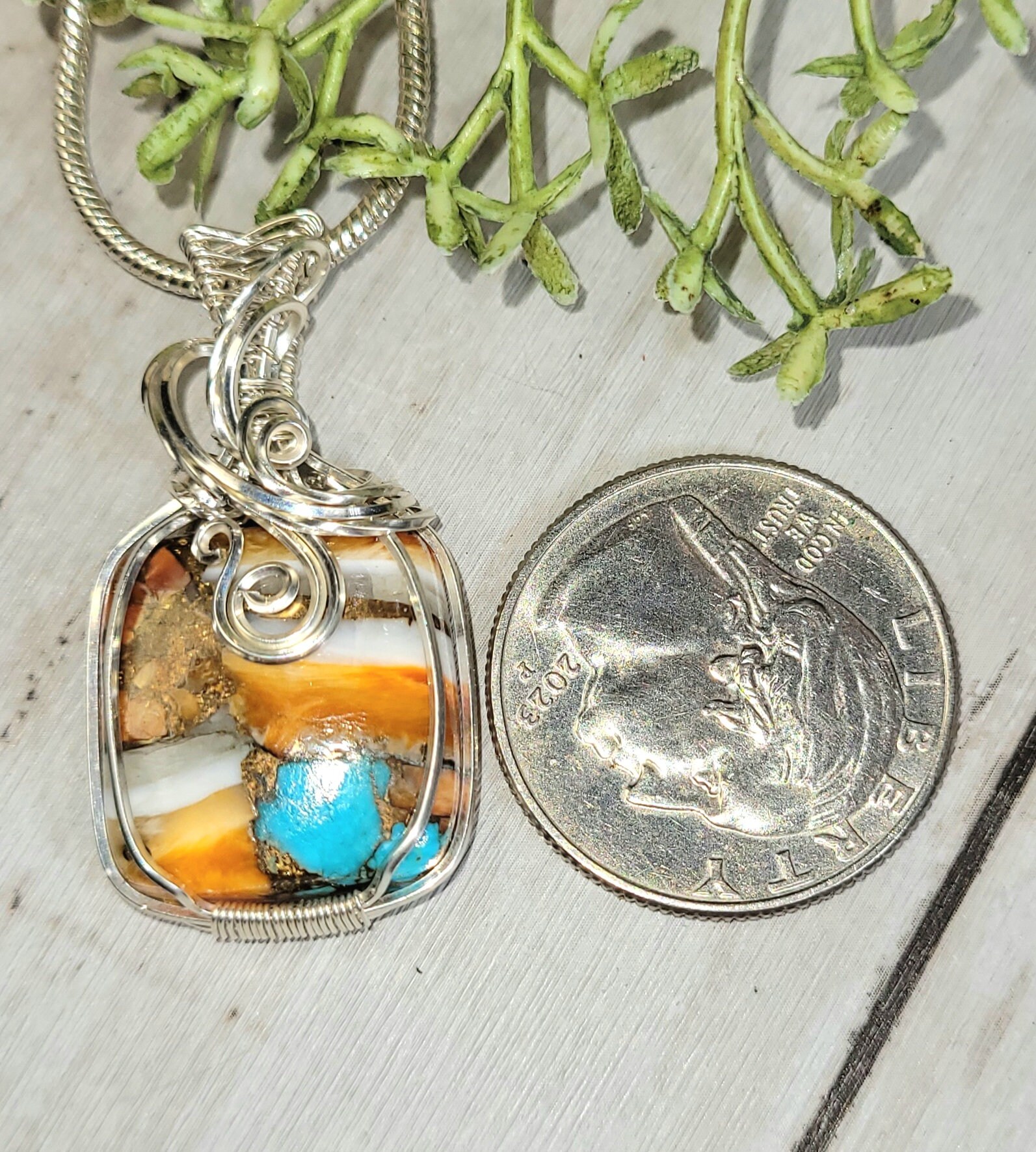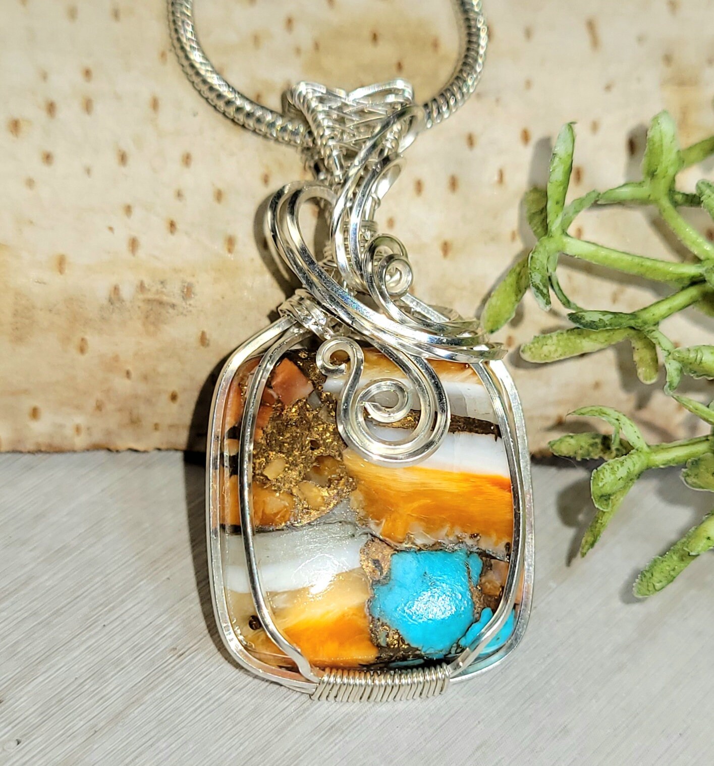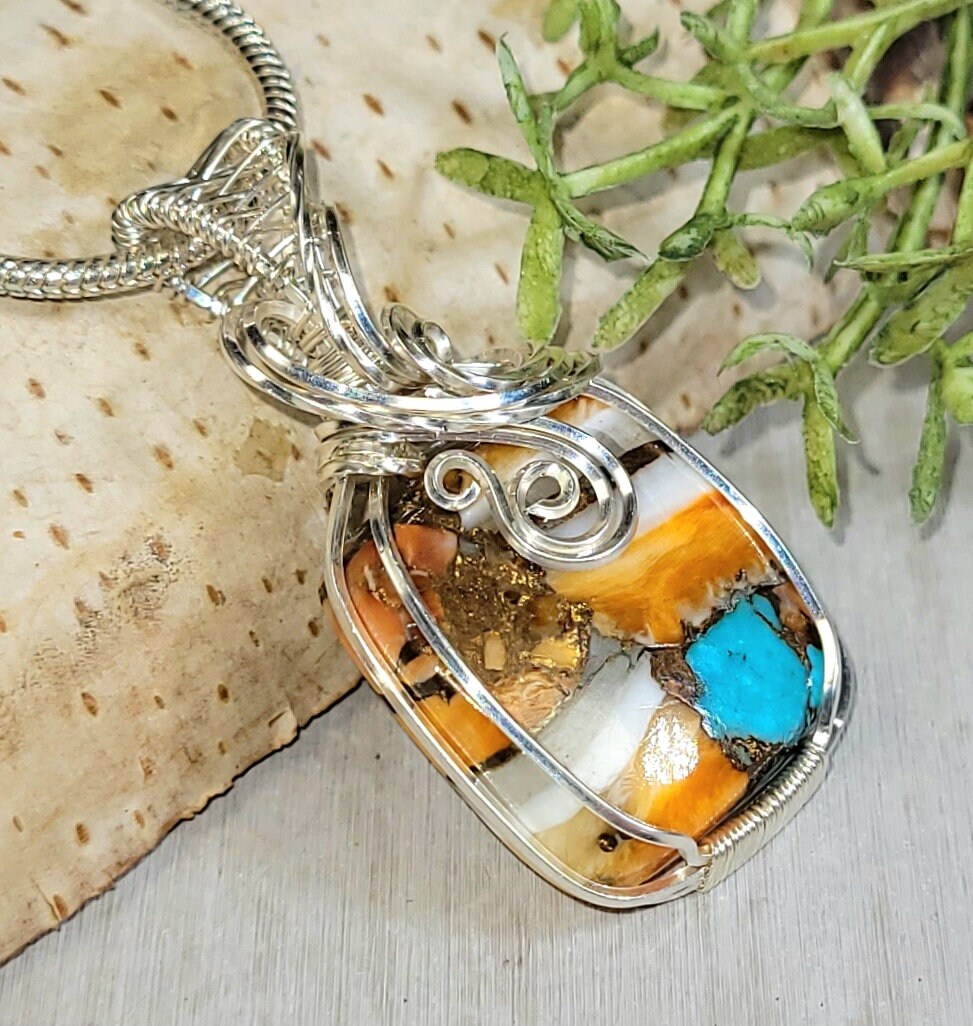 Premium Multi Color Rectangle Spiny Copper Oyster Wire Wrapped .925 Sterling Silver Pendant 1 1/2" x 13/16" 6.1 Grams HC27. Handmade Wrapped Solid Sterling Silver. Absolutely gorgeous designer hand wrapped Sterling Silver with stunning detailed craftmanship. If you are unhappy with any of our items please email us before you leave review. We stand behind our jewelry 100% with full refund if not completely satisfied!! This is a handpicked natural stone, the exact one shown in picture. The sterling silver is .925 and stamped. Each piece is handmade by artisans in my shop. The quality of the stones and the silver craftmanship is impressive in all items. Please look at other items in my store. I sell ready made jewelry with handcrafted silver work, pendants with a sterling silver bails and beautiful unique stones for jewelry wire wrapping and weaving. You will pay exact amount on shipping plus $1 for supplies and labor. All items are shipped within a couple of days after payment and are shipped USPS first class or international first class. Items are available for combined shipping, if invoice does not combine please email me and I will combine for you. Average shipping will be $4 to 4.50 for USPS first class. International shipping is available for exact amount of shipping plus $1 for labor and supplies also. We also accept returns for refund or exchange. Thanks for viewing my store.