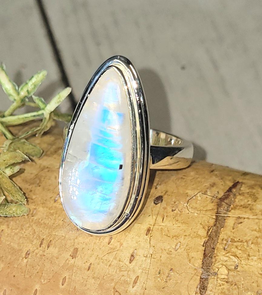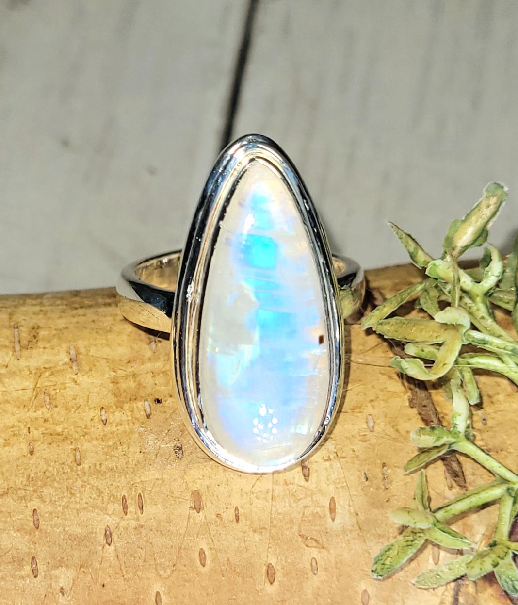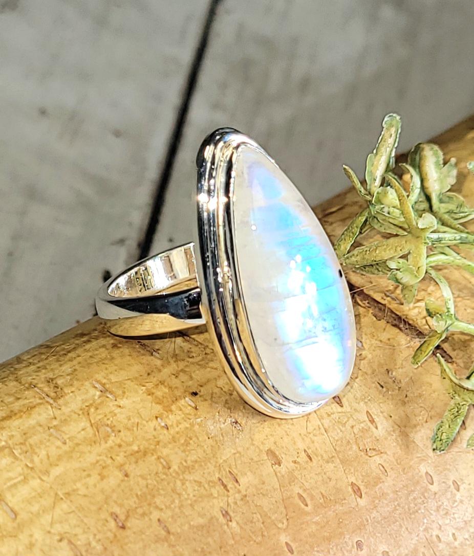 Natural AAAA Grade Multi Flash Moonstone Pear .925 Sterling Silver Ring Size 7.5 weighs 10 Grams 1 1/8" x 9/16" HM16G. This is a hand selected natural stone, the exact one shown in picture. The sterling silver is .925 and stamped. Each piece is hand made by artisans in my shop. The quality of the stones and the silver workmanship is impressive. Please look at other items in my store. I sell ready made jewelry with hand crafted silver work, pendants with a sterling silver bails and beautiful unique cabochons for jewelry wire wrapping and weaving. You will pay exact amount on shipping plus $1 for supplies and labor. All items are shipped within a couple of days after payment and are shipped USPS first class or international first class. Items are available for combined shipping, if invoice does not combine please email me and I will combine for you. Average shipping will be $4 to 4.50 for USPS first class. International shipping is available for exact amount of shipping plus $1 for labor and supplies also. We also accept returns for refund or exchange. Thanks for viewing my store