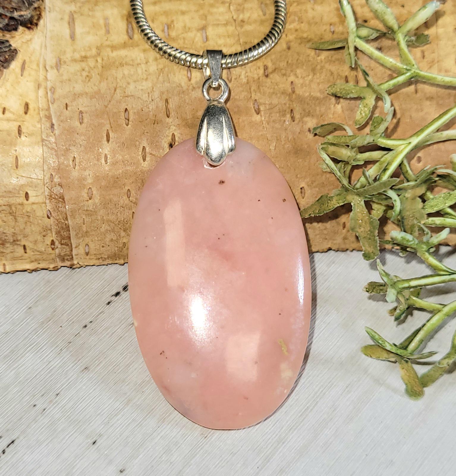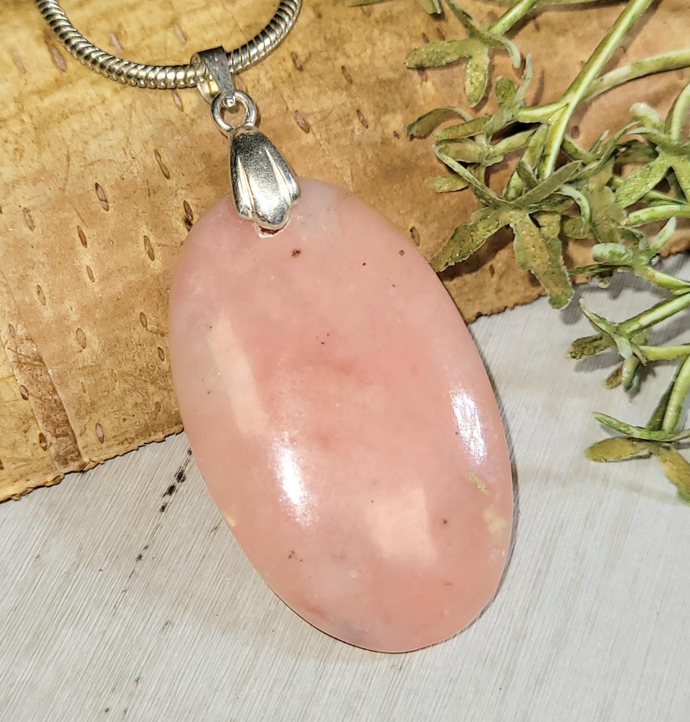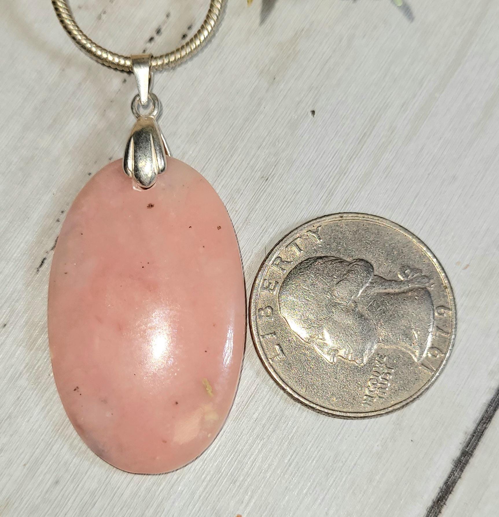 Natural Premium Grade Rare Peru Pink Opal Cabochon .925 Sterling Silver Pendant 30ct 1 7/8" x 15/16" HM20. Solid Sterling Silver Rhodium Plated Bail will accommodate up to a 3mm and resist tarnishing. This is a handpicked natural stone, the exact one shown in picture. The sterling silver is .925 and stamped. Each piece is handmade by artisans in my shop. The quality of the stones and the silver craftmanship is impressive. Please look at other items in my store. I sell ready made jewelry with handcrafted silver work, pendants with a sterling silver bails and beautiful unique stones for jewelry wire wrapping and weaving. You will pay exact amount on shipping plus $1 for supplies and labor. All items are shipped within a couple of days after payment and are shipped USPS first class or international first class. Items available for combined shipping, if invoice does not combine please email me and I will combine for you. Average shipping will be $4 to 4.50 for USPS first class. International shipping is available for exact amount of shipping plus $1 for labor and supplies also. We also accept returns for refund or exchange. Thanks for viewing my store