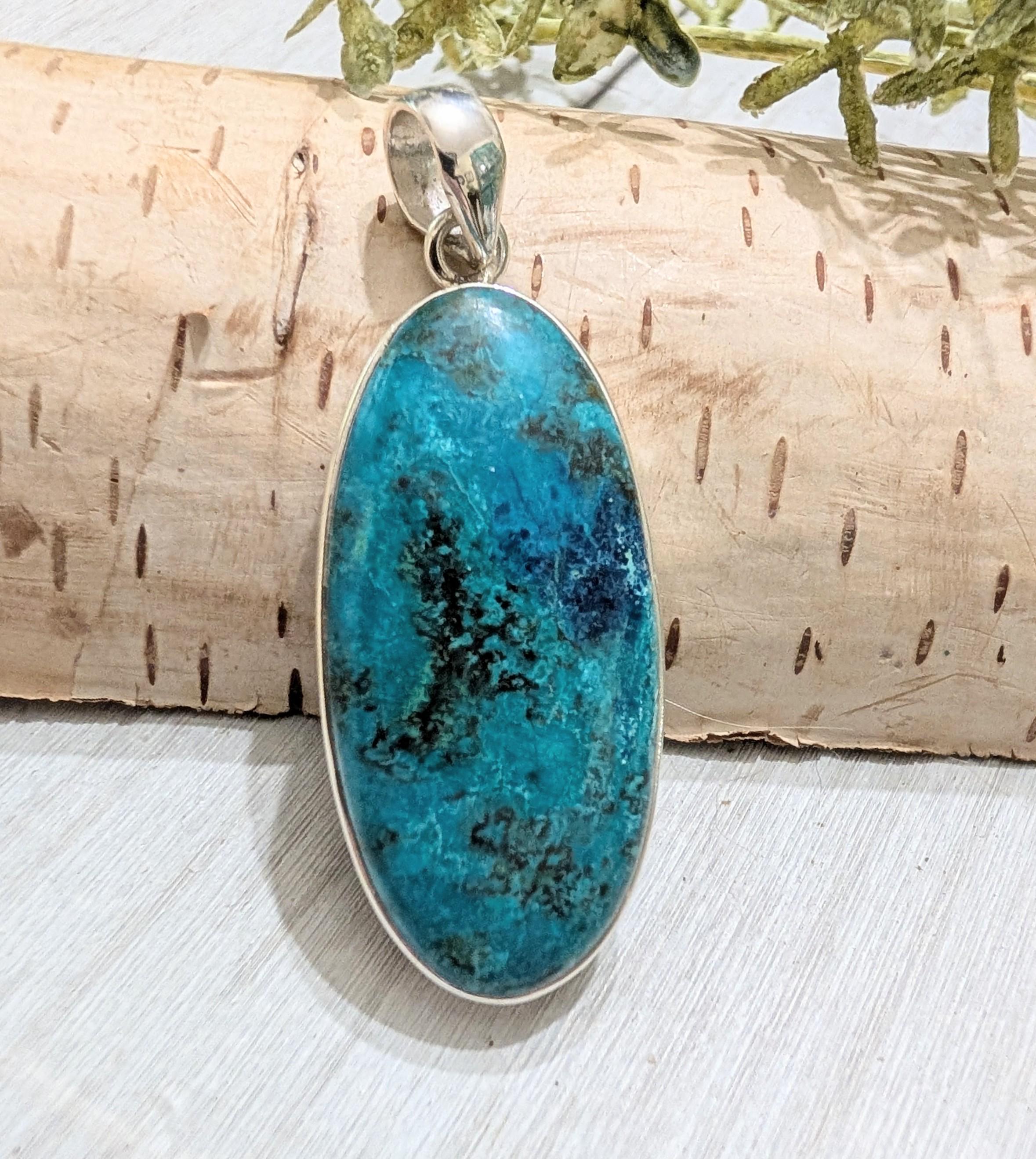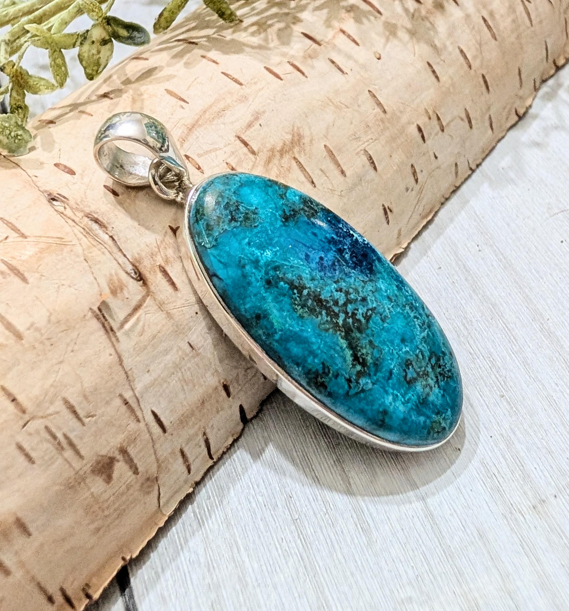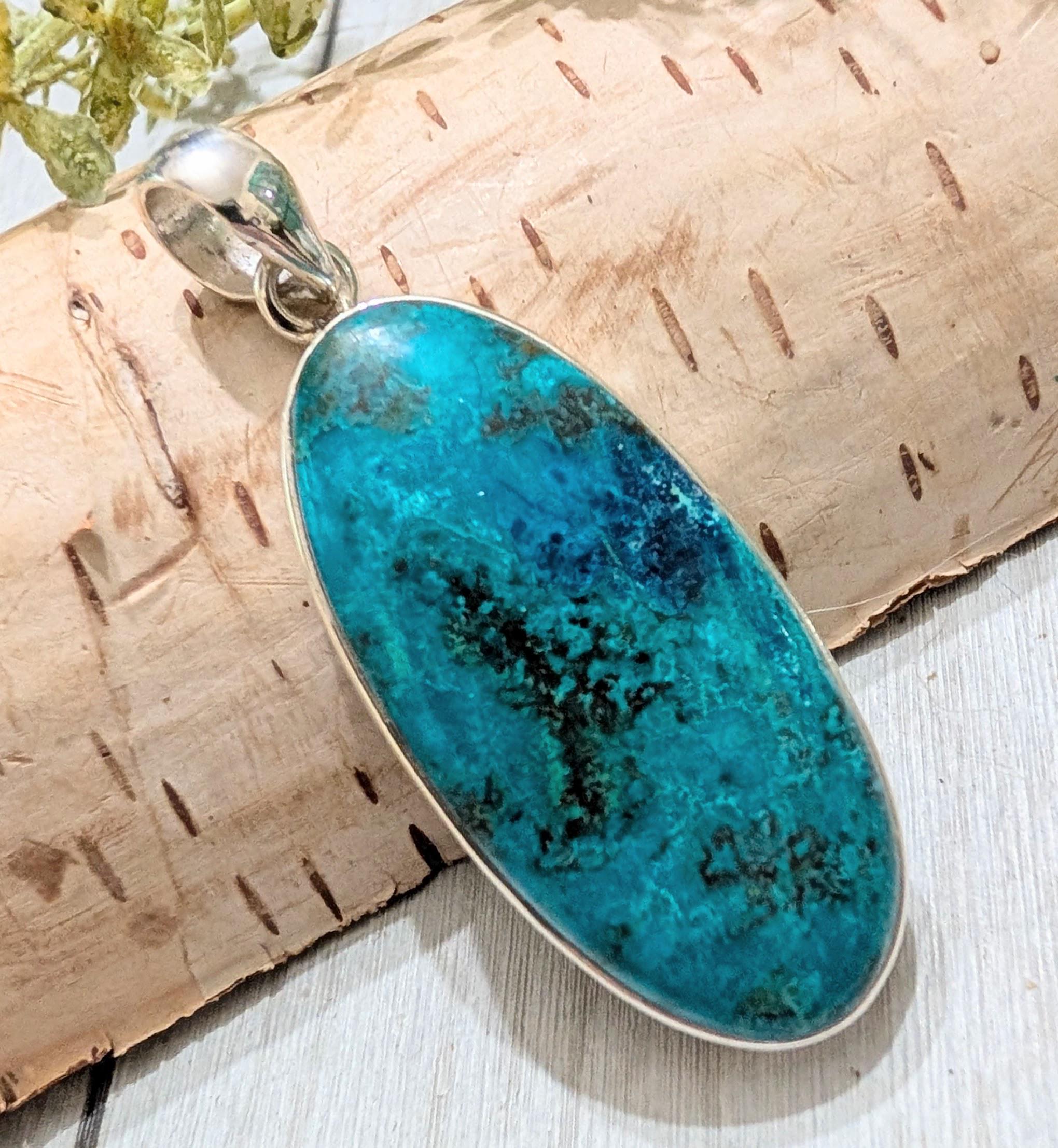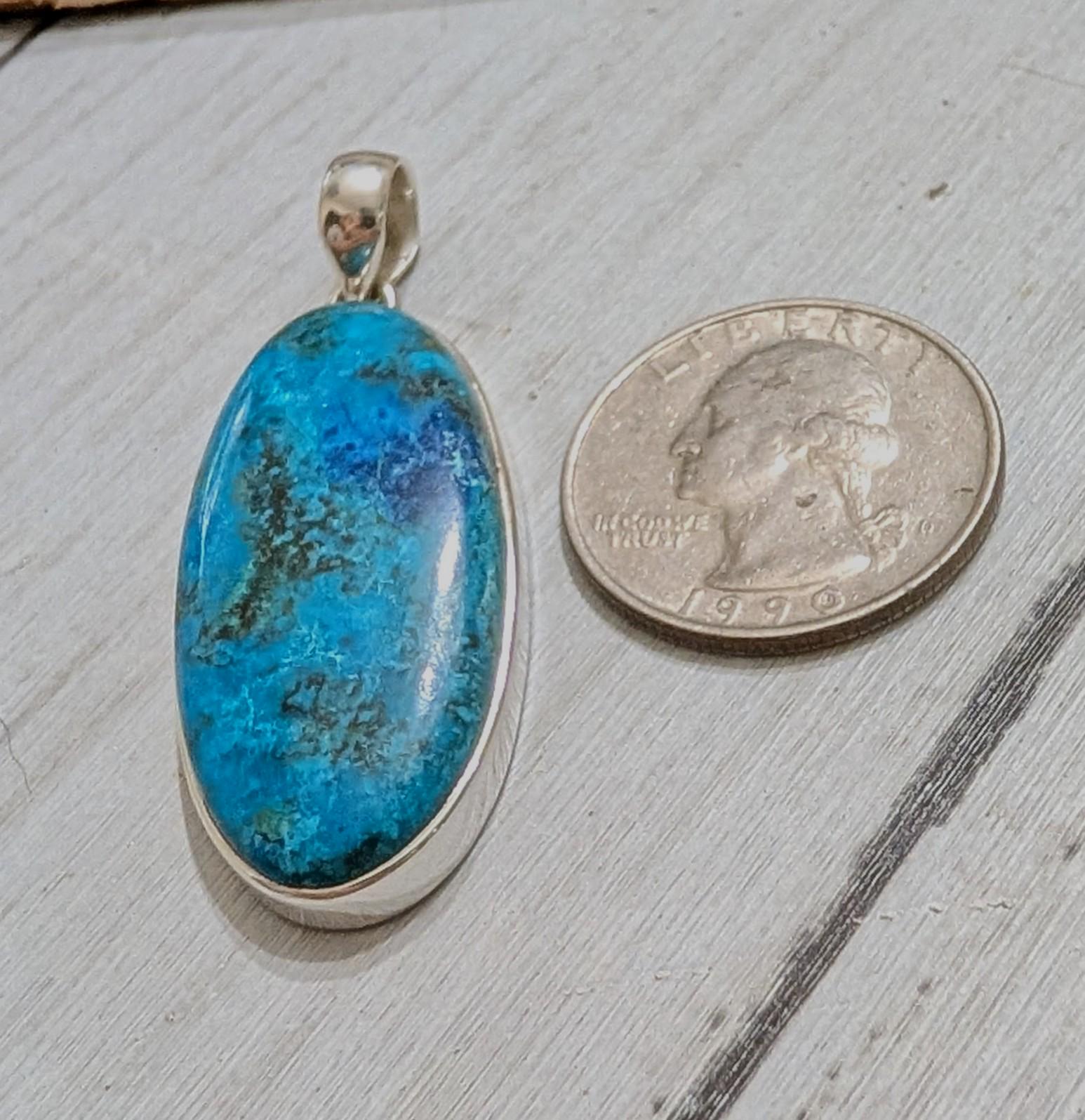 Natural High Quality Shattuckite .925 Sterling Silver Pendant 3/4" x 2 1/4 " 11 Grams HS02. Handmade Set in Solid Sterling Silver. Absolutely gorgeous stone. This is a handpicked natural stone, the exact one shown in picture. The sterling silver is .925 and stamped. Each piece is handmade by artisans in our shop. The quality of the stones and the silver craftmanship is impressive in all items. Please look at other items in our store. I sell ready-made jewelry with handcrafted silver work, pendants with a sterling silver bails, and beautiful unique stones for jewelry wire wrapping and weaving. If you are unhappy with any of our, items please email us before you leave review. We stand behind our jewelry 100% with full refund if not completely satisfied! FREE shipping for all domestic items over $35. For all other items you will pay the exact amount on shipping plus $1 for supplies and labor. All items are shipped within a couple of days after payment and are shipped USPS first class or international first class. Items are available for combined shipping, if invoice does not combine, please email us and we will combine for you. Average shipping will be $4 to 4.50 for USPS first class. International shipping is available for exact amount of shipping plus $1 for labor and supplies also. We also accept returns for refund or exchange. Thanks for viewing our store.