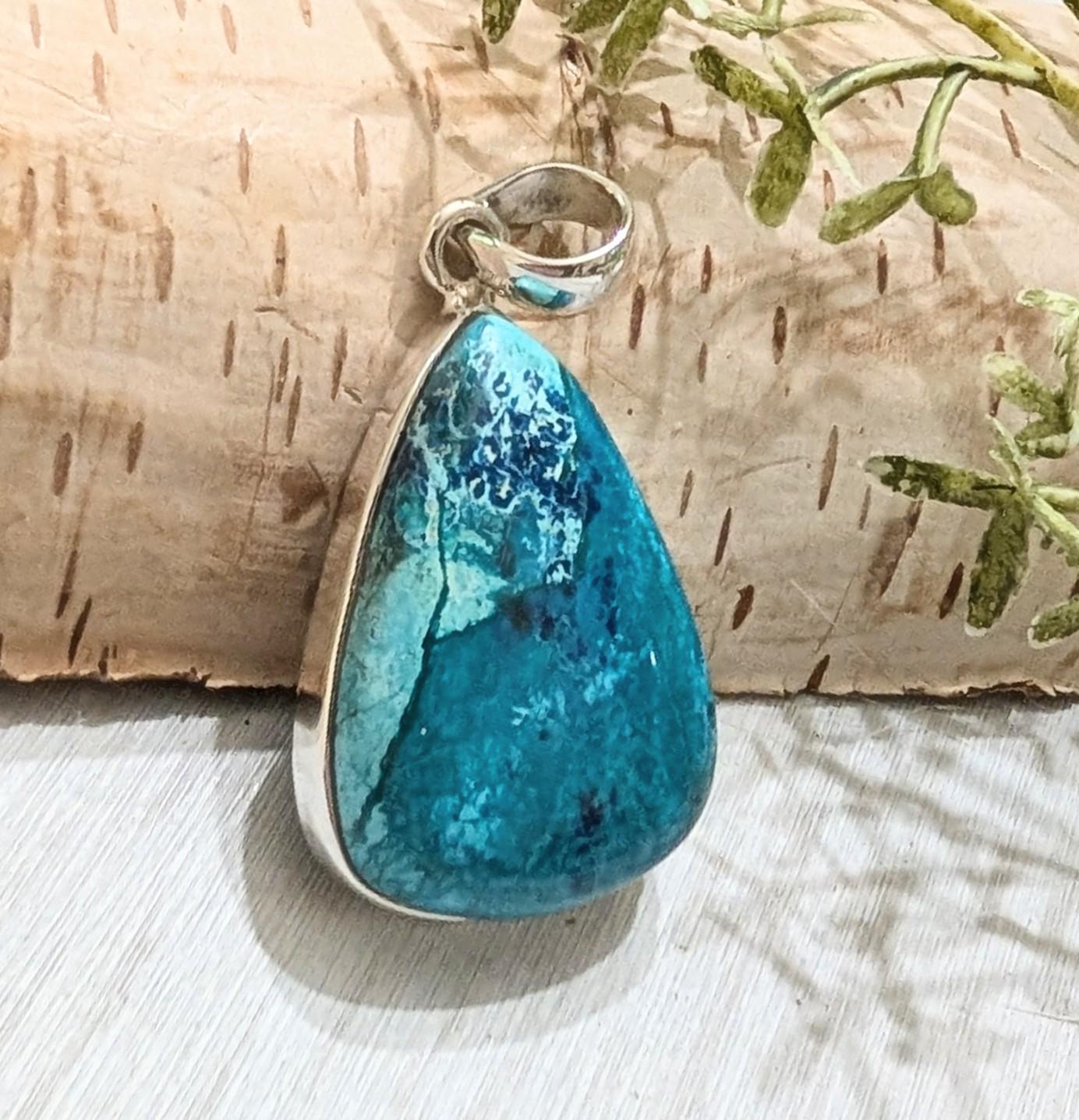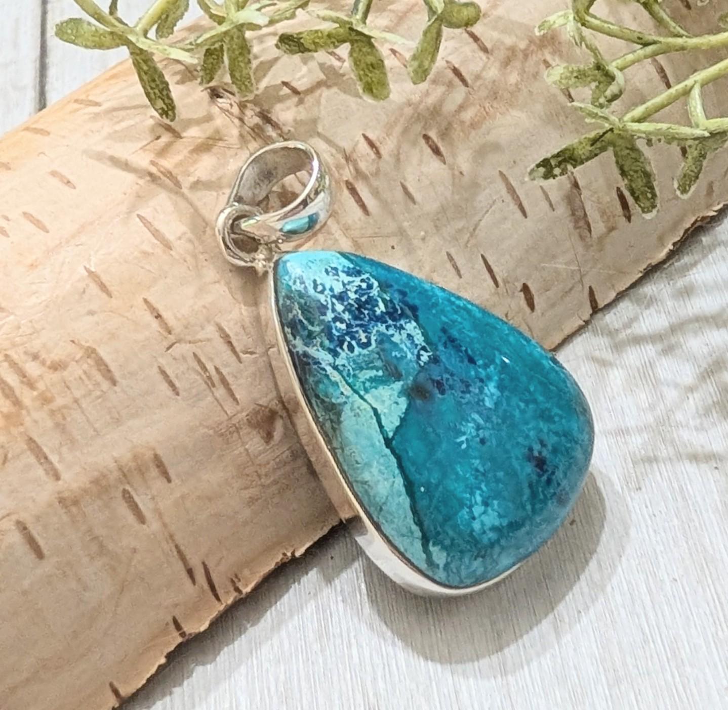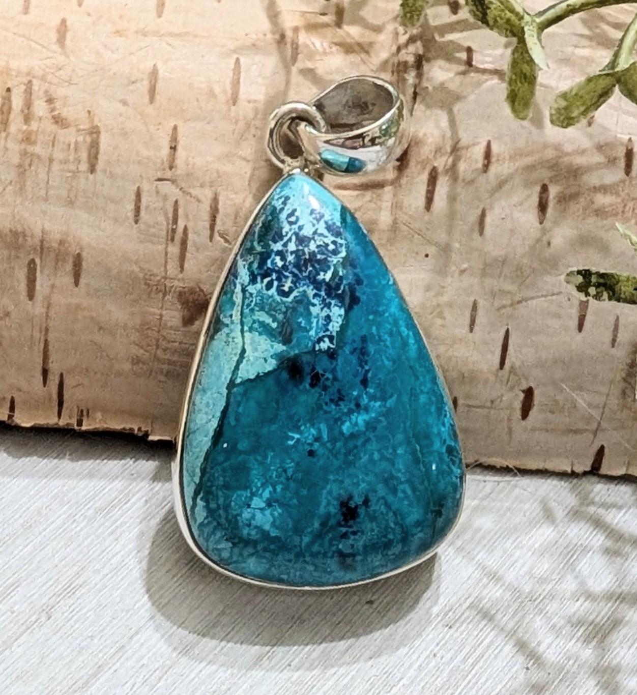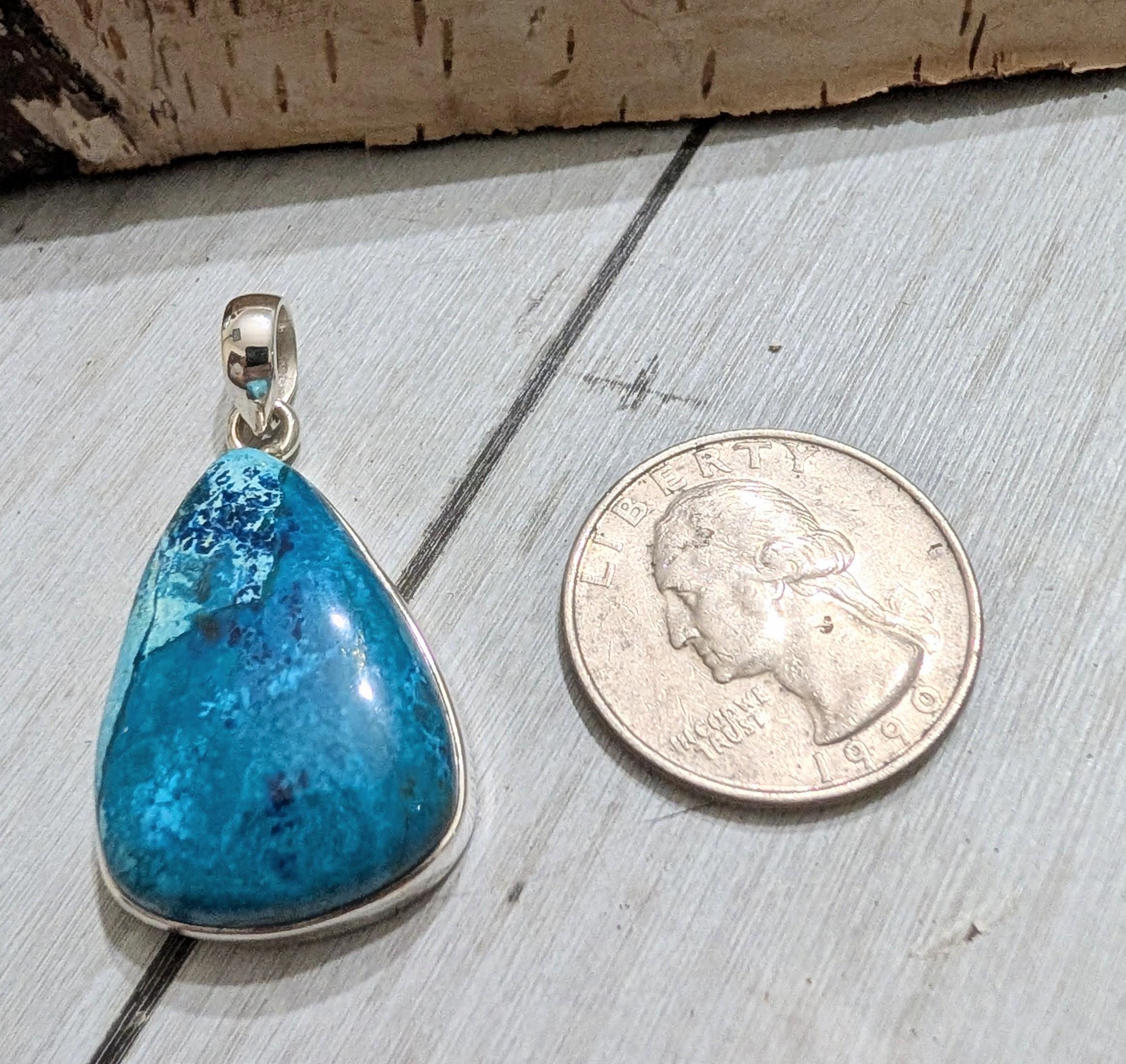 Natural High Quality Shattuckite .925 Sterling Silver Pendant 1 1/2" x 7/8 " 10 Grams HS03. Handmade Set in Solid Sterling Silver. Absolutely gorgeous stone. This is a handpicked natural stone, the exact one shown in picture. The sterling silver is .925 and stamped. Each piece is handmade by artisans in our shop. The quality of the stones and the silver craftmanship is impressive in all items. Please look at other items in our store. I sell ready-made jewelry with handcrafted silver work, pendants with a sterling silver bails, and beautiful unique stones for jewelry wire wrapping and weaving. If you are unhappy with any of our, items please email us before you leave review. We stand behind our jewelry 100% with full refund if not completely satisfied! FREE shipping for all domestic items over $35. For all other items you will pay the exact amount on shipping plus $1 for supplies and labor. All items are shipped within a couple of days after payment and are shipped USPS first class or international first class. Items are available for combined shipping, if invoice does not combine, please email us and we will combine for you. Average shipping will be $4 to 4.50 for USPS first class. International shipping is available for exact amount of shipping plus $1 for labor and supplies also. We also accept returns for refund or exchange. Thanks for viewing our store.