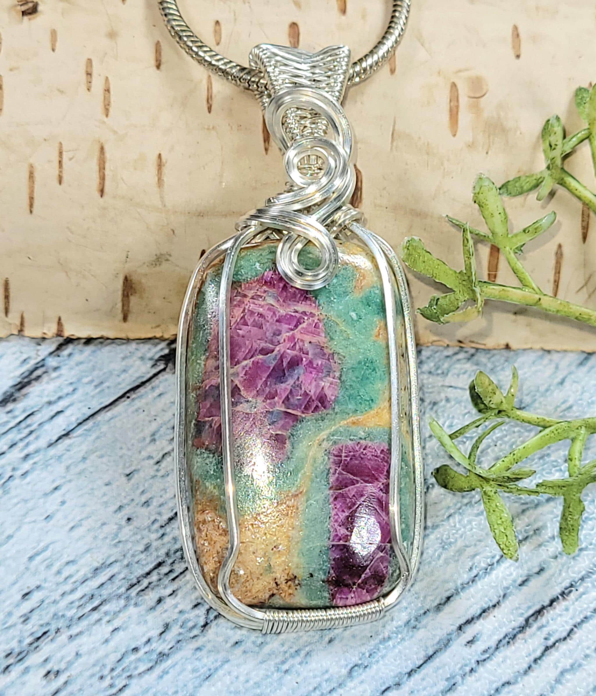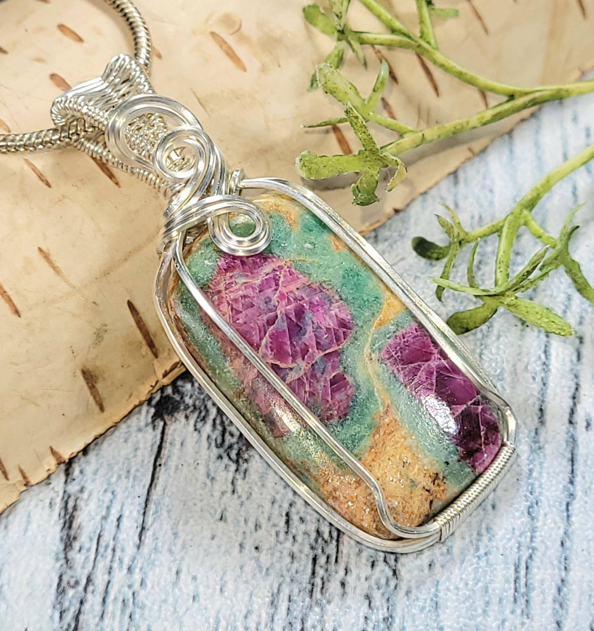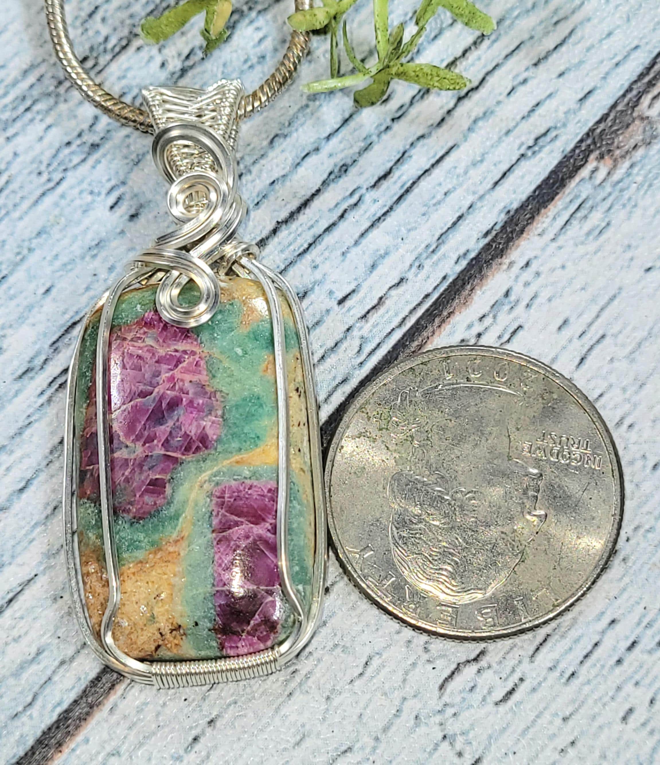 Natural AAA Grade Ruby Fuchsite Wire Wrapped .925 Silver Pendant measures 2" x 7/8" weighs 9.6 grams JE10. Sterling Silver Wire Wrapped pendant. Handmade Stone Jewelry. Handmade Wrapped Solid Sterling Silver. Absolutely gorgeous designer hand wrapped Sterling Silver with stunning detailed craftmanship. If you are unhappy with any of our items please email us before you leave review. We stand behind our jewelry 100% with full refund if not completely satisfied!! This is a handpicked natural stone, the exact one shown in picture. The sterling silver is .925 and stamped. Each piece is handmade by artisans in my shop. The quality of the stones and the silver craftmanship is impressive in all items. Please look at other items in my store. I sell ready made jewelry with handcrafted silver work, pendants with a sterling silver bails and beautiful unique stones for jewelry wire wrapping and weaving. You will pay exact amount on shipping plus $1 for supplies and labor. All items are shipped within a couple of days after payment and are shipped USPS first class or international first class. Items are available for combined shipping, if invoice does not combine please email me and I will combine for you. Average shipping will be $4 to 4.50 for USPS first class. International shipping is available for exact amount of shipping plus $1 for labor and supplies also. We also accept returns for refund or exchange. Thanks for viewing my store.