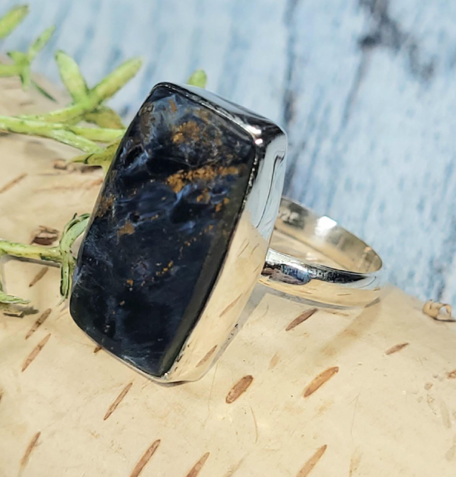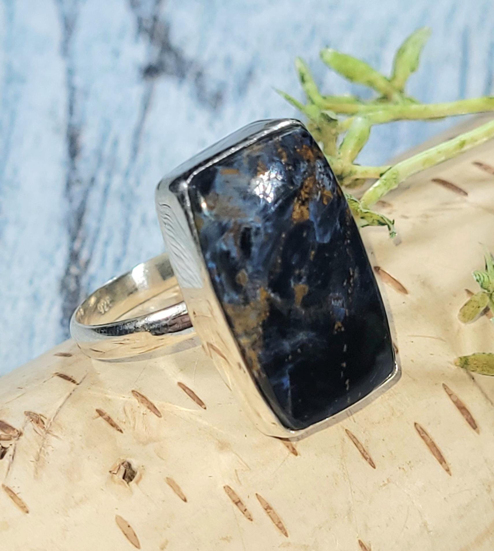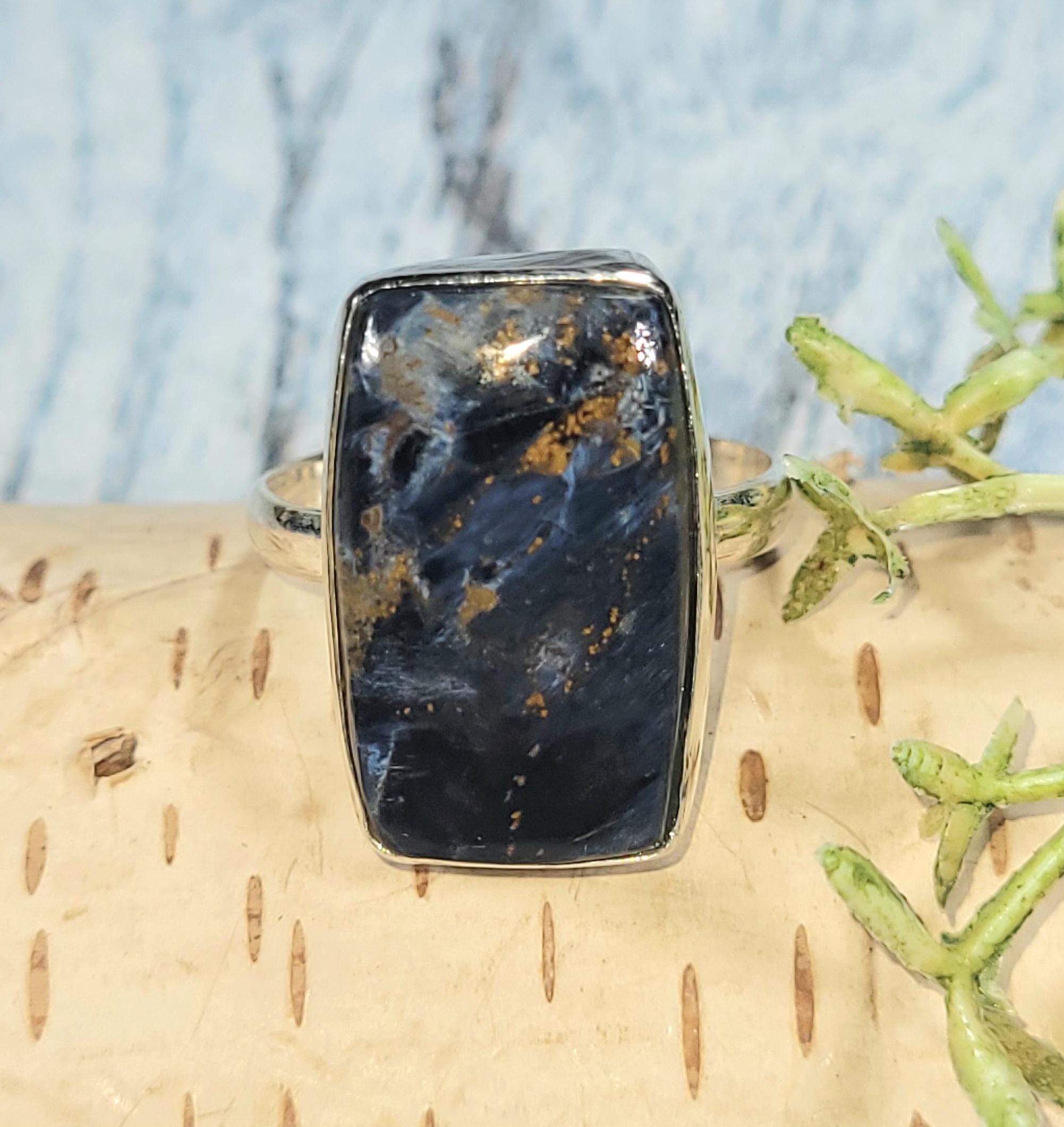 Natural High Grade Pietersite Rectangle .925 Sterling Silver Ring measures 13/16" x 1/2" and weighs 6 grams JE26. Solid Sterling Silver Ring Size 9. Our items are hand picked one of a kind, so if you see one you like, it is the only one like that. If you're not pleased with the item you receive, please email us before leaving review. We stand behind our jewelry 100% and will refund you or send a replacement to make sure you're happy with your purchase!! This is a handpicked natural stone, the exact one shown in picture. The sterling silver is .925 and stamped. Each piece is handmade by artisans in my shop. The quality of the stones and the silver craftmanship is impressive. Please look at other items in my store. I sell ready made jewelry with handcrafted silver work, pendants with a sterling silver bails and beautiful unique stones for jewelry wire wrapping and weaving. You will pay exact amount on shipping plus $1 for supplies and labor. All items are shipped within a couple of days after payment and are shipped USPS first class or international first class. Items are available for combined shipping, if invoice does not combine please email me and I will combine for you. Average shipping will be $4 to 4.50 for USPS first class. International shipping is available for exact amount of shipping plus $1 for labor and supplies also. We also accept returns for refund or exchange. Thanks for viewing my store.
