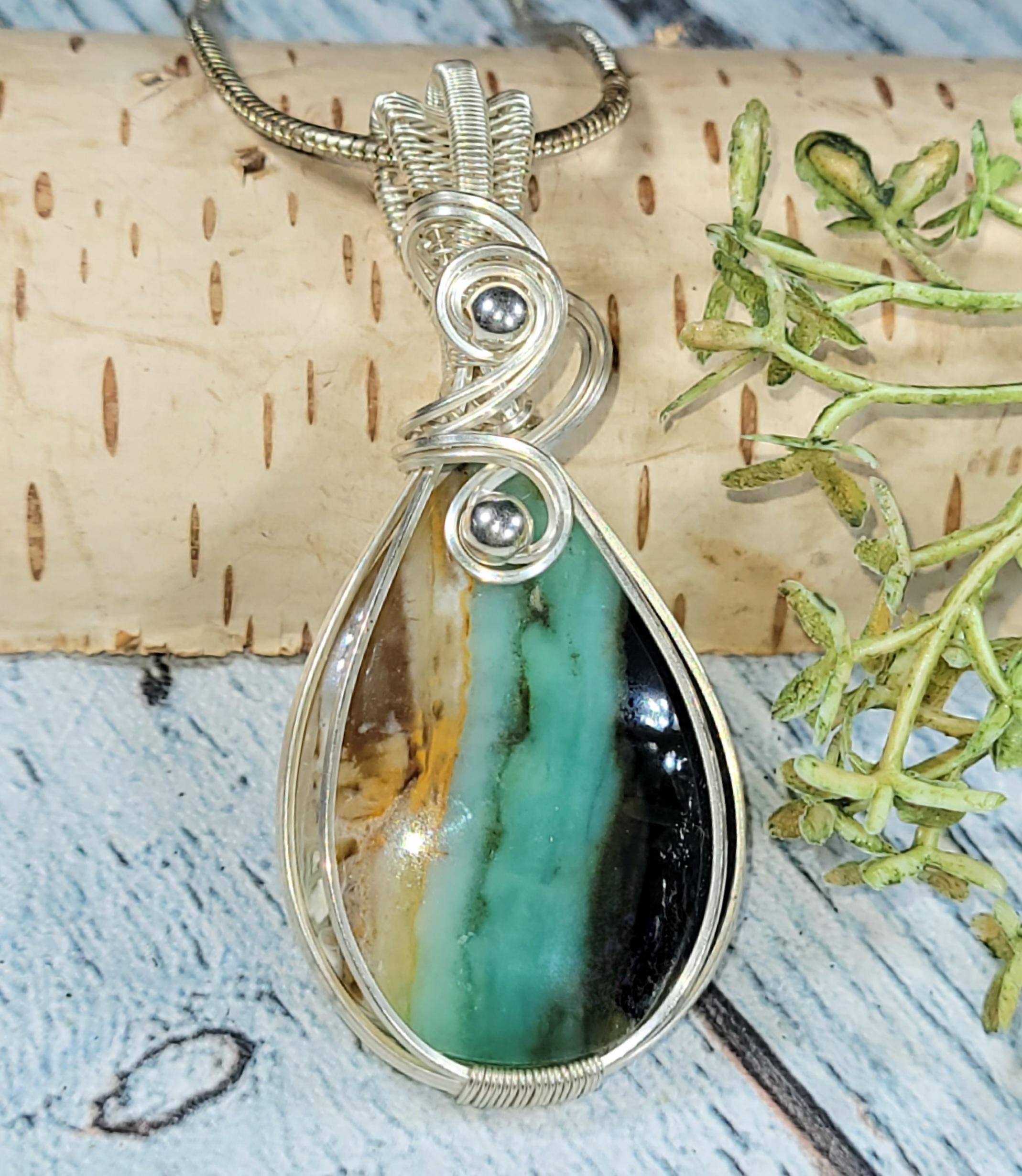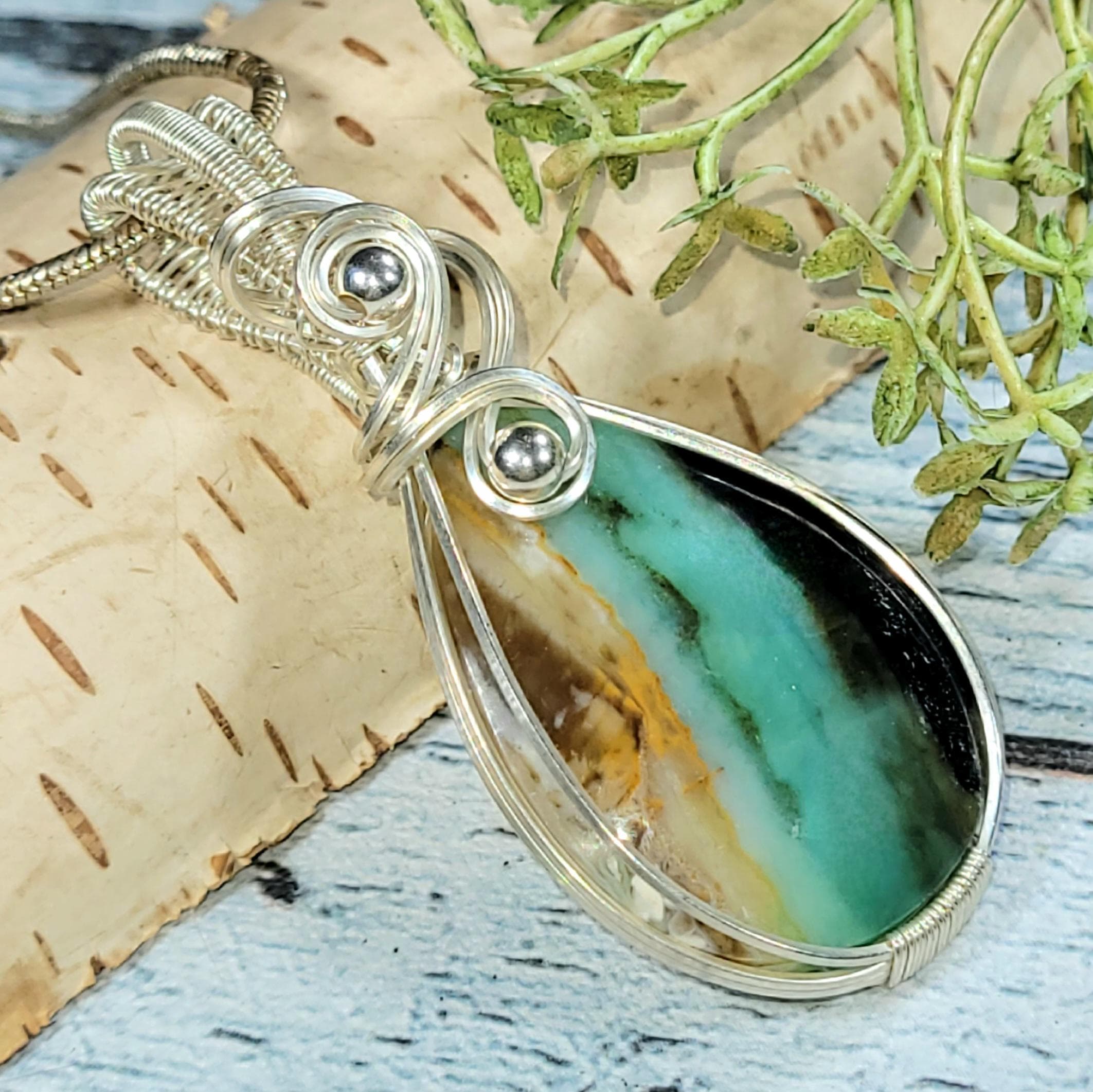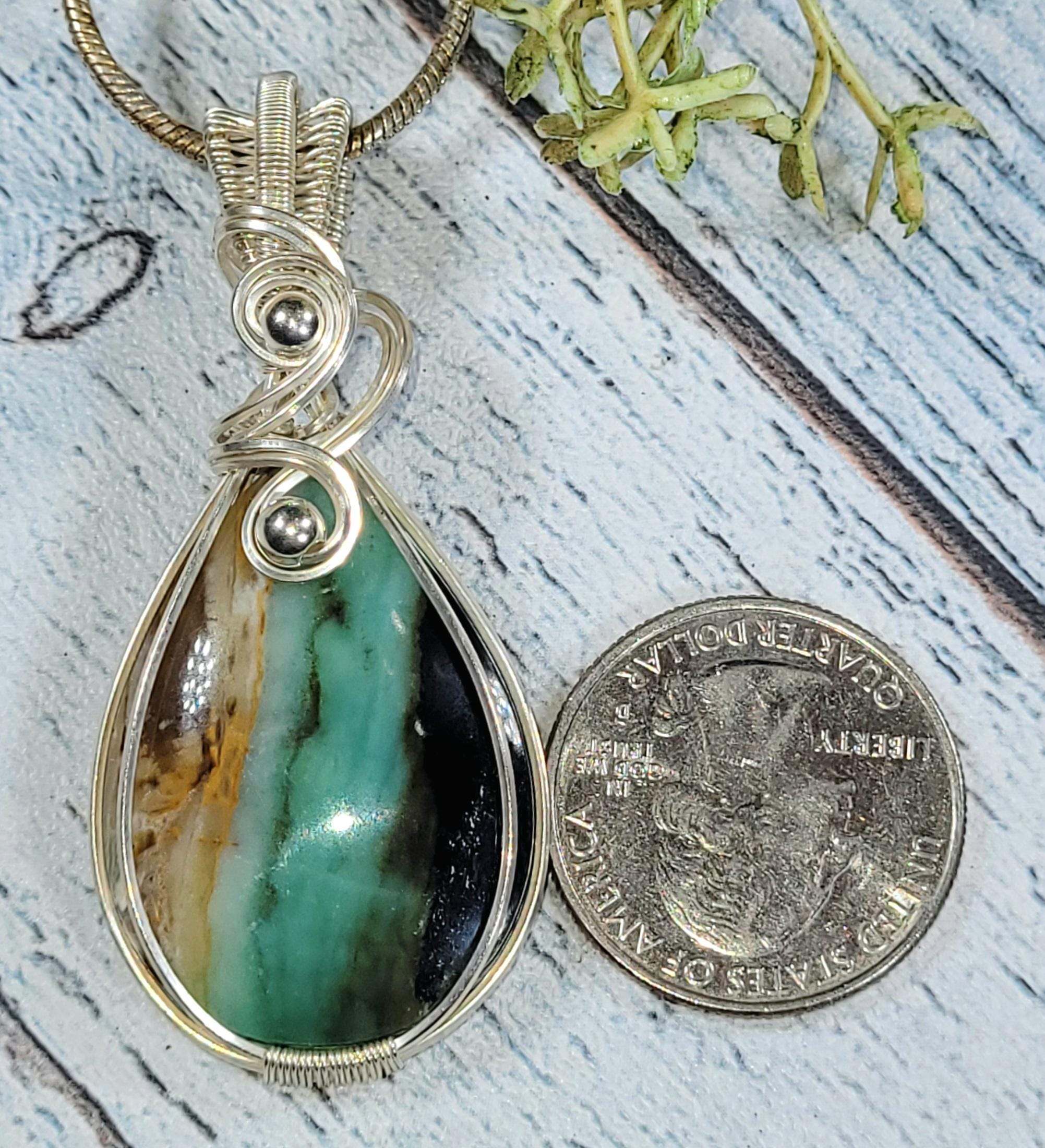 Natural AAA Grade Blue Opalized Petrified Wood Hand Wire Wrapped .925 Sterling Silver Pendant 2 3/8" x 1" and weighs 10.9 Grams JH05. Handmade Wrapped Solid Sterling Silver. Absolutely gorgeous designer hand wrapped Sterling Silver with stunning detailed craftmanship. If you are unhappy with any of our items please email us before you leave review. Since we cannot mark the wire wrapped pendants, we will refund you immediately if tested not sterling silver. We stand behind our jewelry 100% with full refund if not completely satisfied!! This is a handpicked natural stone, the exact one shown in picture.. Each piece is handmade by artisans in my shop. The quality of the stones and the silver craftmanship is impressive in all items. Please look at other items in my store. I sell ready made jewelry with handcrafted silver work, pendants with a sterling silver bails and beautiful unique stones for jewelry wire wrapping and weaving. You will pay exact amount on shipping plus $1 S supplies and labor. All items are shipped within a couple of days after payment and are shipped USPS first class or international first class. Items are available for combined shipping, if invoice does not combine please email me and I will combine for you. Average shipping will be $4 to 4.50 for USPS first class. International shipping is available for exact amount of shipping plus $1 for labor and supplies also. We also accept returns for refund or exchange. Thanks for viewing my store.