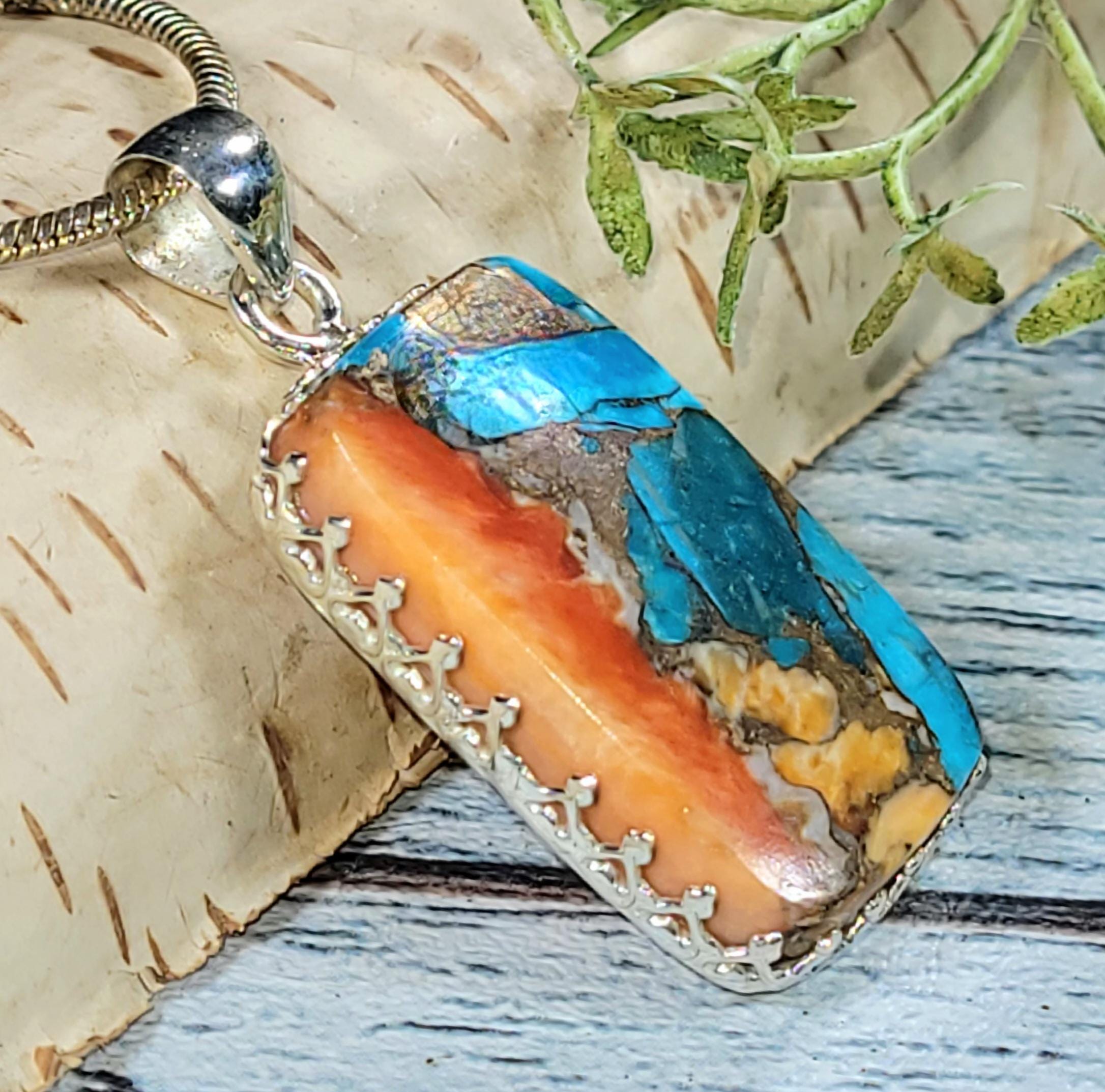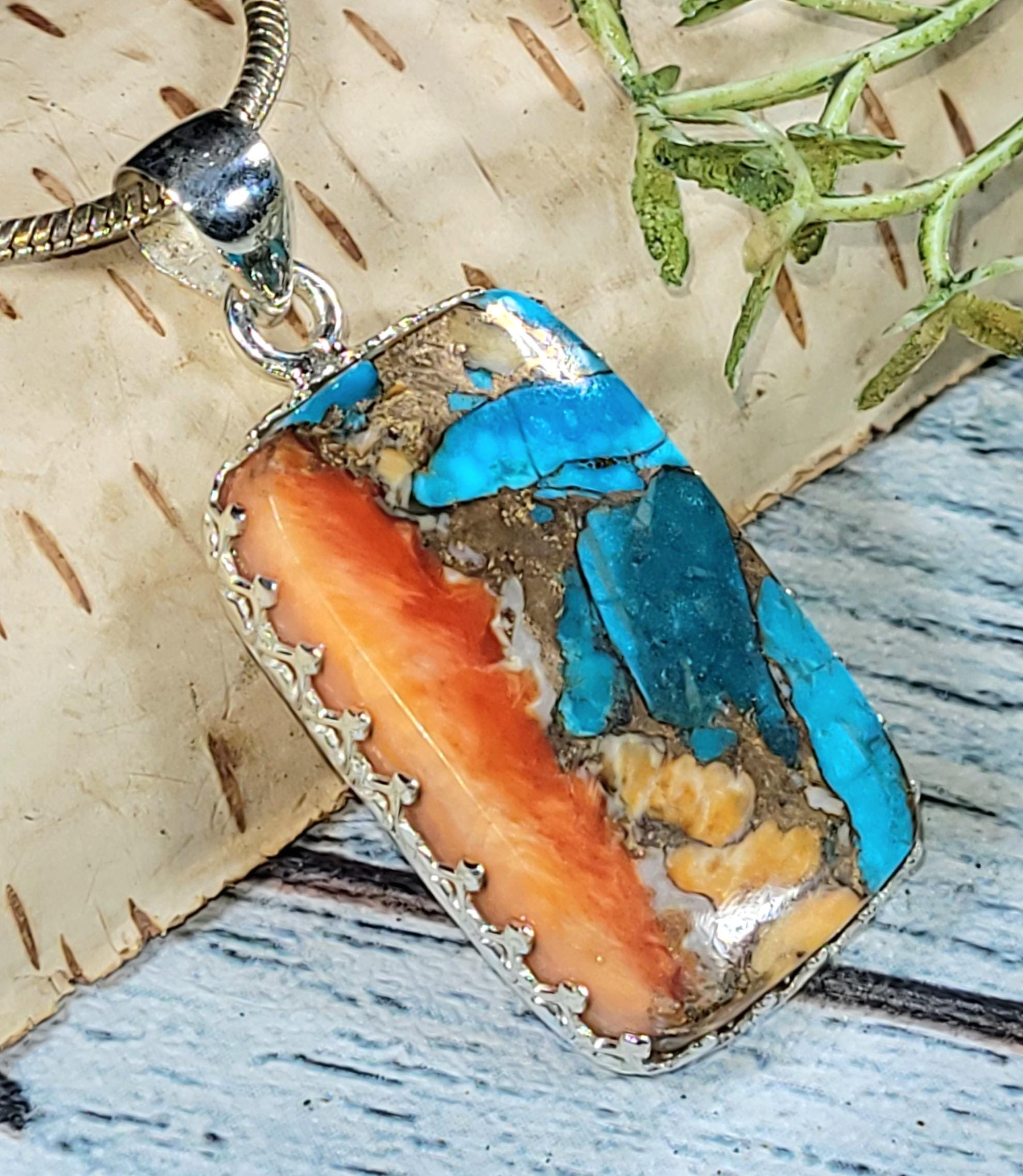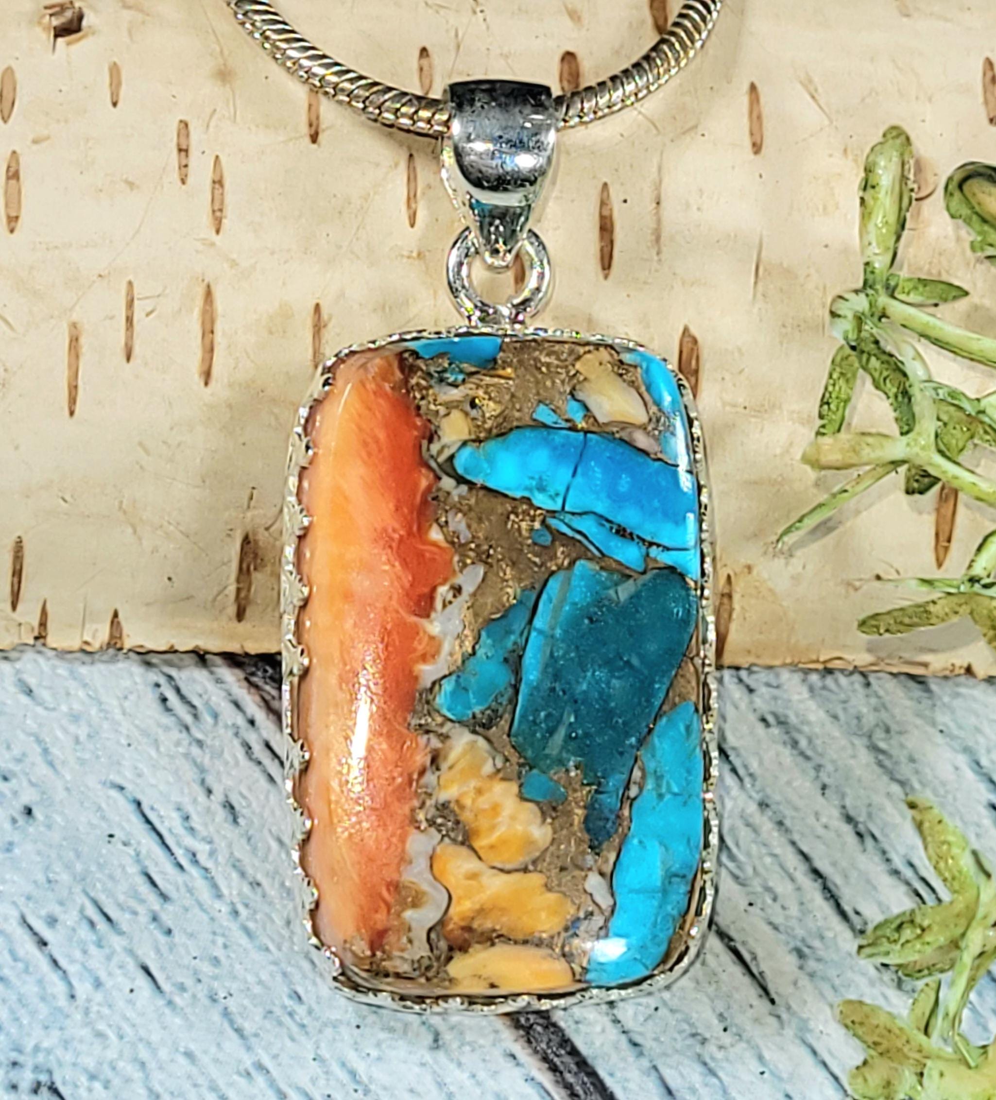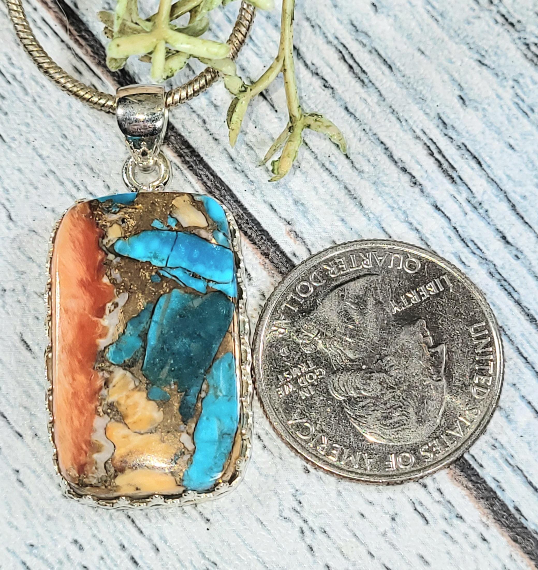 Spiny Oyster Copper Kingman Turquoise .925 Sterling Silver Pendant measures 1 3/4" x 13/16" and weighs 8.8 Grams JH06. This is a handpicked natural stone, the exact one shown in picture. The sterling silver is .925 and stamped. Each piece is hand made by artisans in my shop. The quality of the stones and the silver workmanship is hard to beat. Please look at other items in my store. I sell ready made jewelry with hand crafted silver work, pendants with a sterling silver bails and beautiful unique stones for jewelry wire wrapping and weaving. You will pay exact amount on shipping plus $1 for supplies and labor. All items are shipped within a day after payment and are shipped USPS first class or international first class. Items are available for combined shipping, if invoice does not combine please email me and I will combine for you. All domestic orders over $35 will ship for free. Average shipping for domestic items under $35 will be $4 to 4.50 for USPS first class. International shipping is available for exact amount of shipping plus $1 for labor and supplies also. We also accept returns for refund or exchange. If you have any problems with your order, please email and we will make it right. As a small business we appreciate your business and will do whatever we can to keep you as a repeat customer. Thanks for viewing my store.