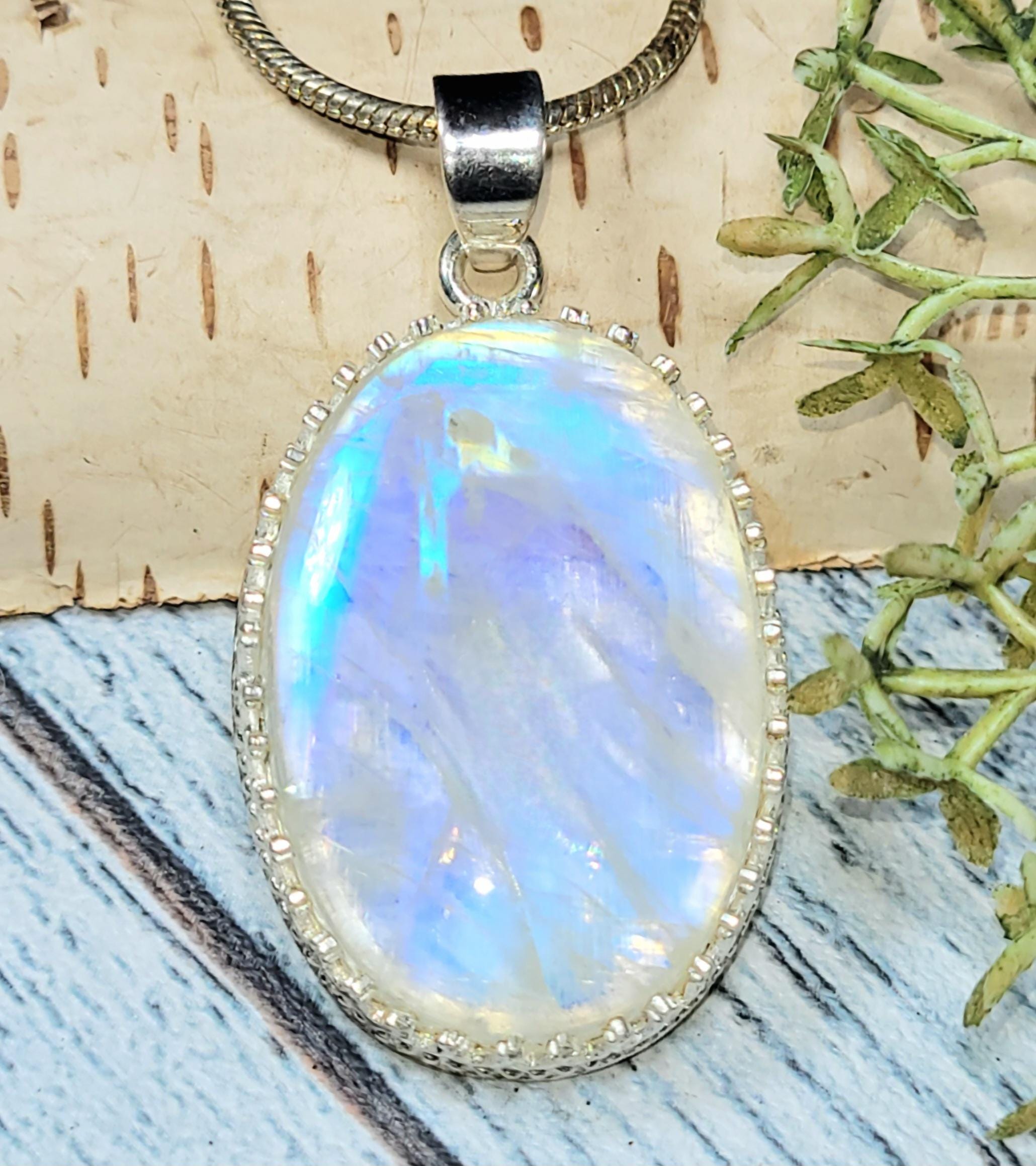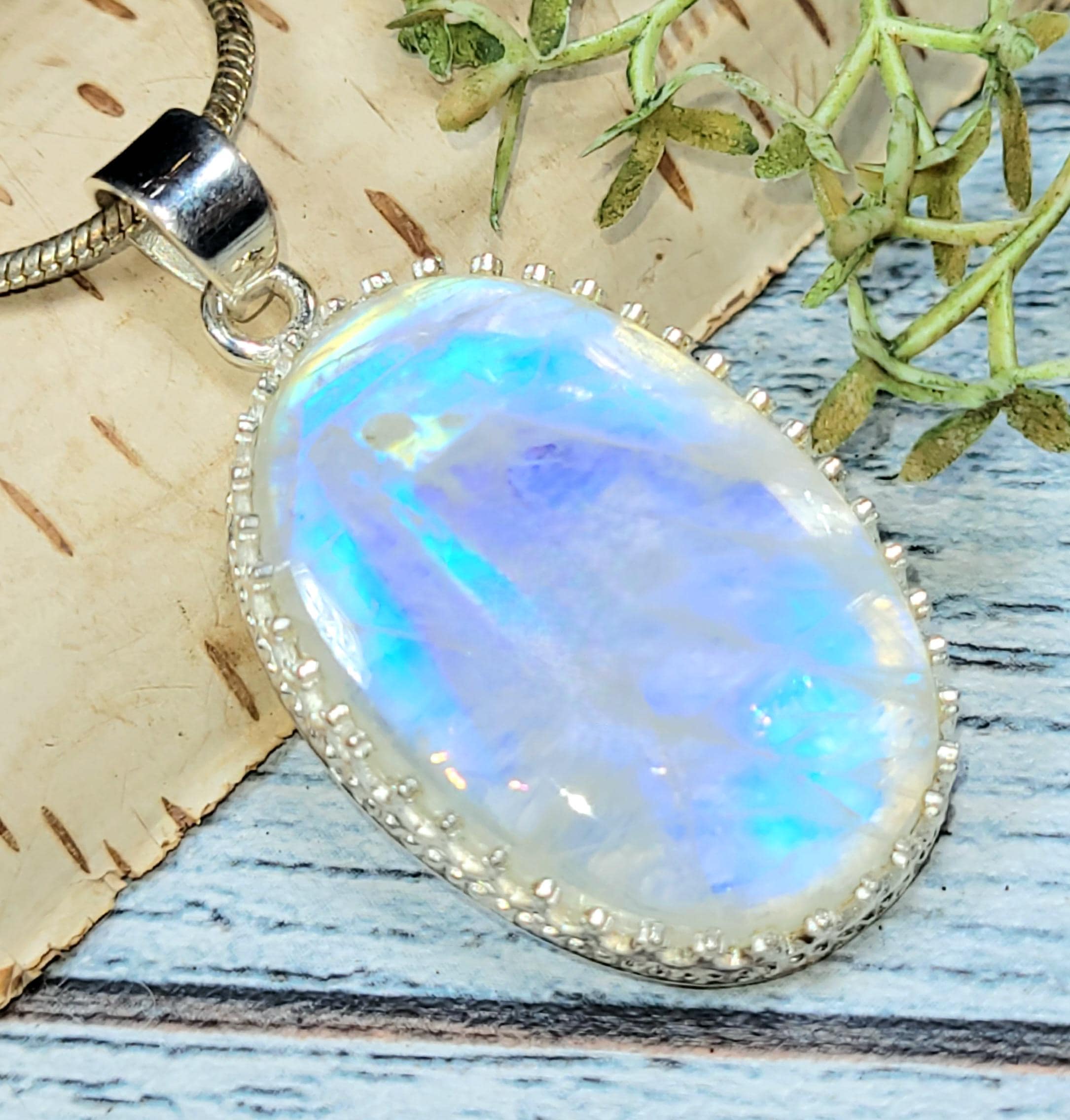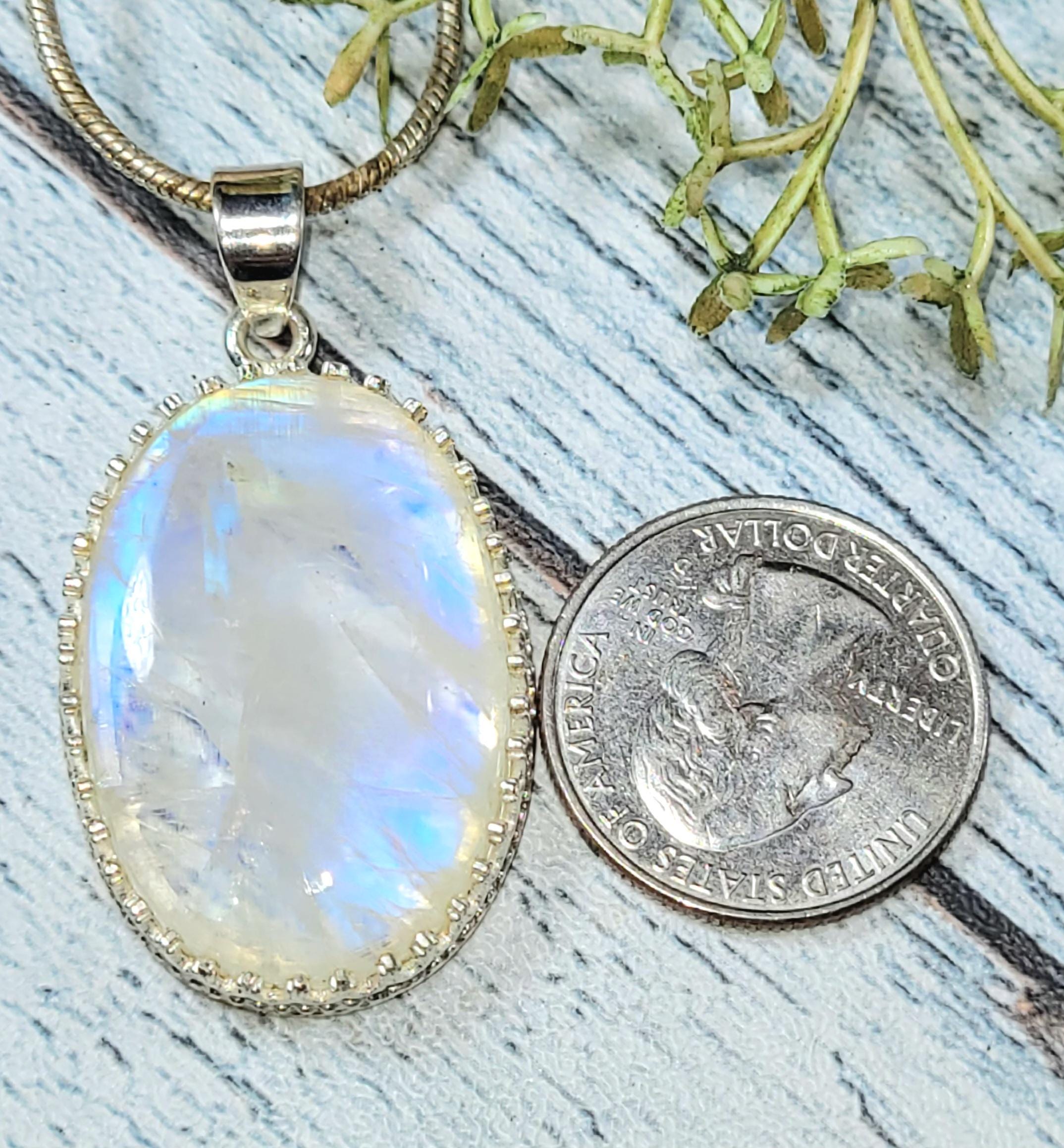 Natural AAA Grade Blue Flash Moonstone Oval Cabochon .925 Sterling Silver Designer Pendant with Crown Prong Setting, measures 1 15/16" x 1" and weighs 13.8 grams JH12. This is a handpicked natural stone, the exact one shown in picture. The sterling silver is .925 and stamped. Each piece is handmade by artisans in my shop. The quality of the stones and the silver craftmanship is impressive. Please look at other items in my store. I sell ready made jewelry with handcrafted silver work, pendants with a sterling silver bails and beautiful unique stones for jewelry wire wrapping and weaving. You will pay exact amount on shipping plus $1 for supplies and labor. All items are shipped within a couple of days after payment and are shipped USPS first class or international first class. Items are available for combined shipping, if invoice does not combine please email me and I will combine for you. Average shipping will be $4 to 4.50 for USPS first class. International shipping is available for exact amount of shipping plus $1 for labor and supplies also. We also accept returns for refund or exchange. Thanks for viewing my store./