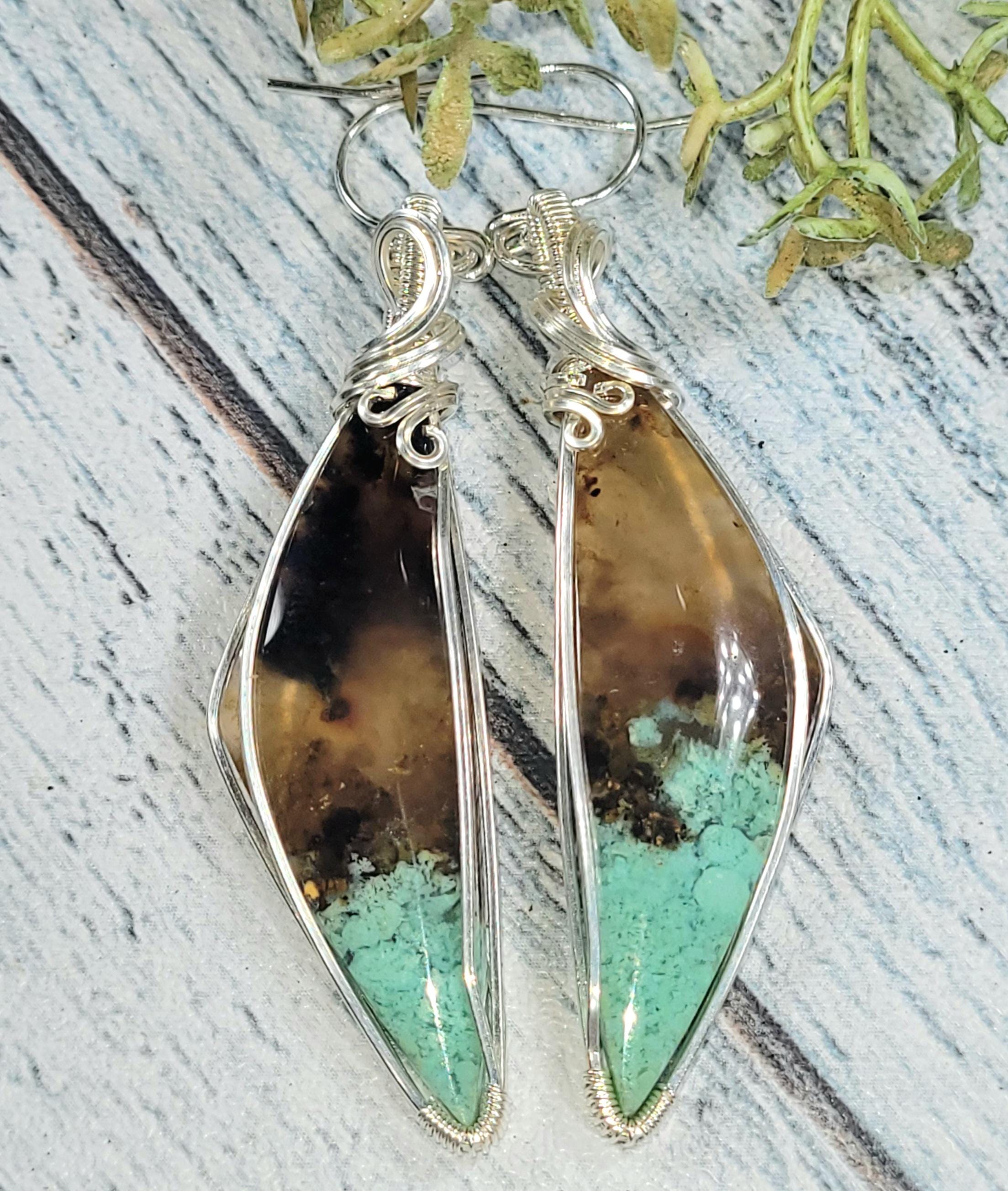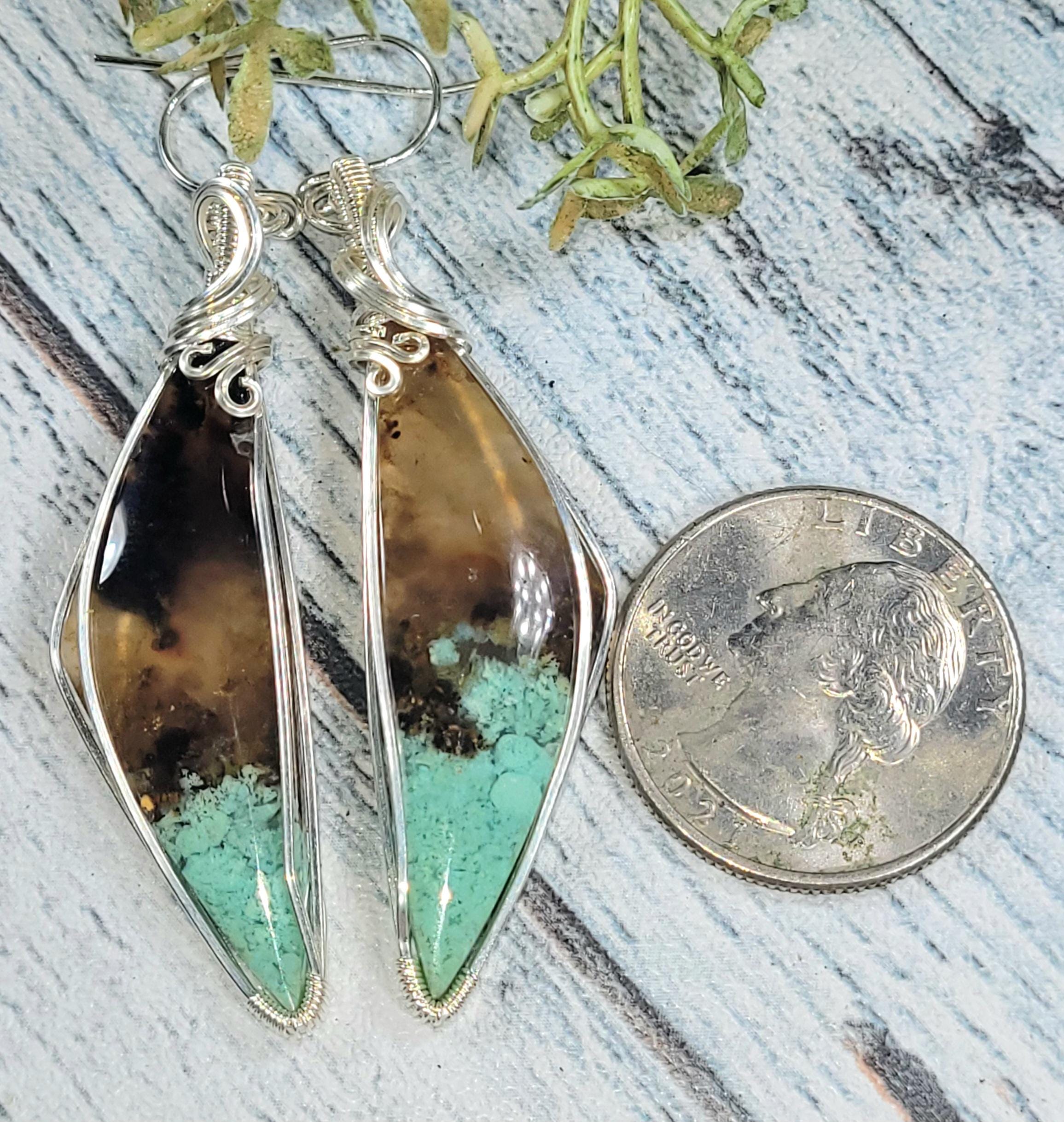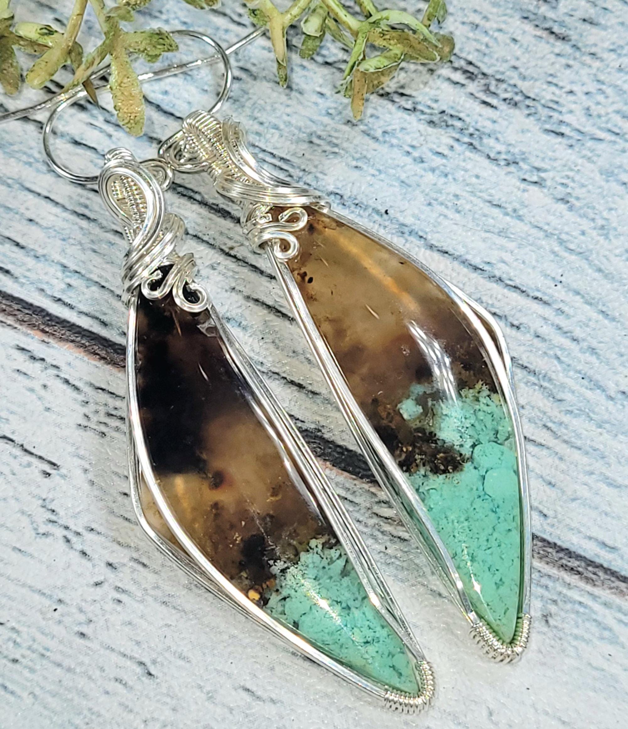 Natural Rare Premium Grade Blue Opalized Petrified Wood Handmade .925 Sterling Silver Wire Wrapped Earrings 9.9 Grams 2 5/8" x 5/8" JG28. Gift for Her and Genuine Stones! A rare fragment from a recently-discovered vein of opal on the slopes of an Indonesian volcano, this stone formed when opaline silica flows formed in place of an ancient petrified forest. It’s said to enhance imagination, creativity, and spontaneity. All of our items are one of a kind and hand crafted. These stones are beautiful and are thousands years old but only discovered a few years ago. We hand pick our stones from all over the world. Each item is handcrafted and one of a kind item. The silver is very study and not flimsy like some sellers. We guarantee all item to be sterling silver. We ship all of our items next day and offer expedited shipping. First class mail is free for purchases over $35. We accept returns within 30 days, only we will make exceptions during holidays. Please email us if you have any questions or problems, as we work hard to satisfy our customers so we can turn you into a repeat buyer. Thanks so much for business and hope to see you on our site often. Free shipping on all orders over $35.