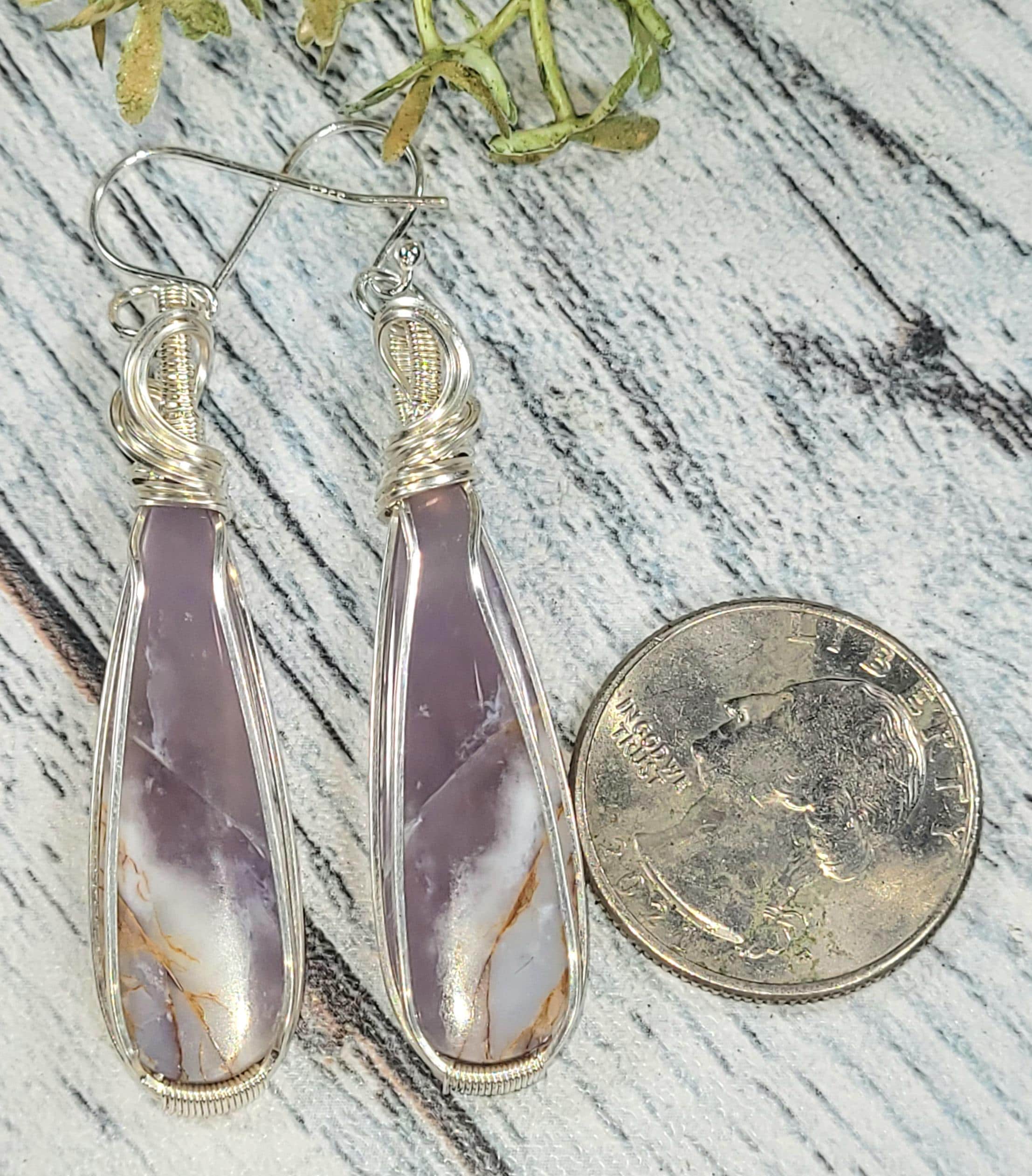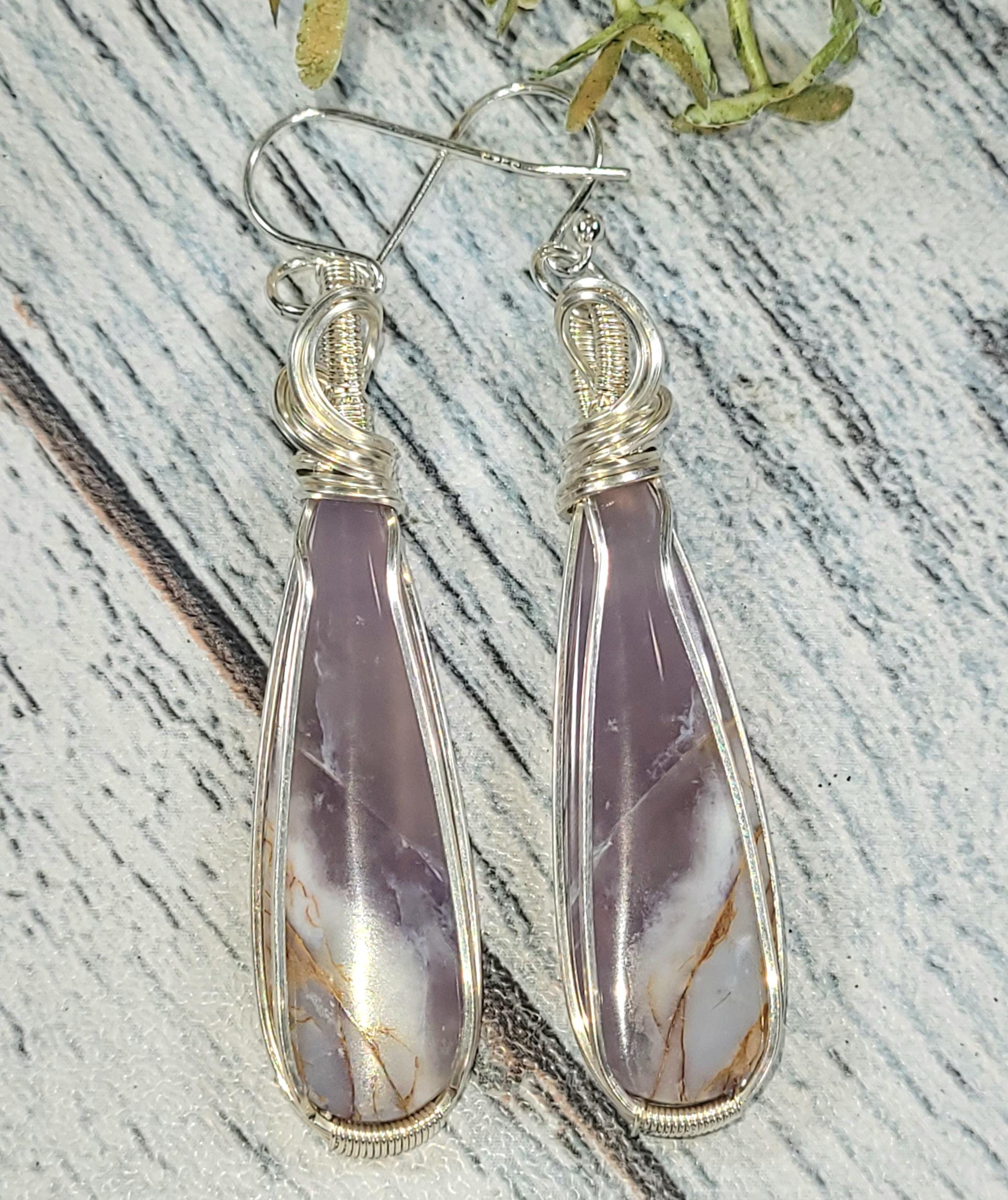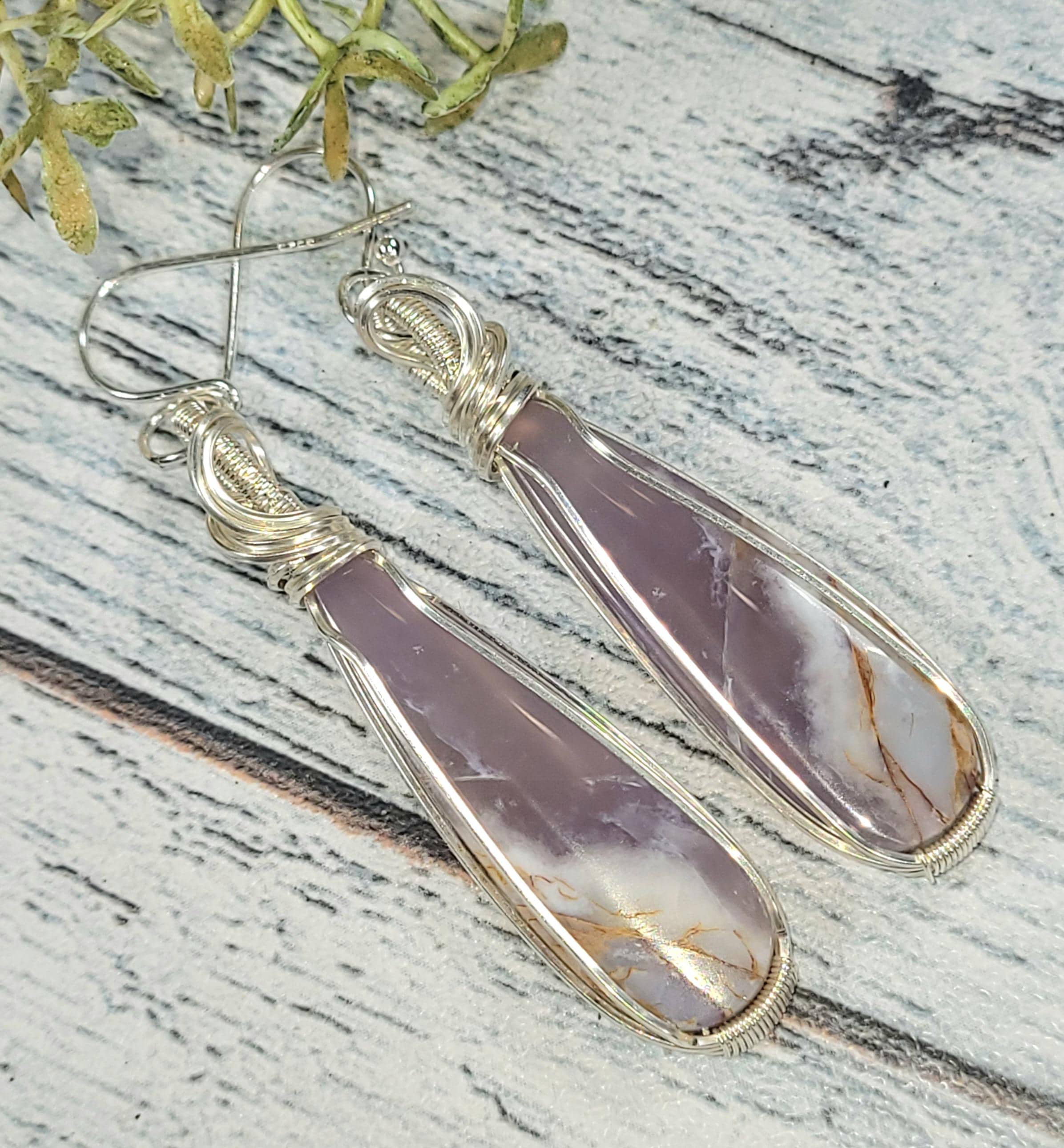 Natural Premium Grade Purple Common Opalized Agate Hand Wrapped Wire Weaved .925 Sterling Silver Earrings 2 1/2" x 1/2" 9.8 Grams JG29. Beautiful rich color Moss Agate! Handmade Wrapped Solid Sterling Silver. Absolutely gorgeous designer hand wrapped Sterling Silver with stunning detailed craftmanship. If you are unhappy with any of our items please email us before you leave review. We stand behind our jewelry 100% with full refund if not completely satisfied!! This is a handpicked natural stone, the exact one shown in picture.. Each piece is handmade by artisans in my shop. The quality of the stones and the silver craftmanship is impressive in all items. Please look at other items in my store. FREE SHIPPING ON ALL ITEMS OVER $35. I sell ready made jewelry with handcrafted silver work, pendants with a sterling silver bails and beautiful unique stones for jewelry wire wrapping and weaving. You will pay exact amount on shipping plus $1 S supplies and labor. All items are shipped within a A day after payment and are shipped USPS first class or international first class. Items are available for combined shipping, if invoice does not combine please email me and I will combine for you. Average shipping will be $4 to 4.50 for USPS first class. International shipping is available for exact amount of shipping plus $1 for labor and supplies also. We also accept returns for refund or exchange. Thanks for viewing my store.