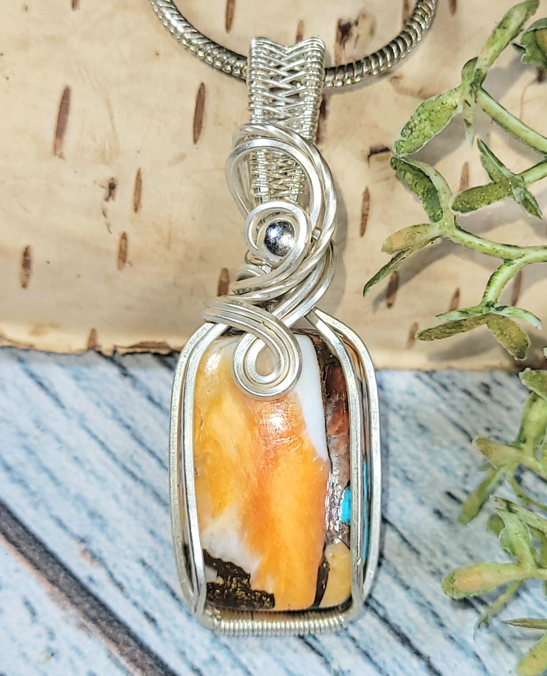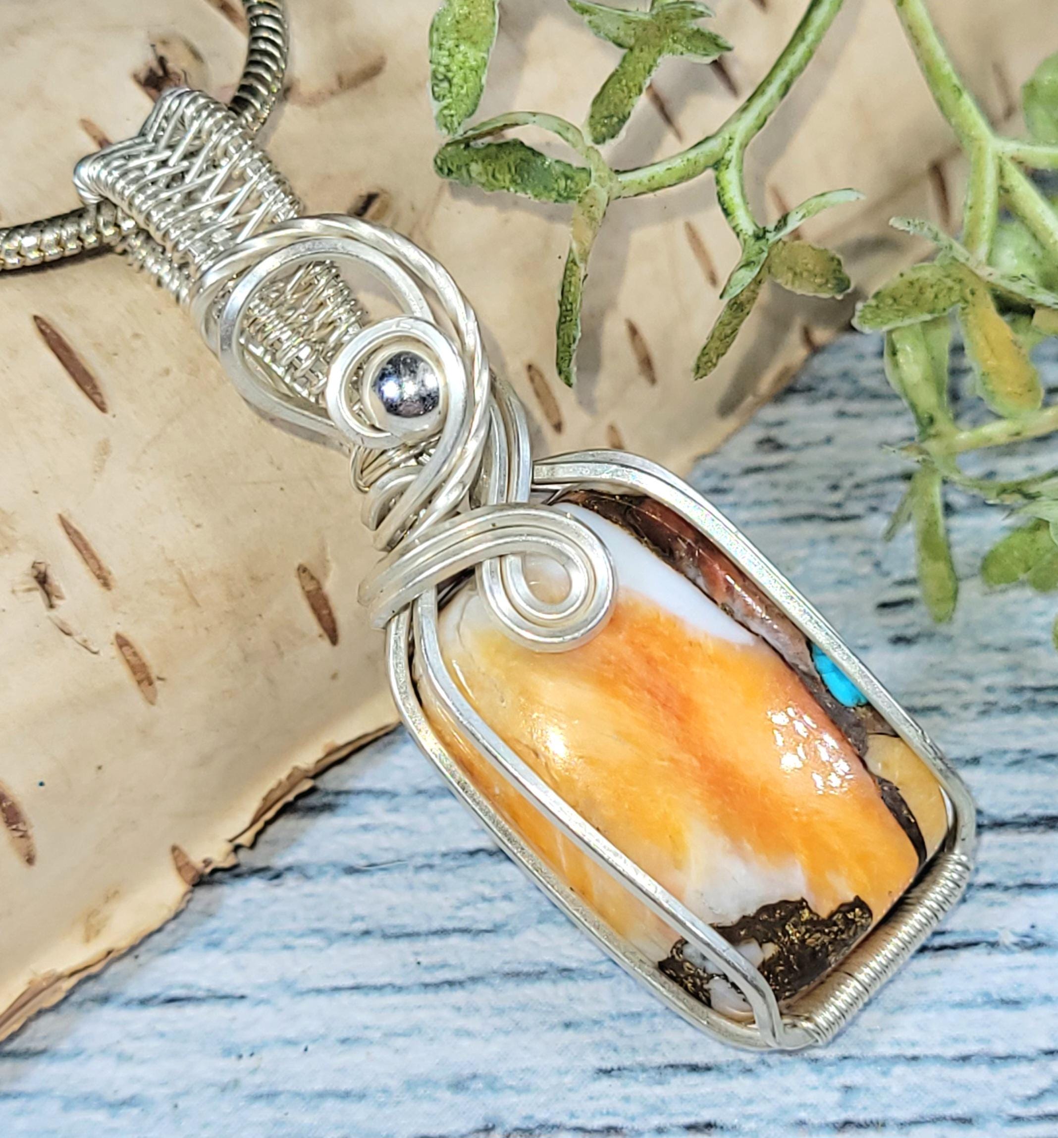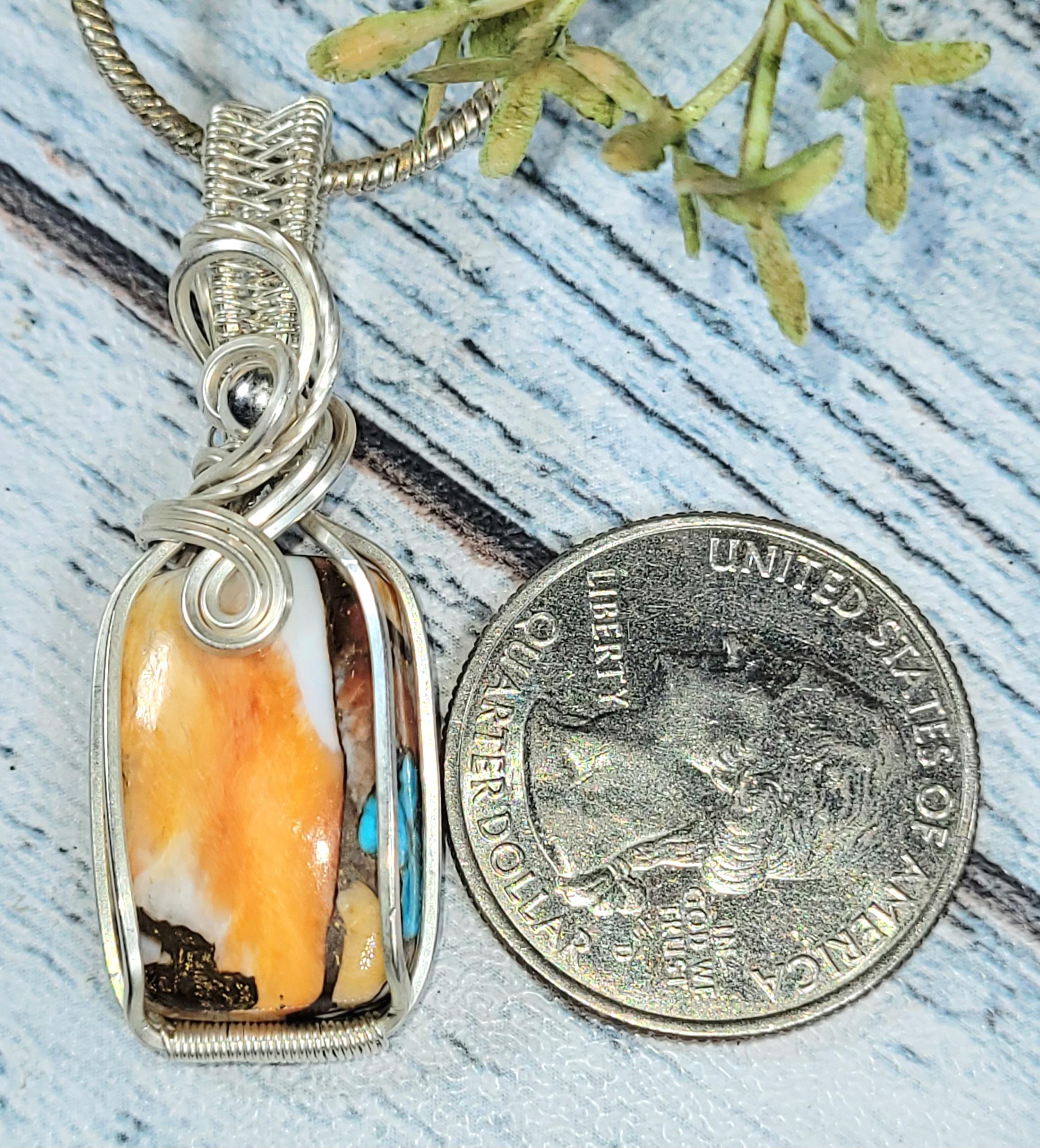 Premium Multi Color Rectangle Spiny Copper Oyster Wire Wrapped .925 Sterling Silver Pendant 1 13/16" x 5/8" 7.2 Grams JF32. Handmade Wrapped Solid Sterling Silver. Absolutely gorgeous designer hand wrapped Sterling Silver with stunning detailed craftmanship. If you are unhappy with any of our items please email us before you leave review. We stand behind our jewelry 100% with full refund if not completely satisfied!! This is a handpicked natural stone, the exact one shown in picture. The sterling silver is .925 and stamped. Each piece is handmade by artisans in my shop. The quality of the stones and the silver craftmanship is impressive in all items. Please look at other items in my store. I sell ready made jewelry with handcrafted silver work, pendants with a sterling silver bails and beautiful unique stones for jewelry wire wrapping and weaving. You will pay exact amount on shipping plus $1 for supplies and labor. All items are shipped within a couple of days after payment and are shipped USPS first class or international first class. Items are available for combined shipping, if invoice does not combine please email me and I will combine for you. Average shipping will be $4 to 4.50 for USPS first class. International shipping is available for exact amount of shipping plus $1 for labor and supplies also. We also accept returns for refund or exchange. Thanks for viewing my store.