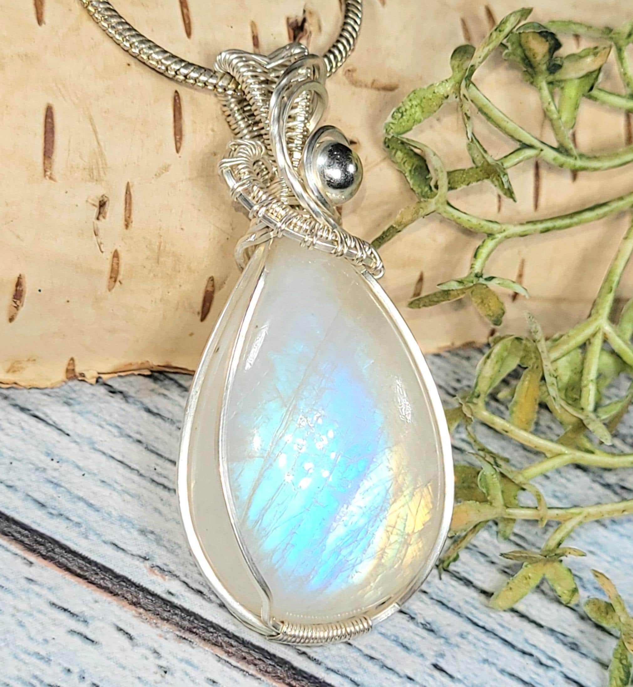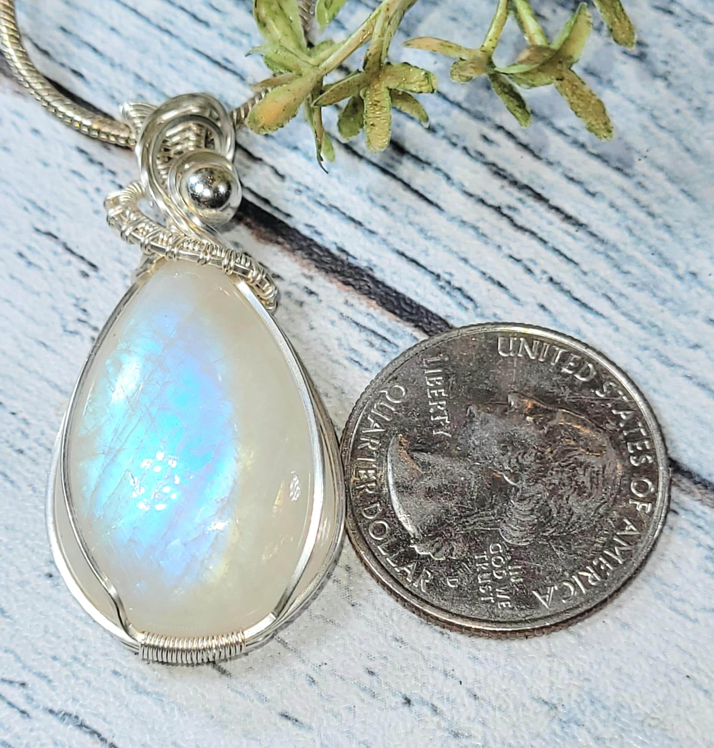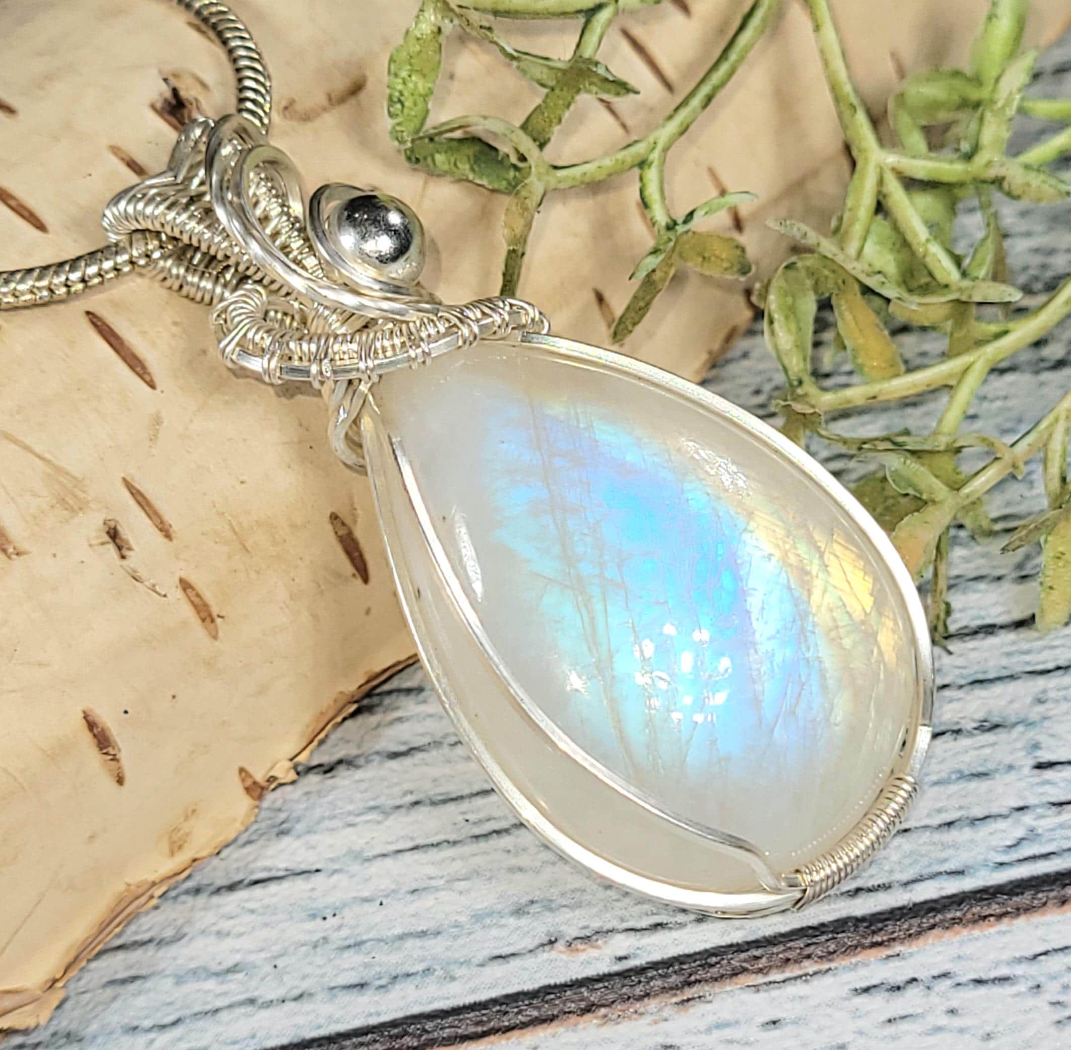Natural AAA Premium Quality Multi Flash Pear Rainbow Moonstone Hand Wire Wrapped .925 Sterling Silver Designer Pendant 1 15/16" x 7/8" 11.9 Grams JF34. Handmade Wire Wrapped Solid Sterling Silver. Absolutely gorgeous designer hand wrapped Sterling Silver with stunning detailed craftmanship. Moonstone is larger than appears in my hand because I'm 6' 8" and have a huge hand! Absolutely gorgeous full multi color flash! If you are unhappy with any of our items please email us before you leave review. We stand behind our jewelry 100% with full refund if not completely satisfied!! This is a handpicked natural stone, the exact one shown in picture. The sterling silver is .925 and stamped. Each piece is handmade by artisans in my shop. The quality of the stones and the silver craftmanship is impressive in all items. Please look at other items in my store. I sell ready made jewelry with handcrafted silver work, pendants with a sterling silver bails and beautiful unique stones for jewelry wire wrapping and weaving. You will pay exact amount on shipping plus $1 for supplies and labor. All items are shipped within a couple of days after payment and are shipped USPS first class or international first class. Items are available for combined shipping, if invoice does not combine please email me and I will combine for you. Average shipping will be $4 to 4.50 for USPS first class. International shipping is available for exact amount of shipping plus $1 for labor and supplies also. We also accept returns for refund or exchange. Thanks for viewing my store.