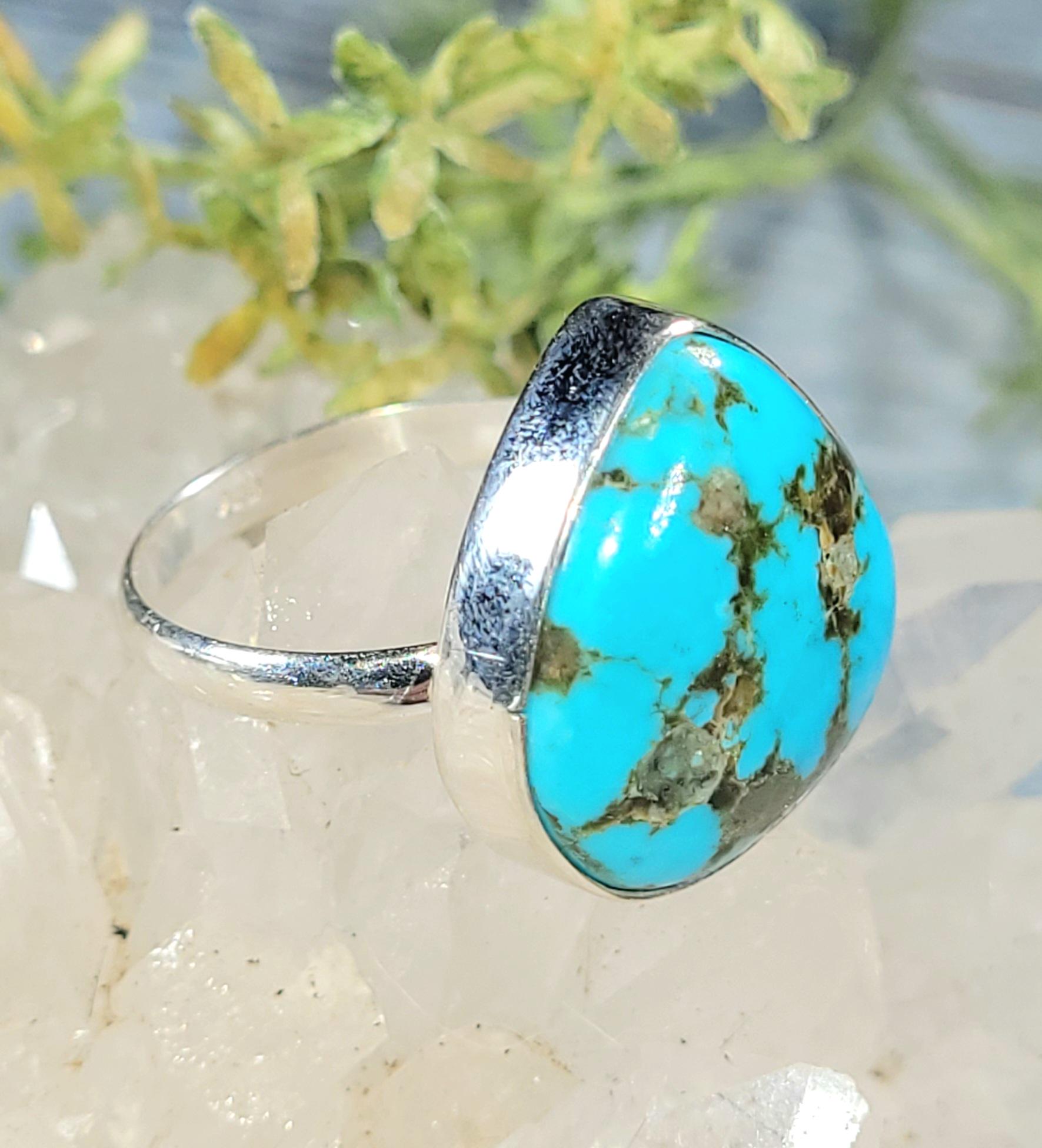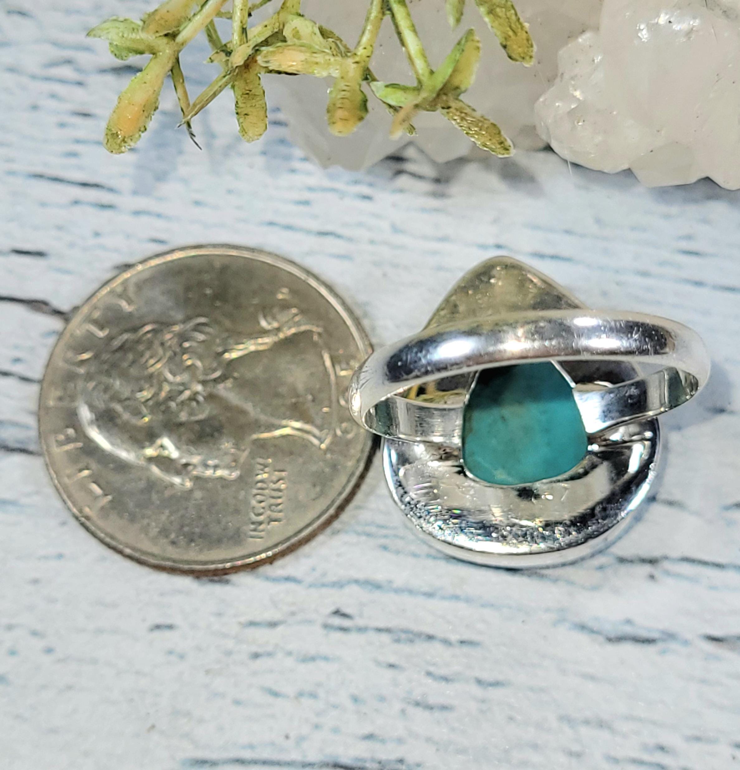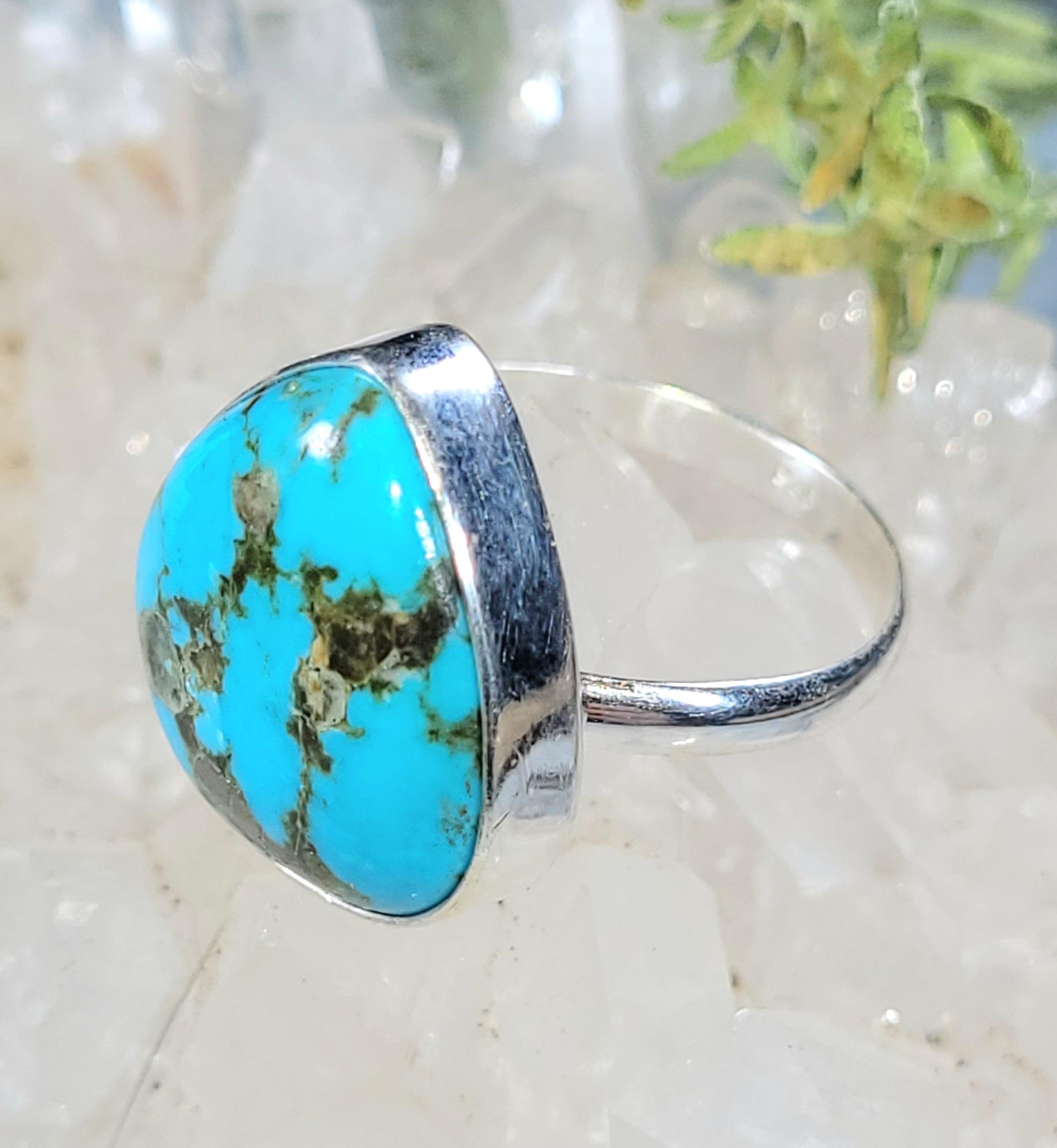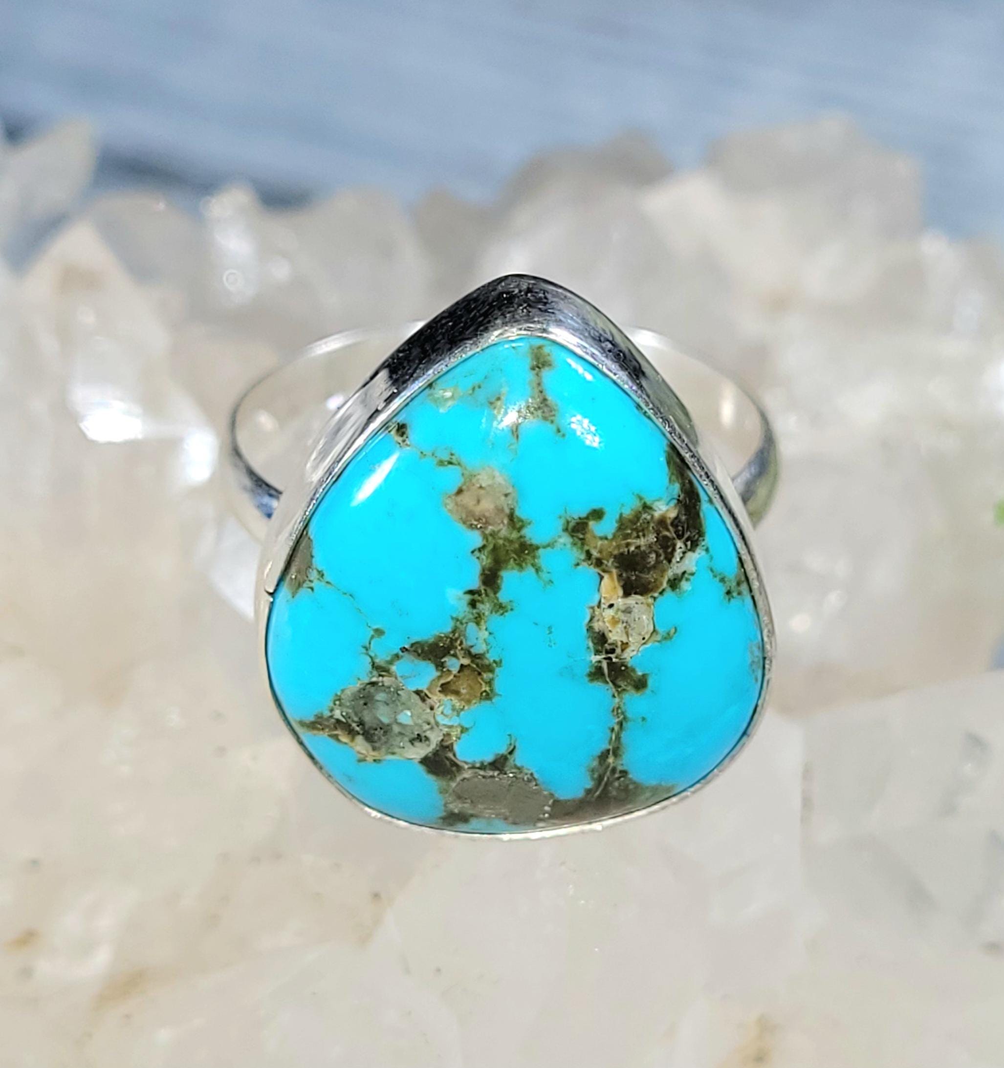 Natural Premium Grade Arizona Pear Turquoise .925 Sterling Silver Ring Size 10 Weighs 5.8 Grams Face Measures 3/4" x 3/4" JS14. Vibrant bluish green color and beautiful patterns! -This is a handpicked natural stone, the exact one shown in picture. The sterling silver is .925 and stamped. Each piece is hand made by artisans in my shop. The quality of the stones and the silver workmanship is impressive. Please look at other items in my store. I sell ready made jewelry with hand crafted silver work, pendants with a sterling silver bails and beautiful unique cabochons for jewelry wire wrapping and weaving. You will pay exact amount on shipping plus $1 for supplies and labor. All items are shipped within a couple of days after payment and are shipped USPS first class or international first class. Items are available for combined shipping, if invoice does not combine please email me and I will combine for you. Average shipping will be $4 to 4.50 for USPS first class. International shipping is available for exact amount of shipping plus $1 for labor and supplies also. We also accept returns for refund or exchange. Thanks for viewing my store