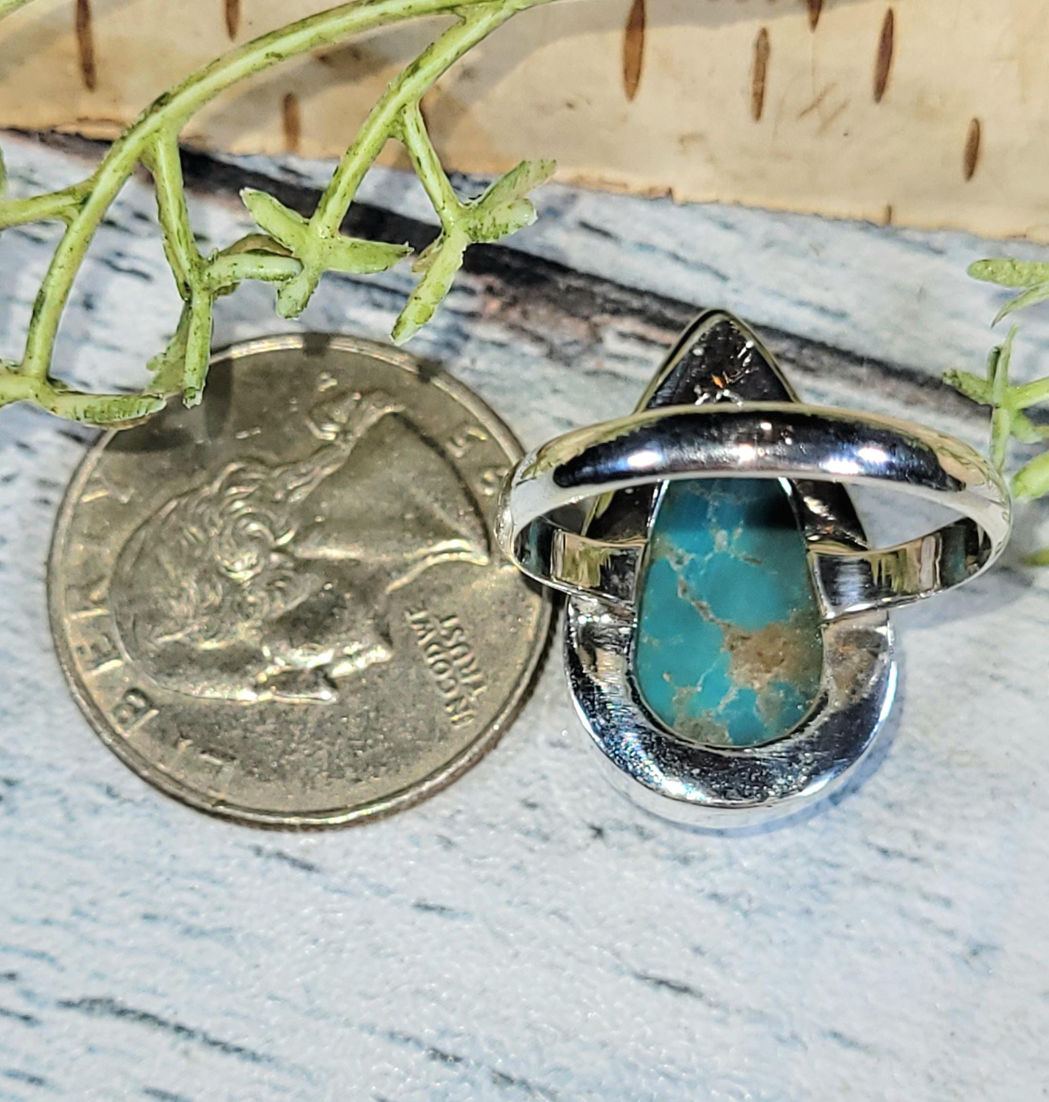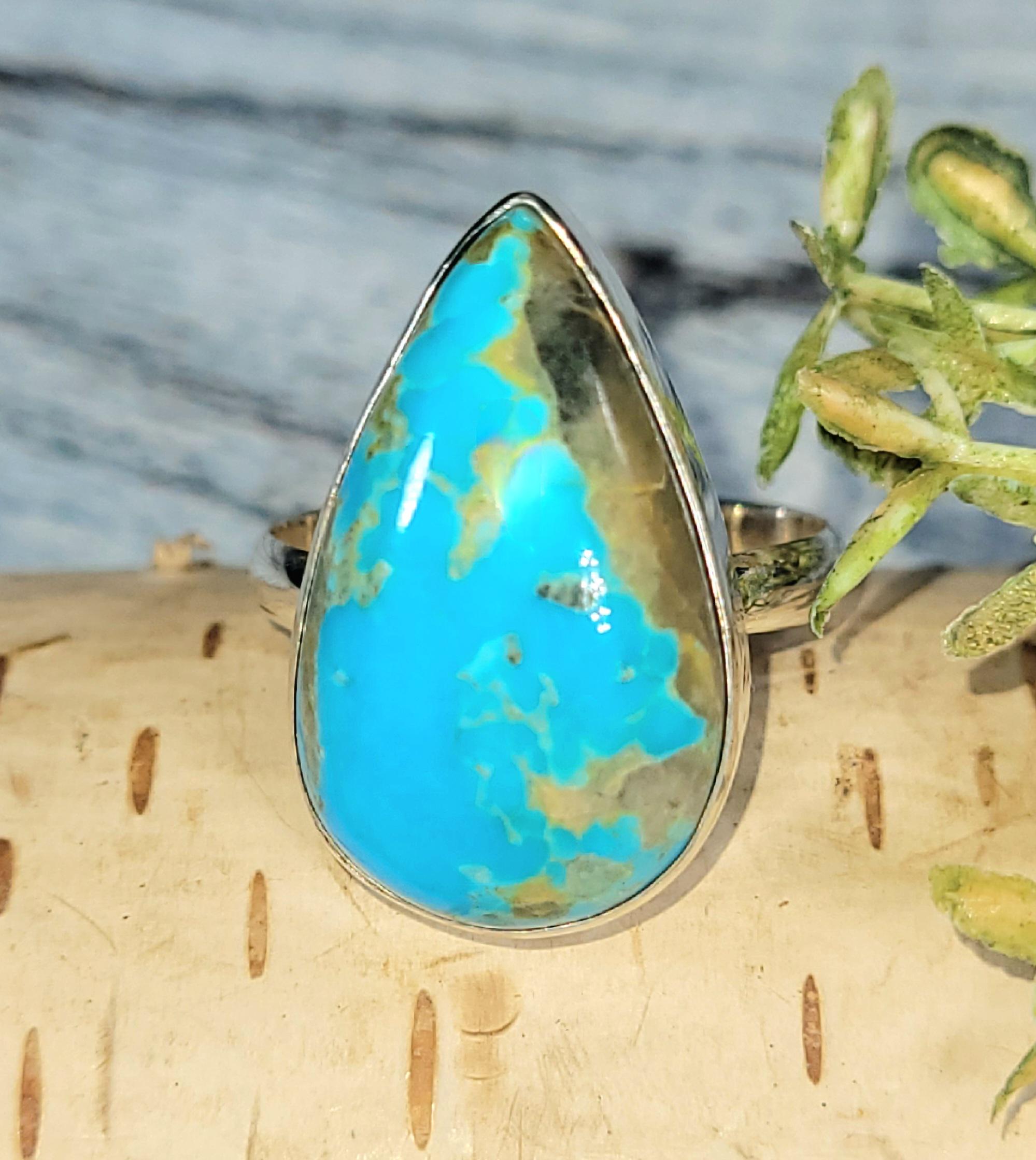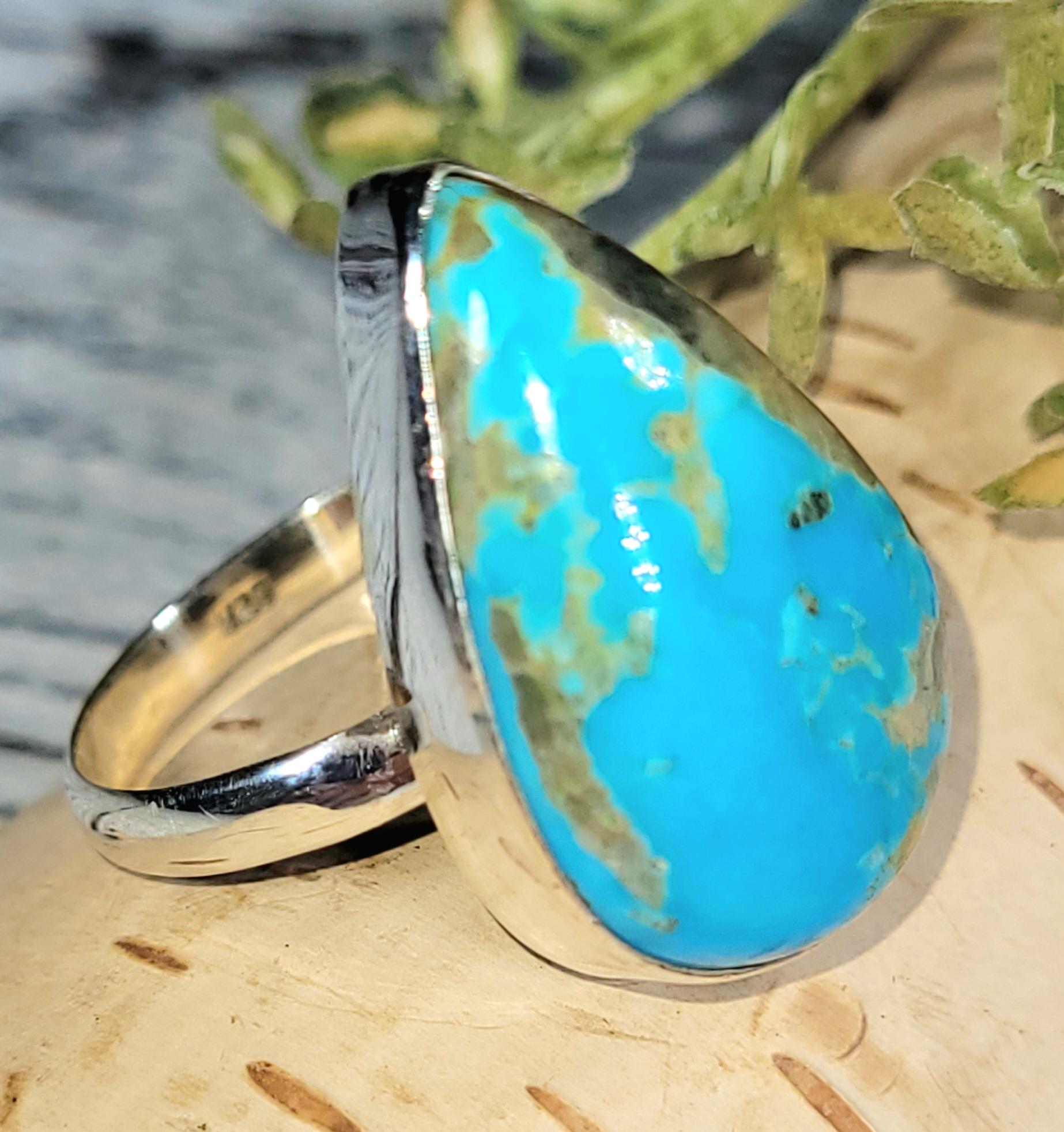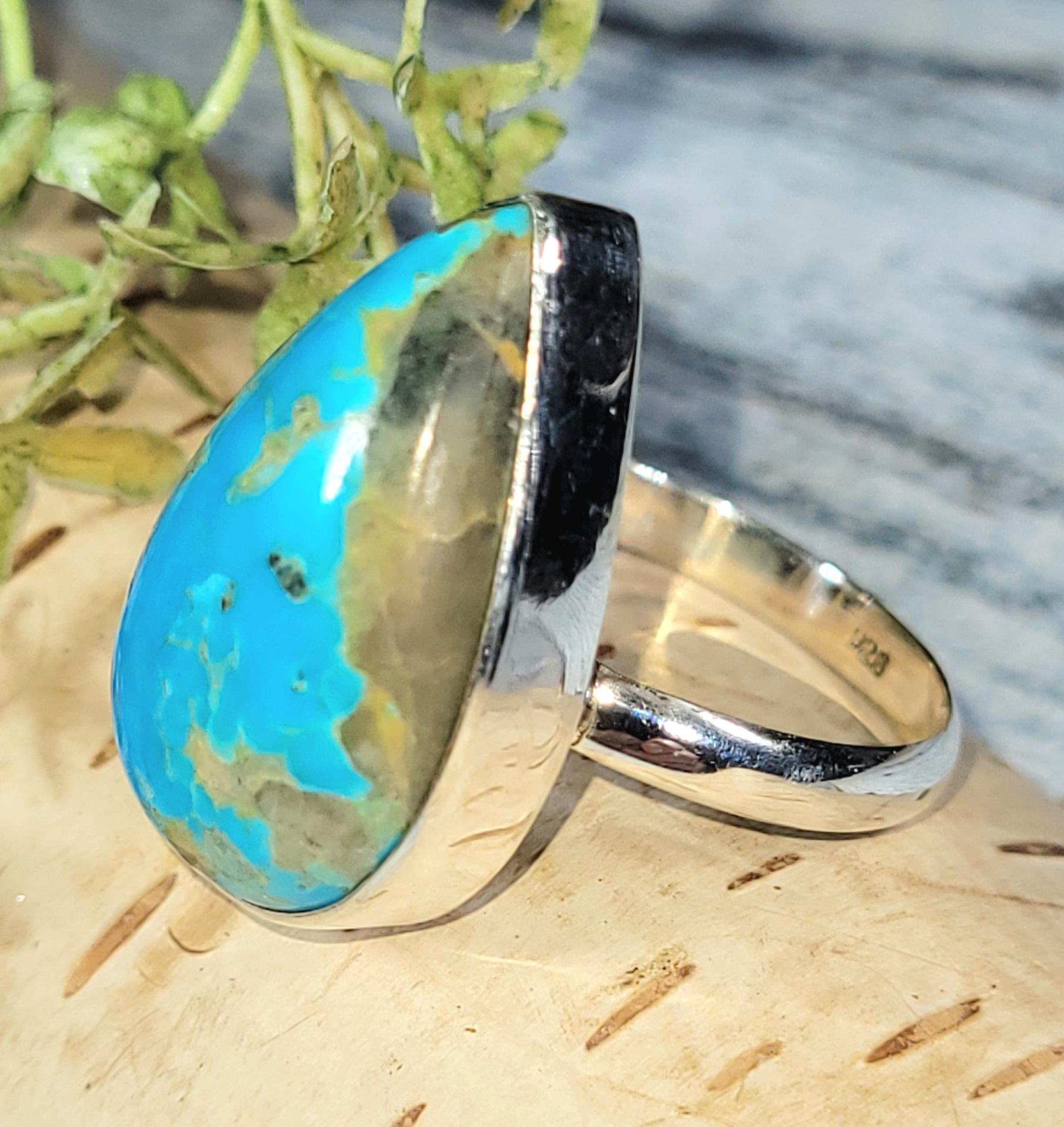 Natural Premium Grade Arizona Pear Turquoise .925 Sterling Silver Ring Size 9 Weighs 6.1 Grams Face Measures 15/16" x 9/16" JS18. Vibrant bluish green color and beautiful patterns! -This is a handpicked natural stone, the exact one shown in picture. The sterling silver is .925 and stamped. Each piece is hand made by artisans in my shop. The quality of the stones and the silver workmanship is impressive. Please look at other items in my store. I sell ready made jewelry with hand crafted silver work, pendants with a sterling silver bails and beautiful unique cabochons for jewelry wire wrapping and weaving. You will pay exact amount on shipping plus $1 for supplies and labor. All items are shipped within a couple of days after payment and are shipped USPS first class or international first class. Items are available for combined shipping, if invoice does not combine please email me and I will combine for you. Average shipping will be $4 to 4.50 for USPS first class. International shipping is available for exact amount of shipping plus $1 for labor and supplies also. We also accept returns for refund or exchange. Thanks for viewing my store