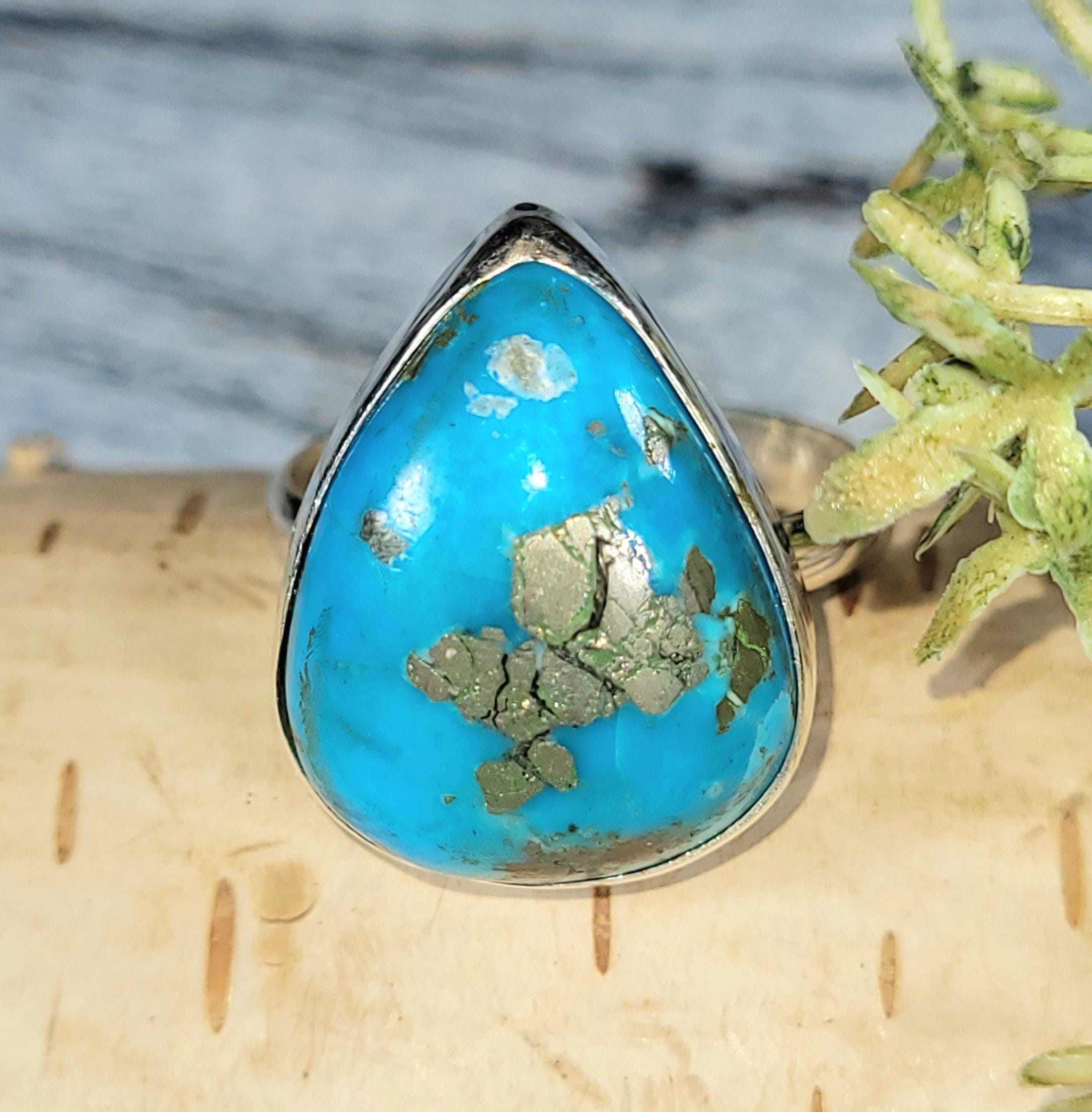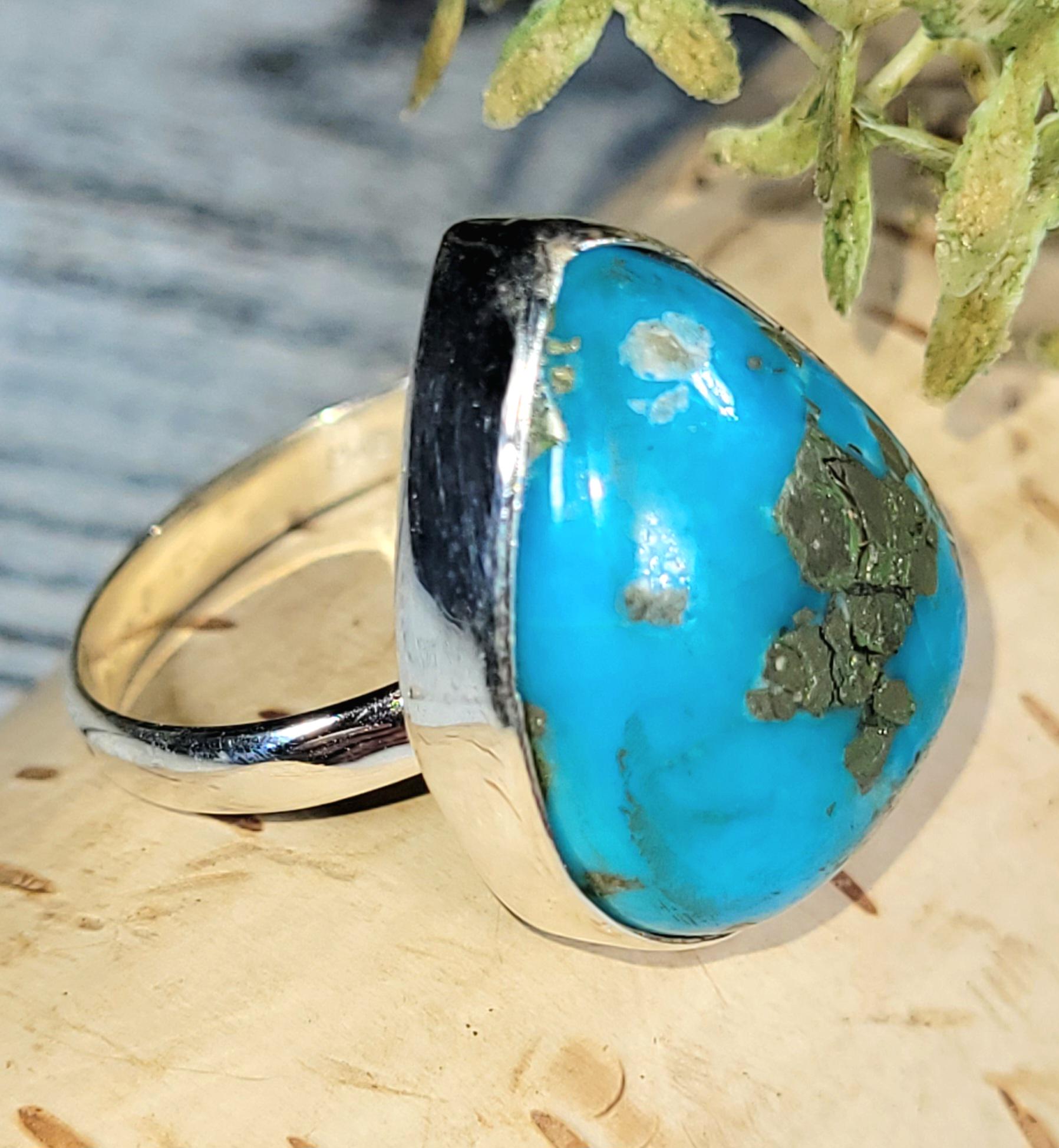 Natural Premium Grade Arizona Pear Turquoise .925 Sterling Silver Ring Size 10 Weighs 6.8 Grams Face Measures 7/8" x 11/16" JS20. Vibrant bluish green color and beautiful patterns! -This is a handpicked natural stone, the exact one shown in picture. The sterling silver is .925 and stamped. Each piece is hand made by artisans in my shop. The quality of the stones and the silver workmanship is impressive. Please look at other items in my store. I sell ready made jewelry with hand crafted silver work, pendants with a sterling silver bails and beautiful unique cabochons for jewelry wire wrapping and weaving. You will pay exact amount on shipping plus $1 for supplies and labor. All items are shipped within a couple of days after payment and are shipped USPS first class or international first class. Items are available for combined shipping, if invoice does not combine please email me and I will combine for you. Average shipping will be $4 to 4.50 for USPS first class. International shipping is available for exact amount of shipping plus $1 for labor and supplies also. We also accept returns for refund or exchange. Thanks for viewing my store