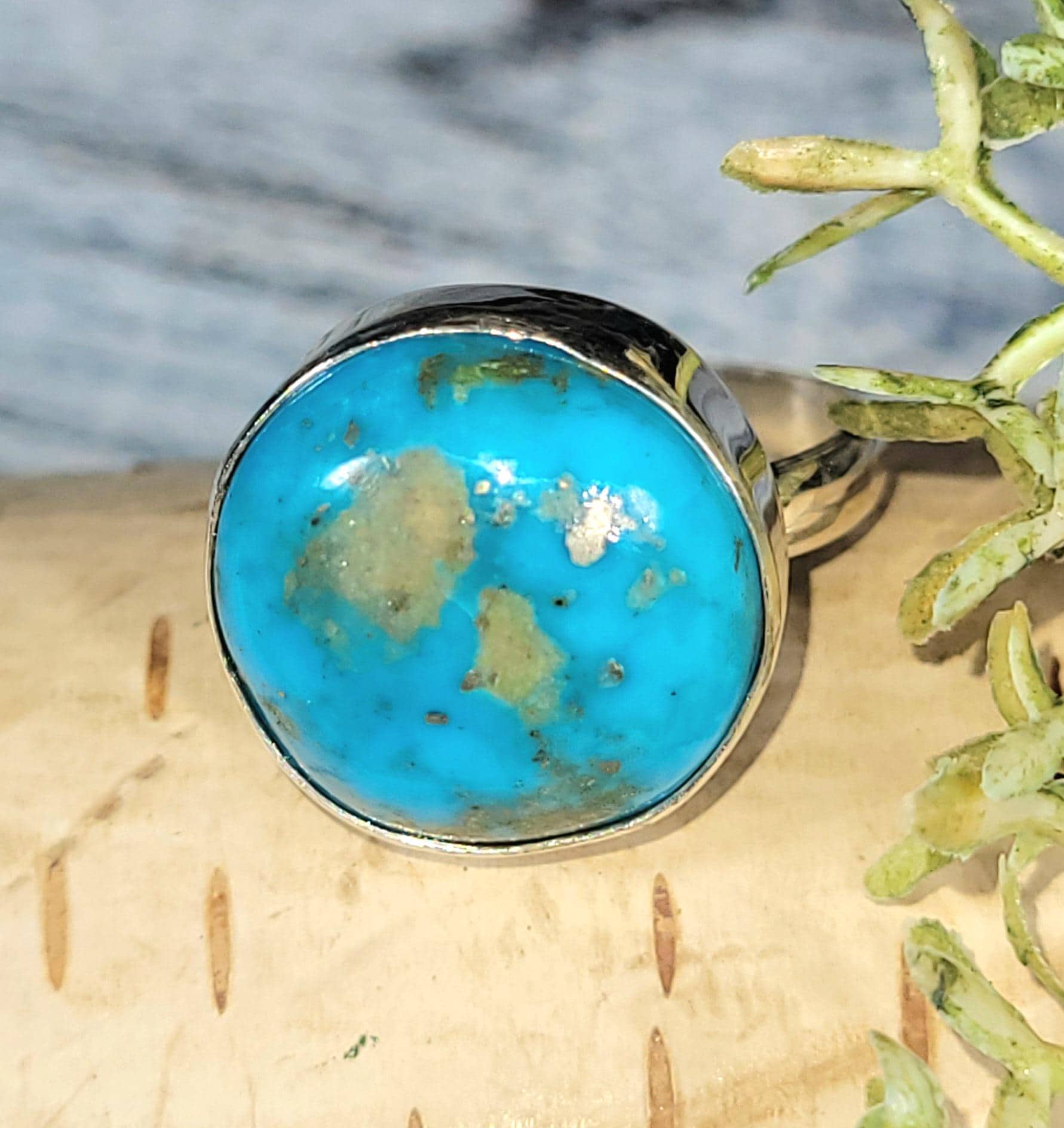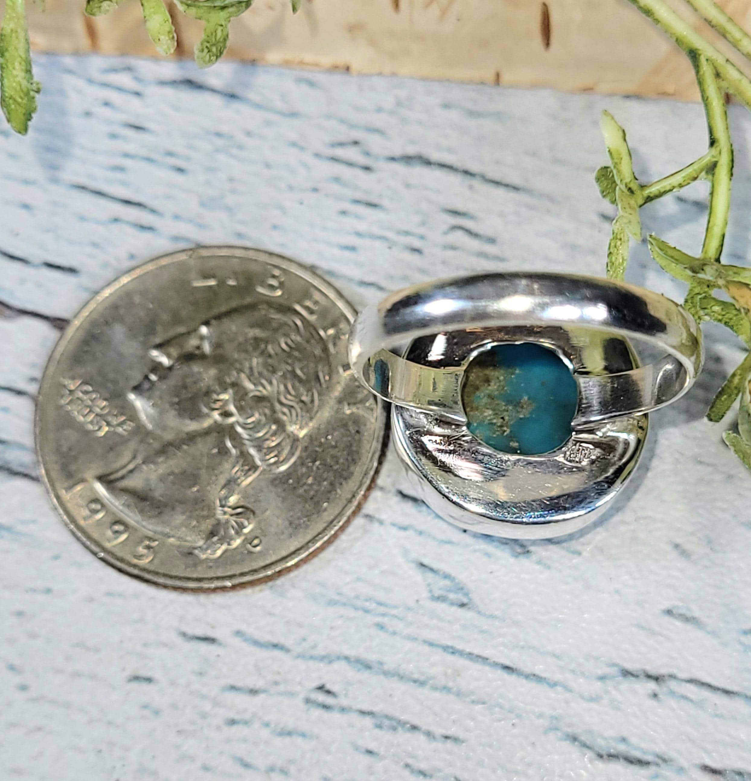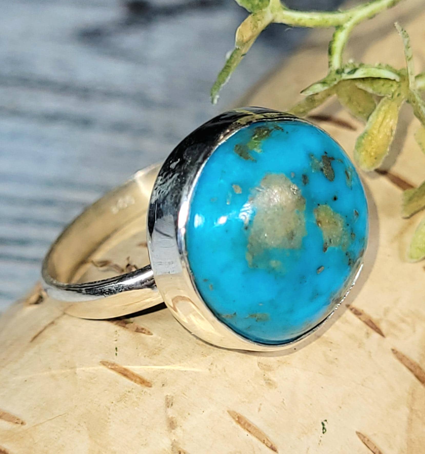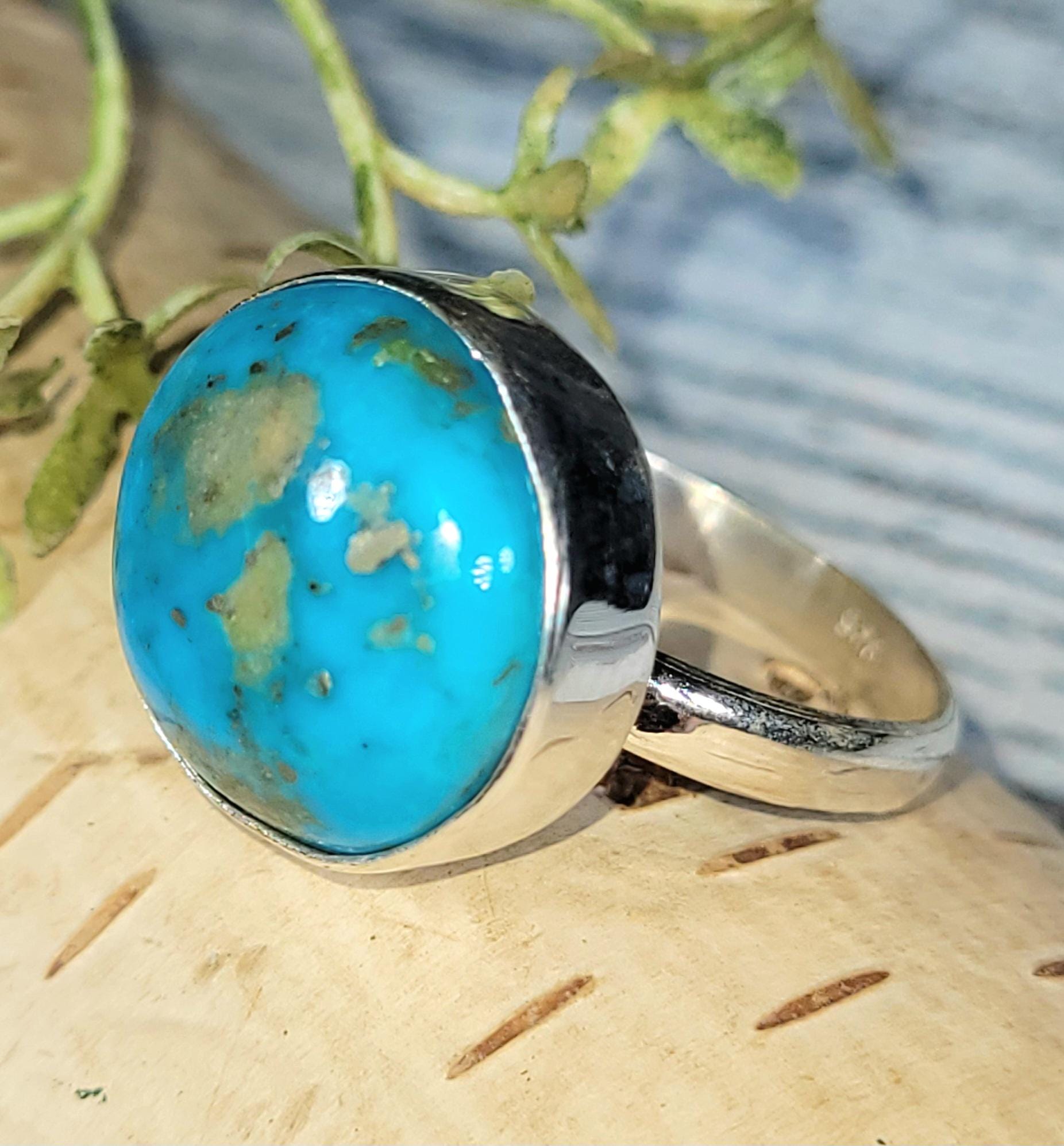 Natural Premium Grade Round Arizona Turquoise Handmade .925 Sterling Silver Ring Size 8 Ring weighs 5.4 Grams and Face measures 5/8"Round JS26. This is a handpicked natural stone, the exact one shown in picture. The sterling silver is .925 and stamped. Each piece is hand made by artisans in my shop. The quality of the stones and the silver workmanship is impressive. All items are .925 Sterling Silver and natural gemstones. The gemstones are handpicked from all over world and then jewelry is created by gifted artisans who are members of our shop. Please look at other items in my store. I sell ready made jewelry with hand crafted silver work, pendants with a sterling silver bails and beautiful unique cabochons for jewelry wire wrapping and weaving. If you buy over $35 of merchandise, we will ship for free to US. You will pay exact amount on shipping plus $1 for supplies and labor on all orders under $35 or international orders. All items are shipped within a couple of days after payment and are shipped USPS first class or international first class. Items are available for combined shipping, if invoice does not combine, please email me and I will combine for you. Average shipping will be $4 to 4.50 for USPS first class. International shipping is available for exact amount of shipping plus $1 for labor and supplies also. We also accept returns for refund or exchange. Thanks so much for viewing my store