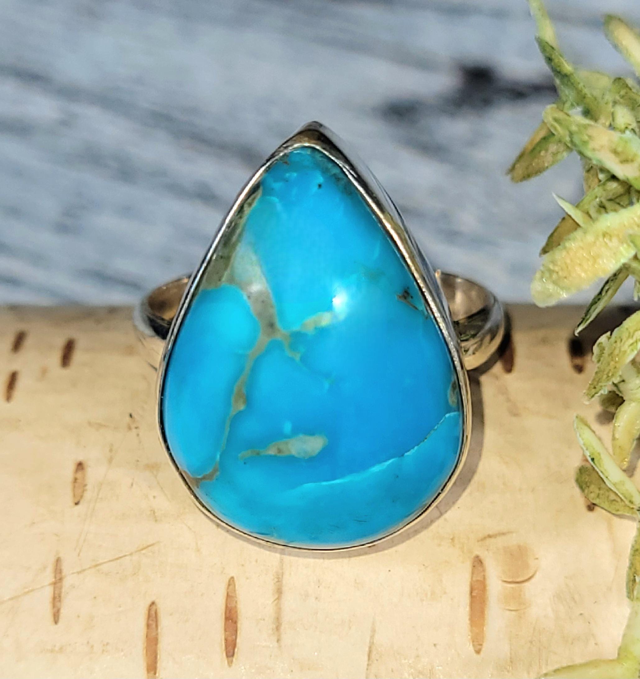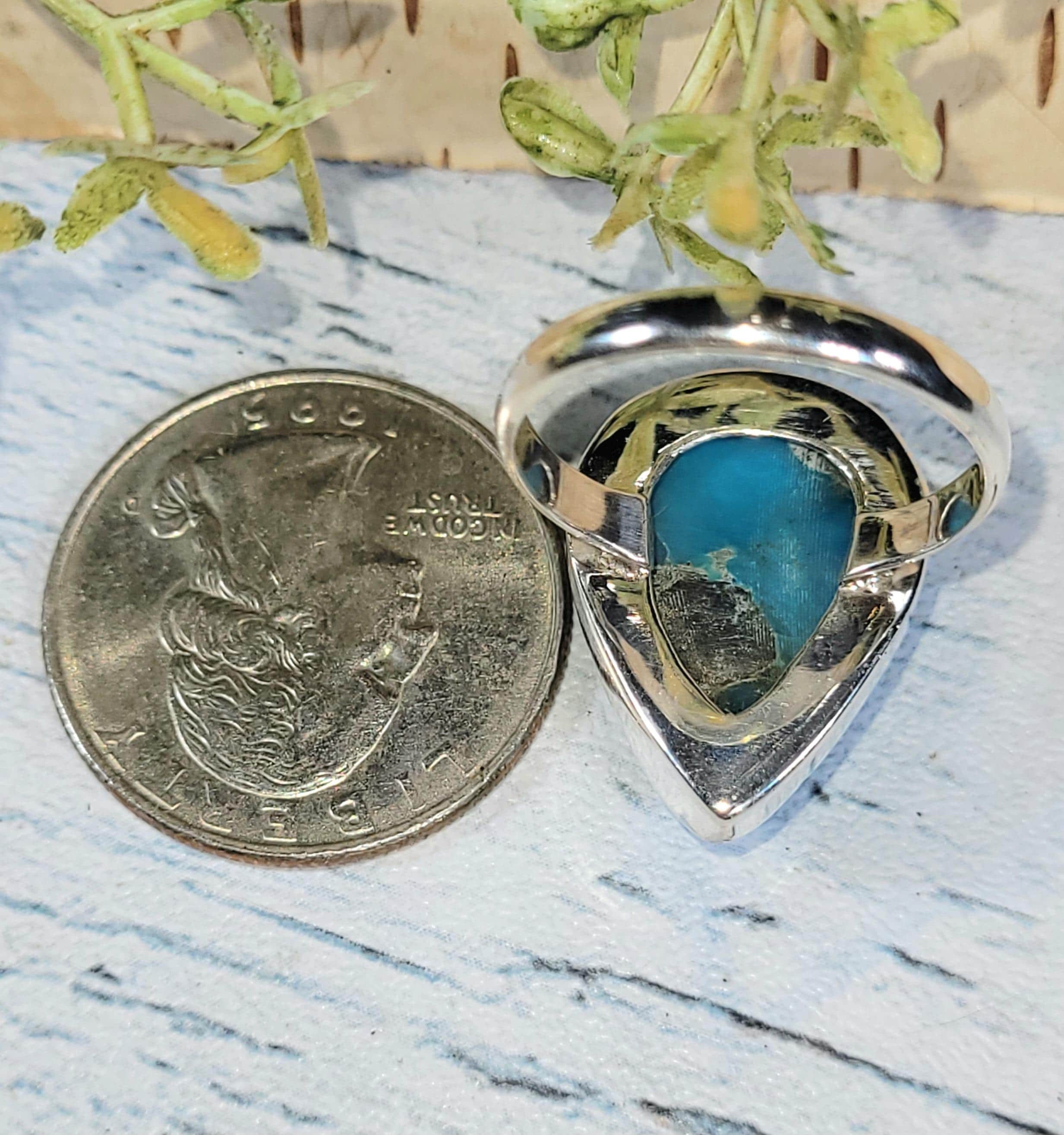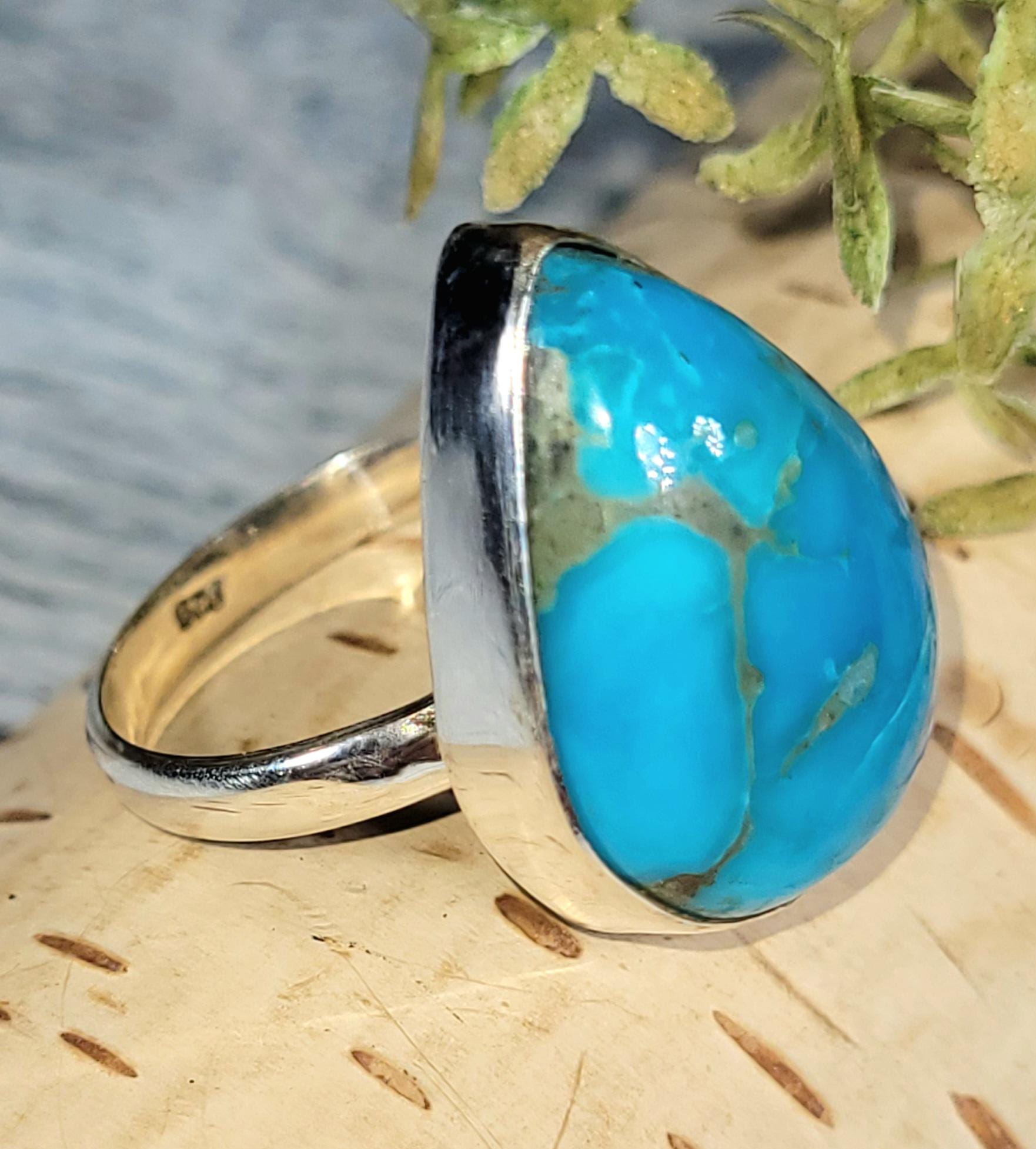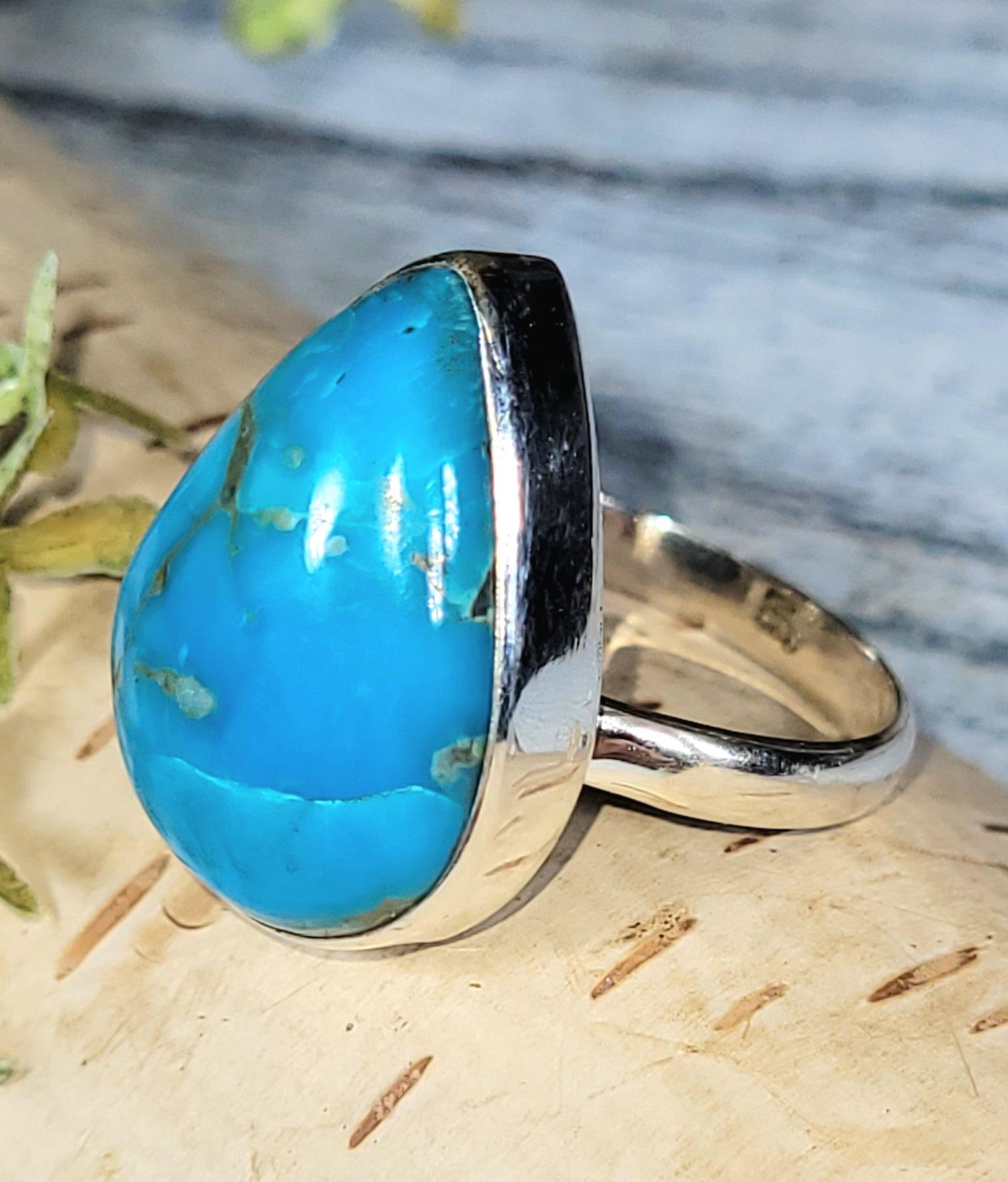 Natural AAA Grade Arizona Pear Turquoise .925 Sterling Silver Ring Size 10 Weighs 6.1 Grams Face Measures 7/8" x 5/8" JS28. Vibrant bluish green color and beautiful patterns! -This is a handpicked natural stone, the exact one shown in picture. The sterling silver is .925 and stamped. Each piece is hand made by artisans in my shop. The quality of the stones and the silver workmanship is impressive. Please look at other items in my store. I sell ready made jewelry with hand crafted silver work, pendants with a sterling silver bails and beautiful unique cabochons for jewelry wire wrapping and weaving. You will pay exact amount on shipping plus $1 for supplies and labor. All items are shipped within a couple of days after payment and are shipped USPS first class or international first class. Items are available for combined shipping, if invoice does not combine please email me and I will combine for you. Average shipping will be $4 to 4.50 for USPS first class. International shipping is available for exact amount of shipping plus $1 for labor and supplies also. We also accept returns for refund or exchange. Thanks for viewing my store