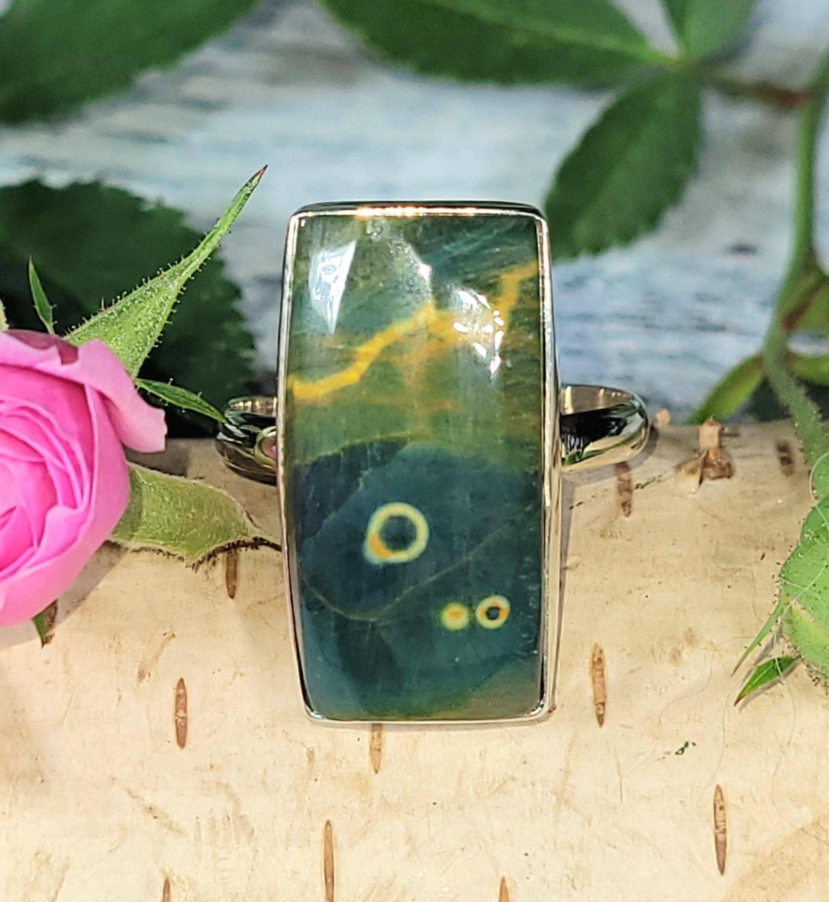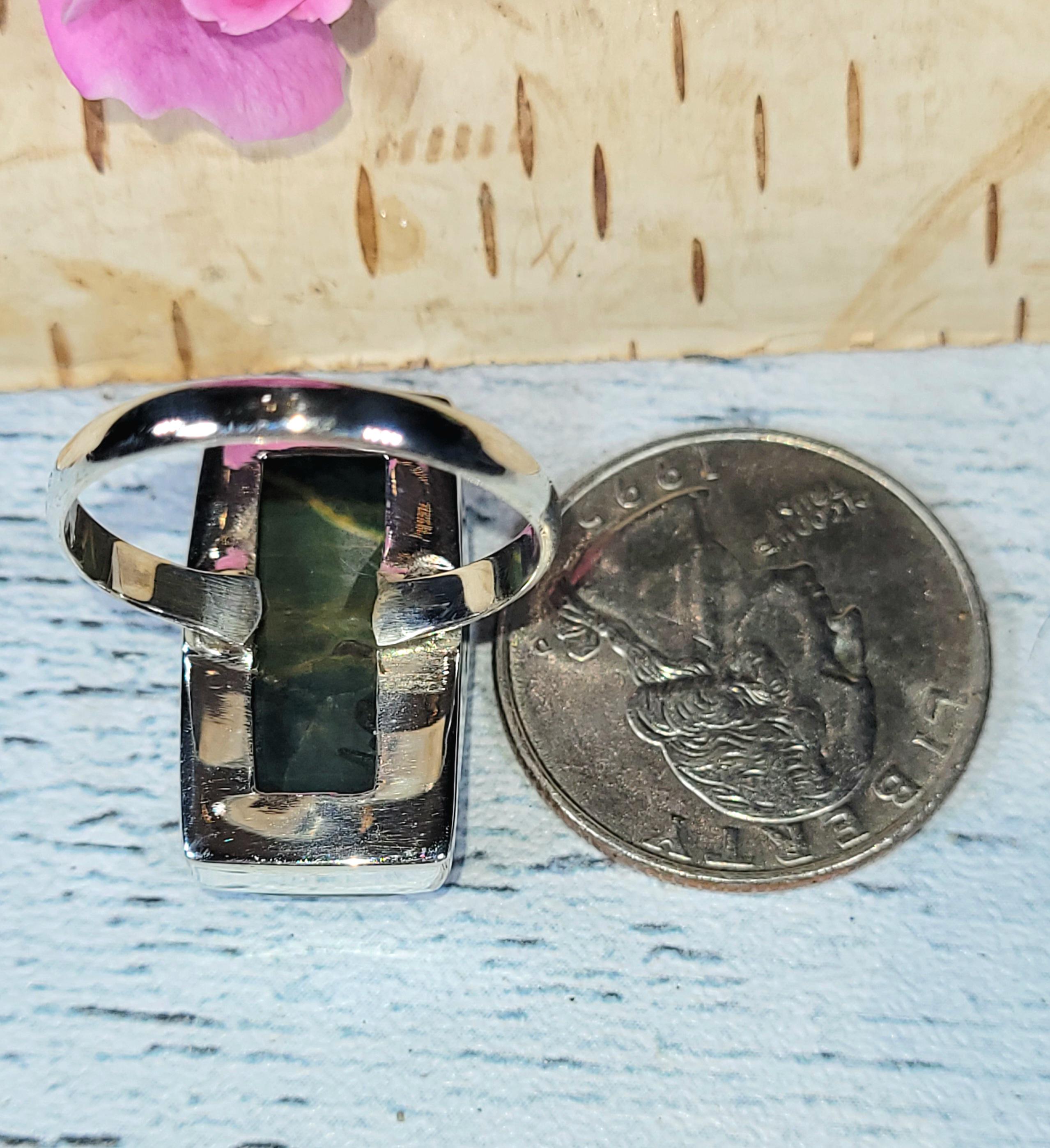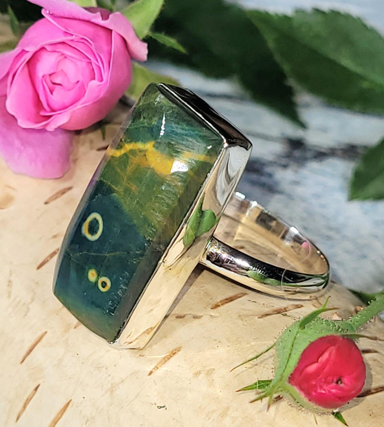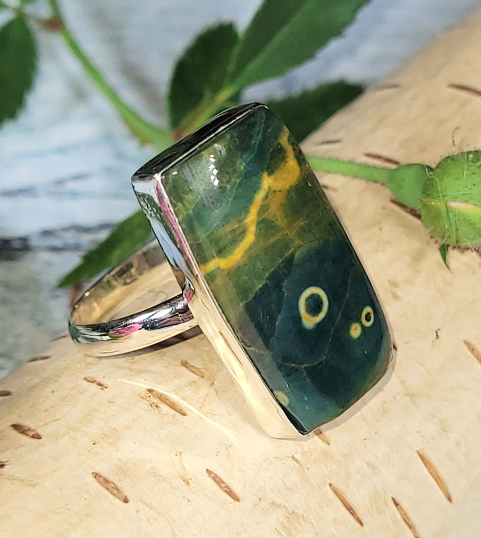 Natural Top Quality Ocean Jasper Rectangle Handmade .925 Sterling Silver Ring Size 10 weighs 6.7 Grams and Face measures 15/16" x 1/2" JT17. Absolutely gorgeous colors and patterns! Looks MUCH better in person!!! This is a handpicked natural stone, the exact one shown in picture. If you're not pleased with the item you receive please email us before leaving review. We stand behind our jewelry 100% and will refund you or send a replacement to make sure you're happy with your purchase!! The sterling silver is .925 and stamped. Each piece is hand made by artisans in my shop. The quality of the stones and the silver workmanship is impressive. Please look at other items in my store. I sell ready made jewelry with hand crafted silver work, pendants with a sterling silver bails and beautiful unique cabochons for jewelry wire wrapping and weaving. You will pay exact amount on shipping plus $1 for supplies and labor. All items are shipped within a couple of days after payment and are shipped USPS first class or international first class. Items are available for combined shipping, if invoice does not combine please email me and I will combine for you. Average shipping will be $4 to 4.50 for USPS first class. International shipping is available for exact amount of shipping plus $1 for labor and supplies also. We also accept returns for refund or exchange. Thanks for viewing my store