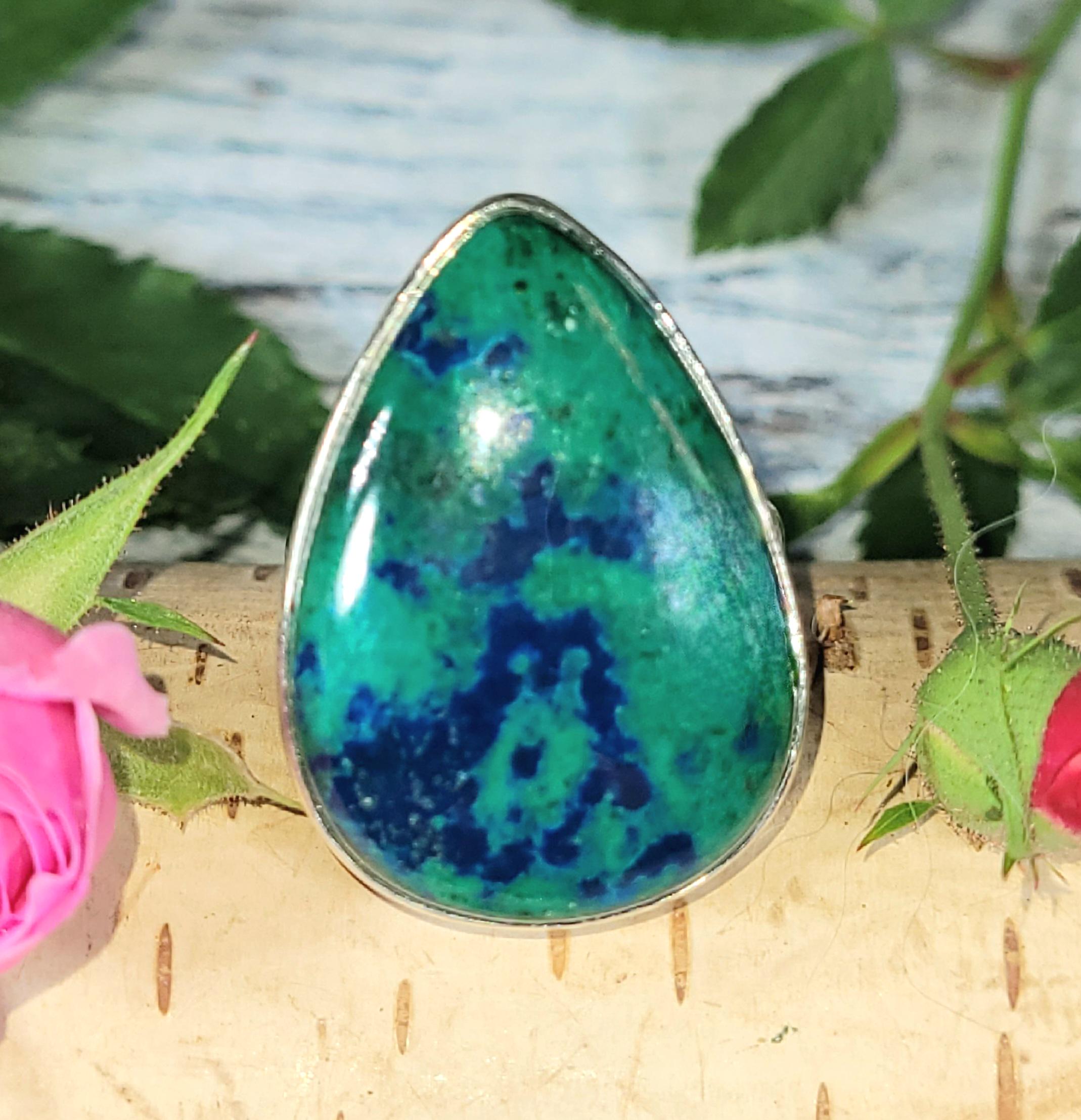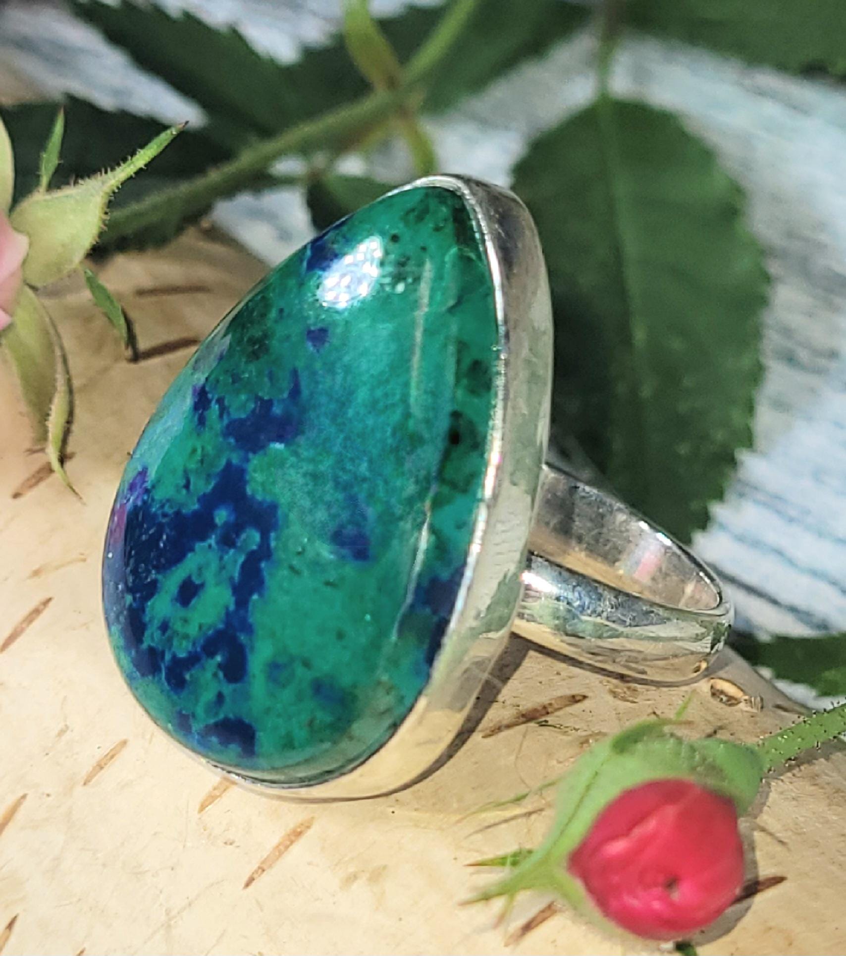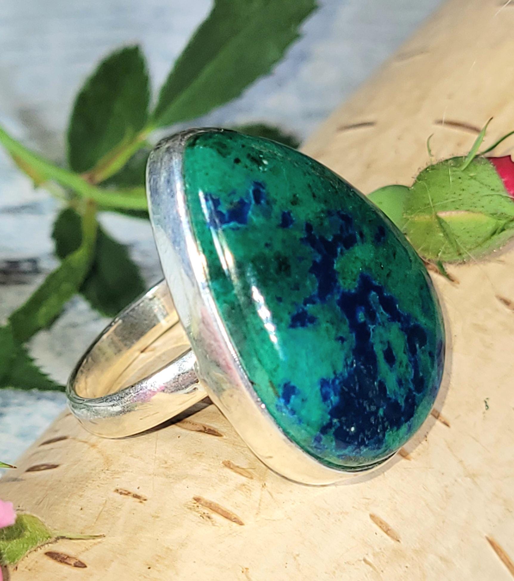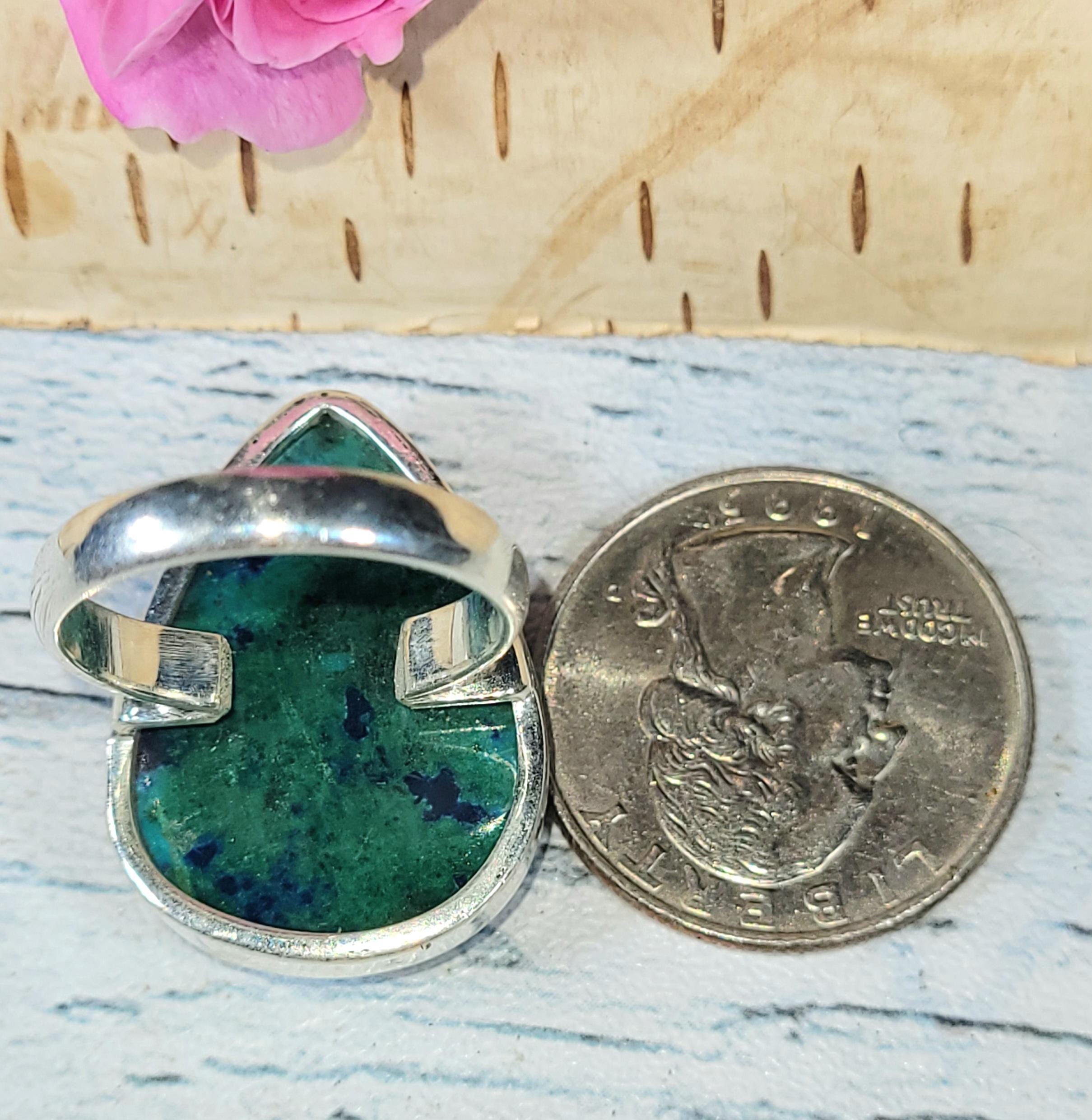 Natural Premium Grade Shattuckite Handmade Pear Shaped .925 Sterling Silver Ring Size 8, weighing 11.4 Grams Face 7/8" x 1 1/8" JT18. This is a handpicked natural stone, the exact one shown in picture. The sterling silver is .925 and stamped. Each piece is hand made by artisans in my shop. The quality of the stones and the silver workmanship is impressive. Please look at other items in my store. I sell both ready-made jewelry with hand crafted silver work pendants with sterling silver bails and beautiful unique cabochons for jewelry wire wrapping and weaving. You will pay exact amount on shipping plus $1 for supplies and labor. All items are shipped within a couple of days after payment and are shipped USPS first class or international first class. Items are available for combined shipping, if invoice does not combine, please email me and I will combine your order for you. Average shipping will be $4 to 4.50 for USPS first class. International shipping is available for exact amount of shipping plus $1 for labor and supplies also. I also accept returns for refund or exchange. Thanks for viewing my store!