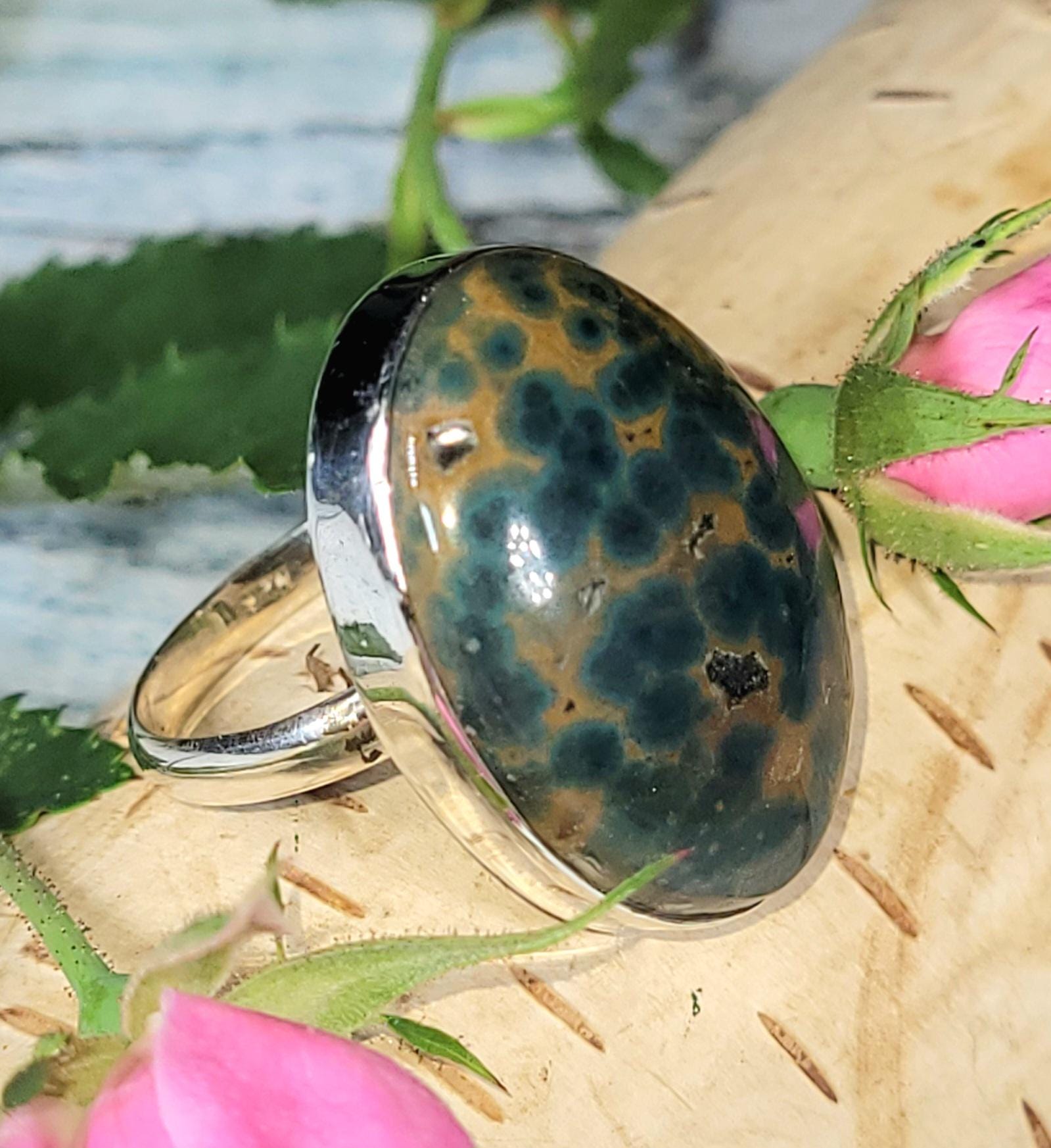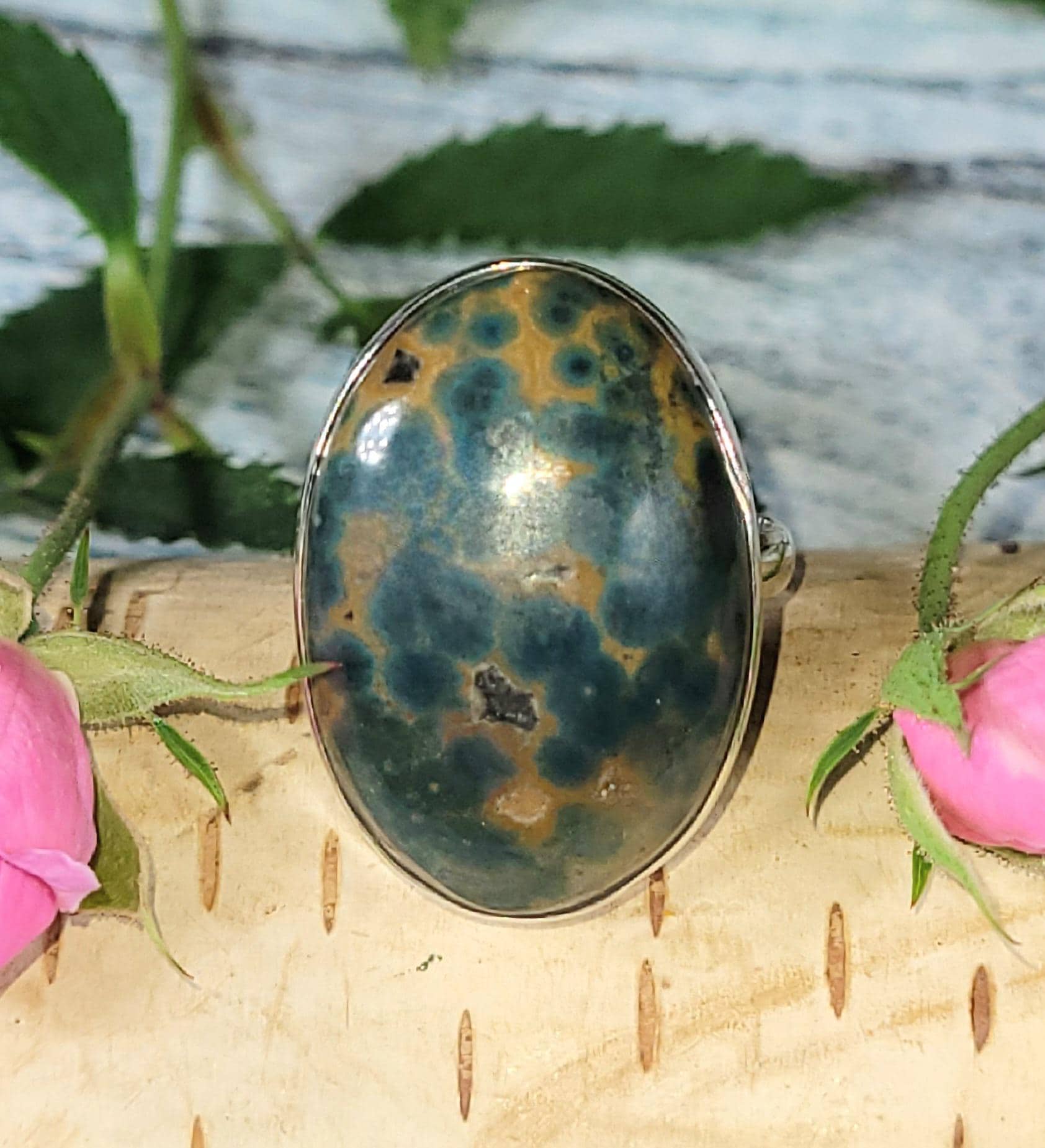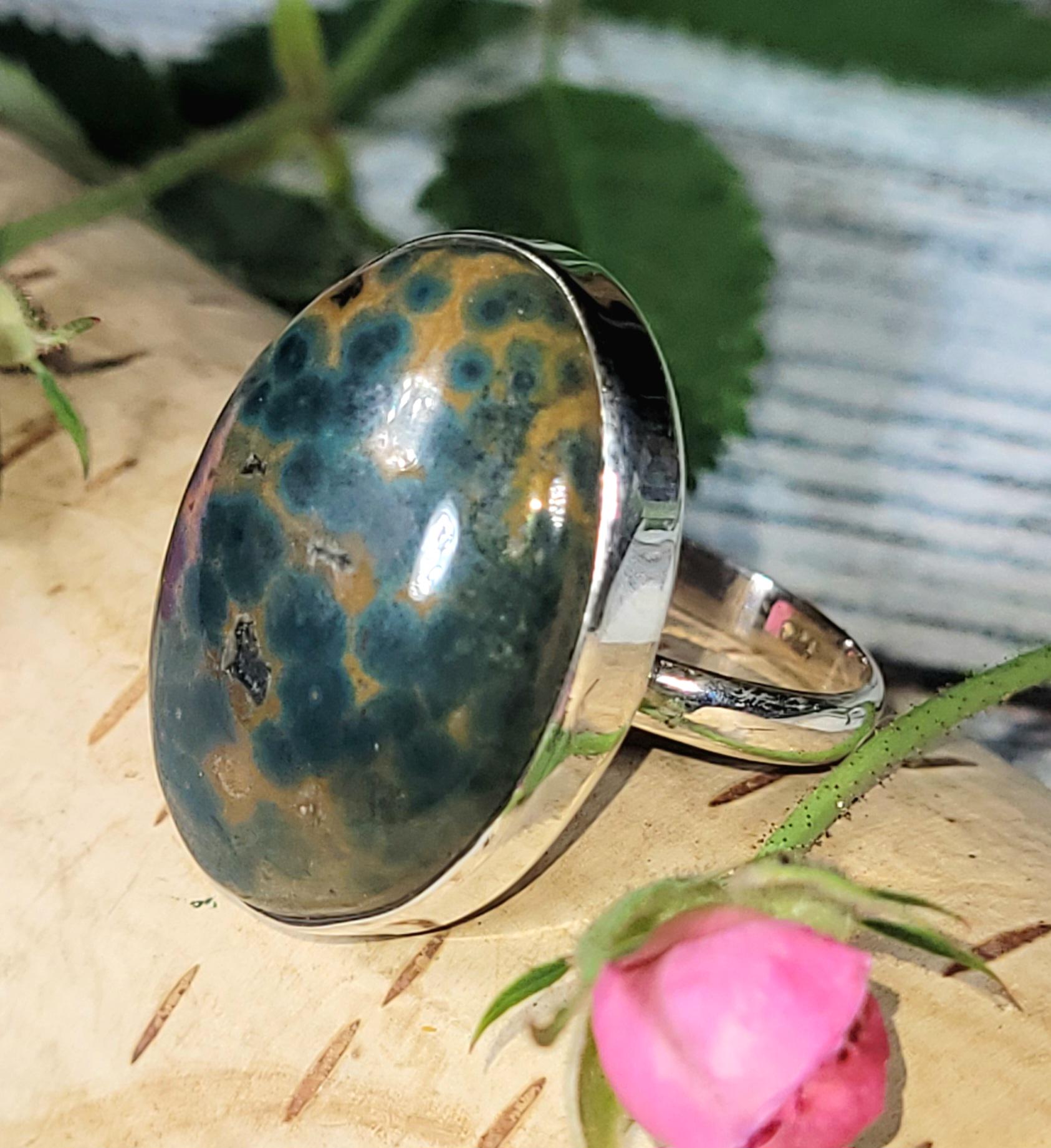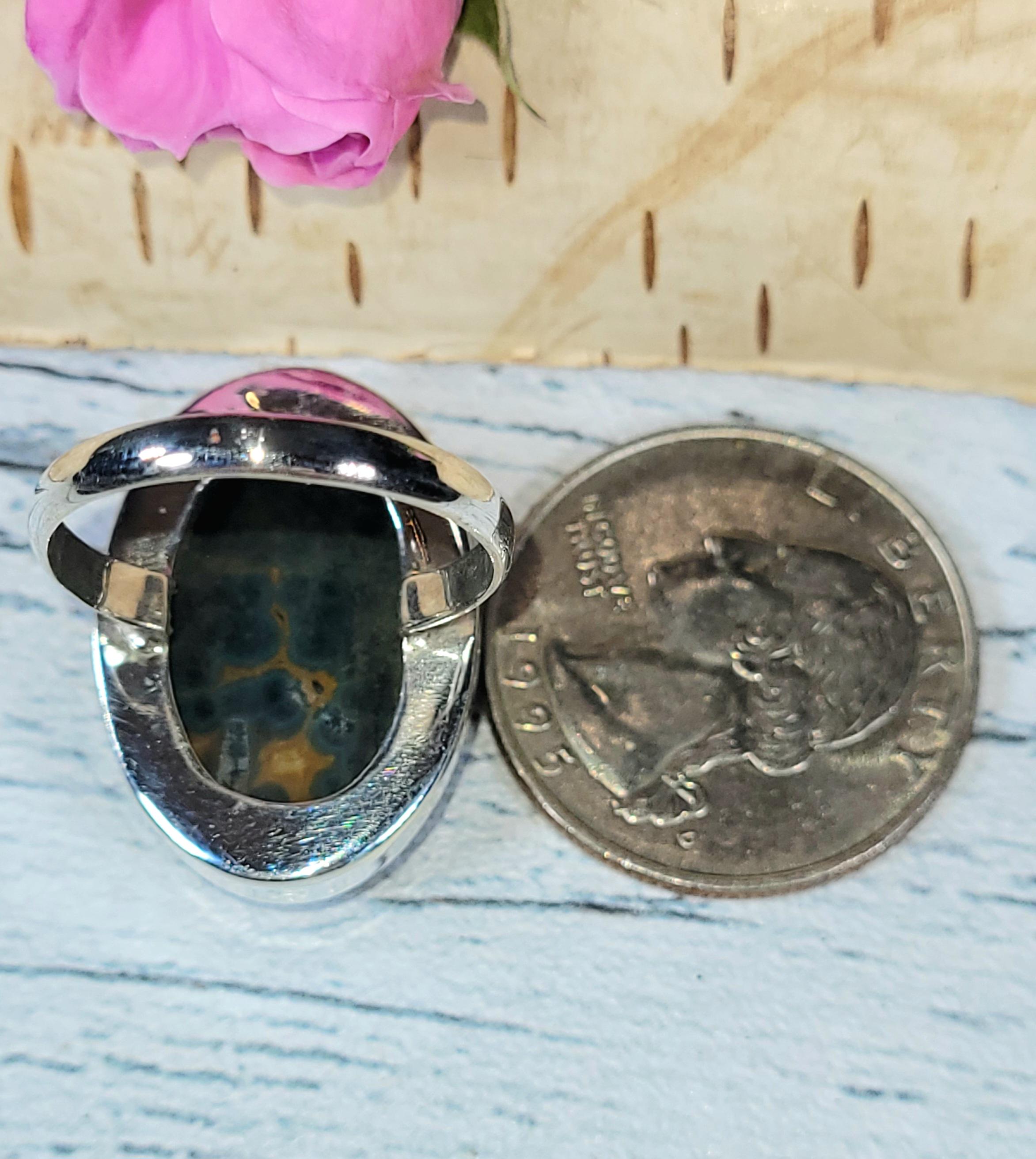 Natural Premium Grade Ocean Jasper .925 Sterling Silver Ring Size 8.75 Weighs 6.6 Grams Face Measures 11/16" x 1" JT21. This is a handpicked natural stone, the exact one shown in picture. The sterling silver is .925 and stamped. Each piece is hand made by artisans our shop. The quality of the stones and the silver workmanship is impressive. Please look at other items in our store. We sell ready-made jewelry with hand crafted silver work, pendants with a sterling silver bails, and beautiful unique cabochons for jewelry wire wrapping and weaving. You will pay exact amount on shipping plus $1 for supplies and labor. All items are shipped within a couple of days after payment and are shipped USPS first class or international first class. Items are available for combined shipping, if invoice does not combine, please email us and we will combine shipping for you. Average shipping will be $4 to 4.50 for USPS first class. International shipping is available for exact amount of shipping plus $1 for labor and supplies also. We also accept returns for refund or exchange. Thanks for viewing our store.