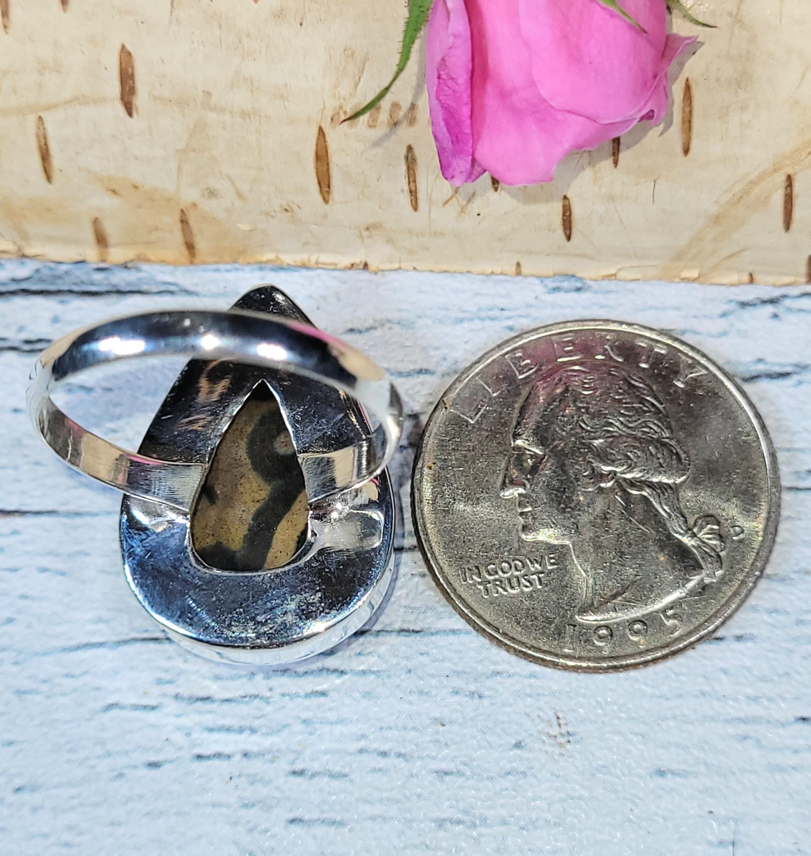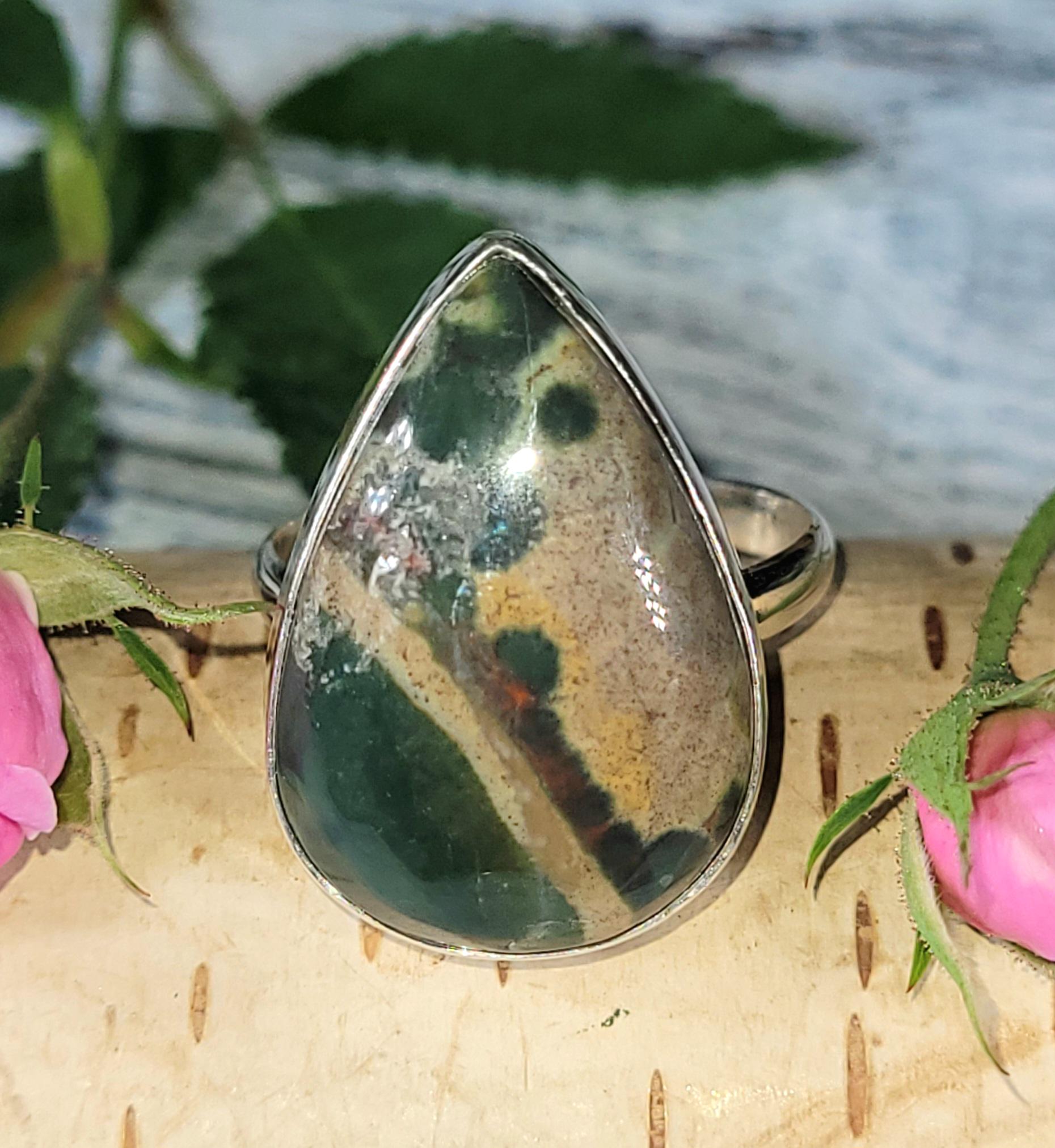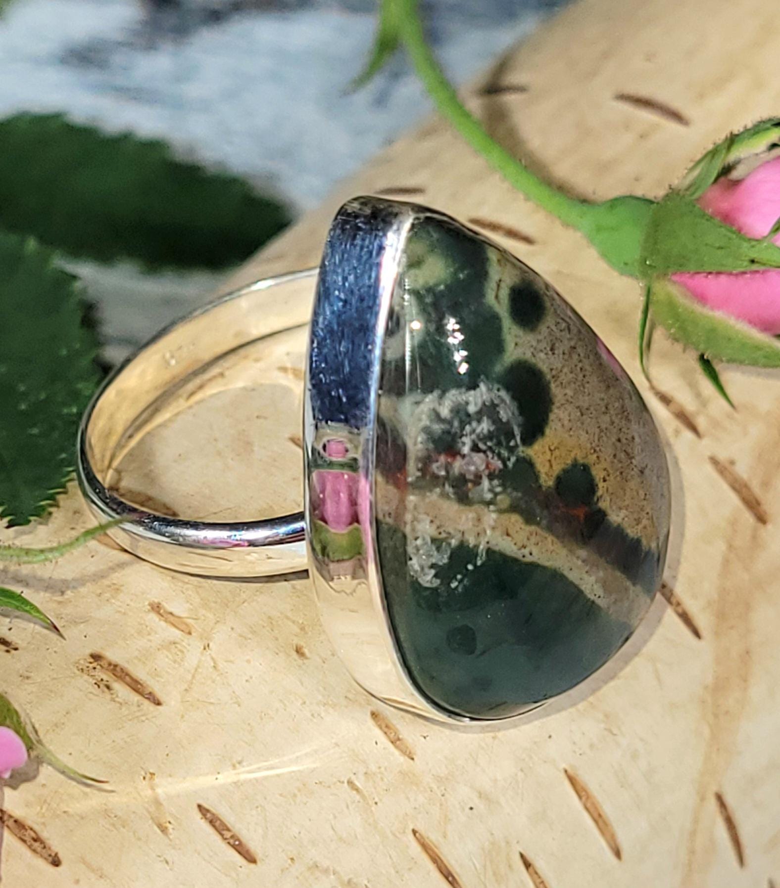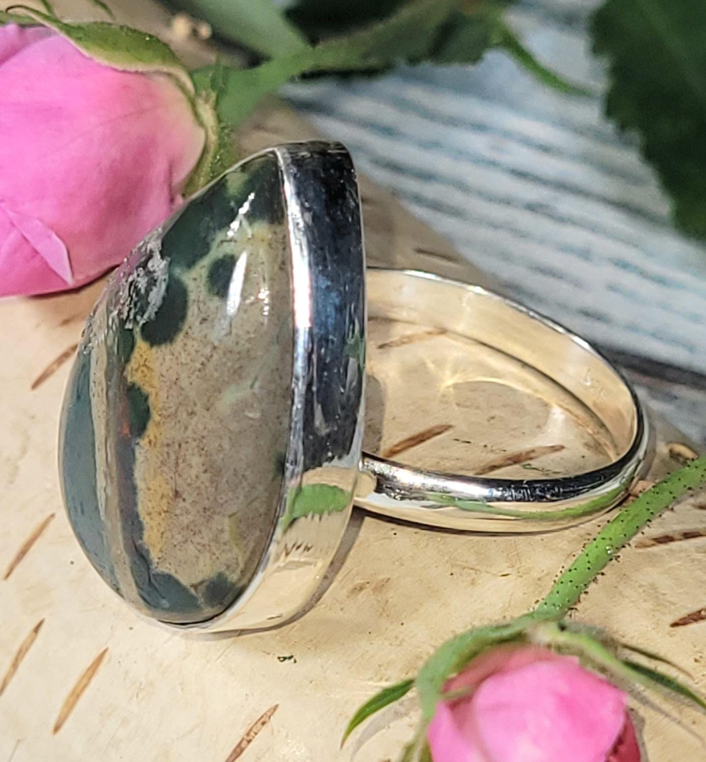 Natural Premium Grade Ocean Jasper .925 Sterling Silver Ring Size 9.75 Weighs 7.8 Grams Face Measures 11/16" x 15/16" JT23. This is a handpicked natural stone, the exact one shown in picture. The sterling silver is .925 and stamped. Each piece is hand made by artisans our shop. The quality of the stones and the silver workmanship is impressive. Please look at other items in our store. We sell ready-made jewelry with hand crafted silver work, pendants with a sterling silver bails, and beautiful unique cabochons for jewelry wire wrapping and weaving. You will pay exact amount on shipping plus $1 for supplies and labor. All items are shipped within a couple of days after payment and are shipped USPS first class or international first class. Items are available for combined shipping, if invoice does not combine, please email us and we will combine shipping for you. Average shipping will be $4 to 4.50 for USPS first class. International shipping is available for exact amount of shipping plus $1 for labor and supplies also. We also accept returns for refund or exchange. Thanks for viewing our store.
