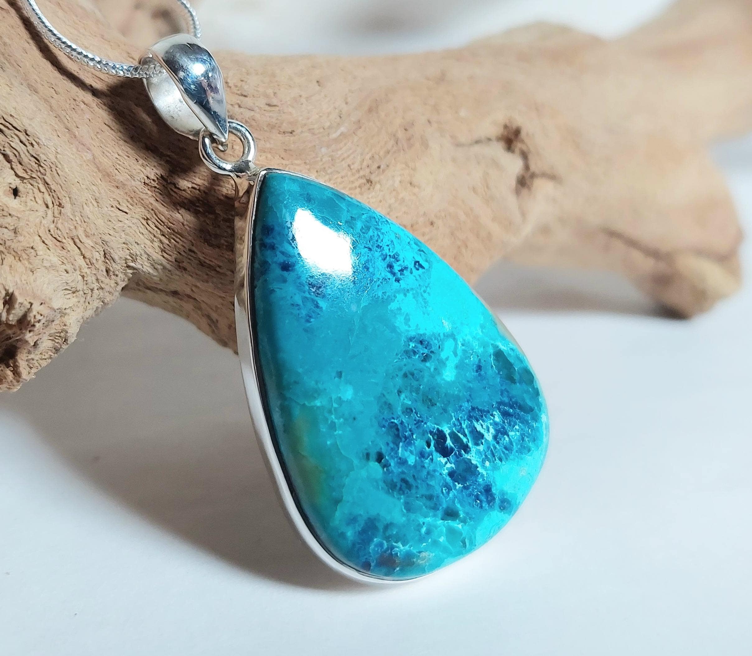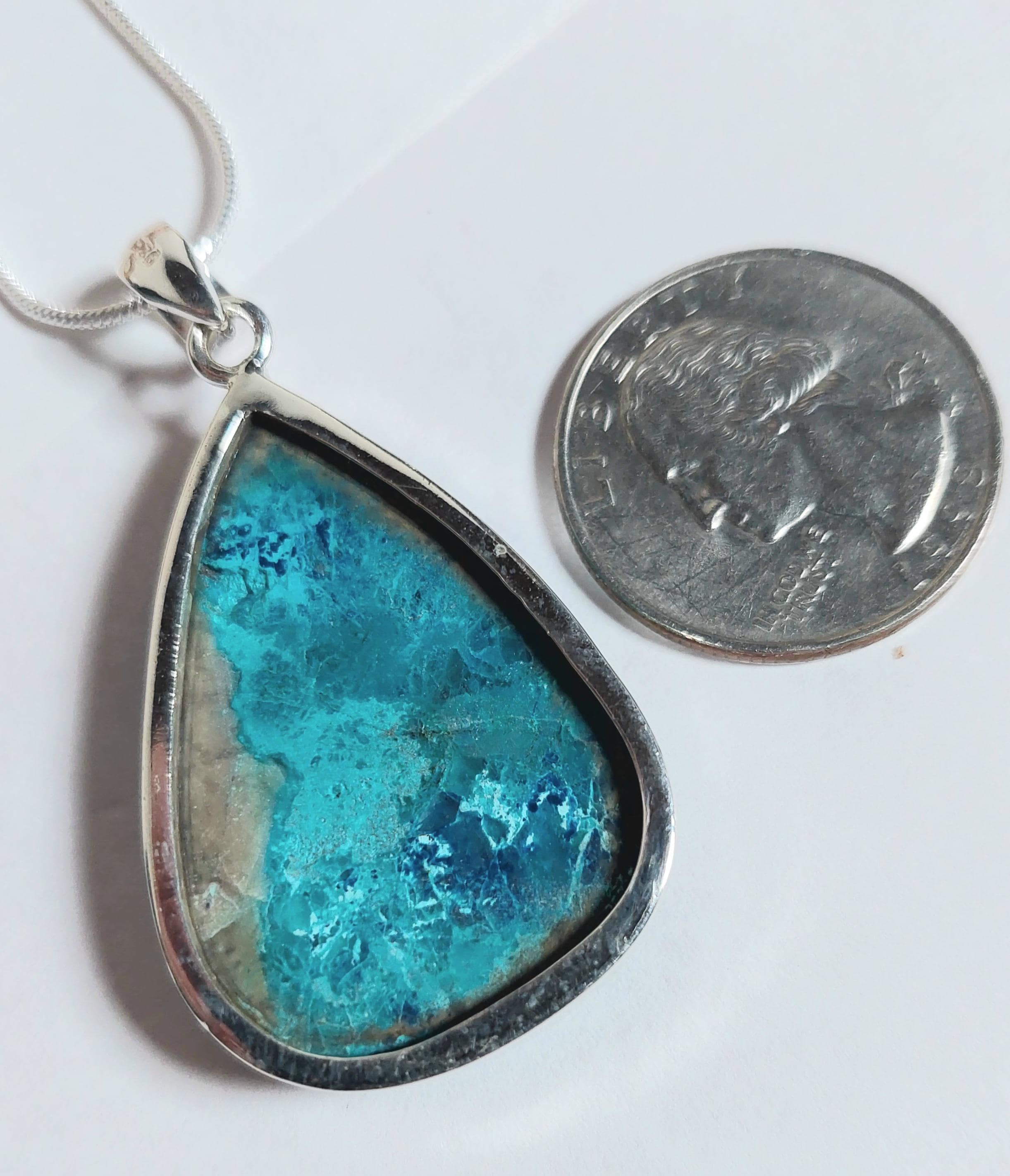 Natural AAA Grade Chrysocolla w/Azurite Handmade Teardrop .925 Sterling Silver Pendant Weighs 10 Grams Measures 1 1/2 x 1" JV47. Gift For Her. This is a handpicked natural stone, the exact one shown in the picture. The sterling silver is .925 and stamped. Each piece is hand made by artisans in my shop. The quality of the stones and the silver workmanship is hard to beat. All items are shipped within a couple of days after payment and are shipped USPS first class or international first class. Please look at other items in my store. I sell ready made jewelry with hand crafted silver work, pendants with a sterling silver bails and beautiful unique stones for jewelry wire wrapping and weaving. You will pay exact amount on shipping plus $1 for supplies and labor. Items are available for combined shipping. Average shipping will be $4 to 4.50 for USPS first class. International shipping is available for the exact amount of shipping plus $1 for labor and supplies also. Thanks for viewing my store.