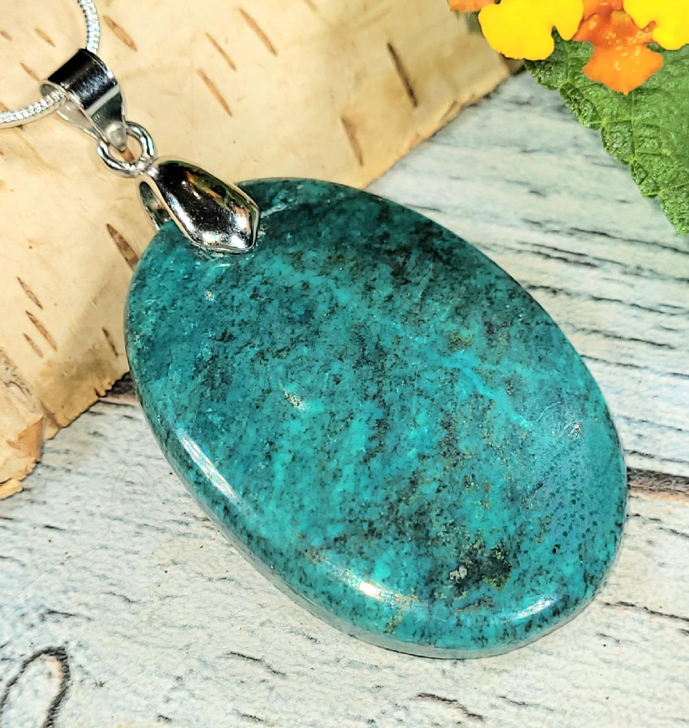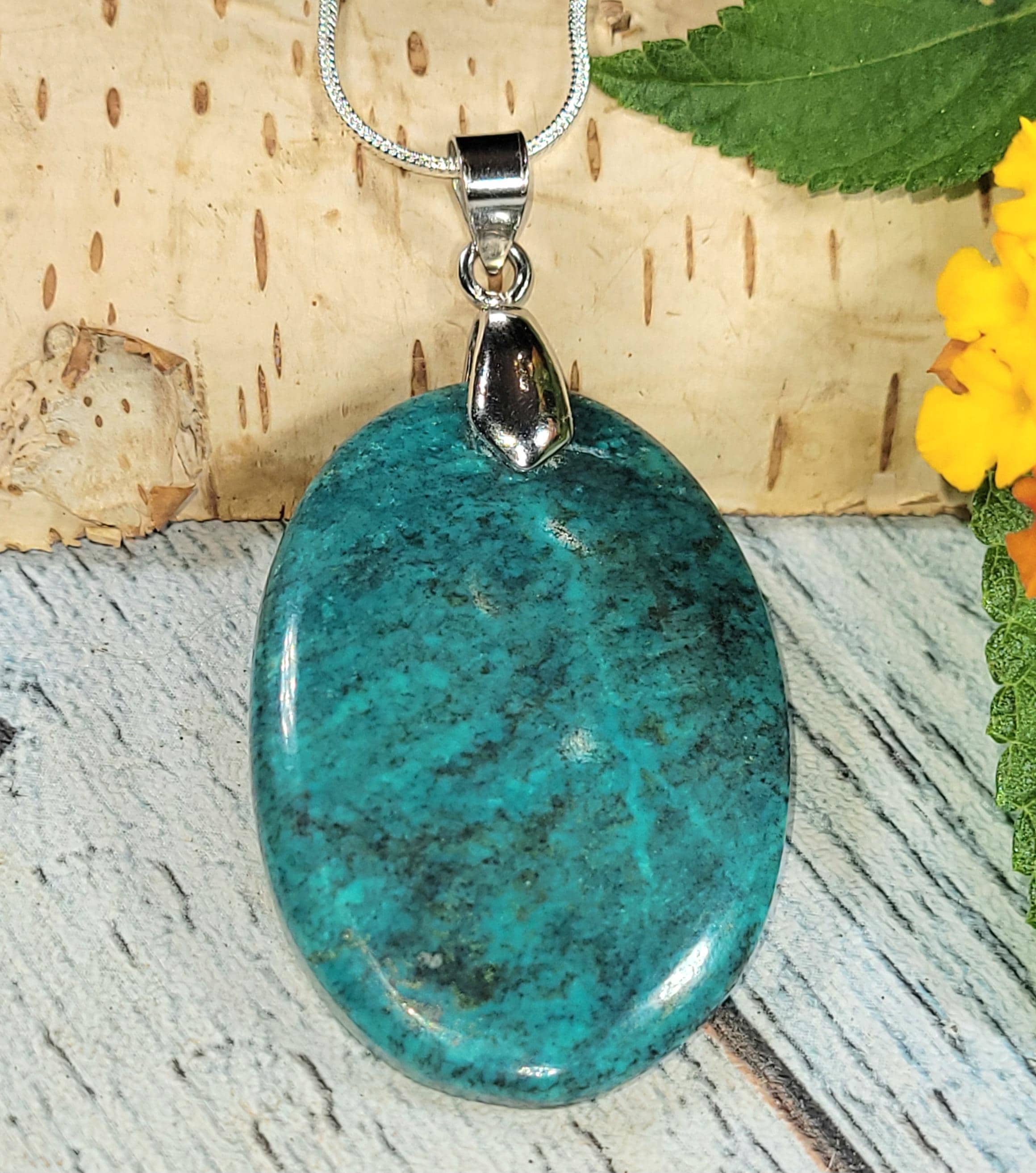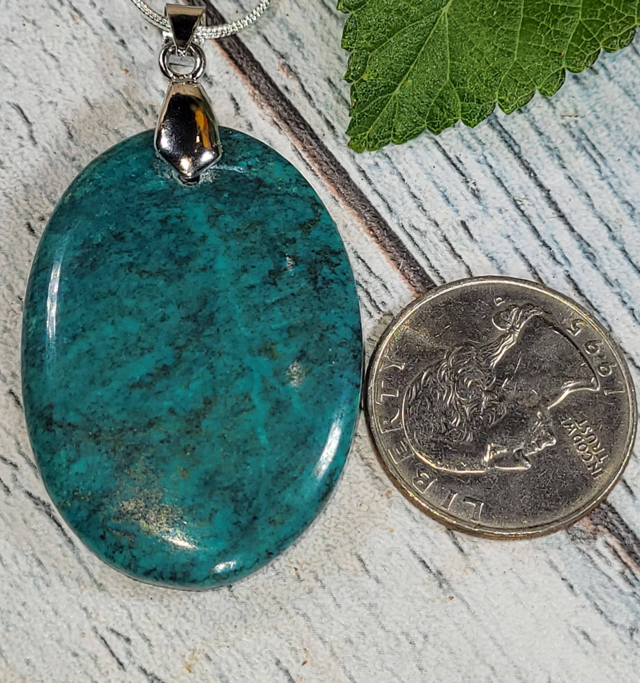 Natural AAA Chrysocolla Oval Cabochon .925 Sterling Silver Pendant measures 2 1/4" x 1 1/8" features an Heavy Duty Sterling Silver Bail that will accommodate up to a 4mm chain JH17. -This is a handpicked natural stone, the exact one shown in picture. The sterling silver is .925 and stamped. Each piece is hand made by artisans in my shop. The quality of the stones and the silver workmanship is impressive. Please look at other items in my store. I sell ready made jewelry with hand crafted silver work, pendants with a sterling silver bails and beautiful unique stones for jewelry wire wrapping and weaving. You will pay exact amount on shipping plus $1 for supplies and labor. All items are shipped within a couple of days after payment and are shipped USPS first class or international first class. Items are available for combined shipping, if invoice does not combine please email me and I will combine for you. Average shipping will be $4 to 4.50 for USPS first class. International shipping is available for exact amount of shipping plus $1 for labor and supplies also. We also accept returns for refund or exchange. Thanks for viewing my store.