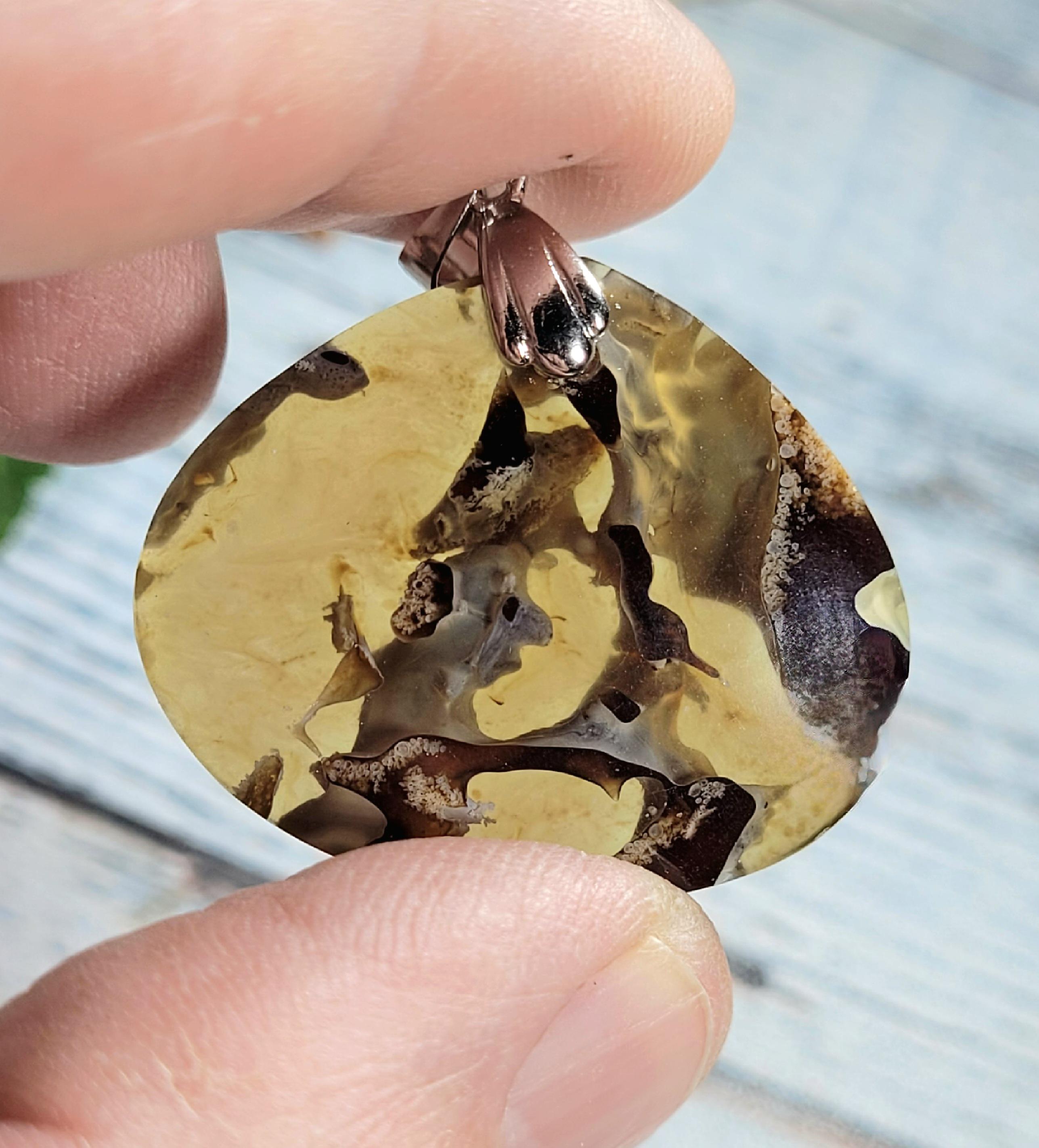 Natural Premium Grade Indonesian Pear Amber .925 Sterling Silver Pendant measures 1 5/8" x 1 3/8" and features a Solid Sterling Silver Rhodium Plated Bail that will accommodate a 3mm chain and resist tarnishing JH23. This is a handpicked natural stone, the exact one shown in picture. The sterling silver is .925 and stamped. Each piece is handmade by artisans in my shop. The quality of the stones and the silver craftmanship is impressive in all items. Please look at other items in my store. I sell ready made jewelry with handcrafted silver work, pendants with a sterling silver bails and beautiful unique stones for jewelry wire wrapping and weaving. You will pay exact amount on shipping plus $1 for supplies and labor. All items are shipped within a couple of days after payment and are shipped USPS first class or international first class. Items are available for combined shipping, if invoice does not combine please email me and I will combine for you. Average shipping will be $4 to 4.50 for USPS first class. International shipping is available for exact amount of shipping plus $1 for labor and supplies also. We also accept returns for refund or exchange. Thanks for viewing my store.