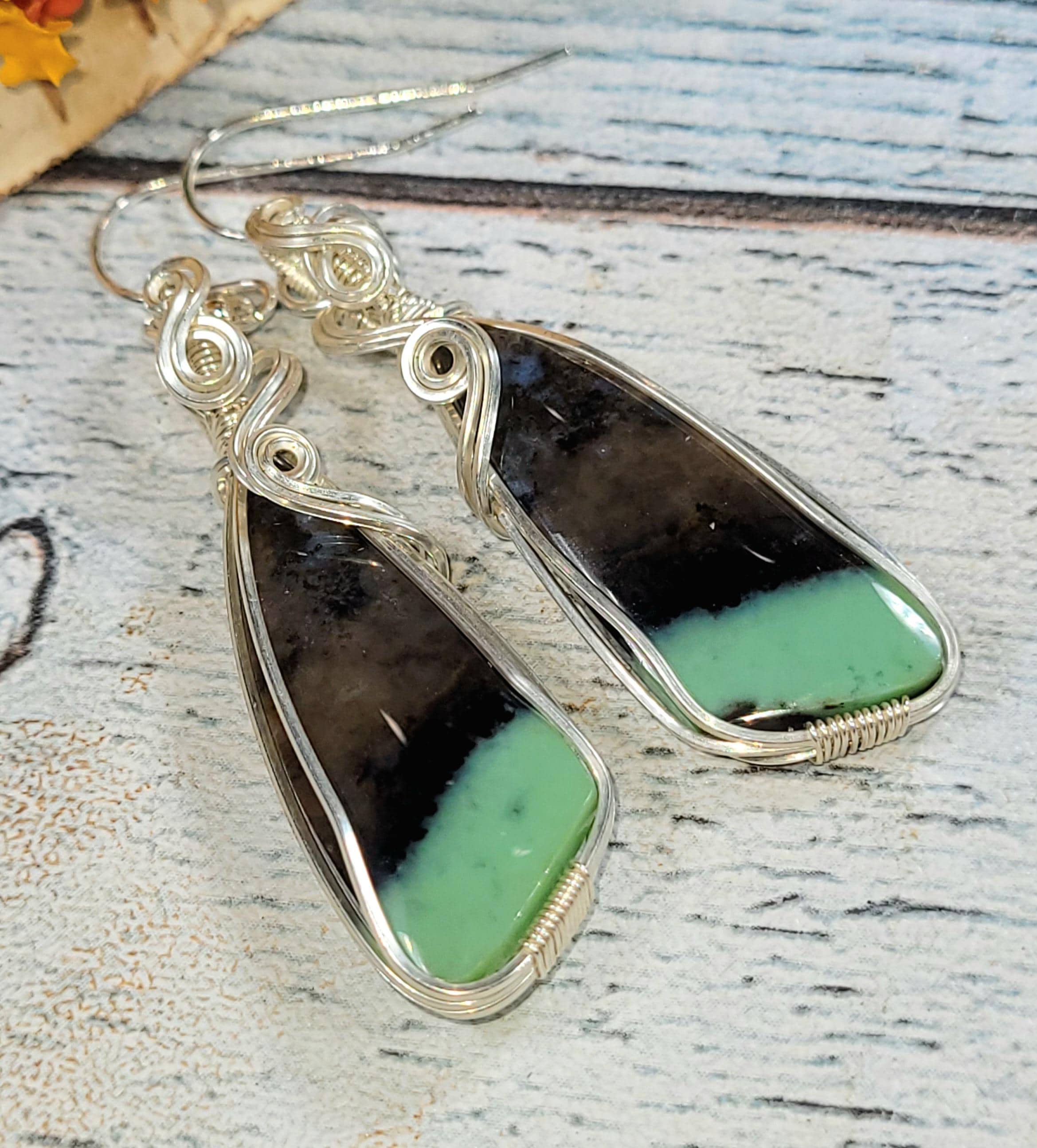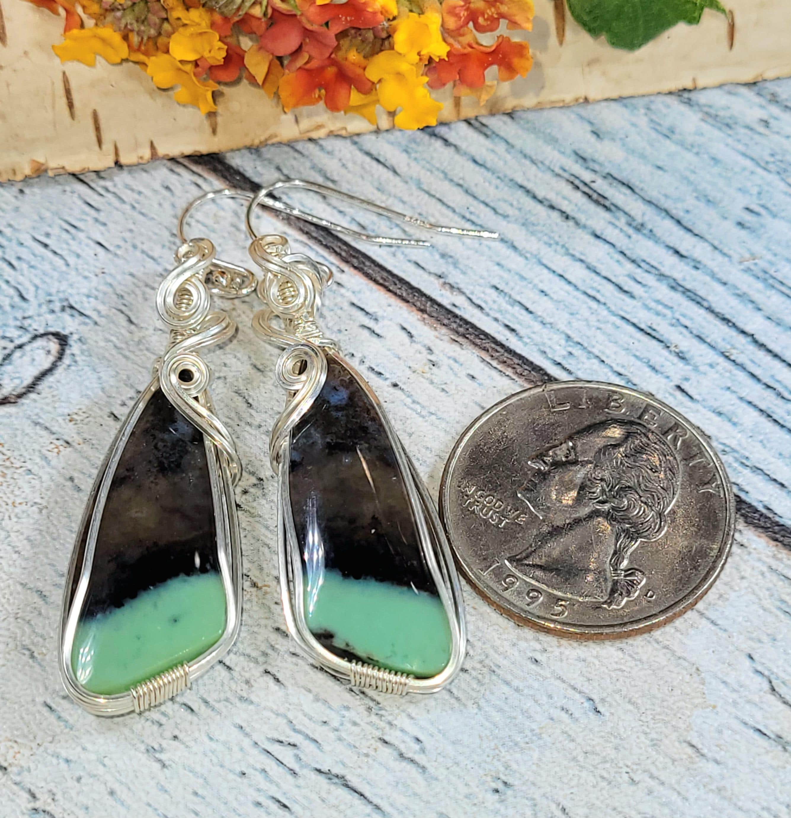 Natural Rare AAA Grade Blue Opalized Petrified Wood Handmade .925 Sterling Silver Wire Wrapped Earrings 6.6 Grams 2 3/8" x 9/16" JC41. Gift for Her Genuine Stones Gift for Her Genuine Stones! A rare fragment from a recently-discovered vein of opal on the slopes of an Indonesian volcano, this stone formed when opaline silica flows formed in place of an ancient petrified forest. It’s said to enhance imagination, creativity, and spontaneity. All of our items are one of a kind and hand crafted. These stones are beautiful and are thousands years old but only discovered a few years ago. We hand pick our stones from all over the world. Each item is handcrafted and one of a kind item. The silver is very study and not flimsy like some sellers. We guarantee all item to be sterling silver. We ship all of our items next day and offer expedited shipping. First class mail is free for purchases over $35. We accept returns within 30 days, only we will make exceptions during holidays. Please email us if you have any questions or problems, as we work hard to satisfy our customers so we can turn you into a repeat buyer.. Thanks so much for business and hope to see you on our site often. All items over $35 include free shipping. .Free shipping on all orders over $35.