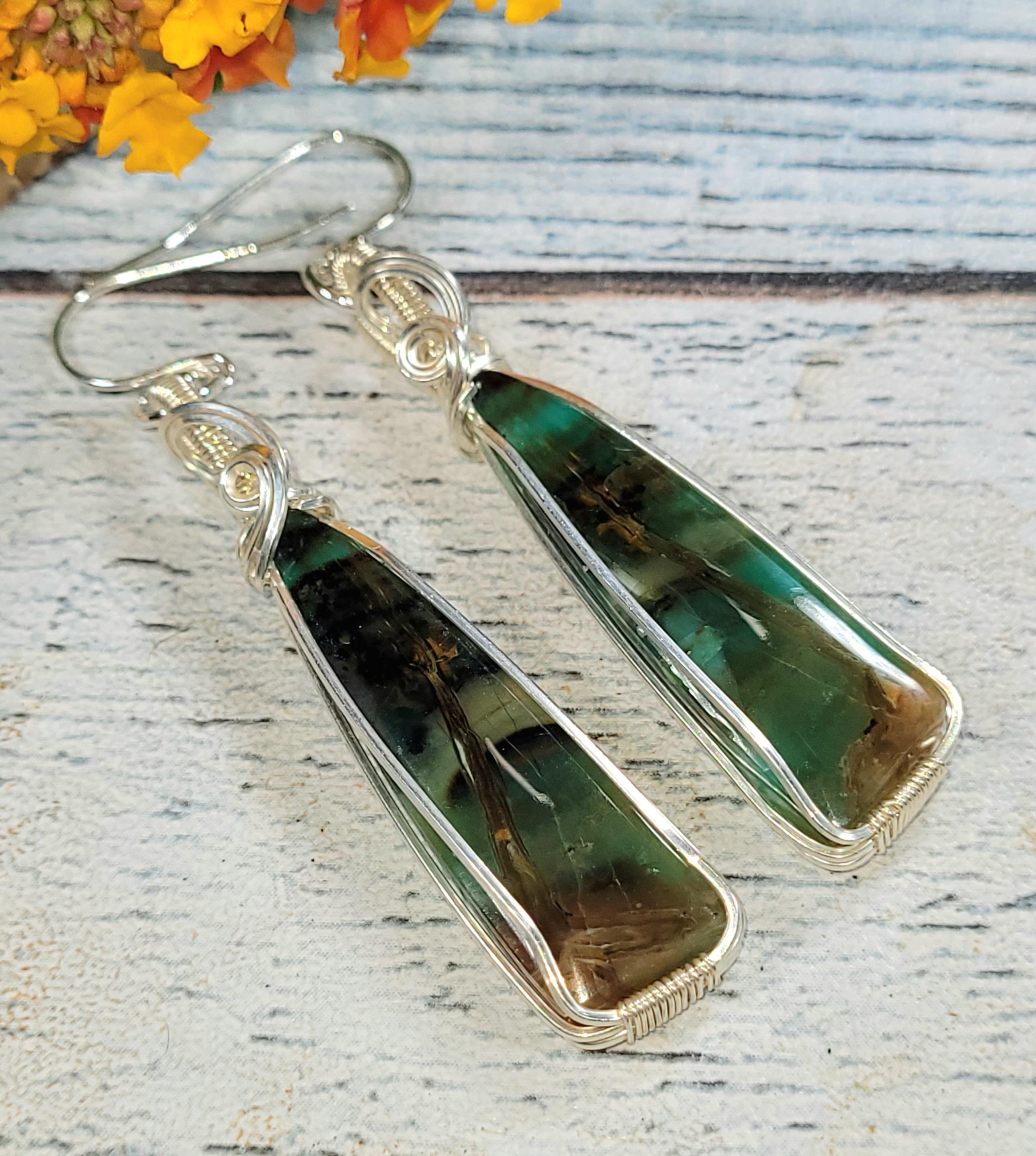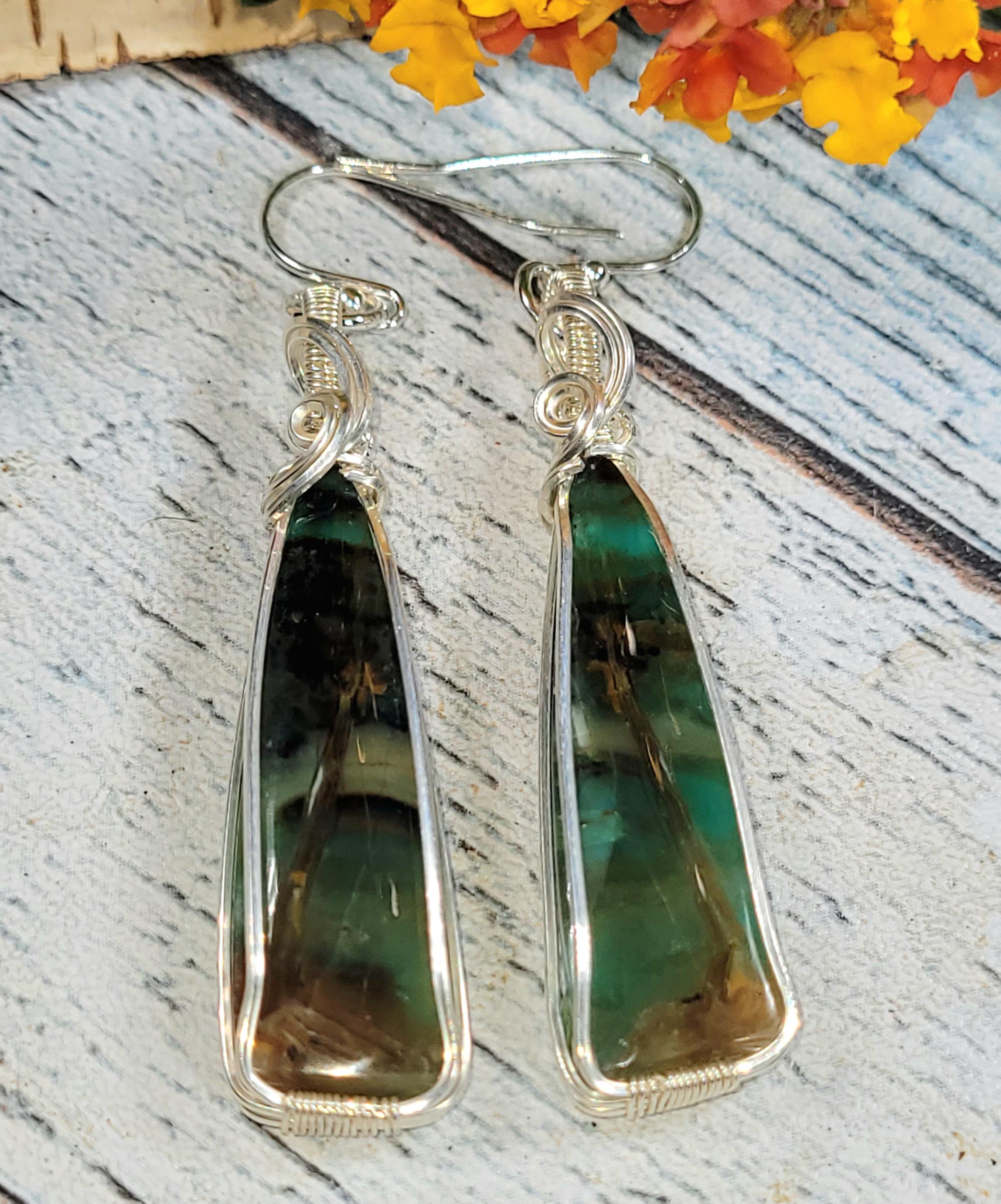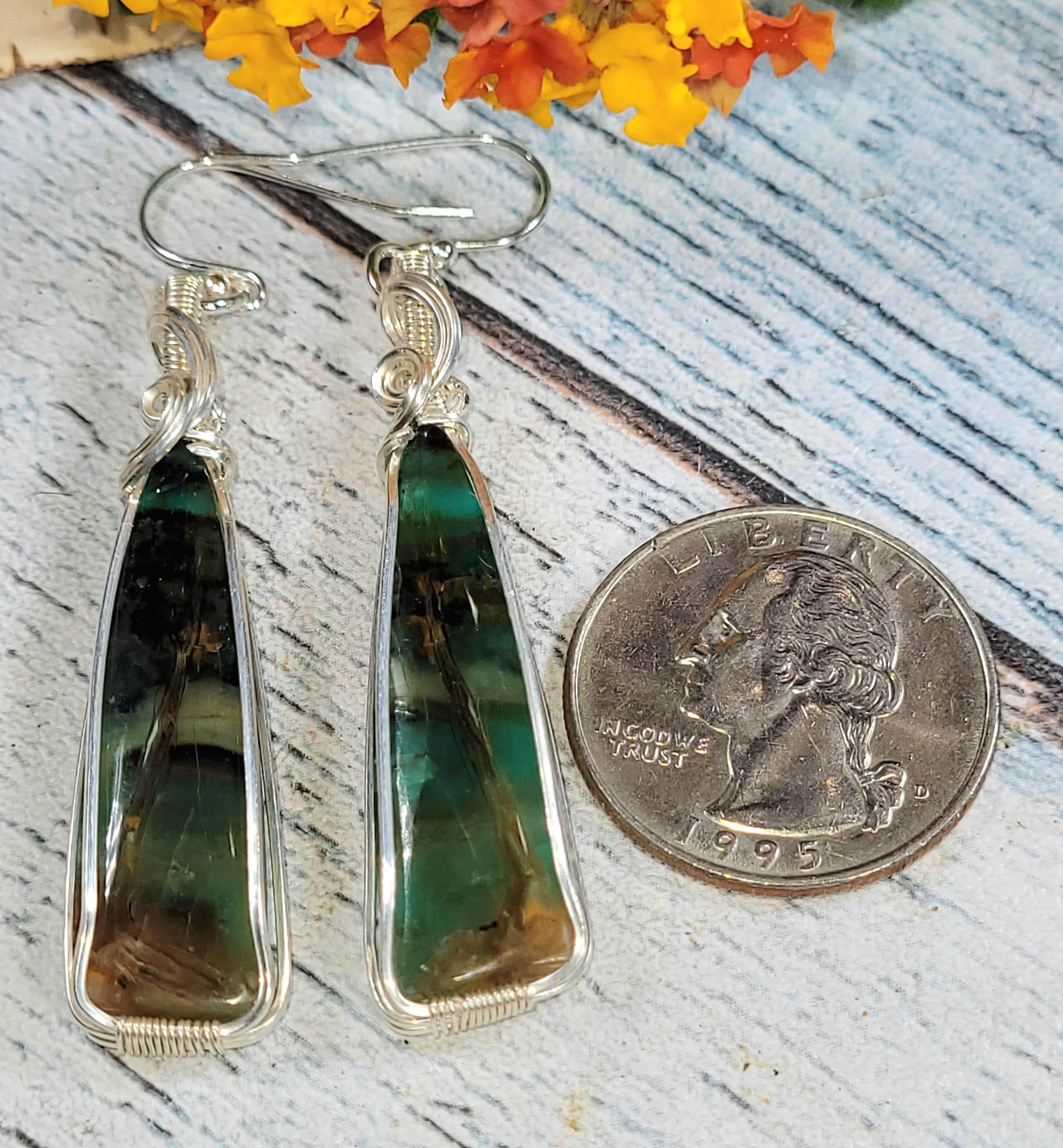 Natural Rare AAA Grade Blue Opalized Petrified Wood Handmade .925 Sterling Silver Wire Wrapped Earrings 8.1 Grams 2 1/2" x 1/2" JC51. Gift for Her Genuine Stones Gift for Her Genuine Stones! A rare fragment from a recently-discovered vein of opal on the slopes of an Indonesian volcano, this stone formed when opaline silica flows formed in place of an ancient petrified forest. It’s said to enhance imagination, creativity, and spontaneity. All of our items are one of a kind and hand crafted. These stones are beautiful and are thousands years old but only discovered a few years ago. We hand pick our stones from all over the world. Each item is handcrafted and one of a kind item. The silver is very study and not flimsy like some sellers. We guarantee all item to be sterling silver. We ship all of our items next day and offer expedited shipping. First class mail is free for purchases over $35. We accept returns within 30 days, only we will make exceptions during holidays. Please email us if you have any questions or problems, as we work hard to satisfy our customers so we can turn you into a repeat buyer.. Thanks so much for business and hope to see you on our site often. All items over $35 include free shipping. .Free shipping on all orders over $35.