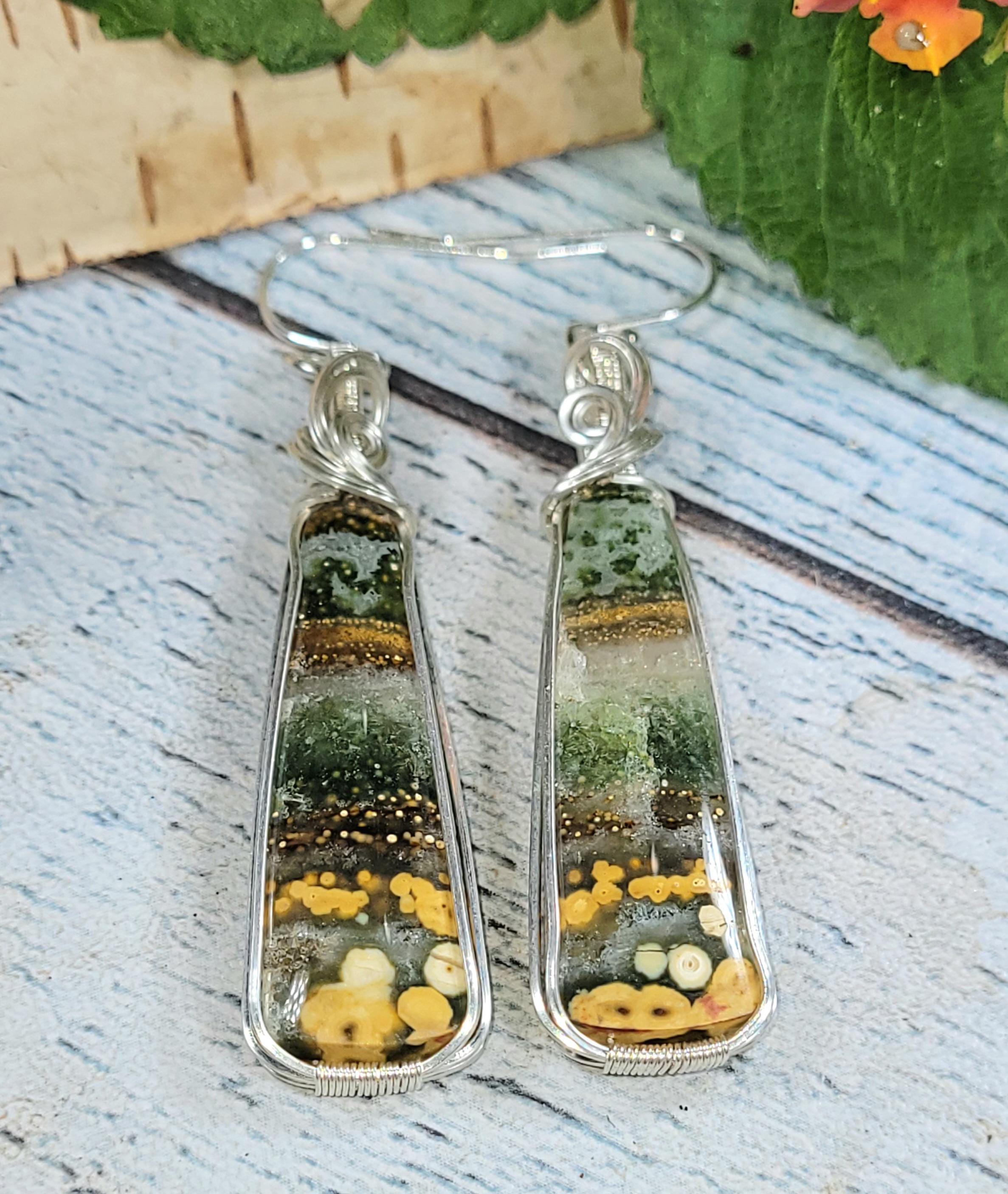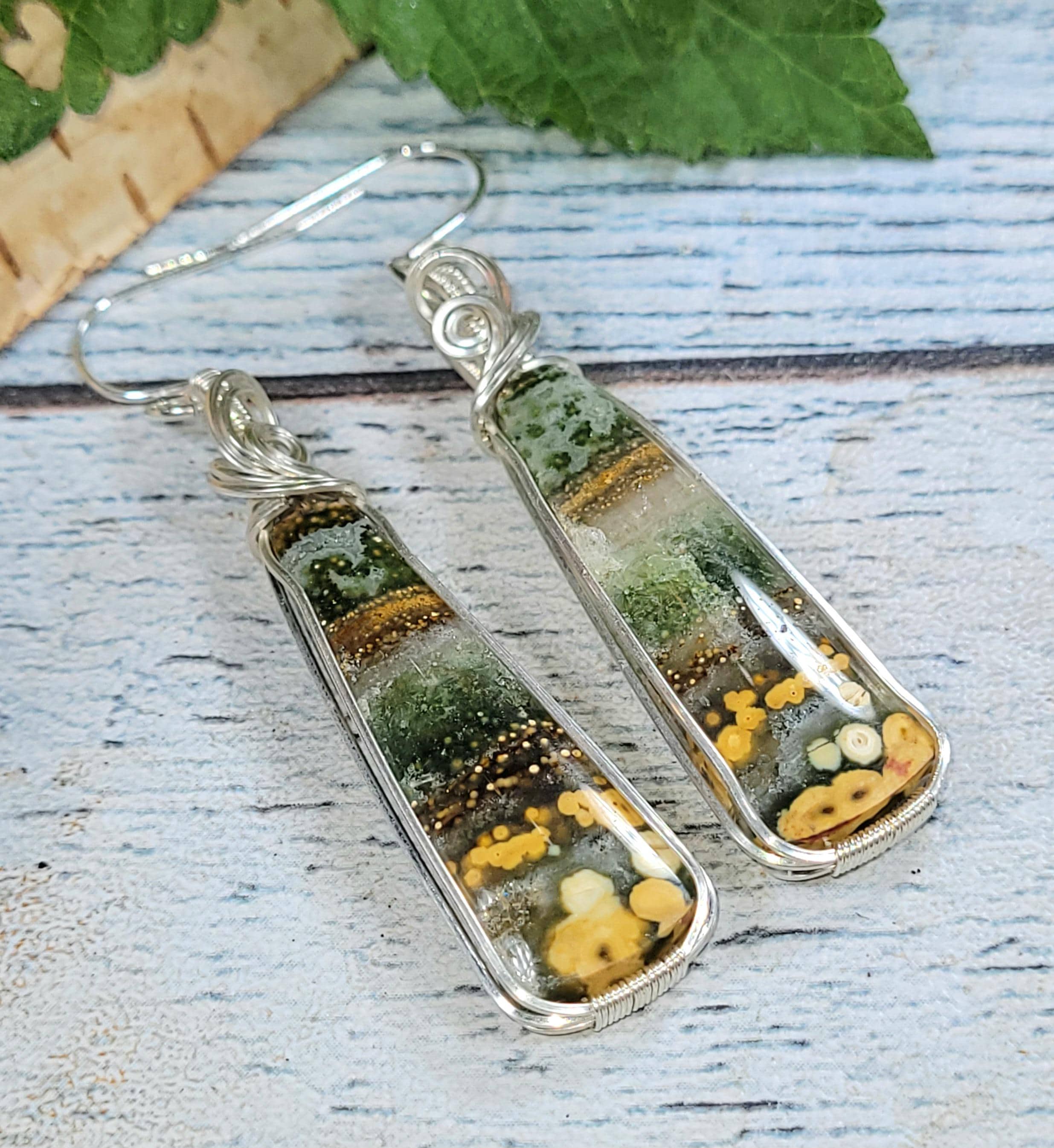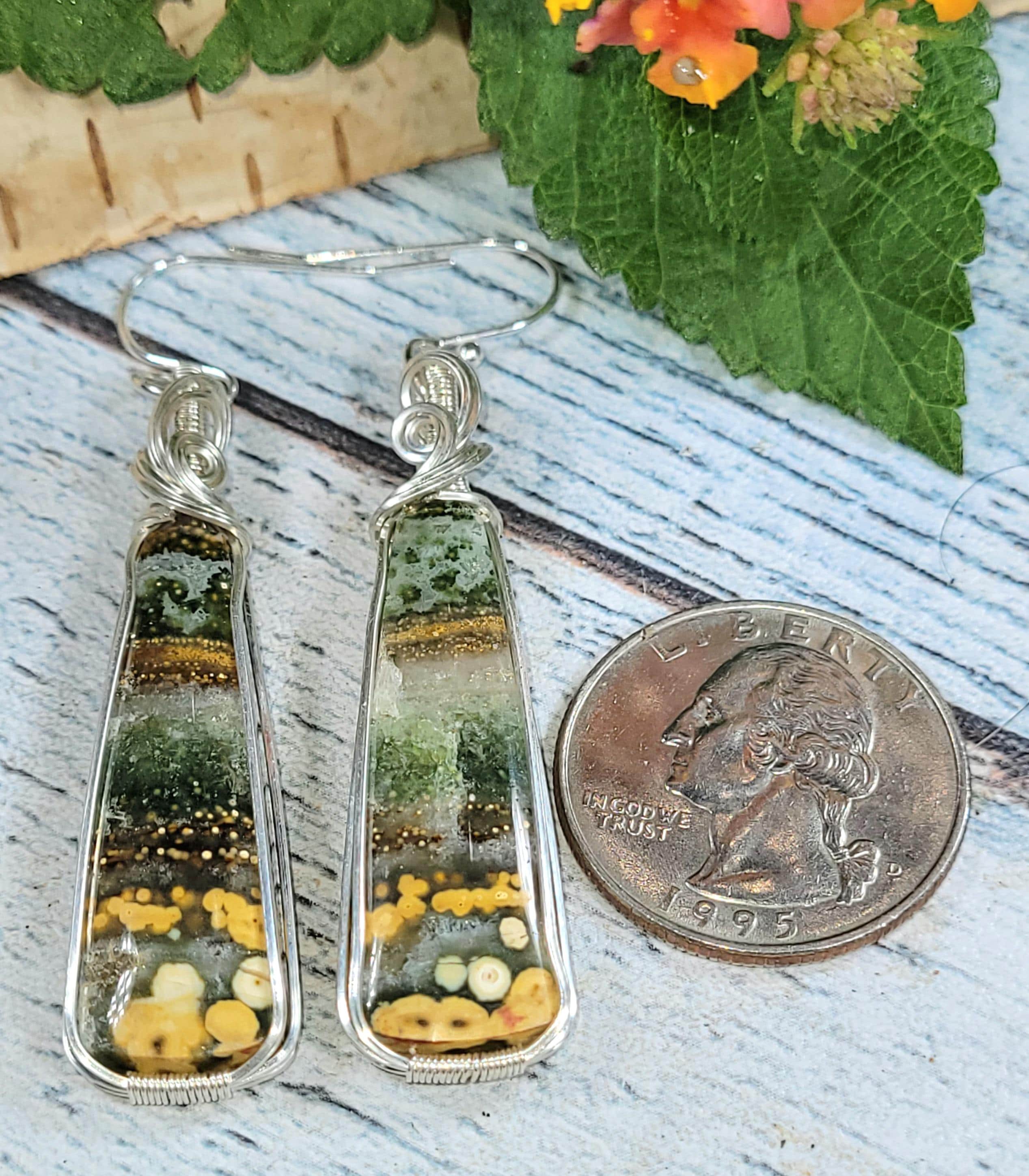 Natural High Grade Ocean Jasper Rectangle Handmade Wire Wrapped .925 Sterling Silver Earrings 11.6 Grams measure 2 1/2" x 9/16" HC53 -This is a handpicked natural stone, the exact one shown in picture. The sterling silver is .925 and stamped. Each piece is handmade by artisans in my shop. The quality of the stones and the silver workmanship is impressive. Please look at other items in my store. I sell ready made jewelry with hand crafted silver work, pendants with a sterling silver bails and beautiful unique stones for jewelry wire wrapping and weaving. You will pay exact amount on shipping plus $1 for supplies and labor. All items are shipped within a couple of days after payment and are shipped USPS first class or international first class. Items are available for combined shipping, if invoice does not combine please email me and I will combine for you. Average shipping will be $4 to 4.50 for USPS first class. International shipping is available for exact amount of shipping plus $1 for labor and supplies also. We also accept returns for refund or exchange. Thanks for viewing my store