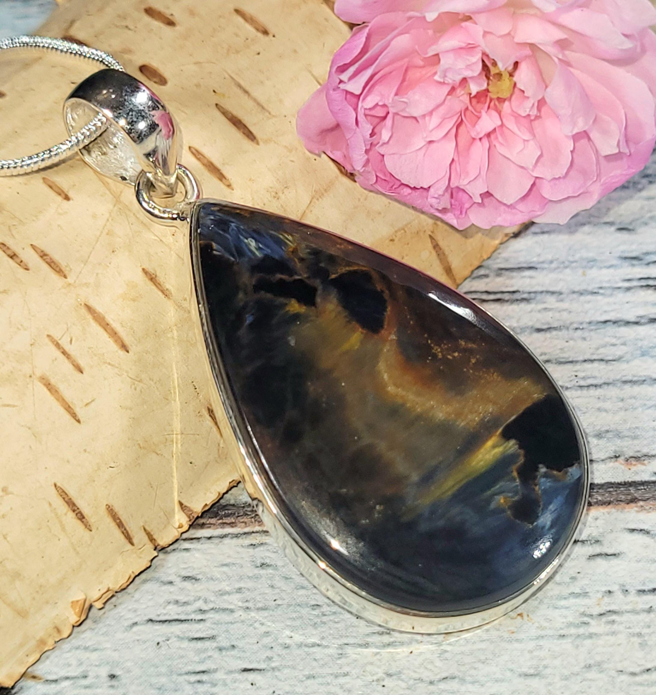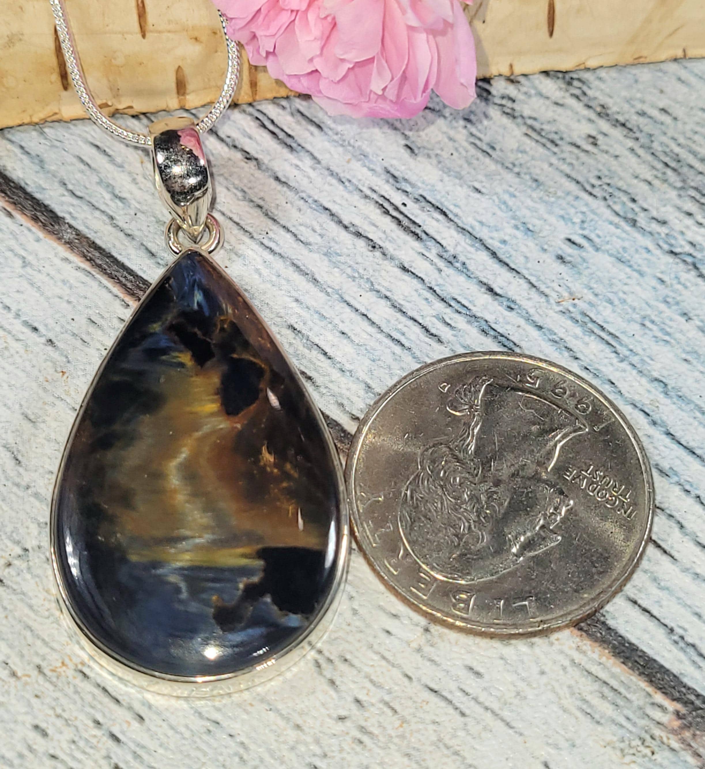 Natural High Grade Bluish Gray & Bronze Pietersite Pear .925 Sterling Silver Pendant measures 2" x 15/16" and weighs 8.7 grams JV13. If you're not pleased with the item you receive please email us before leaving review. We stand behind our jewelry 100% and will refund you or send a replacement to make sure you're happy with your purchase!! This is a handpicked natural stone, the exact one shown in picture. The sterling silver is .925 and stamped. Each piece is handmade by artisans in my shop. The quality of the stones and the silver craftmanship is impressive. Please look at other items in my store. I sell ready made jewelry with handcrafted silver work, pendants with a sterling silver bails and beautiful unique stones for jewelry wire wrapping and weaving. You will pay exact amount on shipping plus $1 for supplies and labor. All items are shipped within a couple of days after payment and are shipped USPS first class or international first class. Items are available for combined shipping, if invoice does not combine please email me and I will combine for you. Average shipping will be $4 to 4.50 for USPS first class. International shipping is available for exact amount of shipping plus $1 for labor and supplies also. We also accept returns for refund or exchange. Thanks for viewing my store.