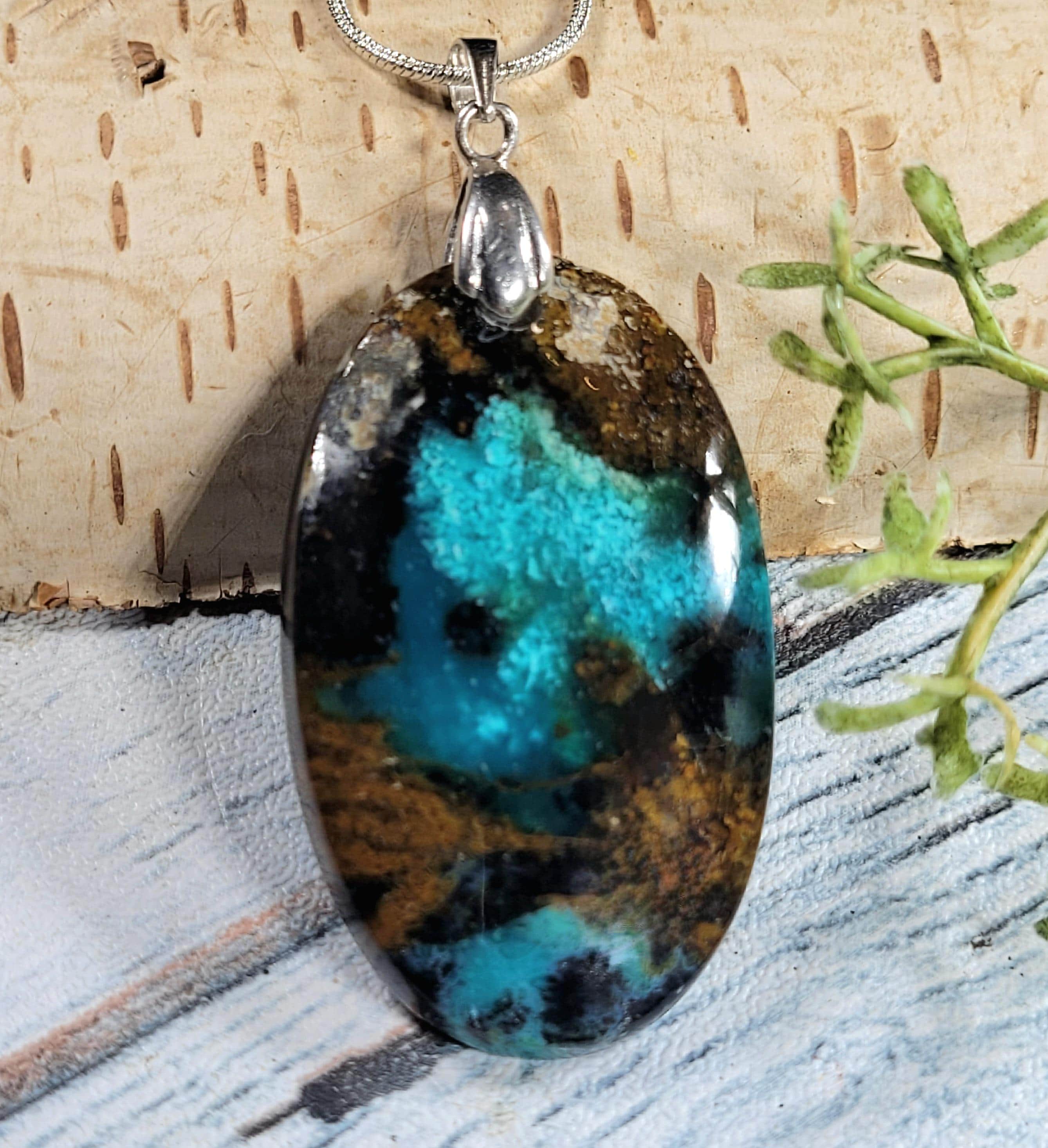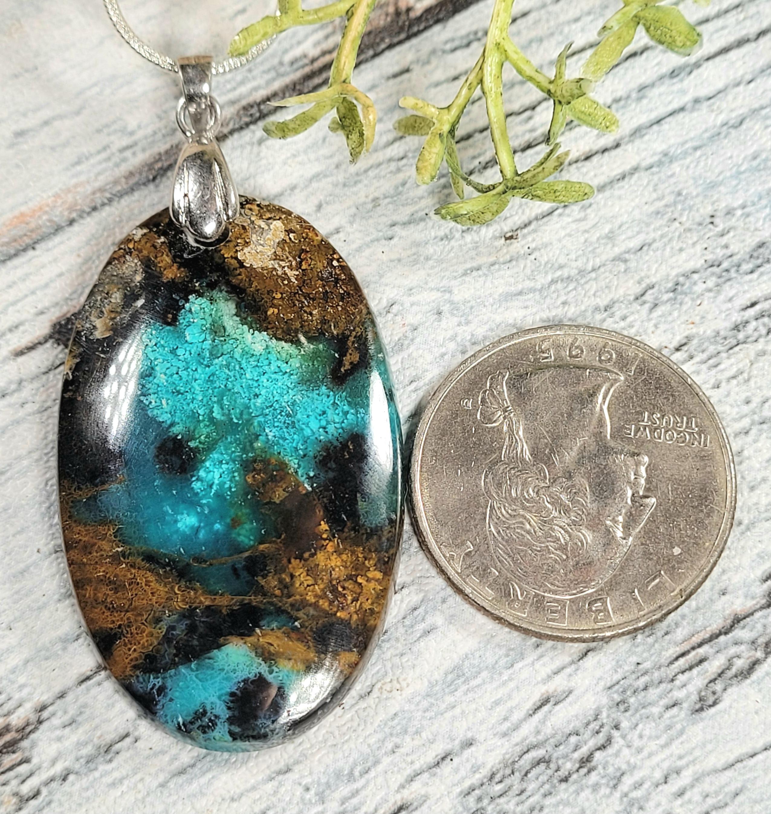 Natural Premium Grade Blue Opalized Wood Cabochon Oval .925 Sterling Silver Pendant measures 2 1/4" x 1" weighs 10.9 grams approximately 50ct KA08. Solid Sterling Silver Rhodium Plated Bail that will accommodate up to a 3mm chain and resist tarnishing! This is a handpicked natural stone, the exact one shown in picture. The sterling silver is .925 and stamped. Each piece is hand made by artisans in my shop. The quality of the stones and the silver workmanship is impressive. Please look at other items in my store. I sell ready made jewelry with handcrafted silver work, pendants with a sterling silver bails and beautiful unique stones for jewelry wire wrapping and weaving. You will pay exact amount on shipping plus $1 for supplies and labor. All items are shipped within a couple of days after payment and are shipped USPS first class or international first class. Items are available for combined shipping, if invoice does not combine please email me and I will combine for you. Average shipping will be $4 to 4.50 for USPS first class. International shipping is available for exact amount of shipping plus $1 for labor and supplies also. We also accept returns for refund or exchange. Thanks for viewing my store.