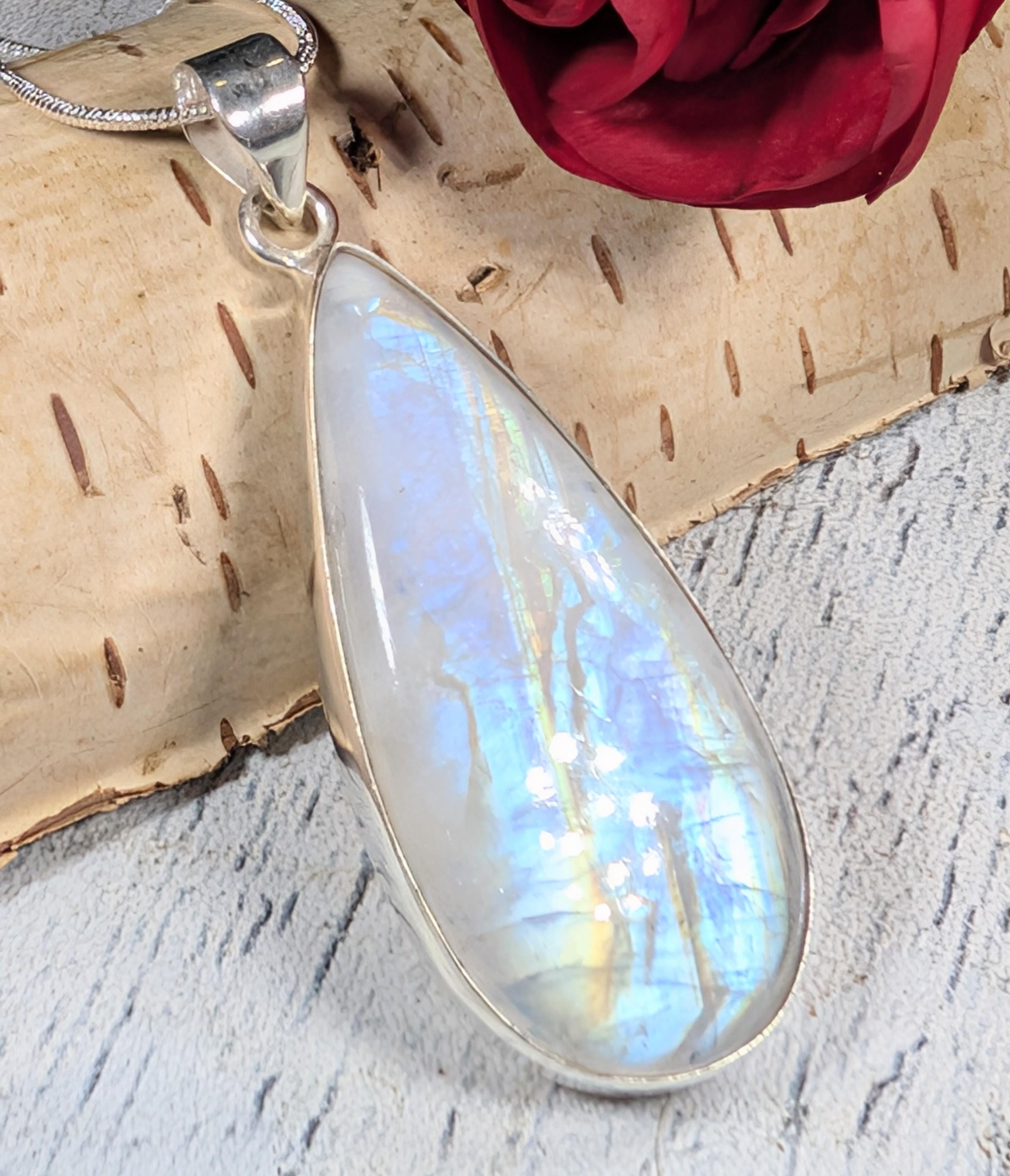 Natural Handmade AAA Grade Multi Flash Rainbow Moonstone Pear .925 Sterling Silver Pendant 2 3/8" x 7/8" 12.4 Grams KA09. This is a handpicked natural stone, the exact one shown in picture. The sterling silver is .925 and stamped. Each piece is handmade by artisans in my shop. The quality of the stones and the silver workmanship is impressive. Please look at other items in my store. I sell ready made jewelry with hand crafted silver work, pendants with a sterling silver bails and beautiful unique stones for jewelry wire wrapping and weaving. You will pay exact amount on shipping plus $1 for supplies and labor. All items are shipped within a couple of days after payment and are shipped USPS first class or international first class. Items are available for combined shipping, if invoice does not combine please email me and I will combine for you. Average shipping will be $4 to 4.50 for USPS first class. International shipping is available for exact amount of shipping plus $1 for labor and supplies also. We also accept returns for refund or exchange. Thanks for viewing my store