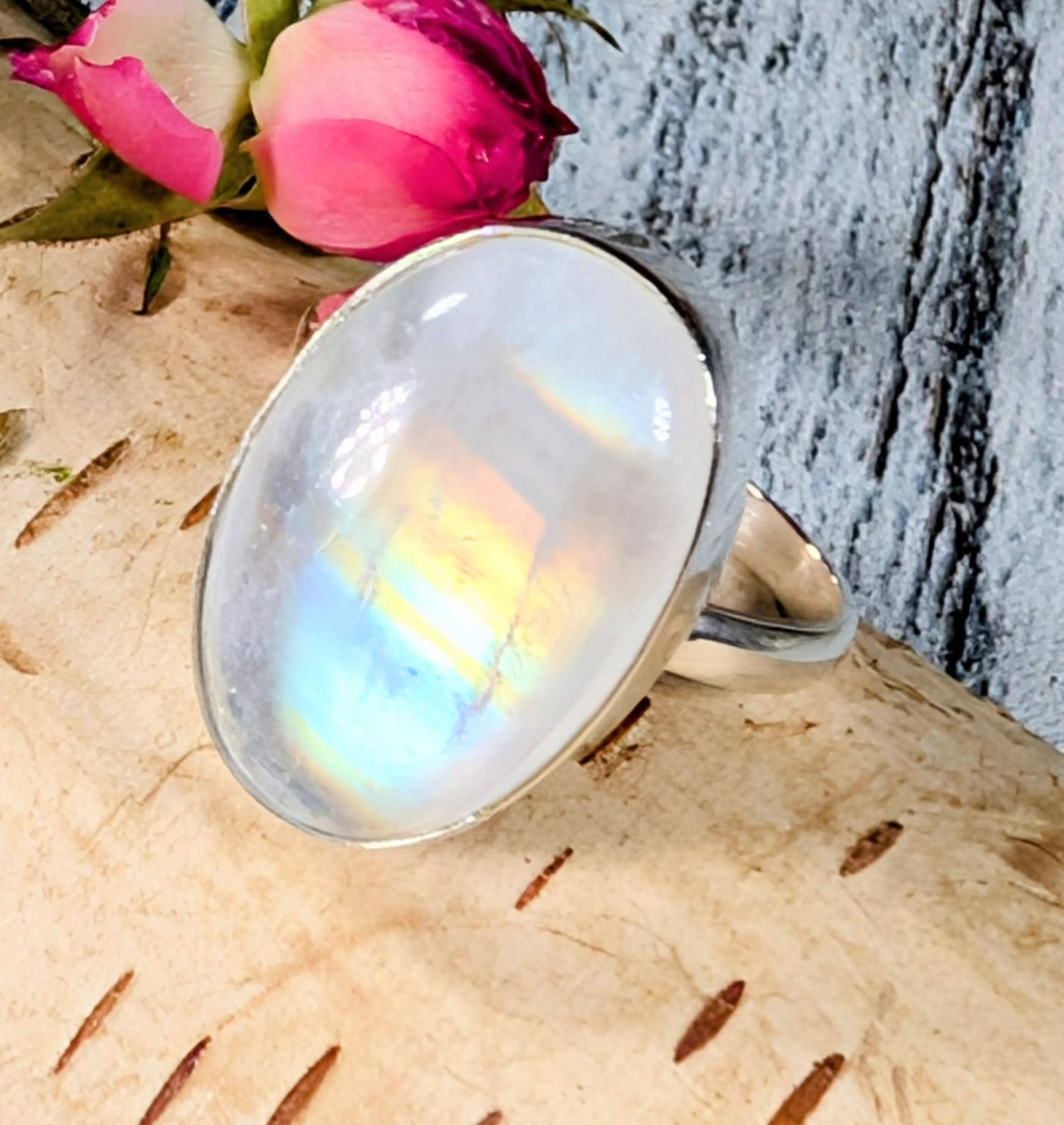 Natural AAAA Grade Oval Rainbow Moonstone .925 Sterling Silver Ring Size 9.75 6.9 Grams 7/8" x 9/16" KA22. Lots of blue and orange color flash! We are known for our high quality and also larger size Rainbow Moonstone. Large Rainbow Moonstone of the highest quality is very hard to find and is expensive when you do. This is a handpicked natural stone, the exact one shown in picture. The sterling silver is .925 and stamped. Each piece is hand made by artisans in my shop. The quality of the stones and the silver workmanship is impressive. Please look at other items in my store. I sell ready made jewelry with hand crafted silver work, pendants with a sterling silver bails and beautiful unique cabochons for jewelry wire wrapping and weaving. You will pay exact amount on shipping plus $1 for supplies and labor. All items are shipped within a couple of days after payment and are shipped USPS first class or international first class. Items are available for combined shipping, if invoice does not combine please email me and I will combine for you. Average shipping will be $4 to 4.50 for USPS first class. International shipping is available for exact amount of shipping plus $1 for labor and supplies also. We also accept returns for refund or exchange. Thanks for viewing my store