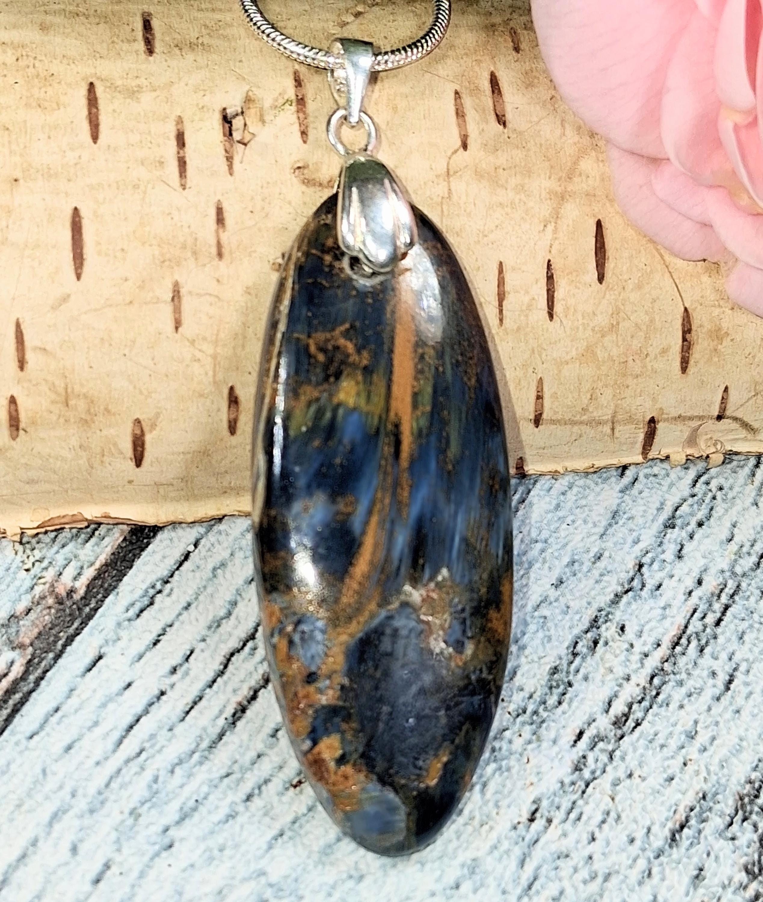 Natural High Grade Pietersite Oval Cabochon .925 Sterling Silver Pendant measures 2 1/4" x 11/16" and weighs 6.4 grams approximately 30ct KB10 Solid Sterling Silver Rhodium Plated Bail will accommodate up to a 3mm chain and resist tarnishing . If you're not pleased with the item you receive please email us before leaving review. We stand behind our jewelry 100% and will refund you or send a replacement to make sure you're happy with your purchase!! This is a handpicked natural stone, the exact one shown in picture. The sterling silver is .925 and stamped. Each piece is handmade by artisans in my shop. The quality of the stones and the silver craftmanship is impressive. Please look at other items in my store. I sell ready made jewelry with handcrafted silver work, pendants with a sterling silver bails and beautiful unique stones for jewelry wire wrapping and weaving. You will pay exact amount on shipping plus $1 for supplies and labor. All items are shipped within a couple of days after payment and are shipped USPS first class or international first class. Items are available for combined shipping, if invoice does not combine please email me and I will combine for you. Average shipping will be $4 to 4.50 for USPS first class. International shipping is available for exact amount of shipping plus $1 for labor and supplies also. We also accept returns for refund or exchange. Thanks for viewing my store.