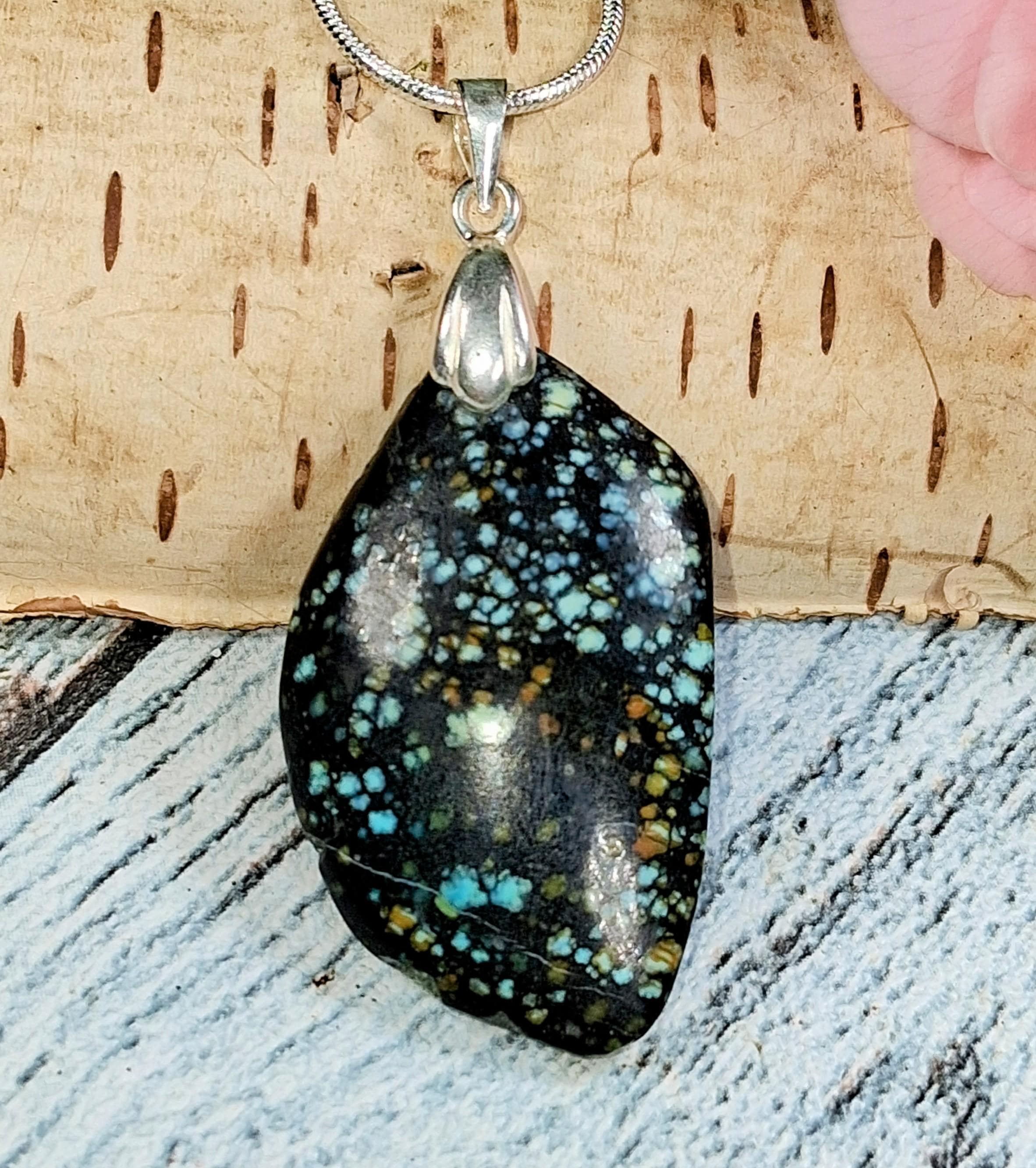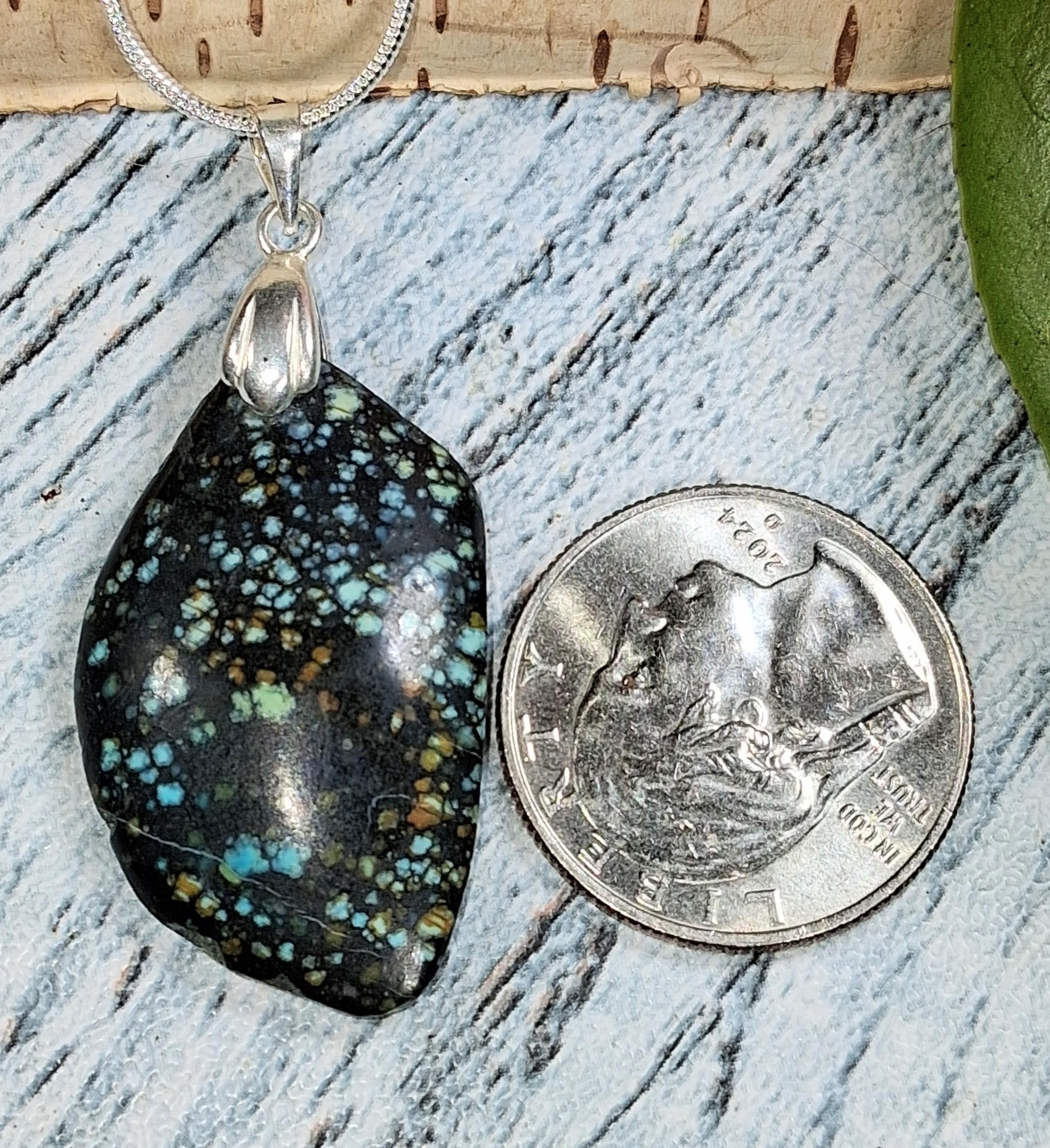 Natural Premium Grade No Enhancement Spiderweb Turquoise Freeform Cabochon .925 Sterling Silver Pendant approximately 30ct measures 2" x 7/8" KB11. Solid Sterling Silver Rhodium Plated will accommodate up to a 3mm chain and resist tarnishing! This is a handpicked natural stone, the exact one shown in picture. The sterling silver is .925 and stamped. Each piece is hand made by artisans in my shop. The quality of the stones and the silver workmanship is impressive. Please look at other items in my store. I sell ready made jewelry with hand crafted silver work, pendants with a sterling silver bails and beautiful unique stones for jewelry wire wrapping and weaving. You will pay exact amount on shipping plus $1 for supplies and labor. All items are shipped within a couple of days after payment and are shipped USPS first class or international first class. Items are available for combined shipping, if invoice does not combine please email me and I will combine for you. Average shipping will be $4 to 4.50 for USPS first class. International shipping is available for exact amount of shipping plus $1 for labor and supplies also. We also accept returns for refund or exchange. Thanks for viewing my store.